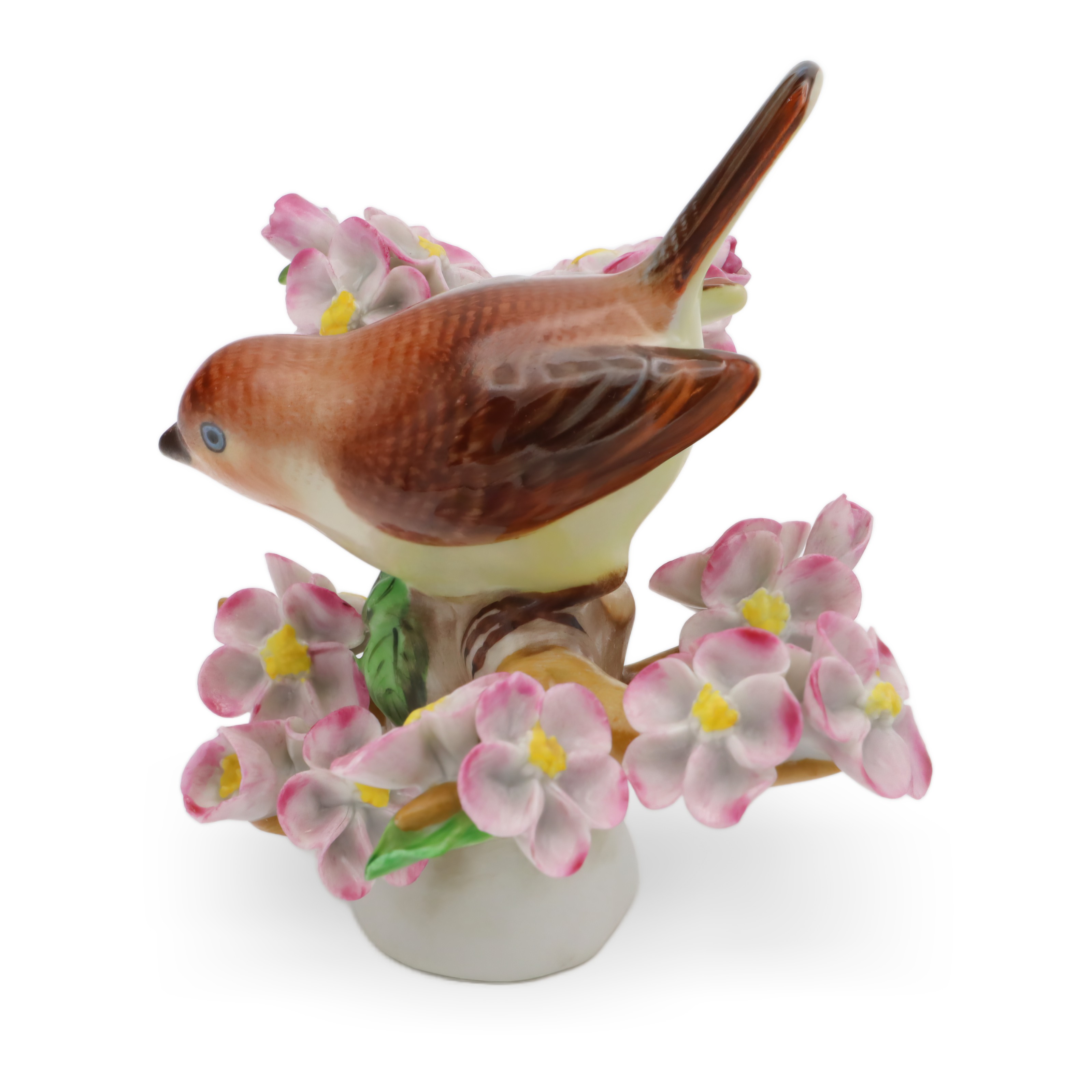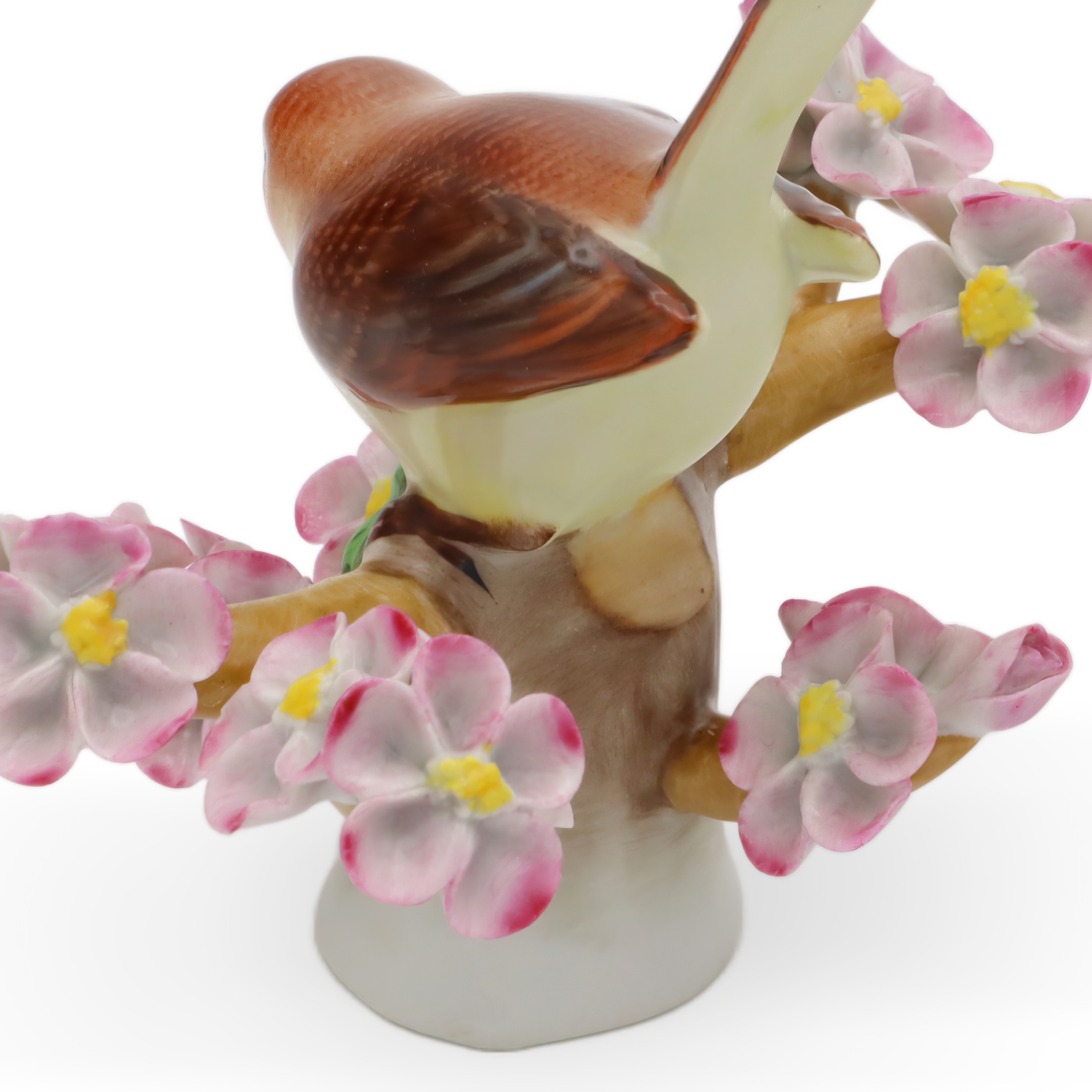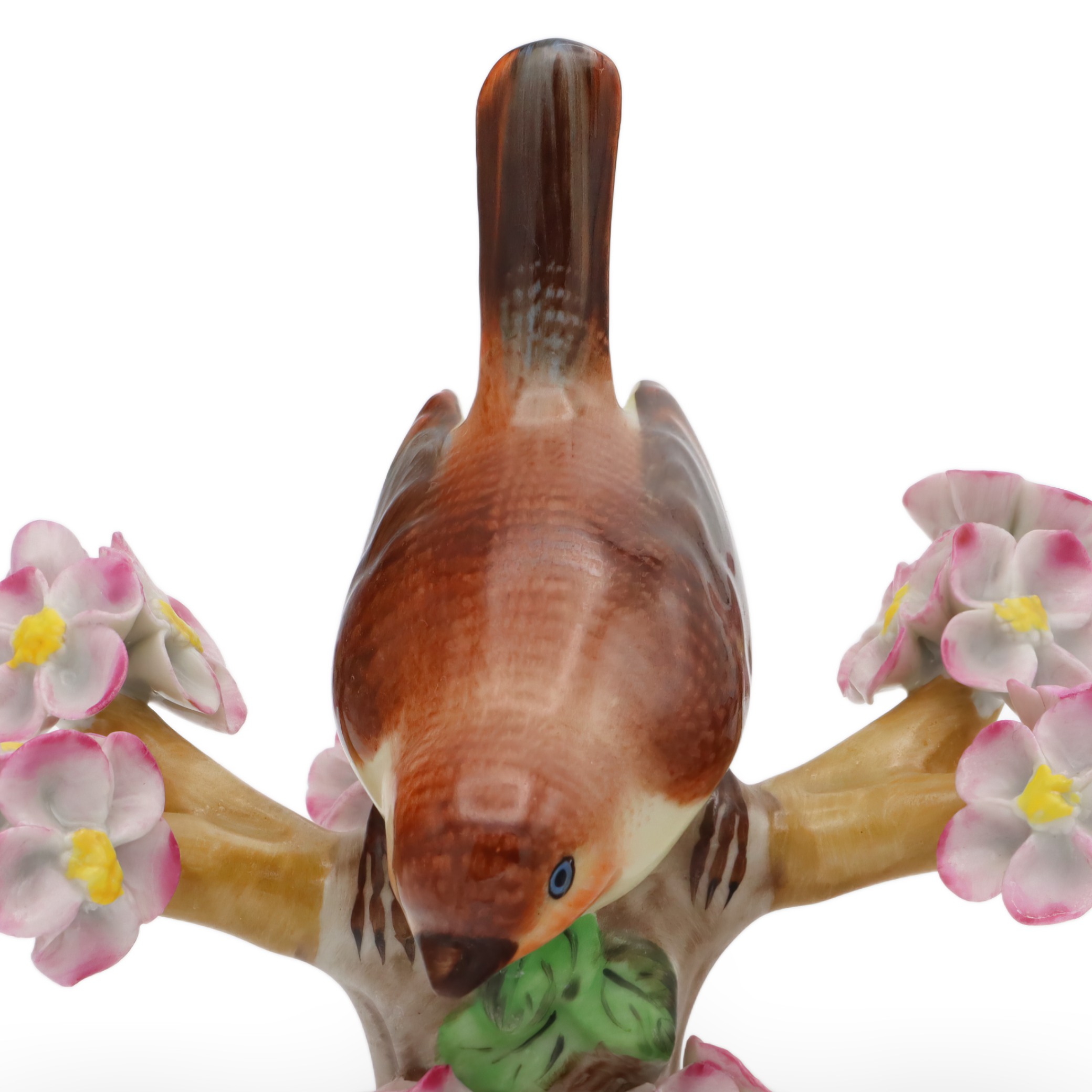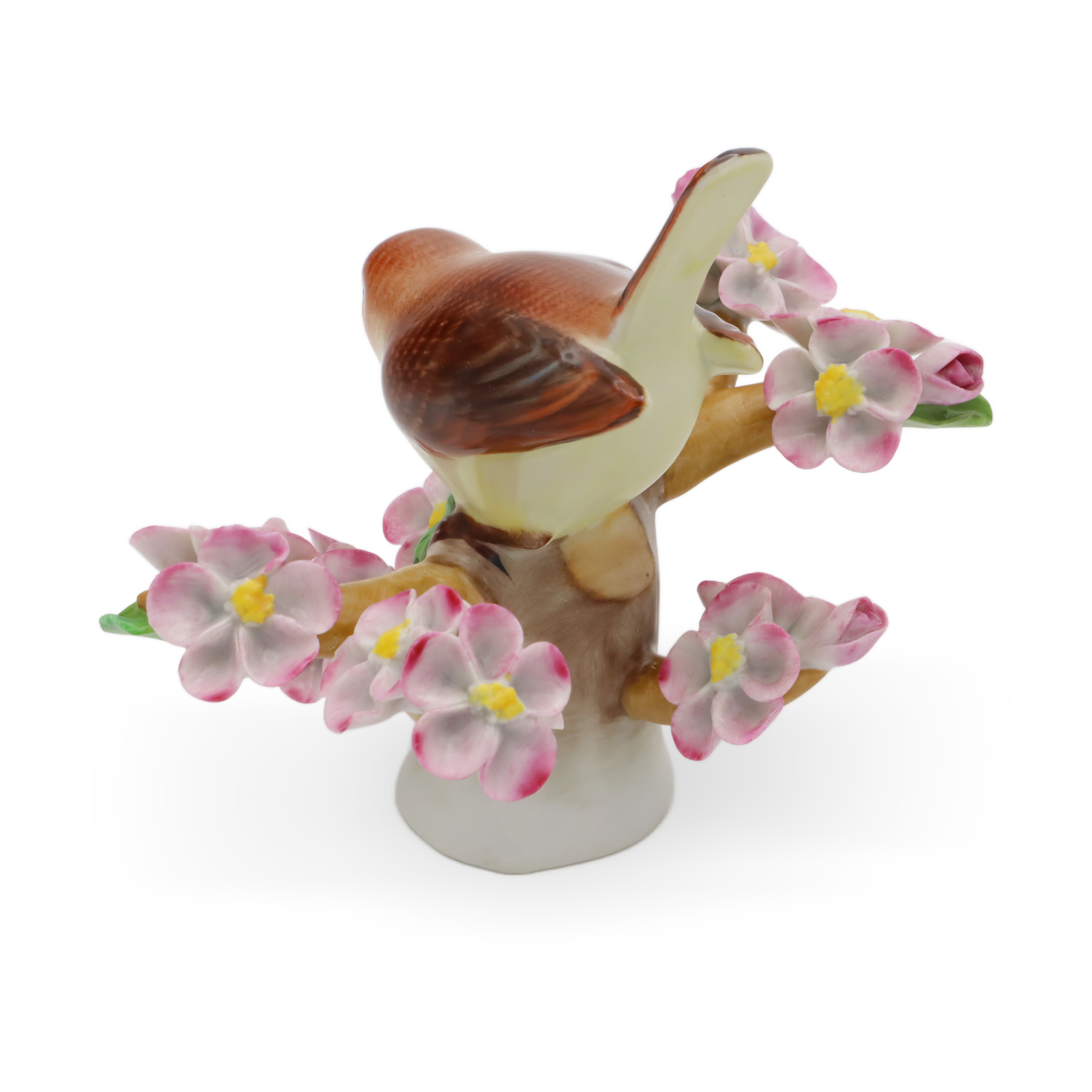 This charming porcelain figurine features a bird elegantly perched on a blossoming branch, the flowers delicately painted in pink and yellow, giving it a truly…