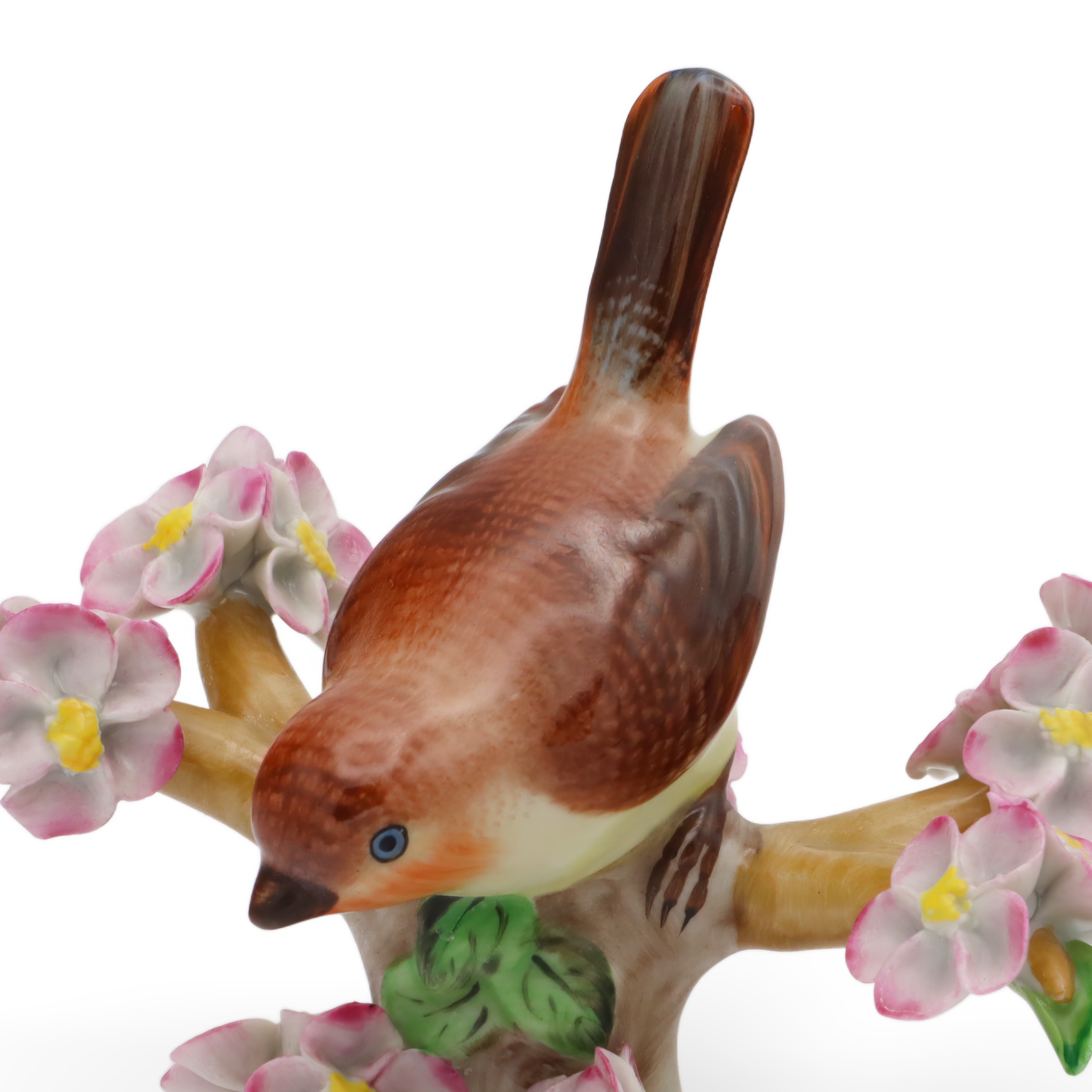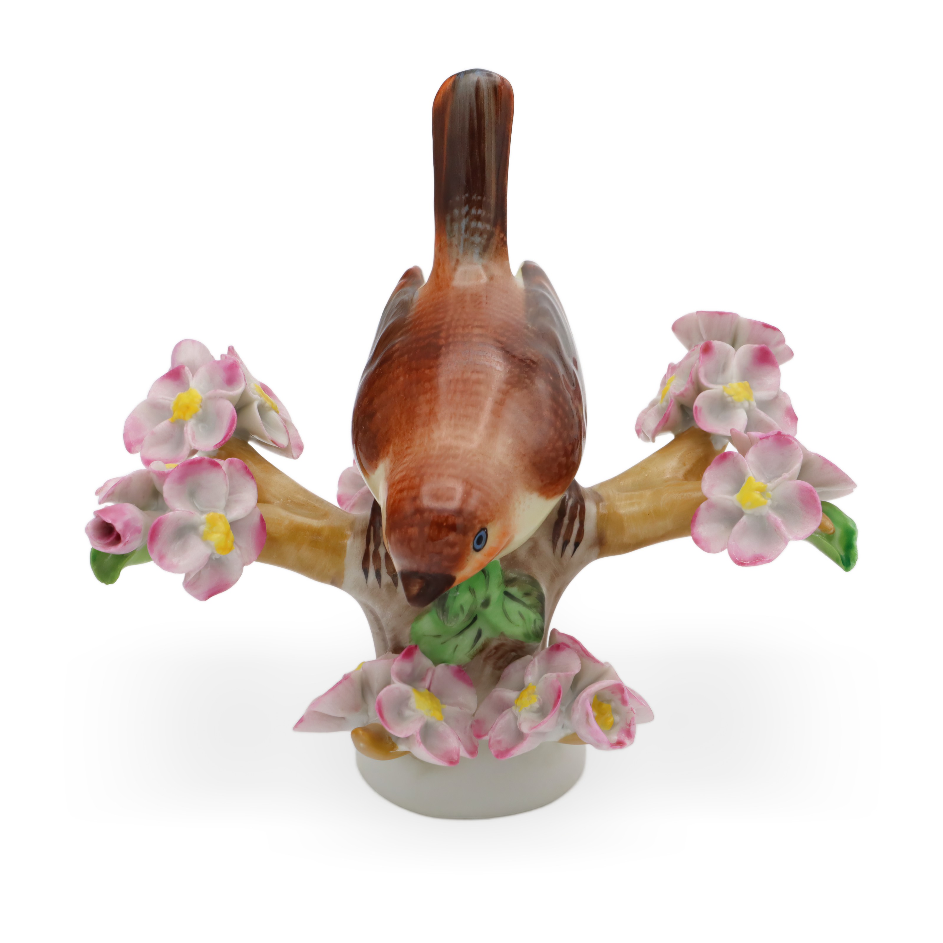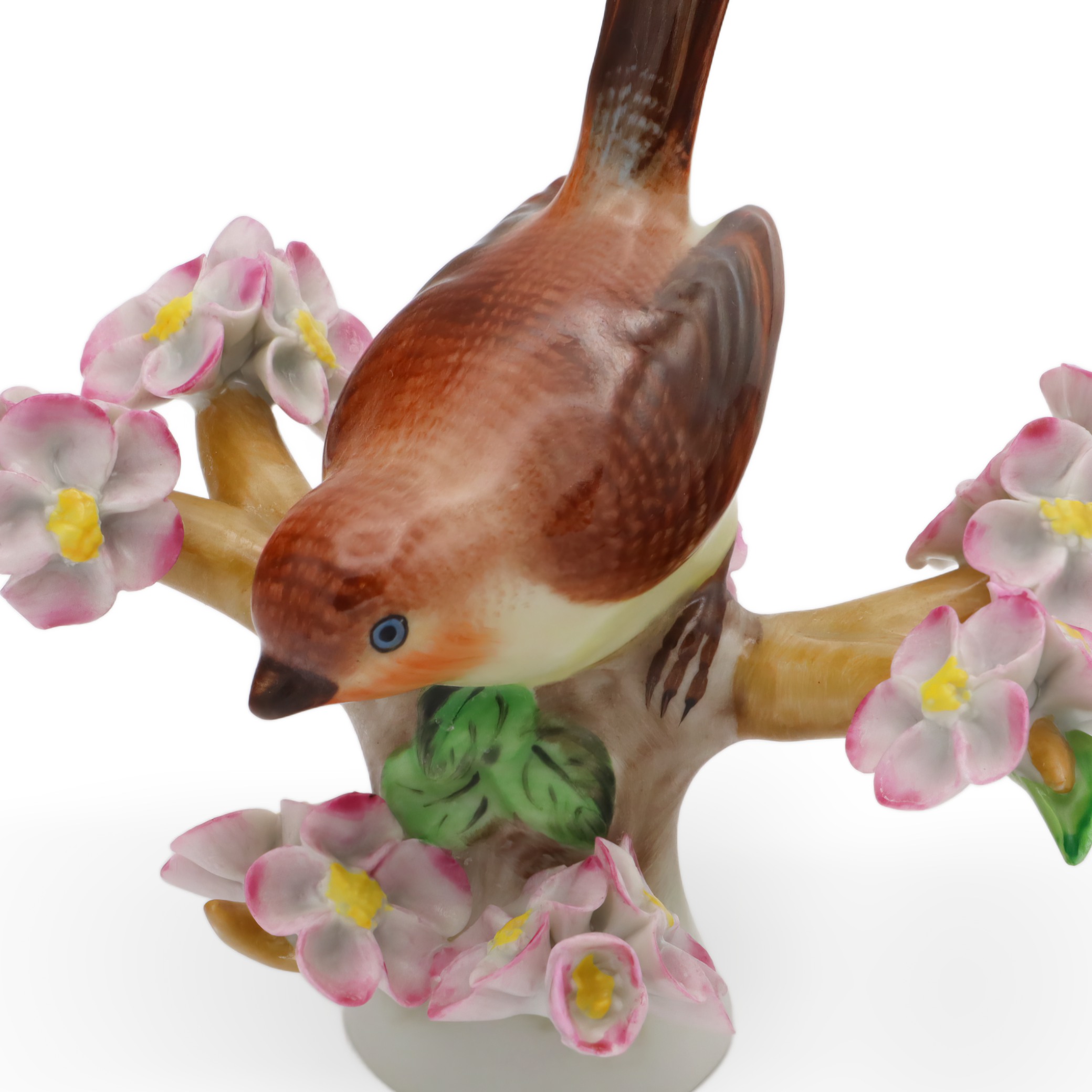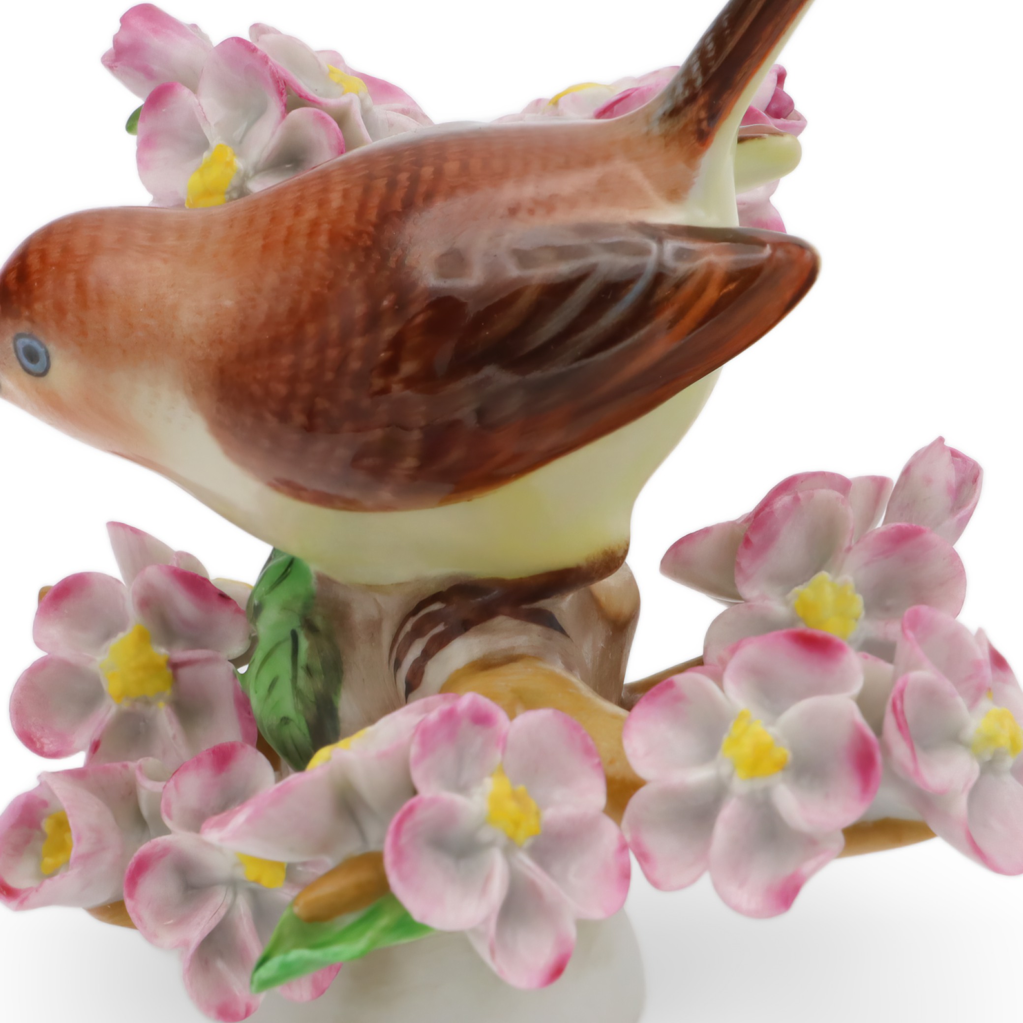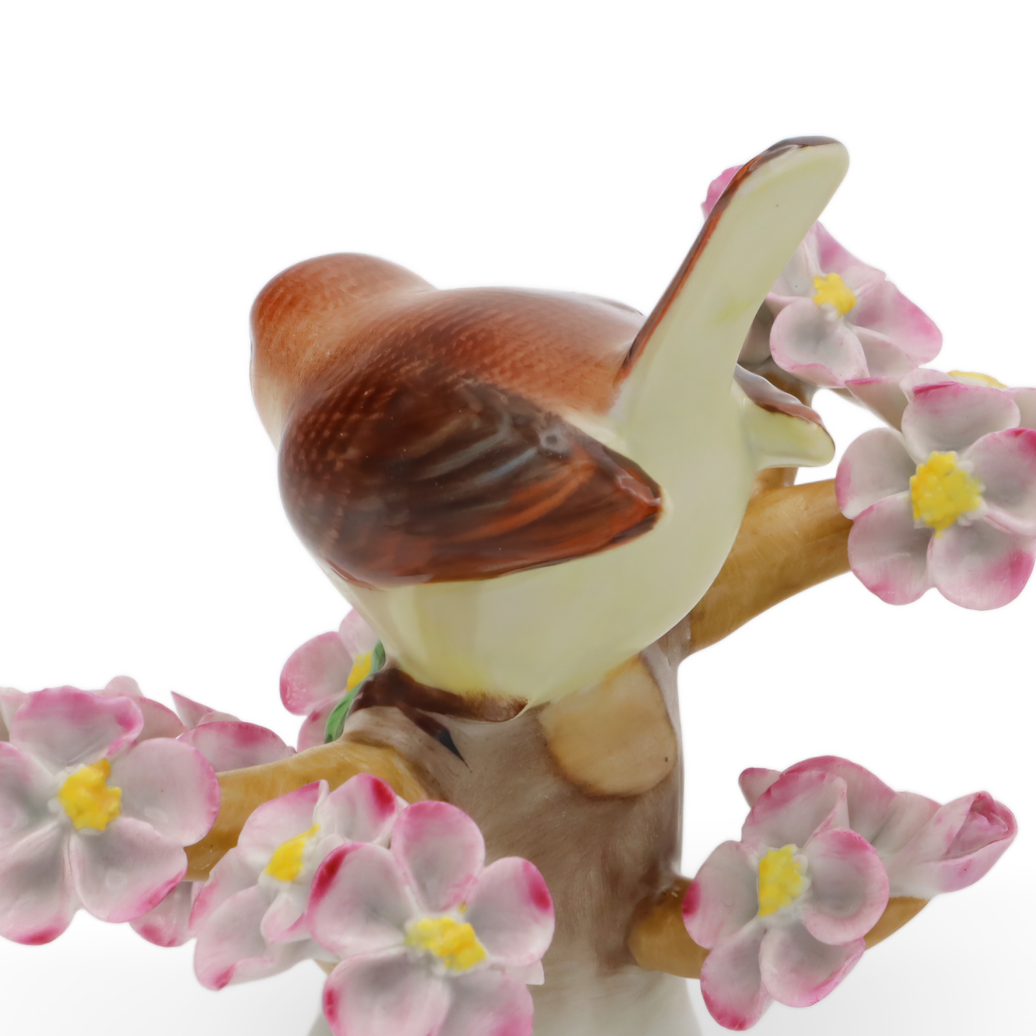 This charming porcelain figurine features a bird elegantly perched on a blossoming branch, the flowers delicately painted in pink and yellow, giving it a truly…