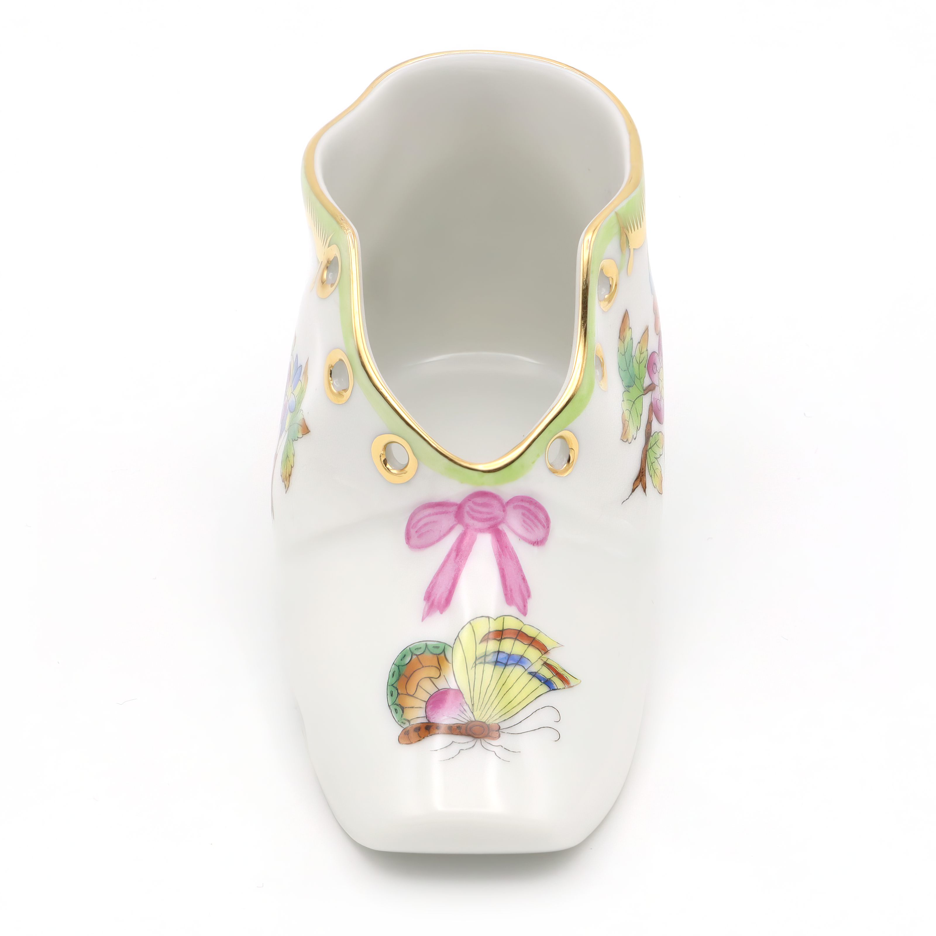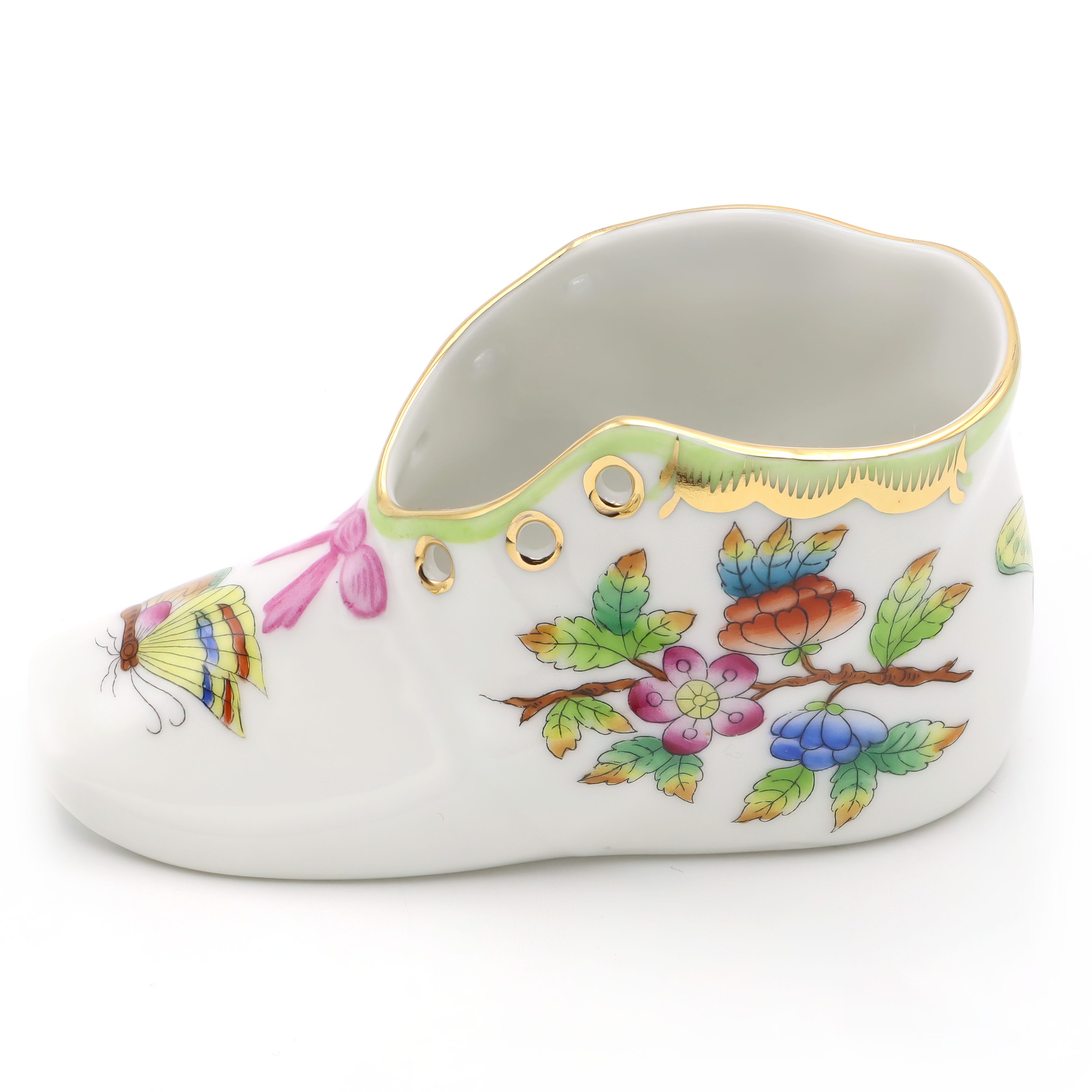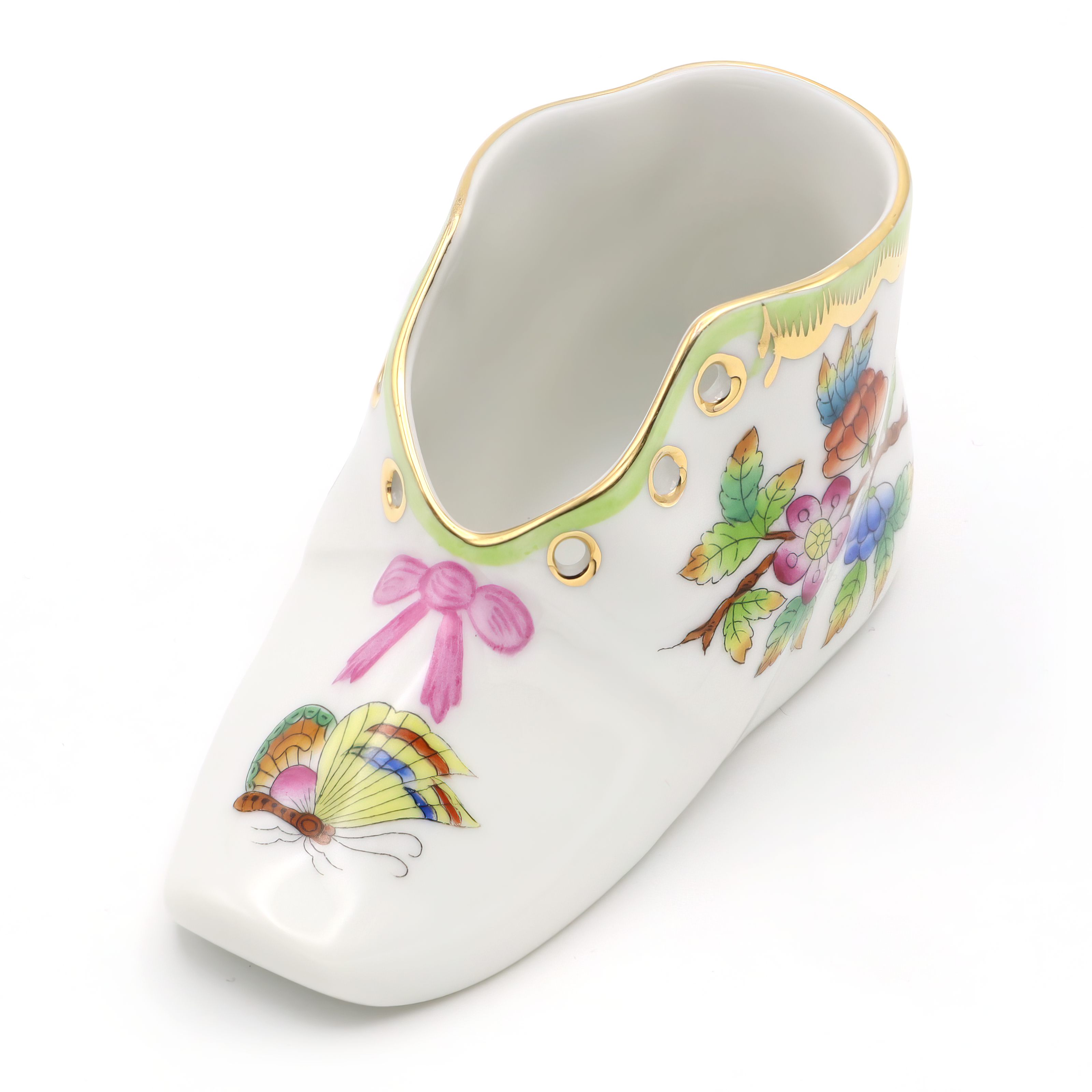 Herend is one of Hungary’s most famous porcelain manufacturers, with a legacy that dates all the way back to 1826. The company is especially well-known for its hand-painted pieces, where each figure, plate, or decorative item is finished by skilled artisans. The Queen Victoria pattern, featured here on the baby shoe, is one of Herend’s flagship designs. It was introduced in 1851 and actually named after Queen Victoria of England, who fell in love with the pattern at the Great Exhibition in London. The style is famous for its colorful butterflies and blossoming flowers, often edged with 24K gold, symbolizing beauty and life. Items like this baby shoe are unusual and considered rare, since Herend is renowned for producing its pieces in limited numbers, and each one is slightly unique due to the hand-painting. For the average person, owning a Herend Queen Victoria baby shoe is not just owning a pretty object, but holding onto a slice of European art history—a little treasure with decades of stories and a lot of old-world charm. Collectors and lovers of fine décor prize these pieces, keeping them well cared for in cabinets or on display where guests can admire both the artistry and the heritage.