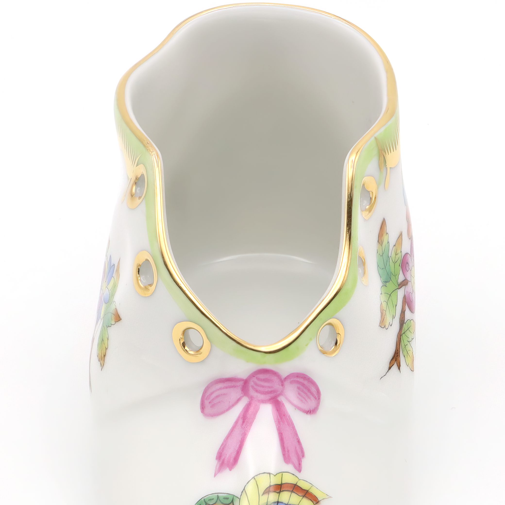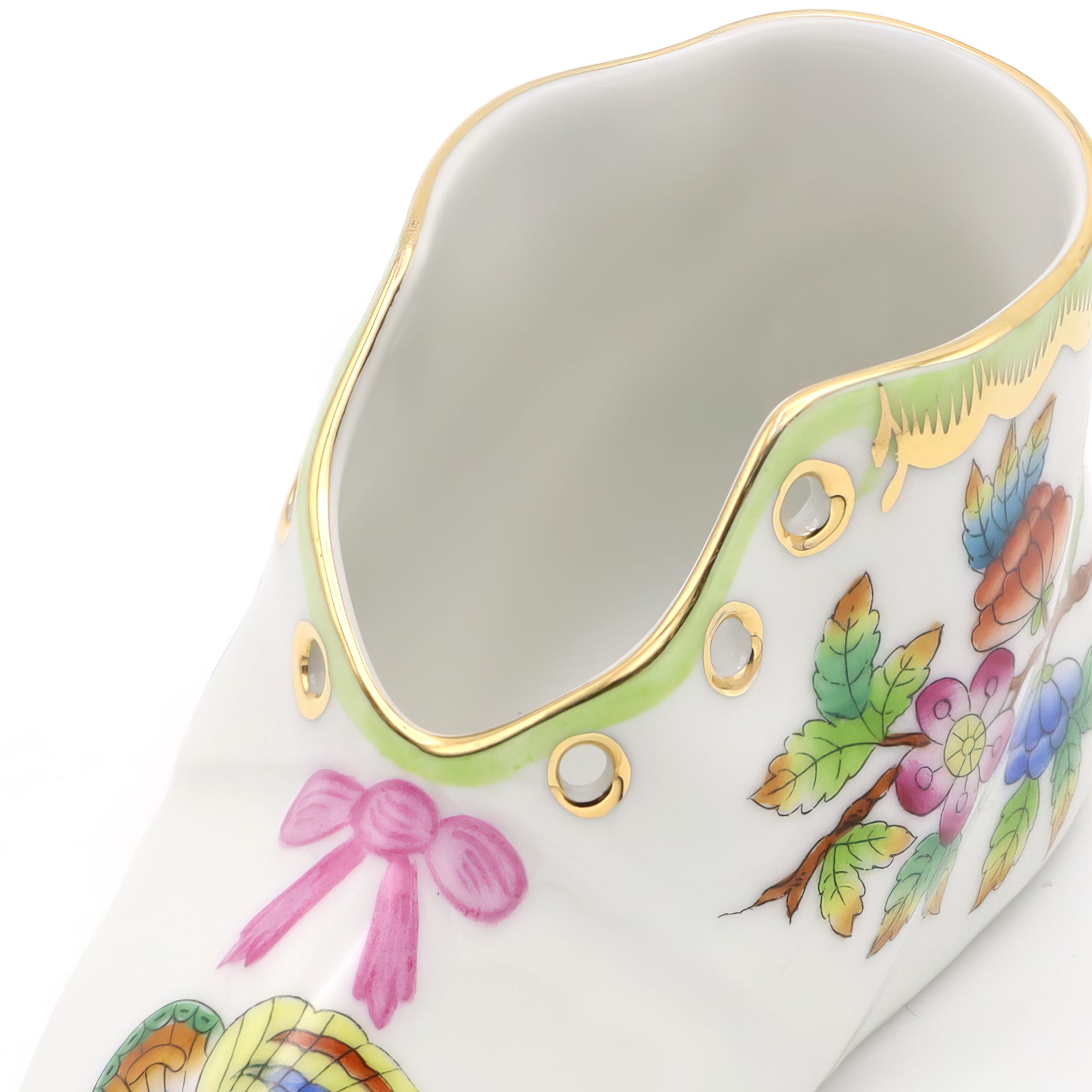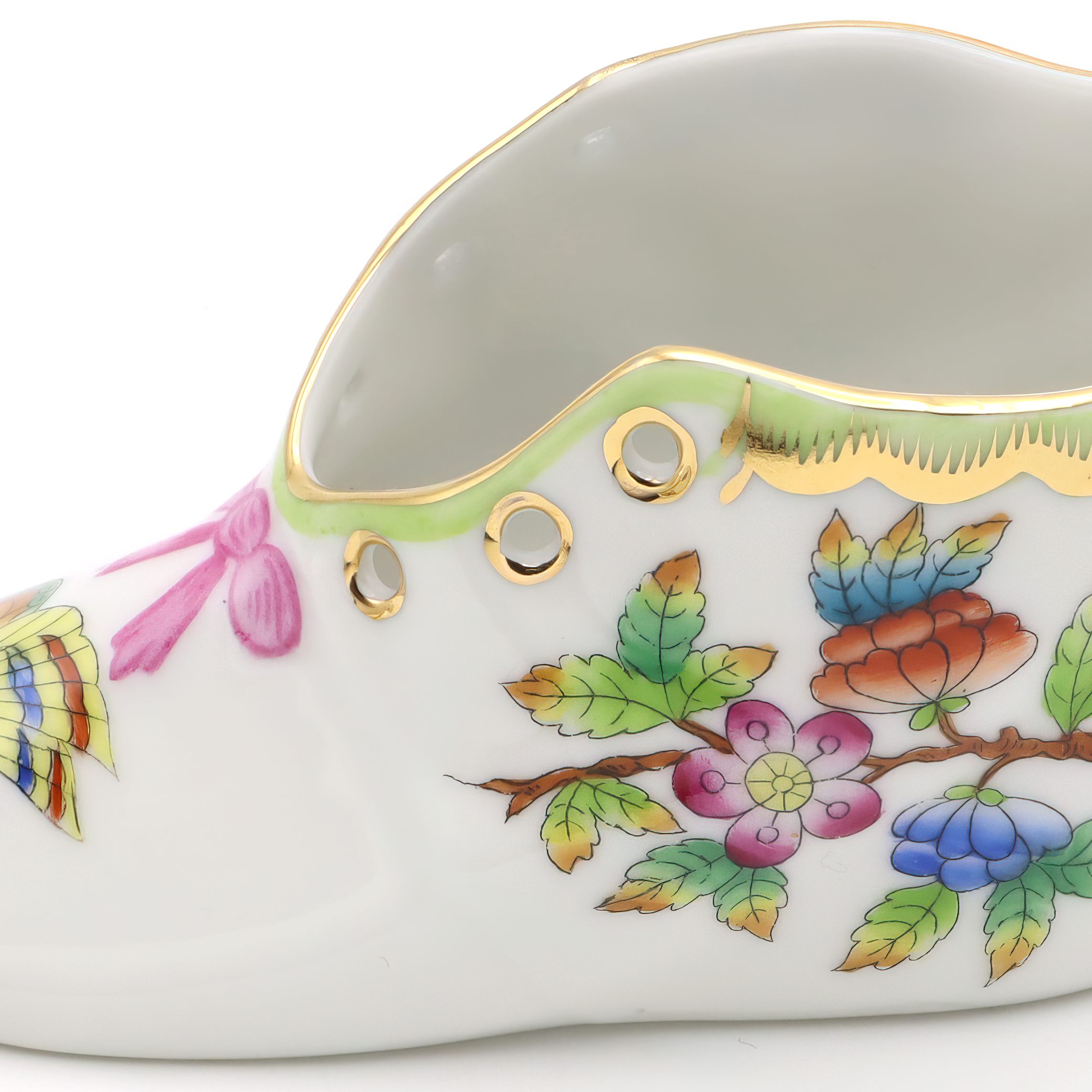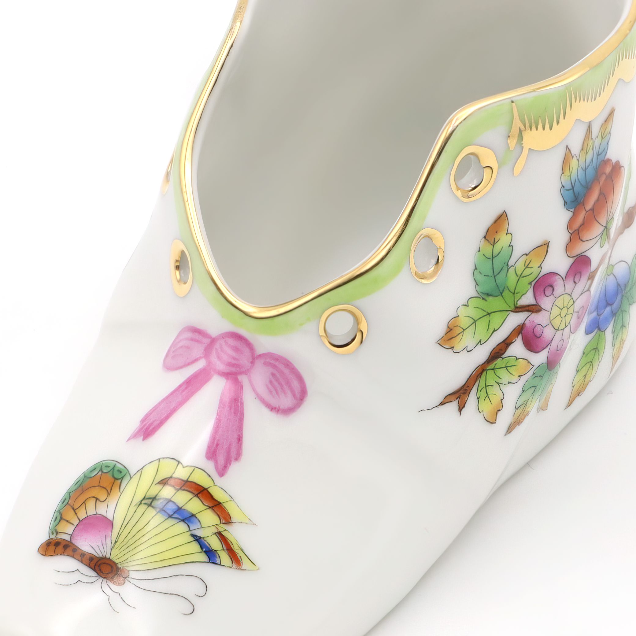 Herend is one of Hungary’s most famous porcelain manufacturers, with a legacy that dates all the way back to 1826. The company is especially well-known for its hand-painted pieces, where each figure, plate, or decorative item is finished by skilled artisans. The Queen Victoria pattern, featured here on the baby shoe, is one of Herend’s flagship designs. It was introduced in 1851 and actually named after Queen Victoria of England, who fell in love with the pattern at the Great Exhibition in London. The style is famous for its colorful butterflies and blossoming flowers, often edged with 24K gold, symbolizing beauty and life. Items like this baby shoe are unusual and considered rare, since Herend is renowned for producing its pieces in limited numbers, and each one is slightly unique due to the hand-painting. For the average person, owning a Herend Queen Victoria baby shoe is not just owning a pretty object, but holding onto a slice of European art history—a little treasure with decades of stories and a lot of old-world charm. Collectors and lovers of fine décor prize these pieces, keeping them well cared for in cabinets or on display where guests can admire both the artistry and the heritage.