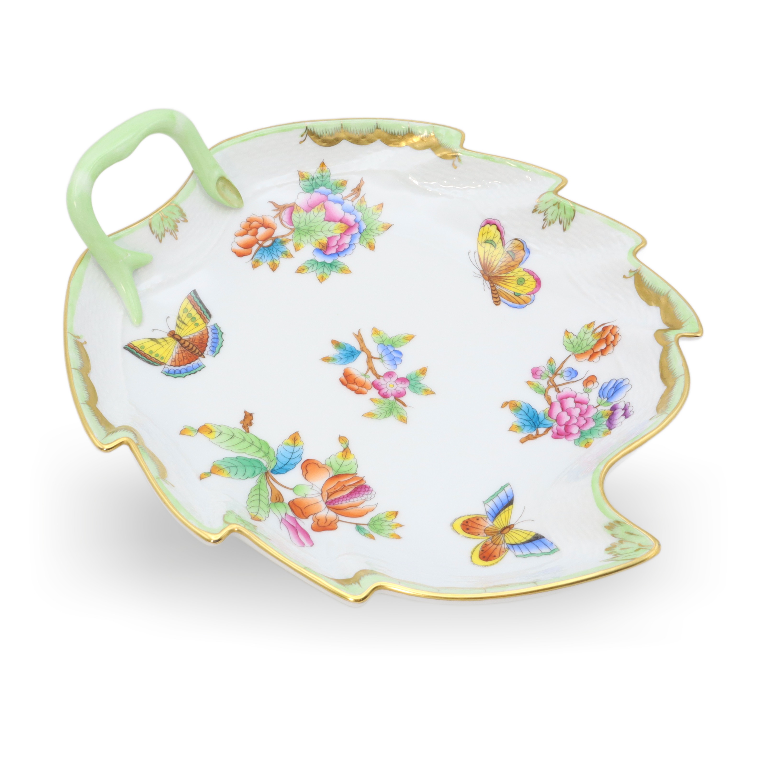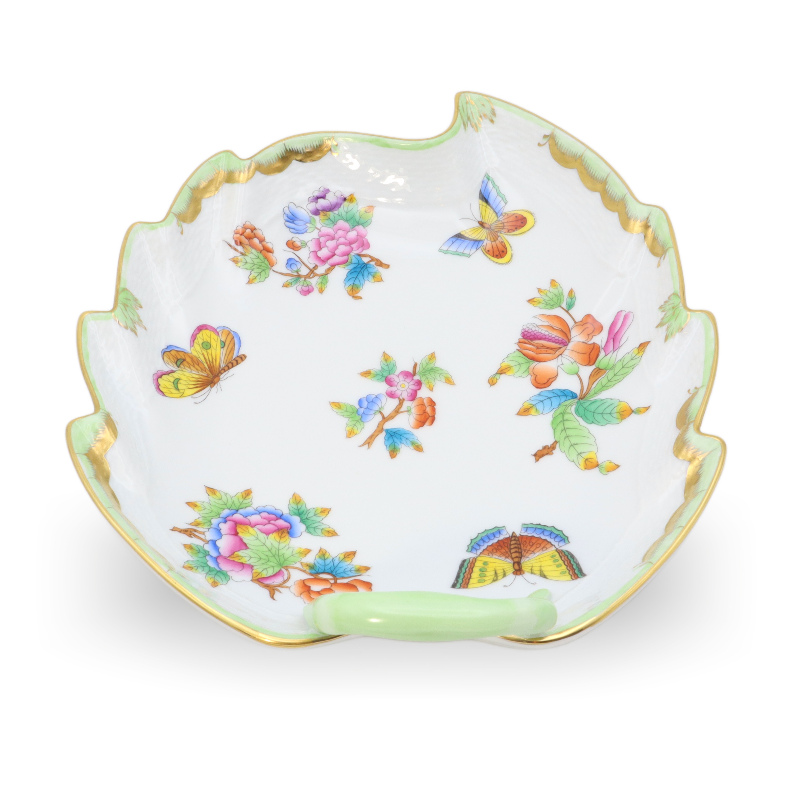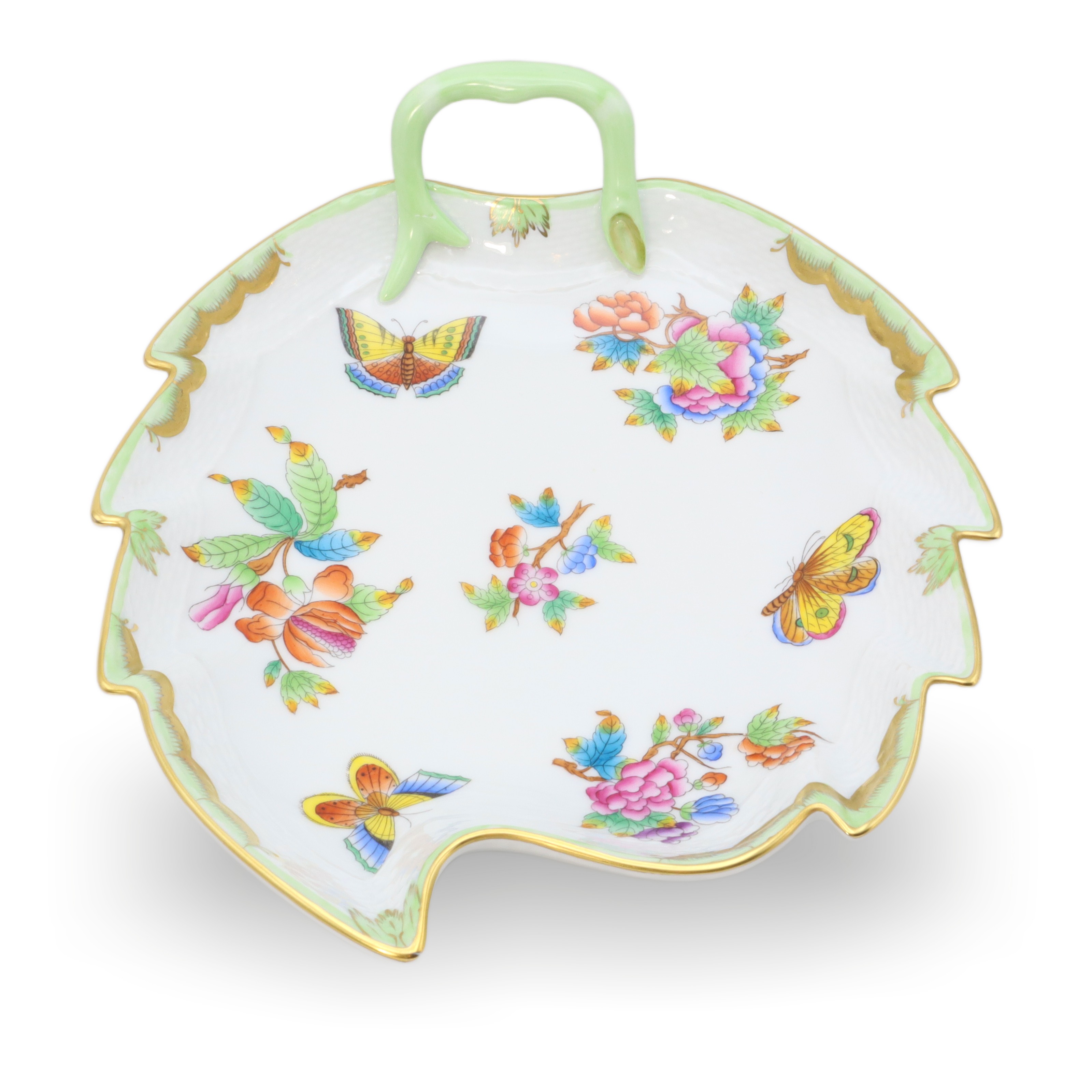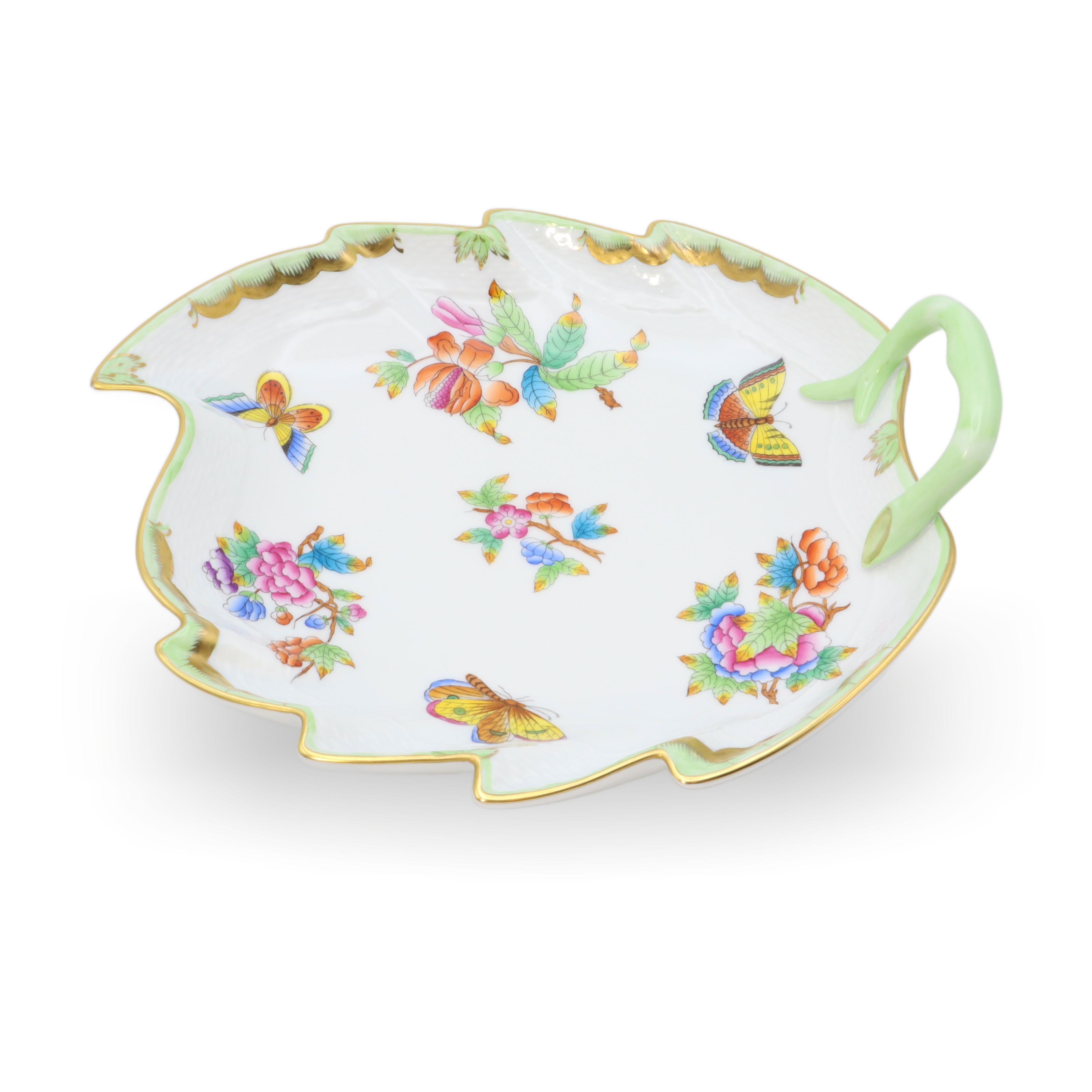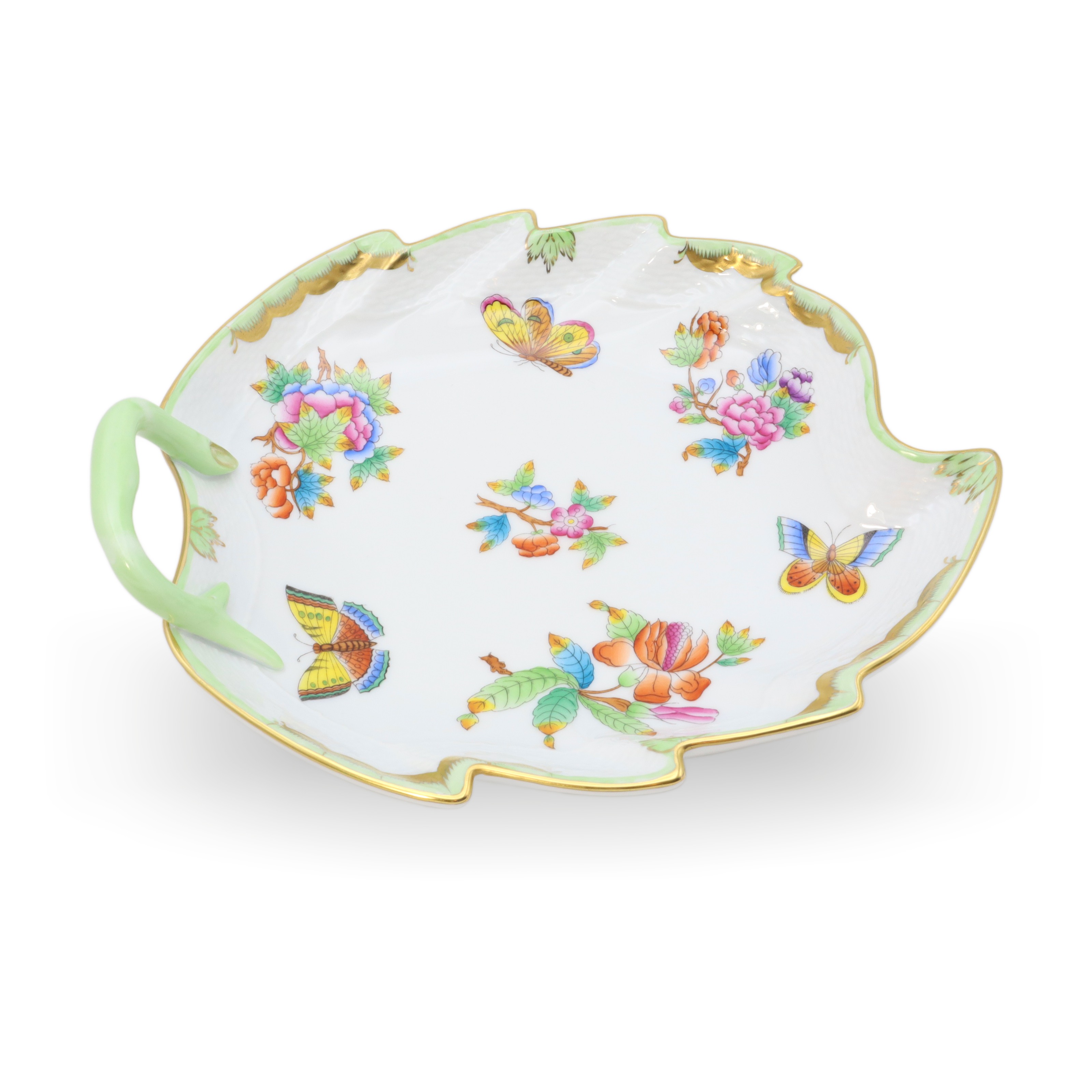 This beautiful piece is a Herend Queen Victoria large hand-painted leaf tray, a porcelain decorative dish from around 1960. At over sixty years old, it’s a vintage treasure that has managed to stay in near-mint condition—quite the feat for something so delicate. The tray stands about 3 inches tall, with a width of 8 inches and length of 9 inches, making it just the right size to make an impression on any table or shelf. Its leaf shape, charming green handle, and the detailed hand-painted butterflies and flowers give it that elegant, old-world feel. The rim, carefully curved and touched with gold, shows off the exquisite craftsmanship of the artisans who made it. Looking at its bright, careful artwork and unique shape, it’s no wonder pieces like this are rare to come by, especially in such amazing condition.