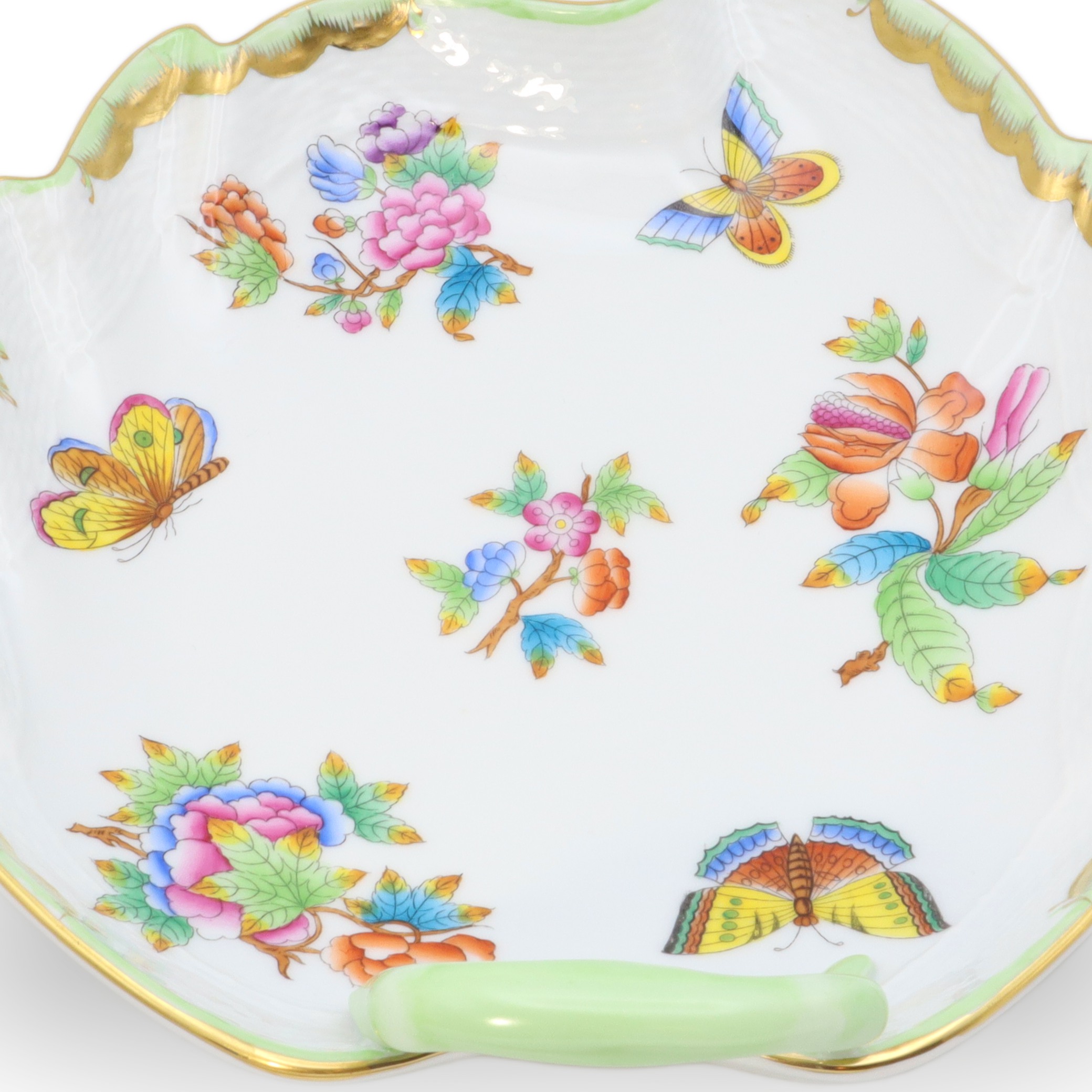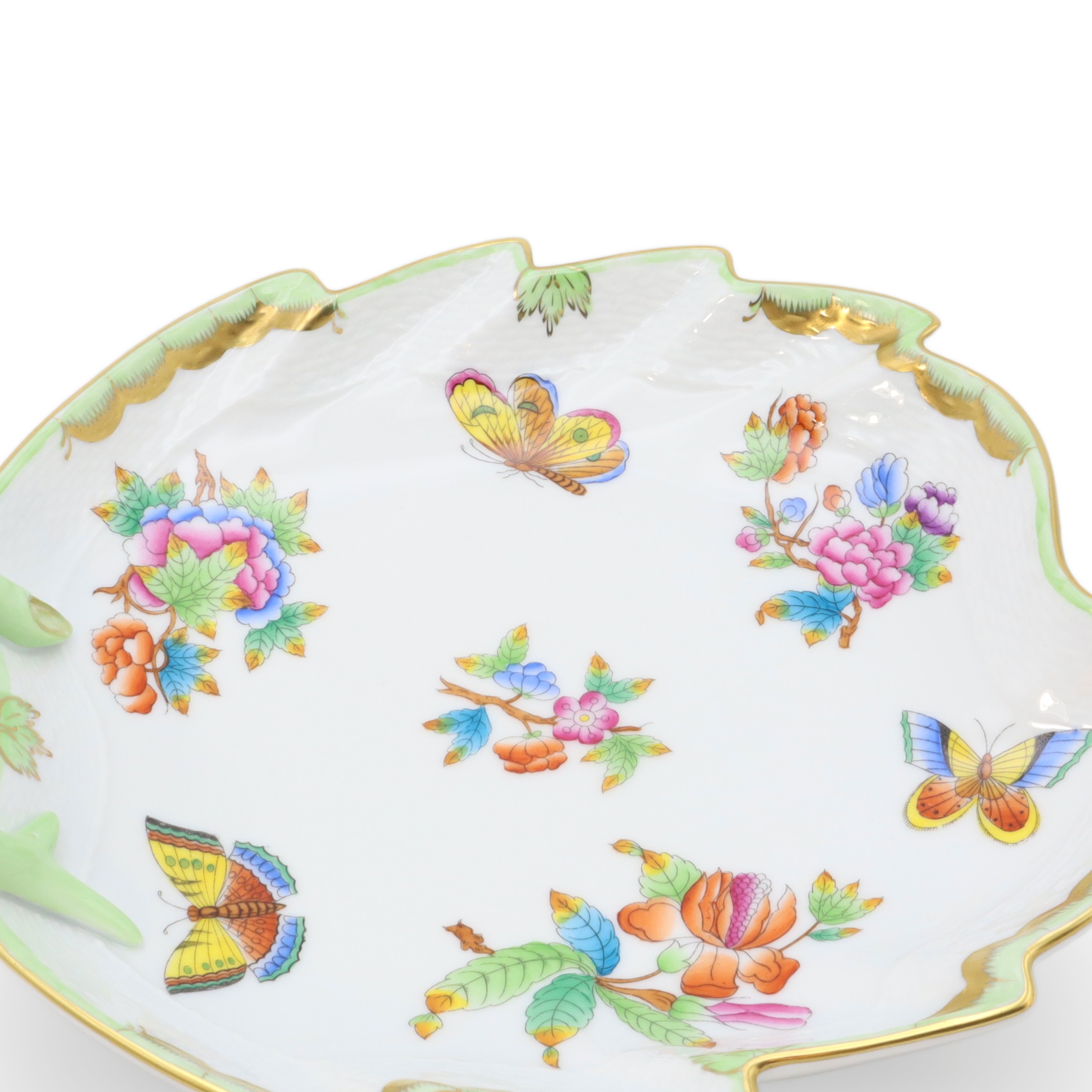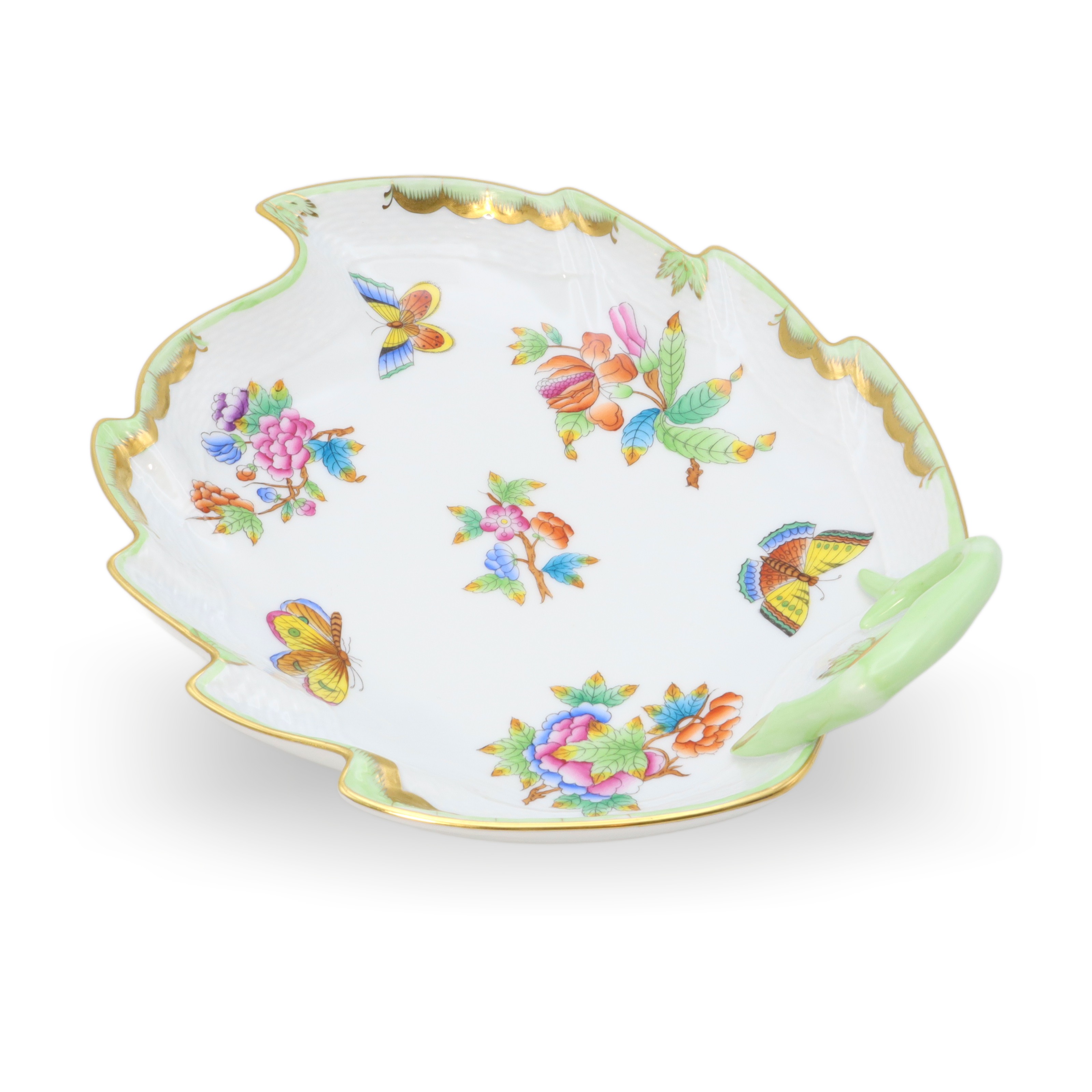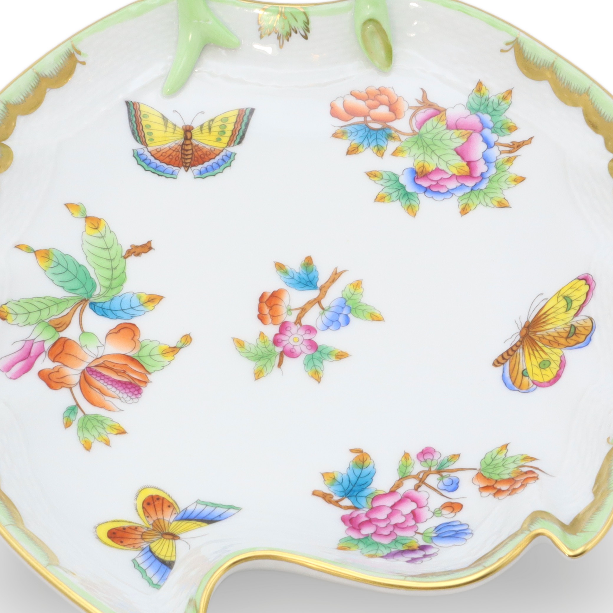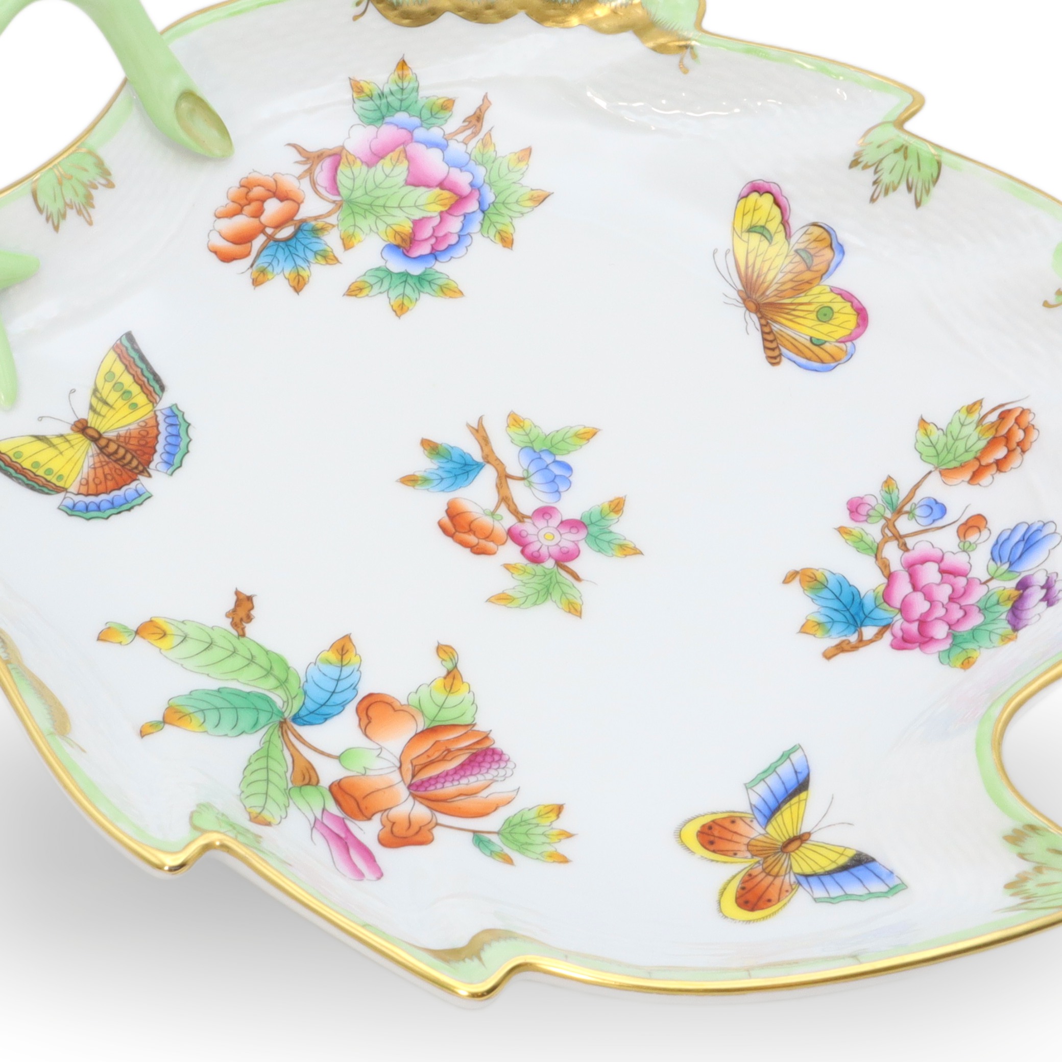 This beautiful piece is a Herend Queen Victoria large hand-painted leaf tray, a porcelain decorative dish from around 1960. At over sixty years old, it’s a vintage treasure that has managed to stay in near-mint condition—quite the feat for something so delicate. The tray stands about 3 inches tall, with a width of 8 inches and length of 9 inches, making it just the right size to make an impression on any table or shelf. Its leaf shape, charming green handle, and the detailed hand-painted butterflies and flowers give it that elegant, old-world feel. The rim, carefully curved and touched with gold, shows off the exquisite craftsmanship of the artisans who made it. Looking at its bright, careful artwork and unique shape, it’s no wonder pieces like this are rare to come by, especially in such amazing condition.