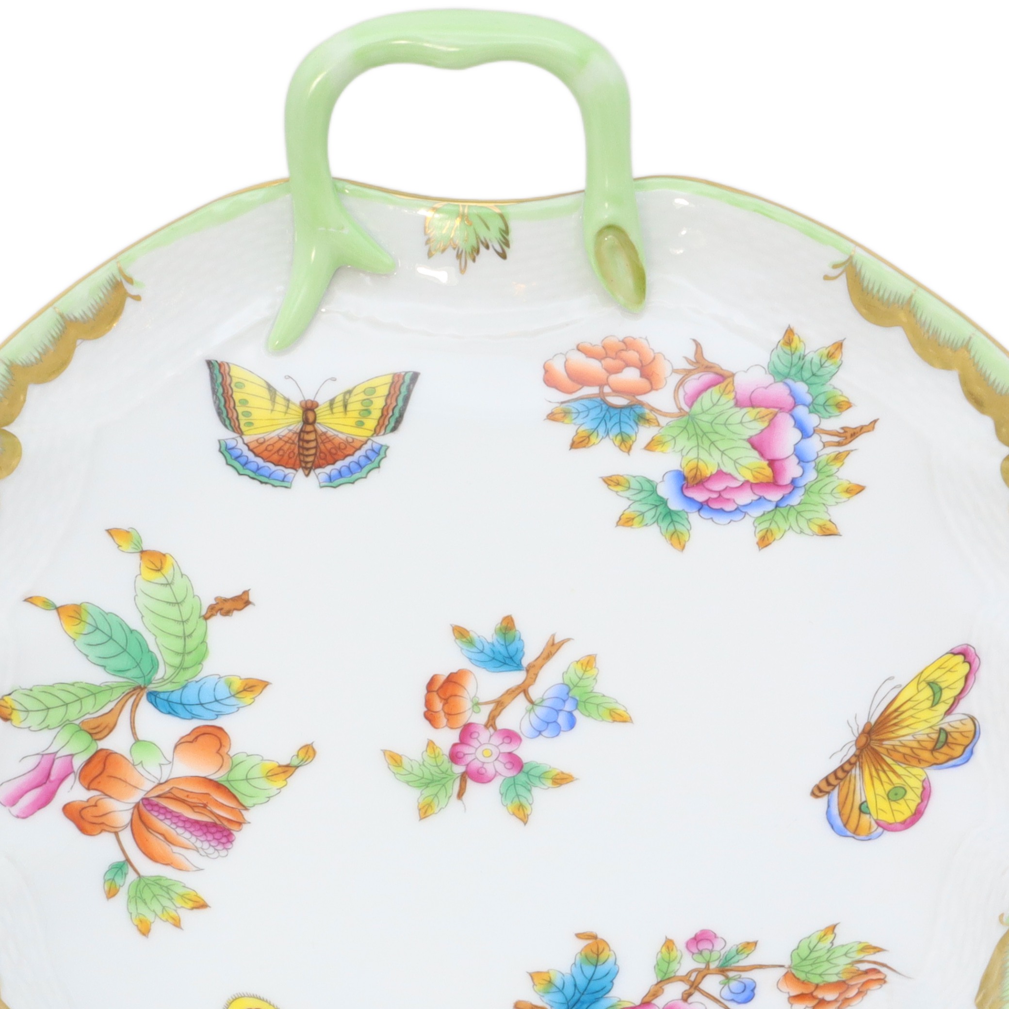 Herend is a well-known Hungarian porcelain manufacturer, loved worldwide for its careful hand-painted designs and quality craftsmanship. The “Queen Victoria” pattern, first unveiled at the London Great Exhibition in 1851, is one of their most famous lines. The name comes from Queen Victoria herself, who was so taken with the pattern that she ordered a set for Windsor Castle. Each item in the Queen Victoria line sports cheerful peonies, butterflies, and leafy accents, all painted in lively colors. These pieces are often family heirlooms, passed down through generations, and are especially valued by collectors because each one is a little different, thanks to the handwork involved. Herend’s artistry and attention to detail haven’t changed much over the decades, so owning a tray from the 1960s means having a piece of that rich history. Finding one in such remarkable shape today, with its bright colors intact and gold trim still glowing, truly makes this a special collectible.