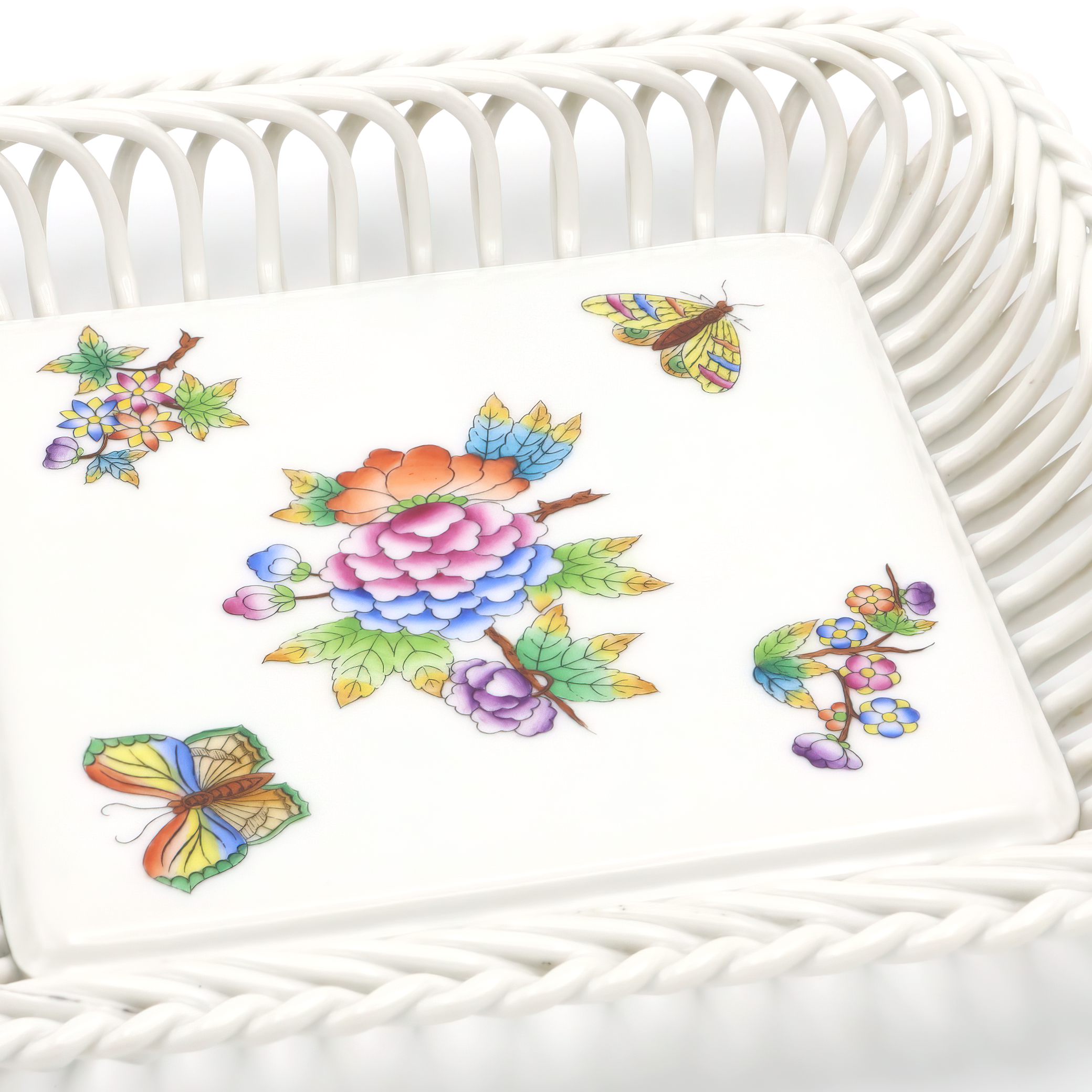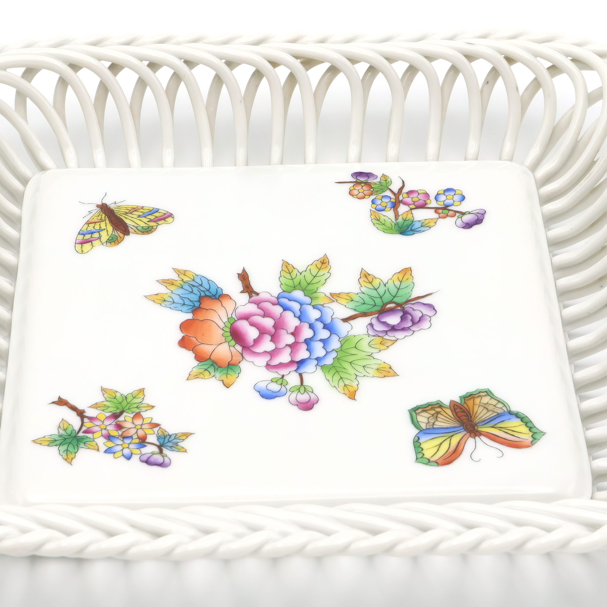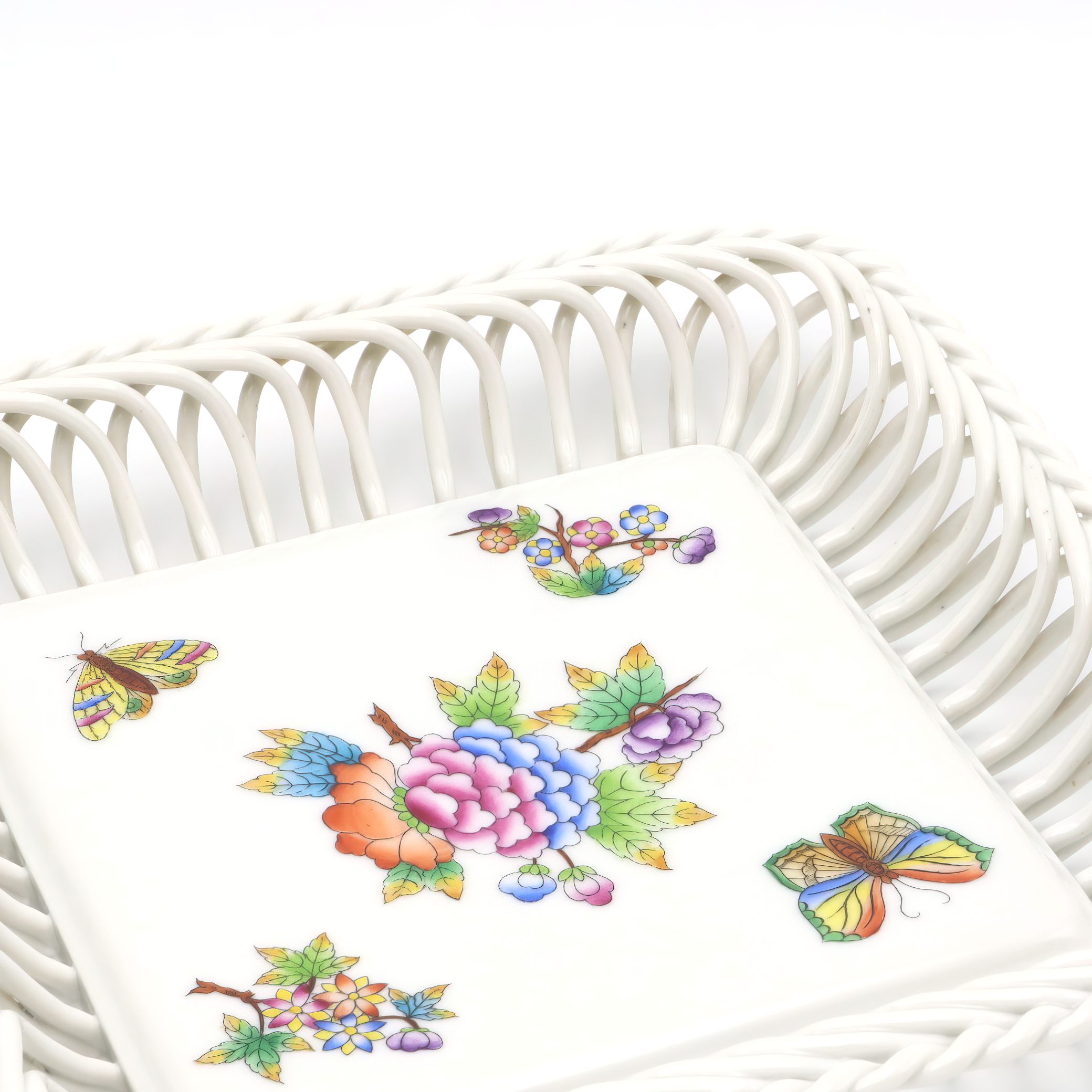 This beautiful piece is a Herend Queen Victoria open weave basket, crafted around 1960. Measuring just about 1.5 inches in height and 7.5 inches in both width and length, it’s the perfect size to serve as a centerpiece on a coffee table or sideboard. The open weave porcelain design has a delicately twisted pattern around the edges, showing off the kind of handcraftsmanship you rarely find these days. The inside of the basket features hand-painted floral motifs and colorful butterflies that pop against the bright white porcelain, making it feel at once elegant and lively. After all these years, it’s still in near mint condition, preserving its beauty and craftsmanship with only the lightest signs of age—a testament to the quality of Herend’s work.