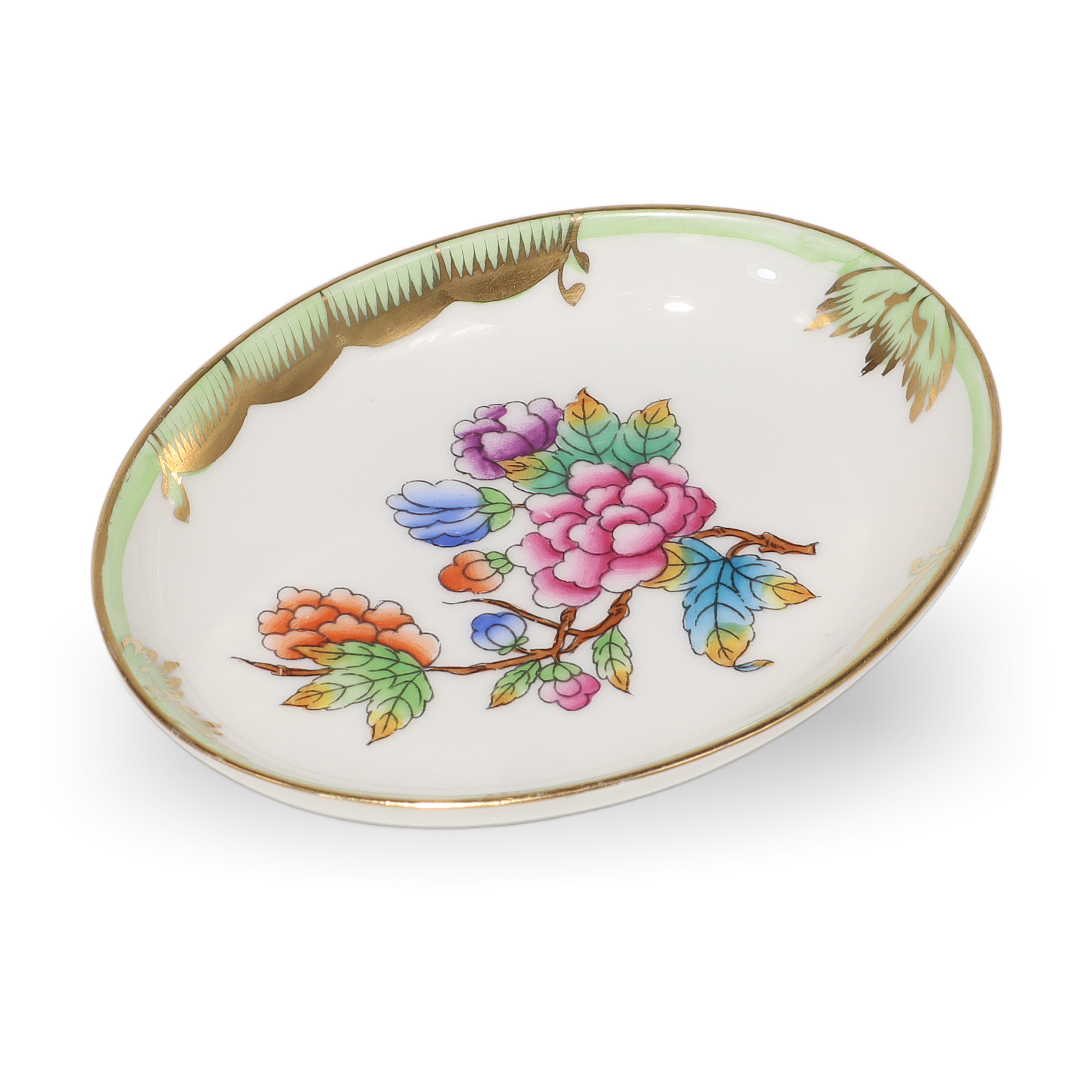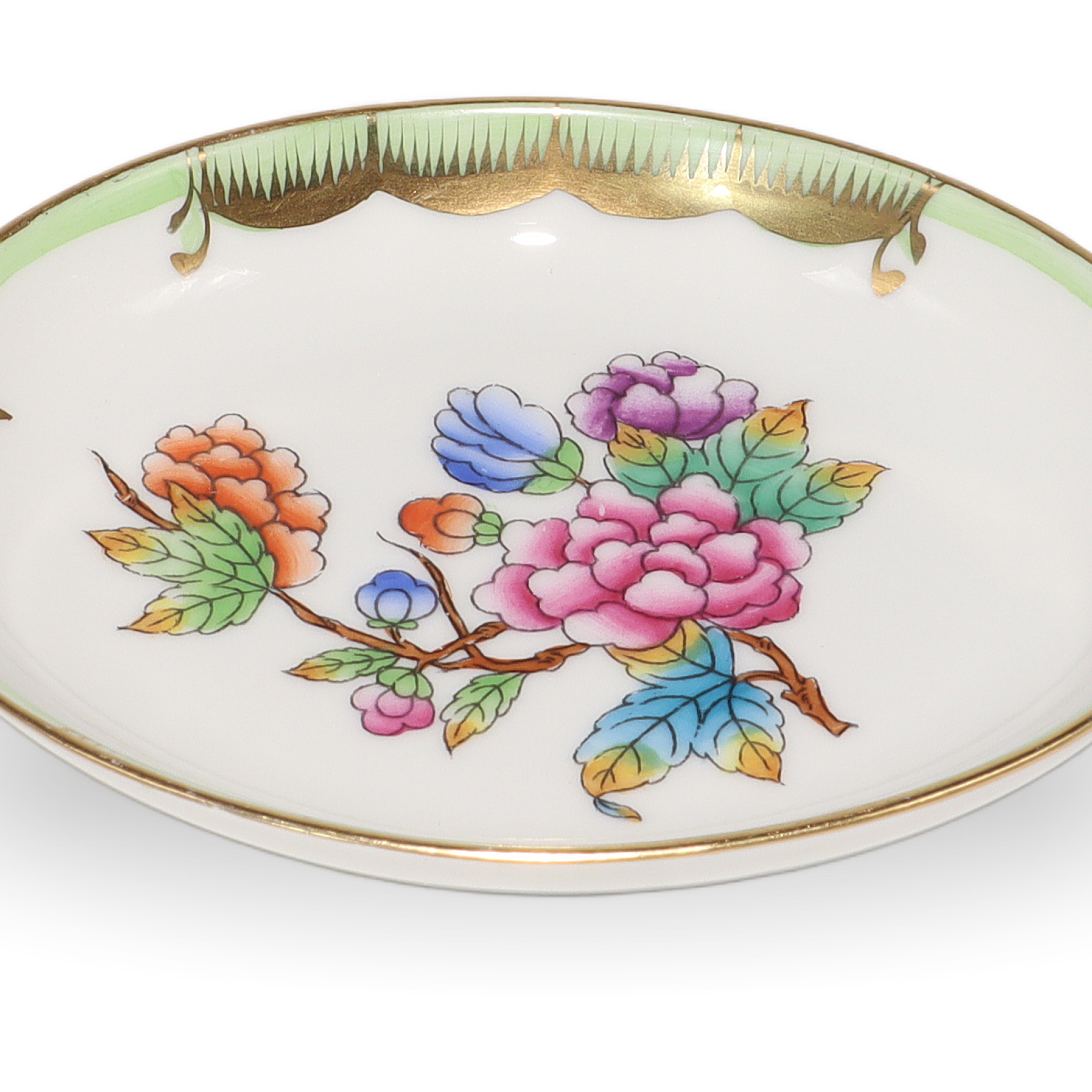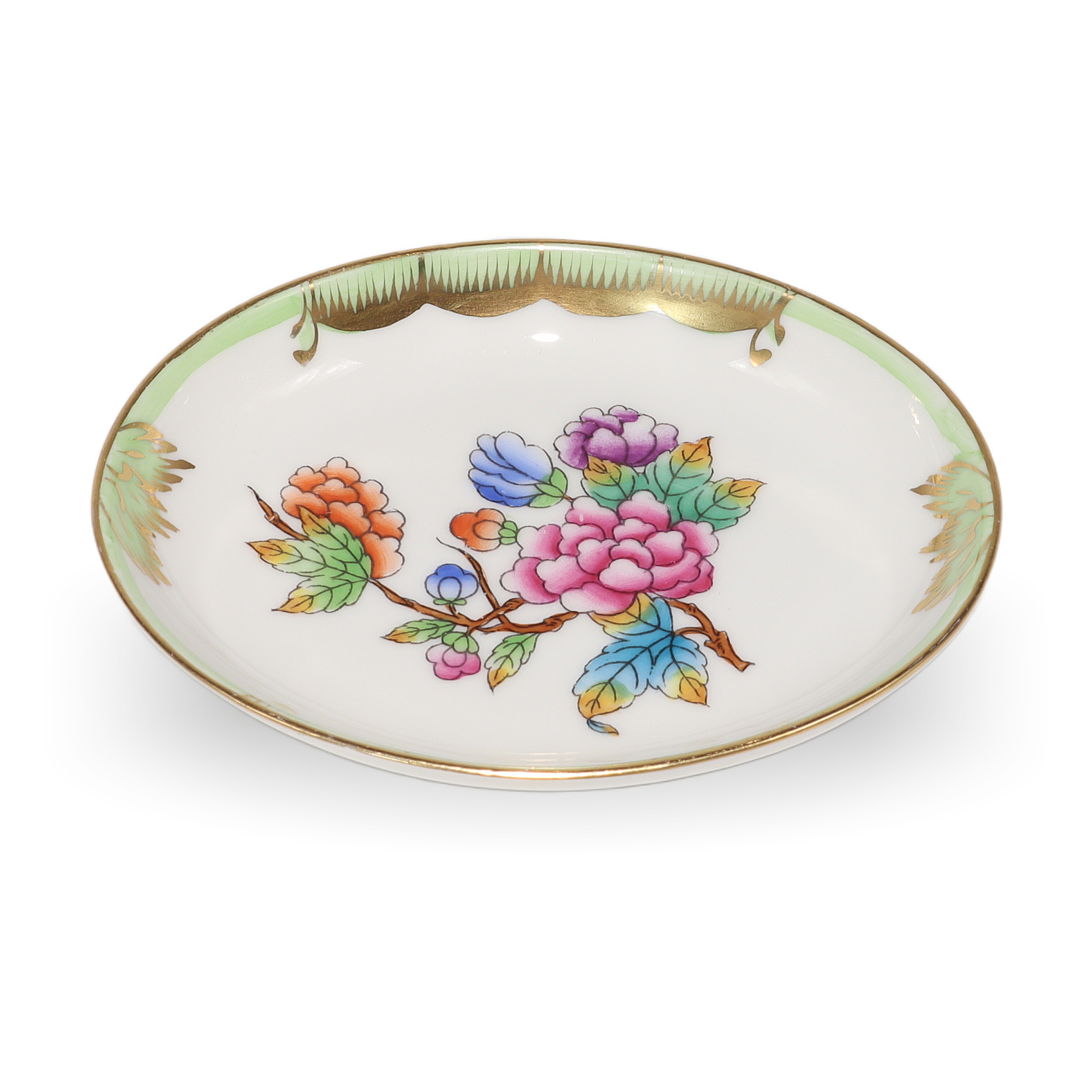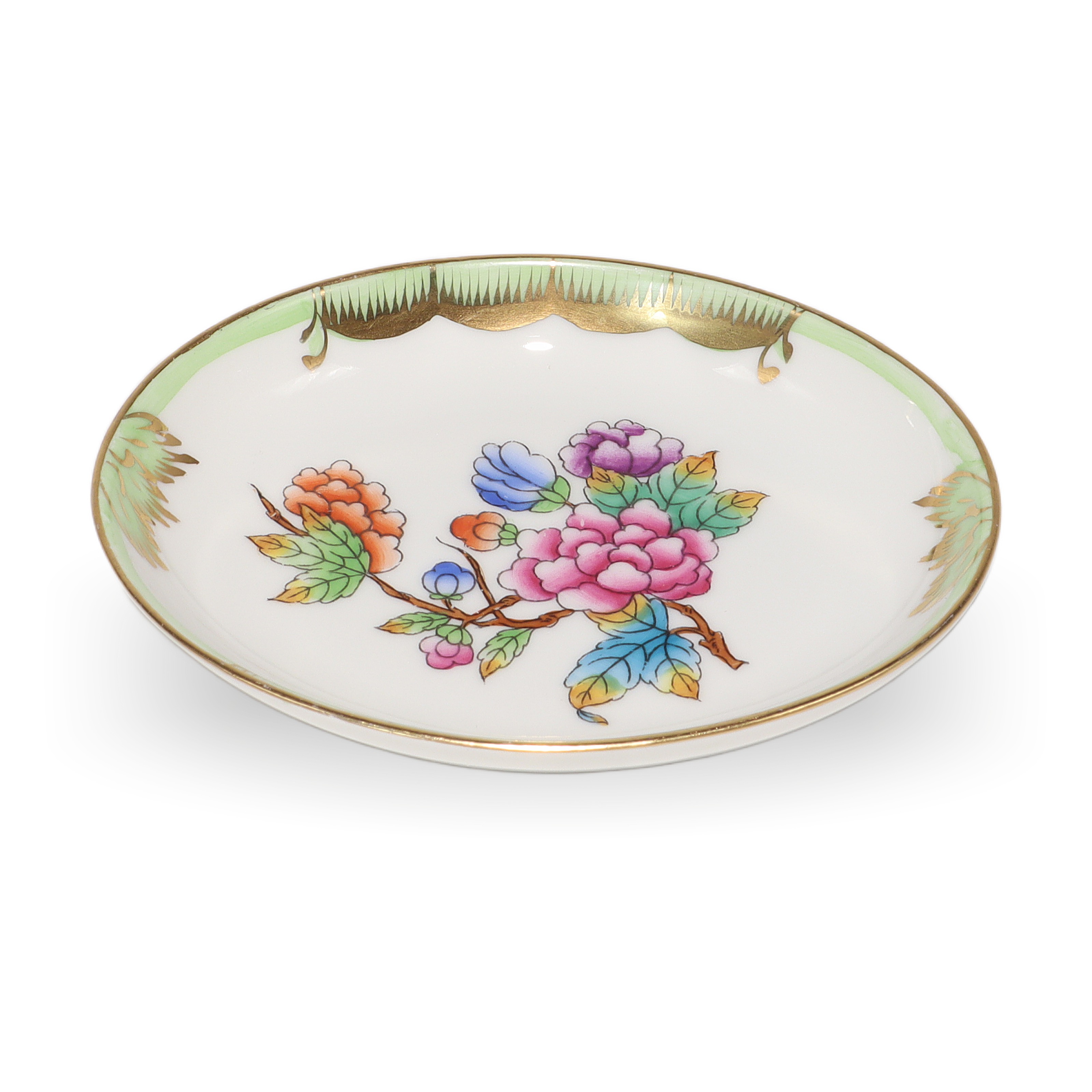 Herend is a renowned Hungarian brand, celebrated for its fine hand-painted porcelain. The Queen Victoria pattern, introduced in 1851 at the London Great Exhibition, is the brand’s most iconic and enduring design. The pattern was so admired that Queen Victoria herself ordered a set, which helped put Herend on the world map. Inspired by the blooming gardens and colorful butterflies, the Queen Victoria line has been beloved for over 170 years. Pieces like this small jewelry tray are considered quite collectible and don’t come up for sale all that often, especially in such pristine shape. Herend porcelain is known for its durability, vibrant hand-applied color, and distinctive designs, making each piece both a work of art and a family heirloom. If you’re looking for something truly special—something that feels both precious and timeless—this sweet jewelry dish fits the bill, carrying with it a legacy of European artistry and time-honored tradition.