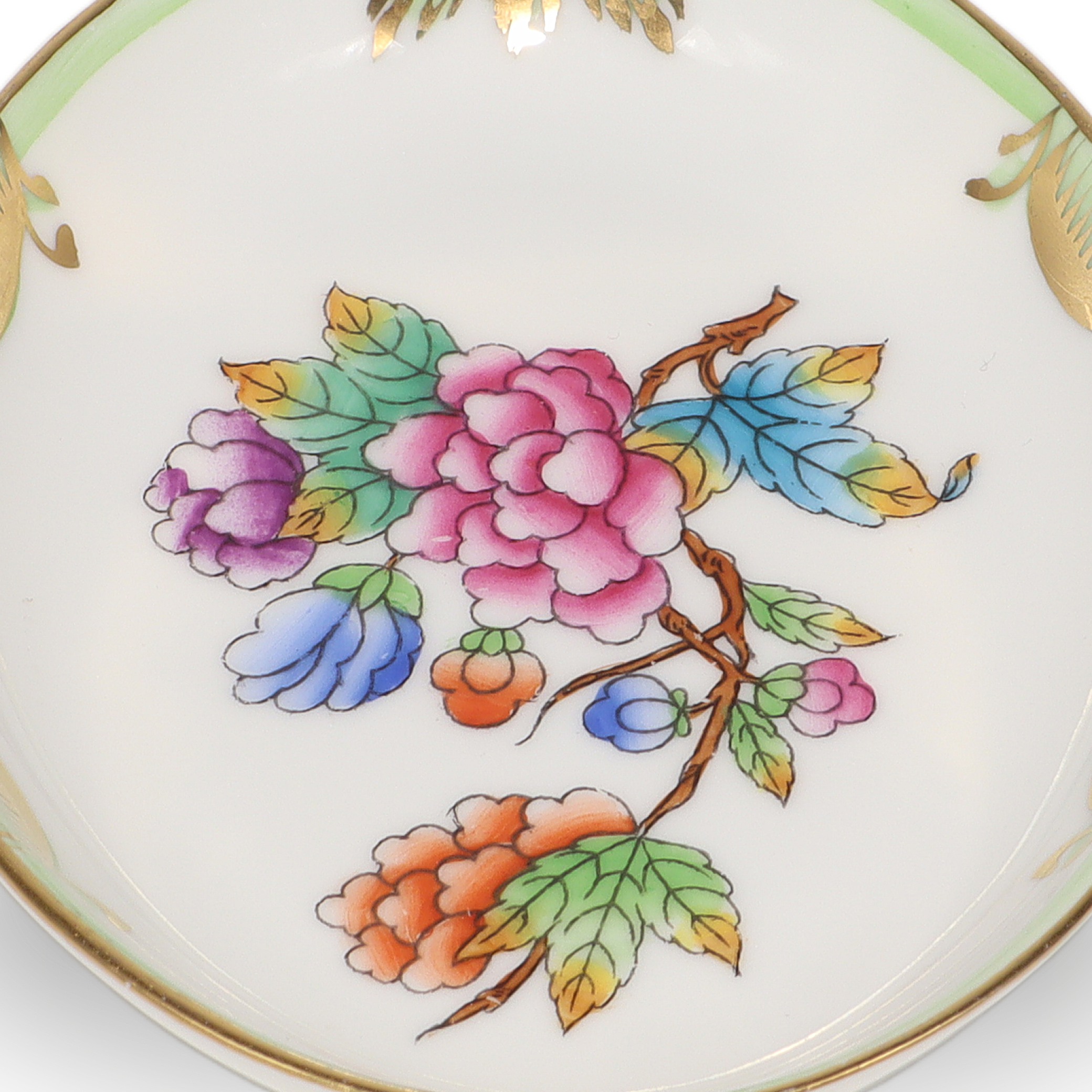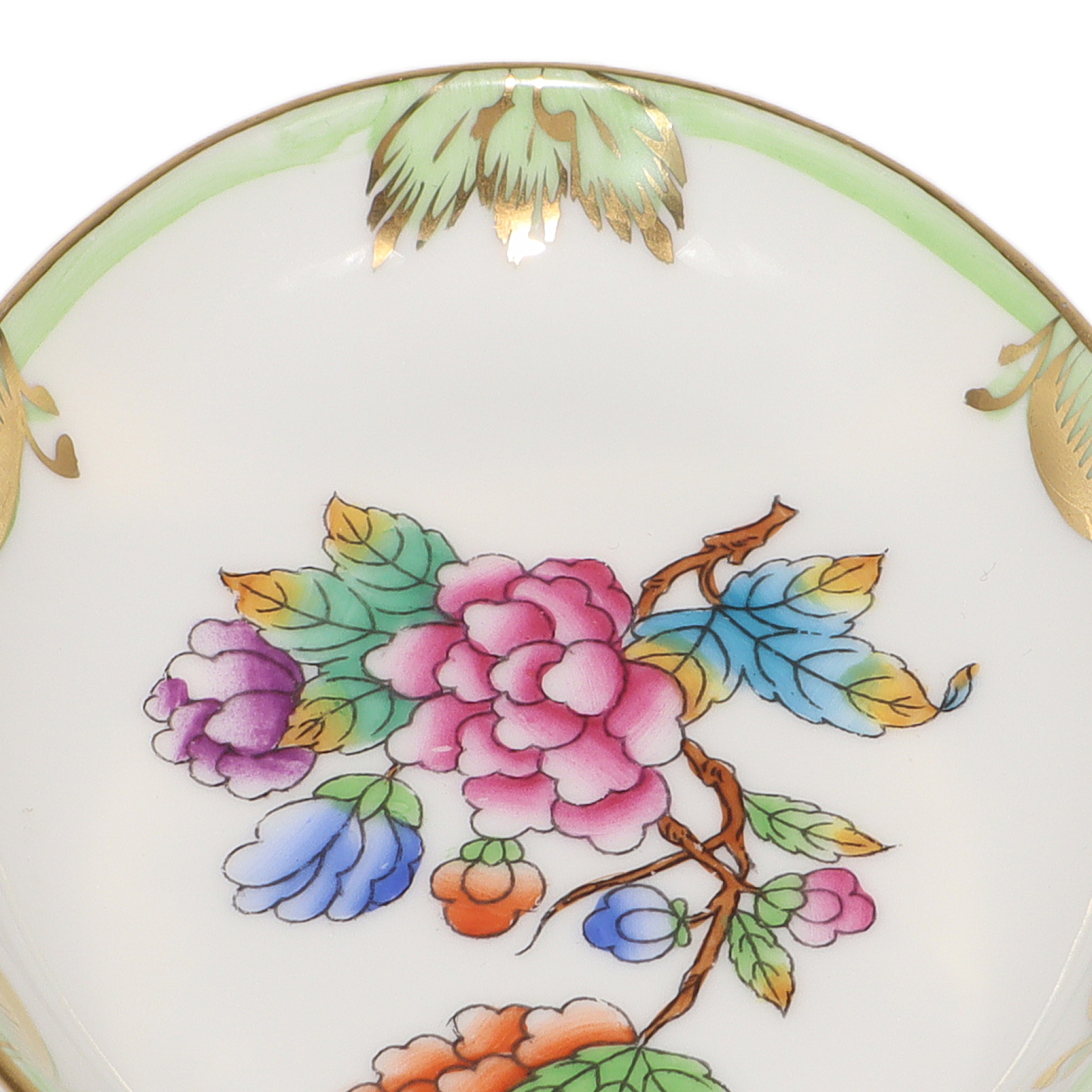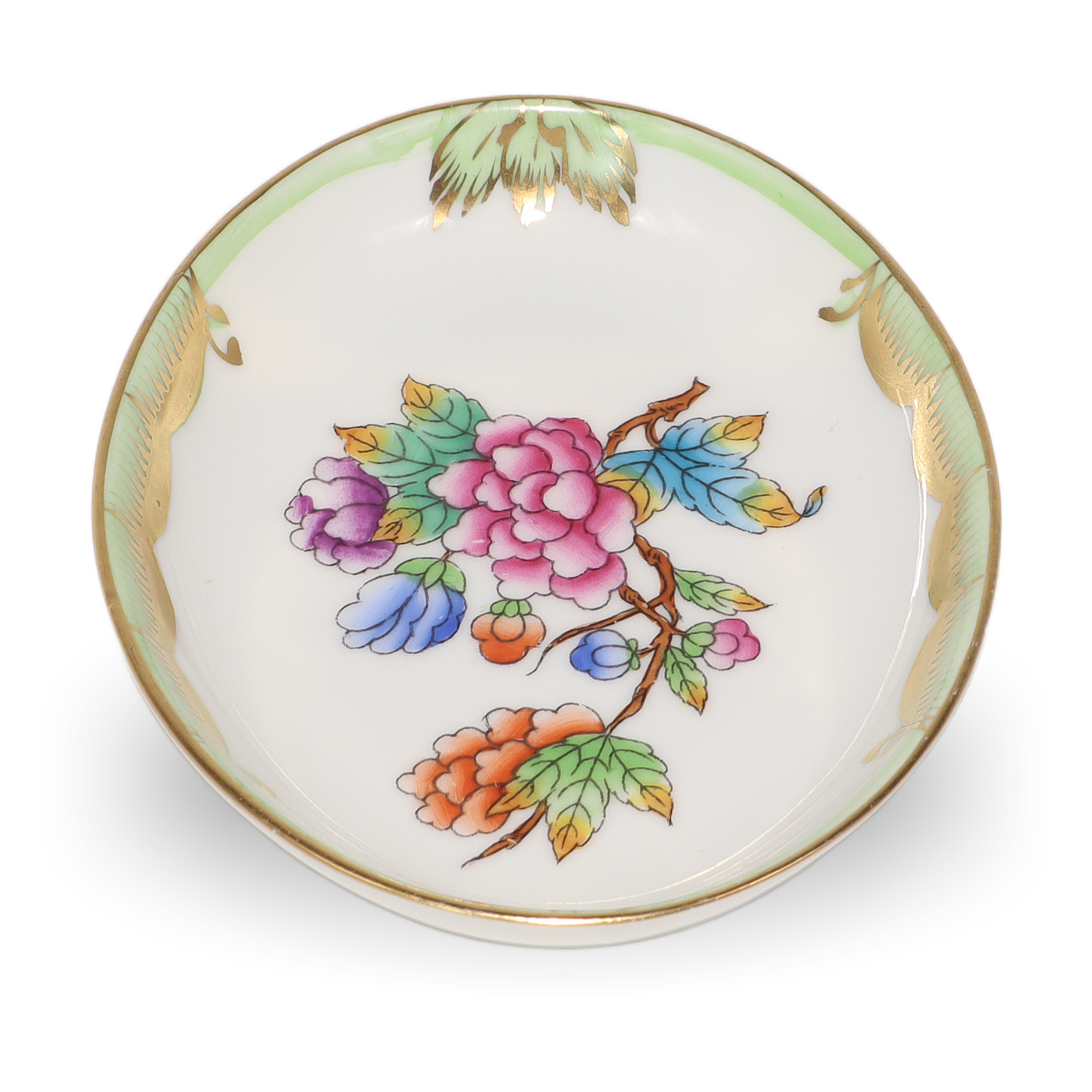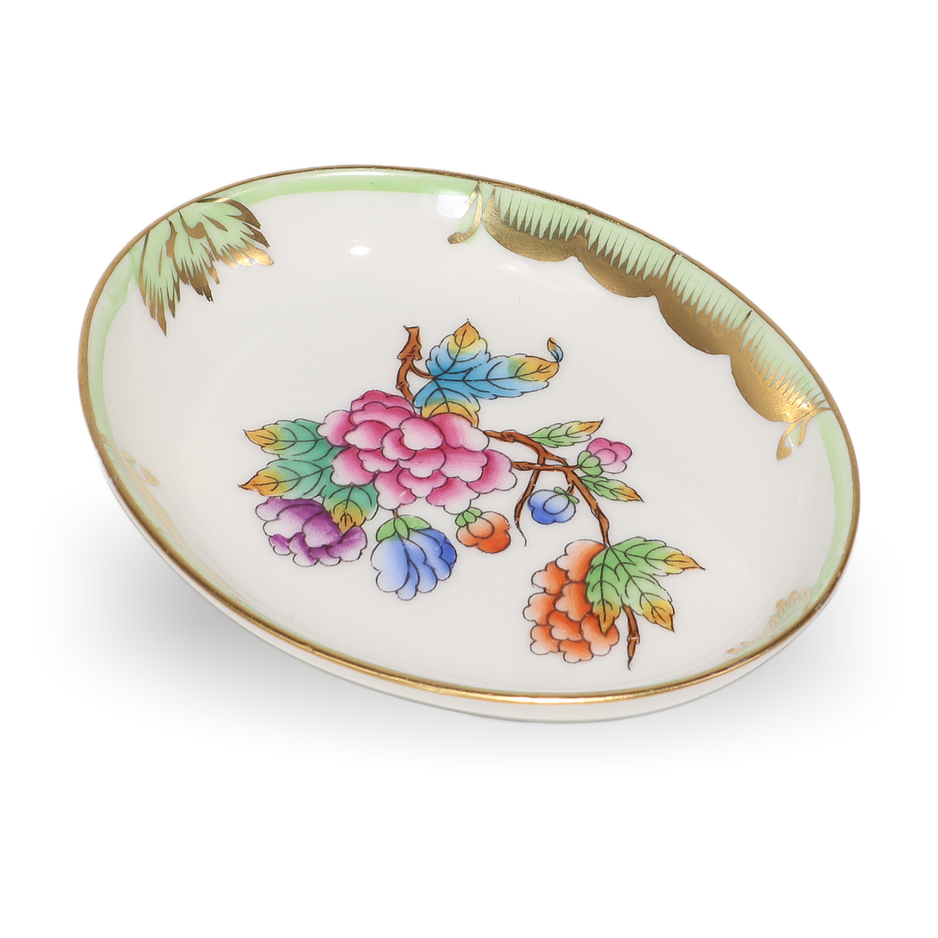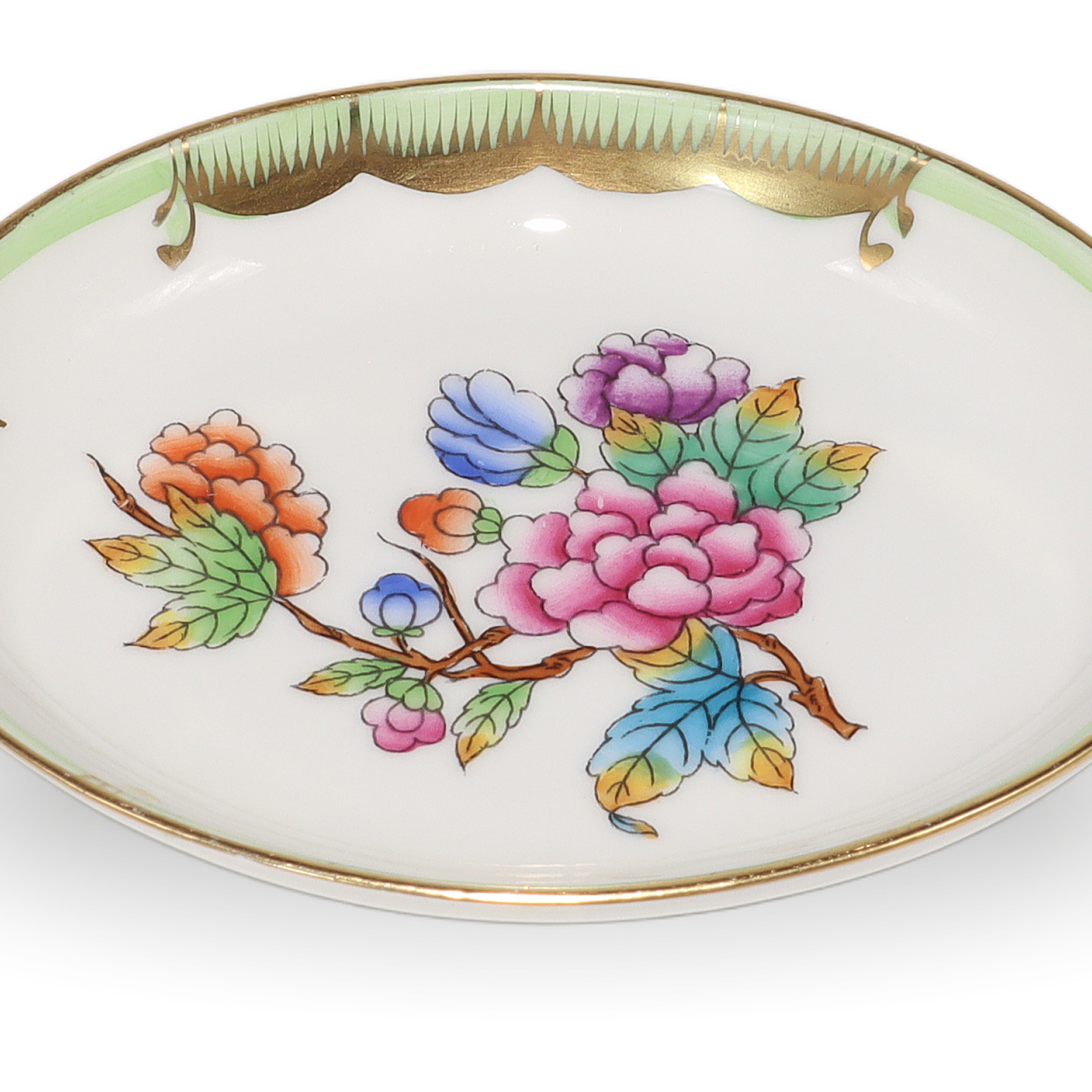Herend is a renowned Hungarian brand, celebrated for its fine hand-painted porcelain. The Queen Victoria pattern, introduced in 1851 at the London Great Exhibition, is the brand’s most iconic and enduring design. The pattern was so admired that Queen Victoria herself ordered a set, which helped put Herend on the world map. Inspired by the blooming gardens and colorful butterflies, the Queen Victoria line has been beloved for over 170 years. Pieces like this small jewelry tray are considered quite collectible and don’t come up for sale all that often, especially in such pristine shape. Herend porcelain is known for its durability, vibrant hand-applied color, and distinctive designs, making each piece both a work of art and a family heirloom. If you’re looking for something truly special—something that feels both precious and timeless—this sweet jewelry dish fits the bill, carrying with it a legacy of European artistry and time-honored tradition.