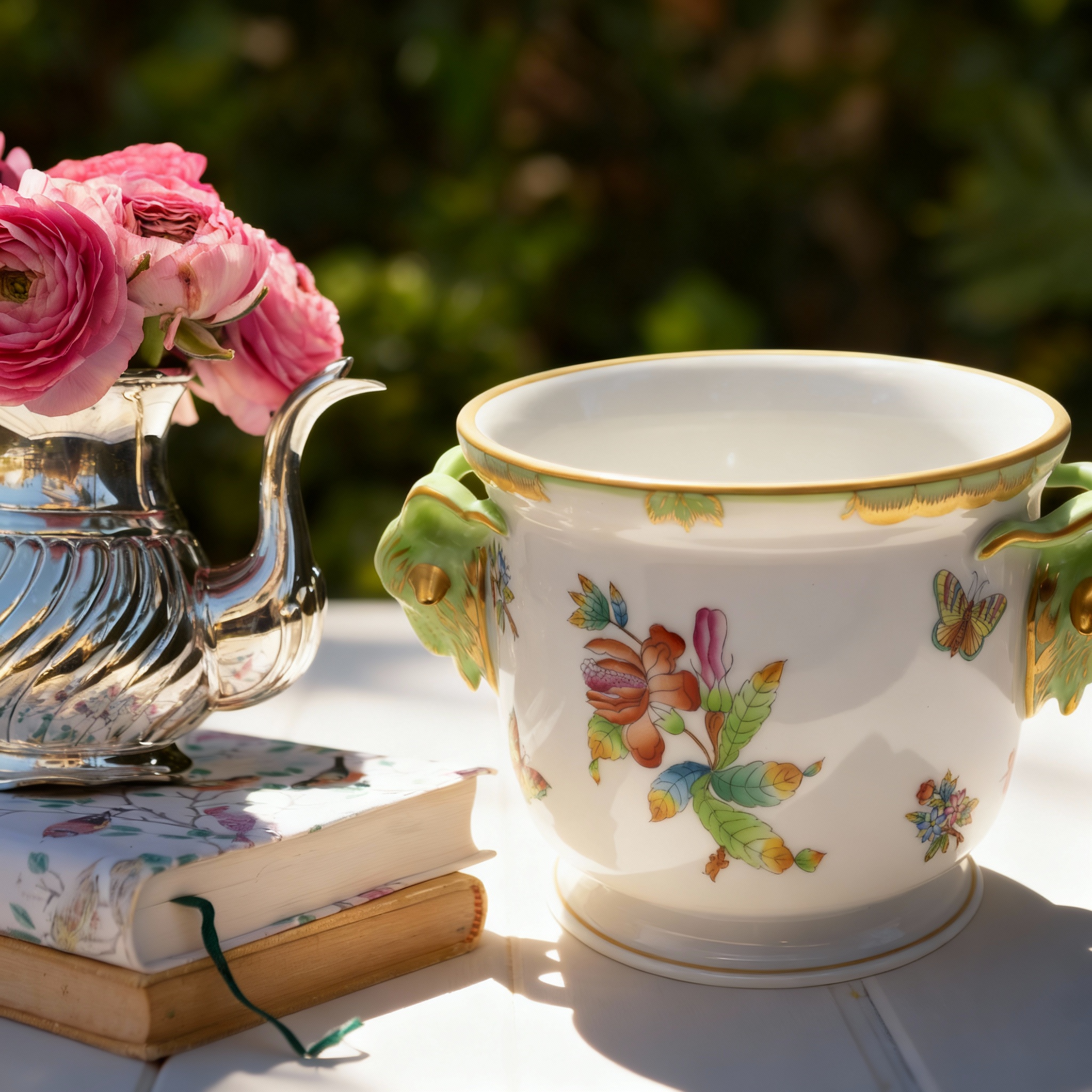 This lovely piece is a Herend Queen Victoria vintage cachepot, featuring distinctive ram-shaped handles on both sides. Dating back to around 1950,…