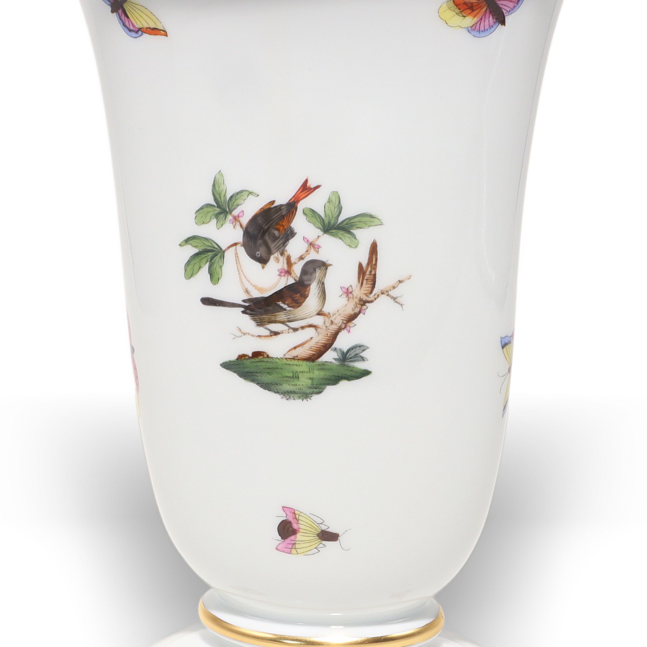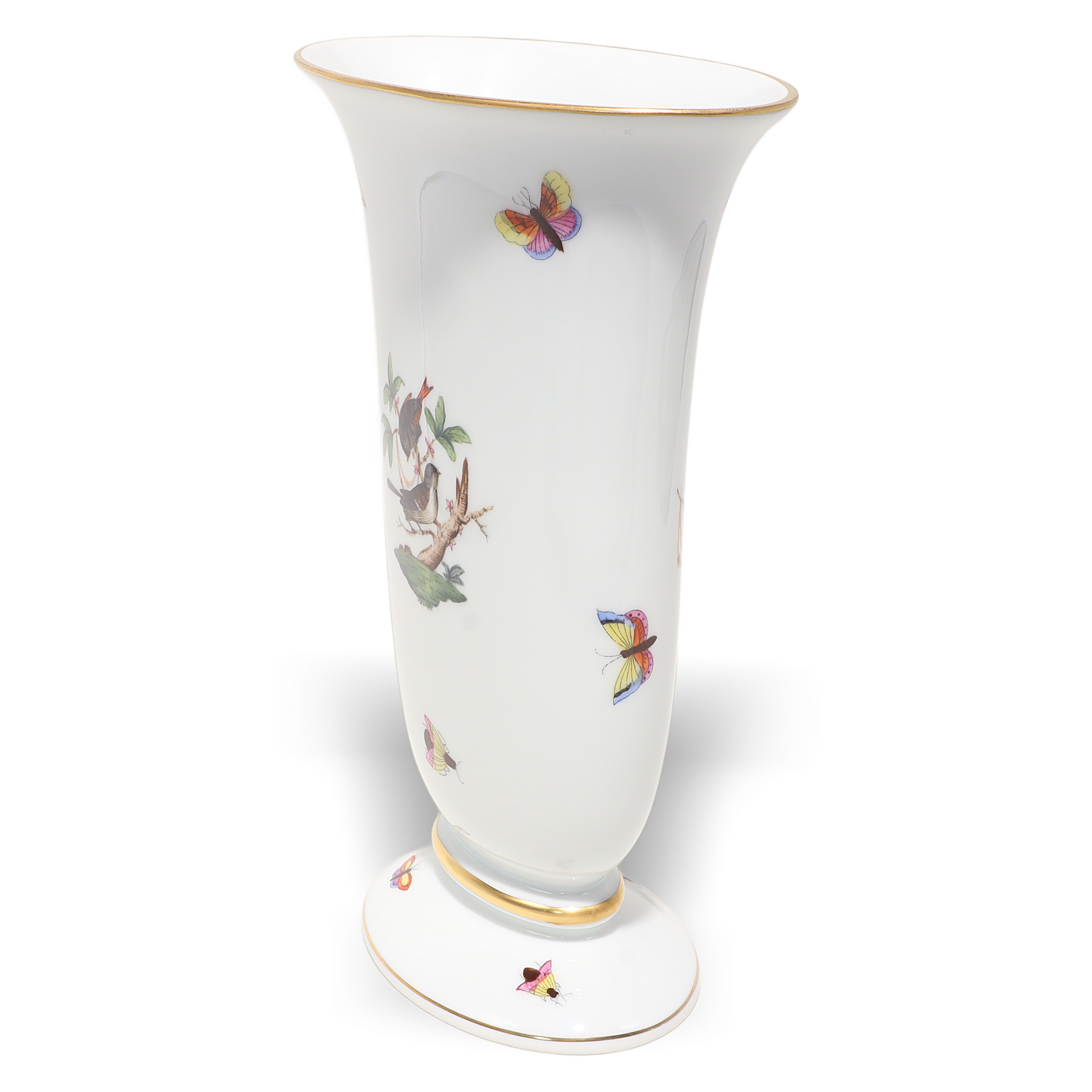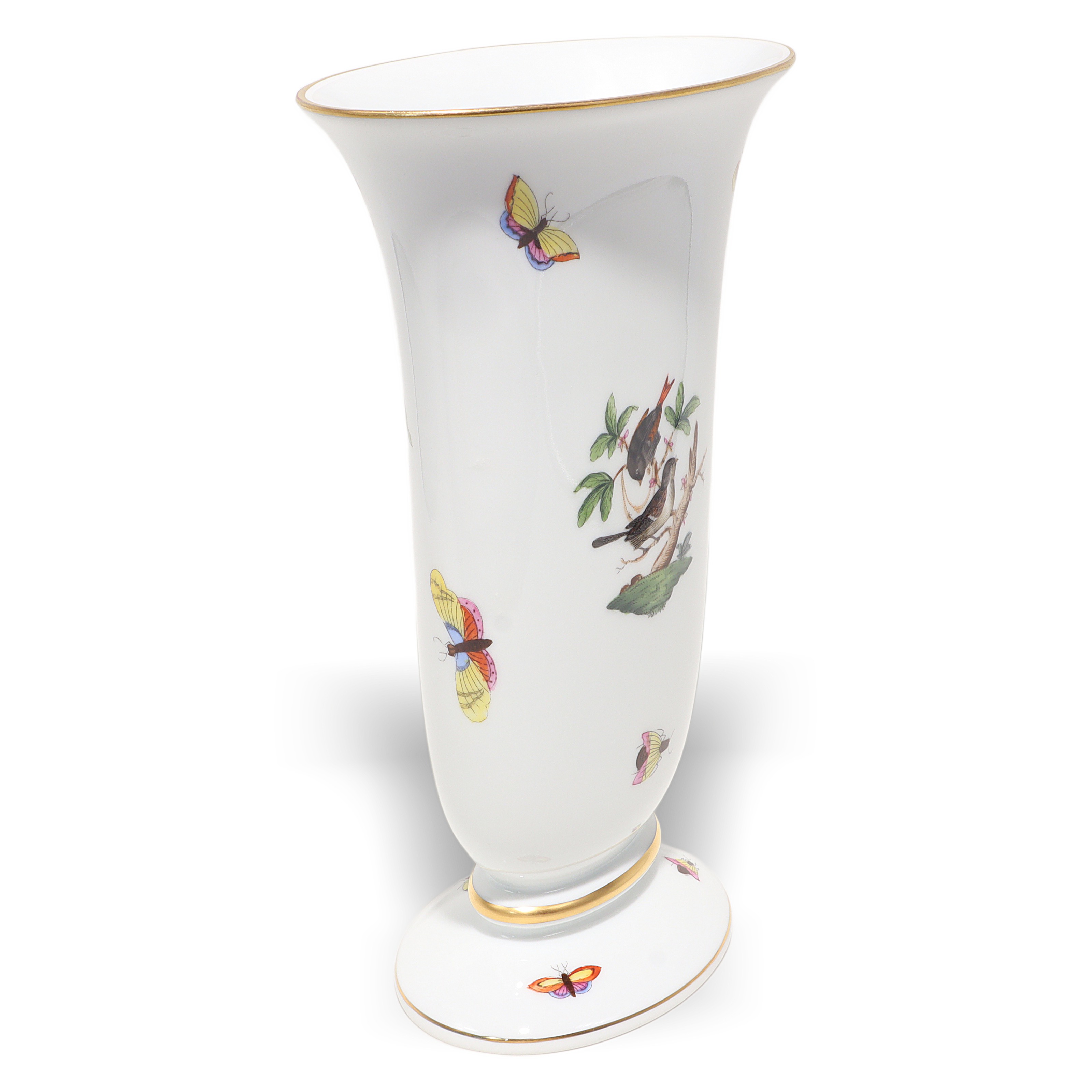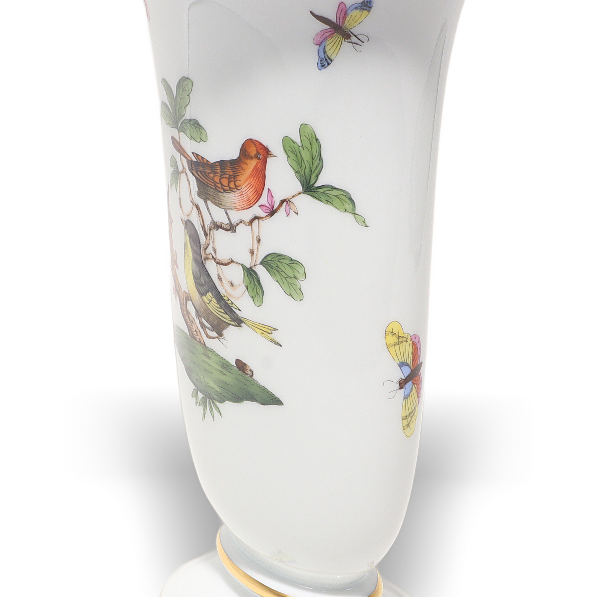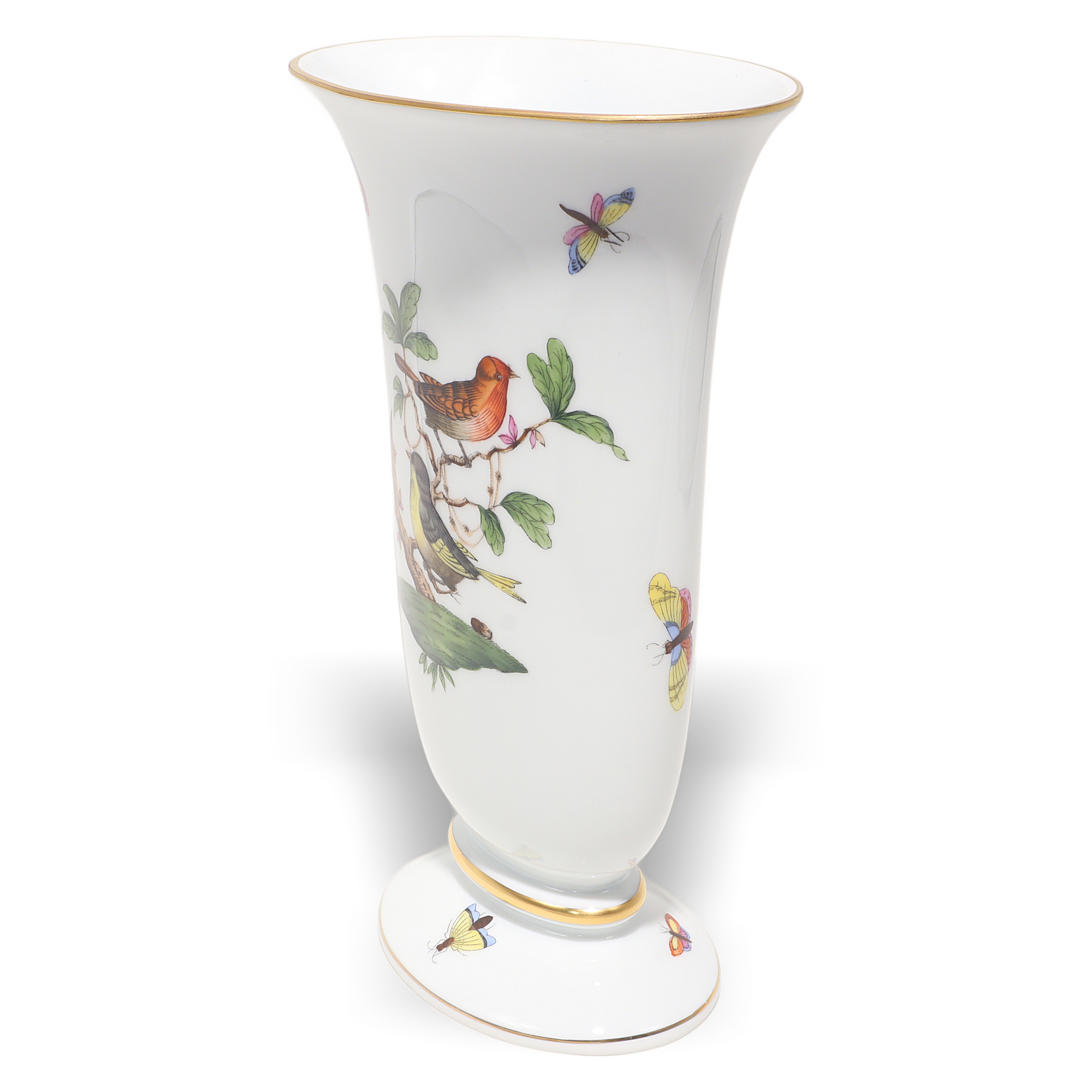 Herend, founded in 1826 in Hungary, is famous for fully hand-painted hard‑paste porcelain. The Rothschild Birds pattern, introduced around 1860 for the Viennese Rothschild family, tells the legend of a misplaced necklace discovered in a tree by birds—hence the perching birds and playful butterflies. Pattern code is RO, and no two scenes are exactly the same because each piece is painted by an individual artist, then accented with real gold and fired multiple times. Vases from the 1960s–70s era are sought after, especially in clean condition with strong color and gilding, and they’re less common than plates or cups.