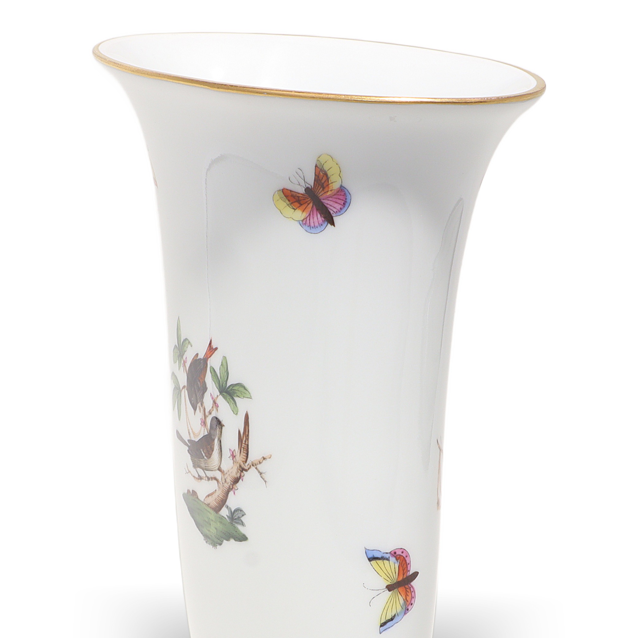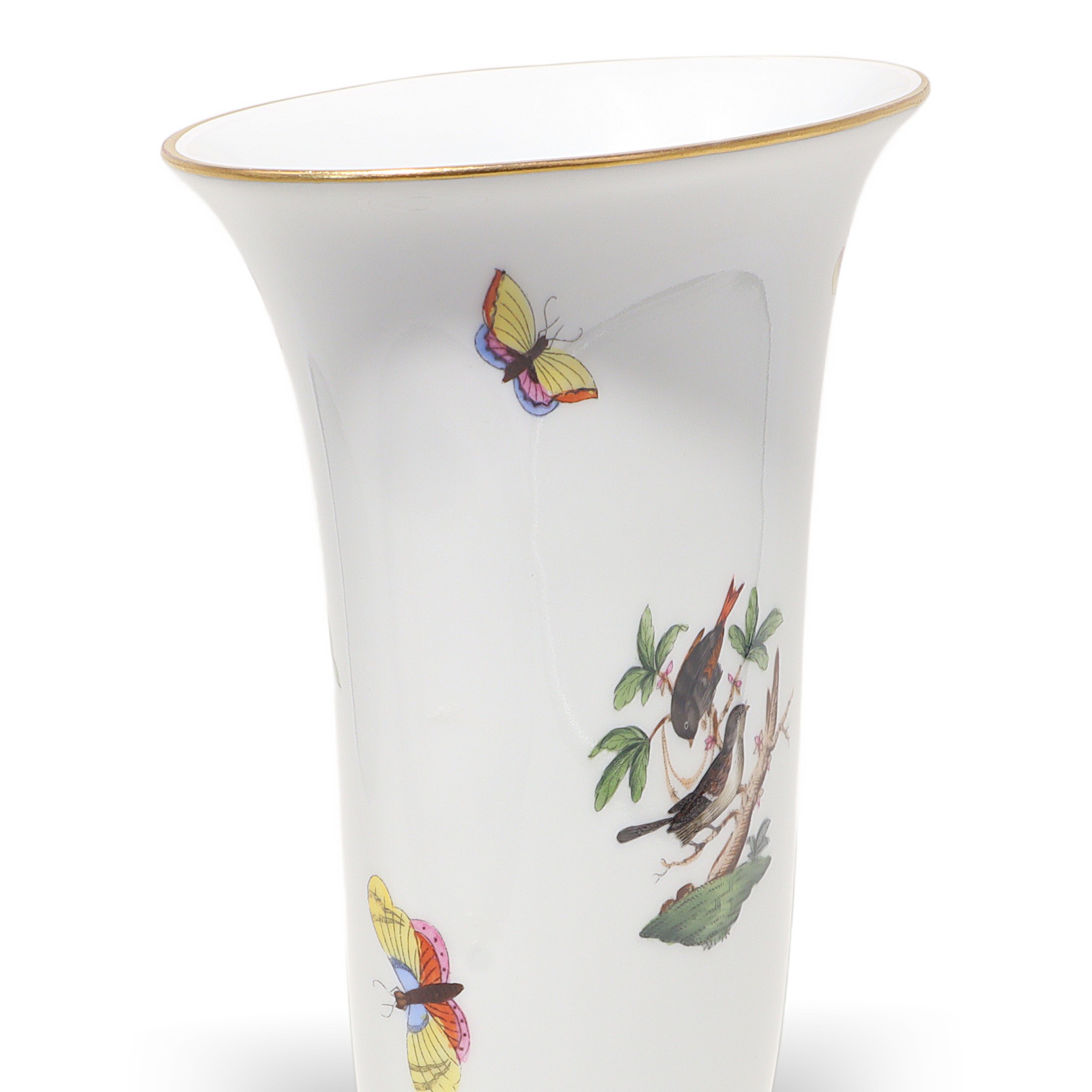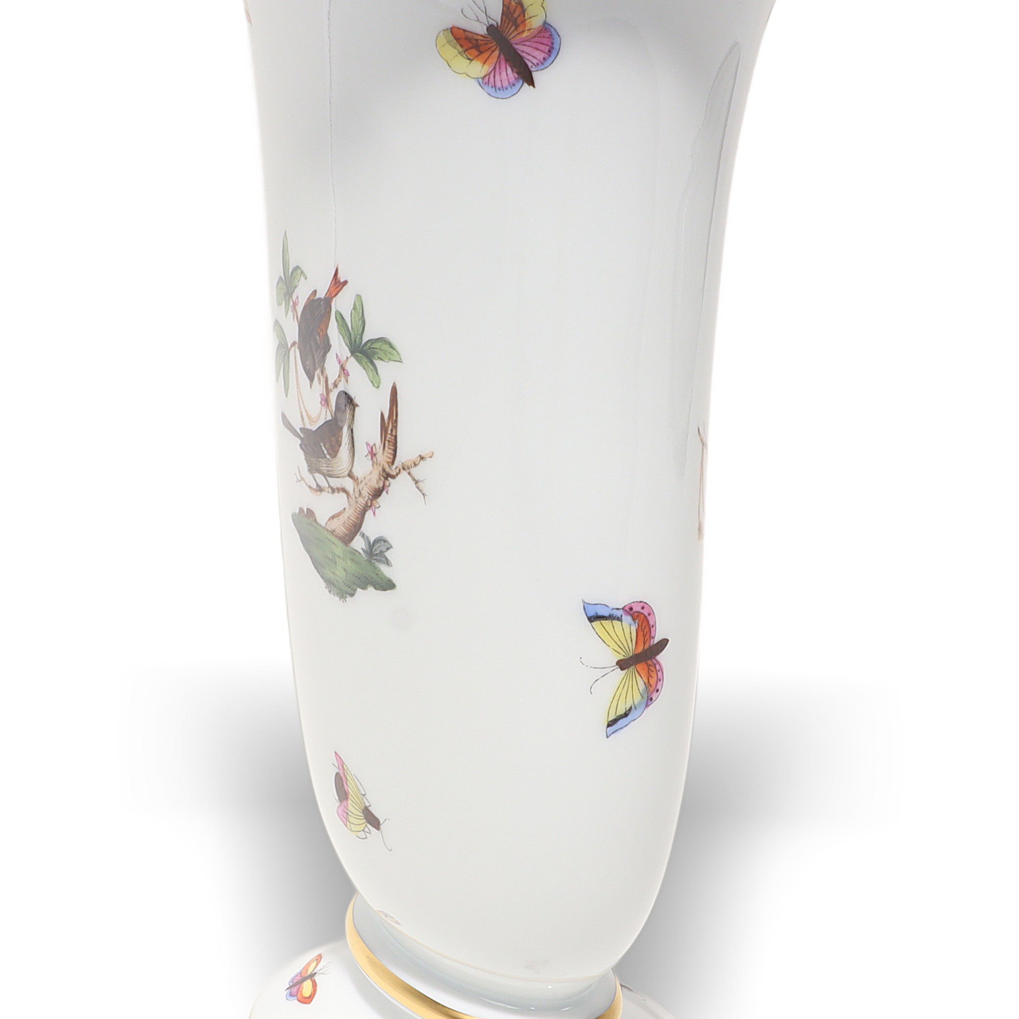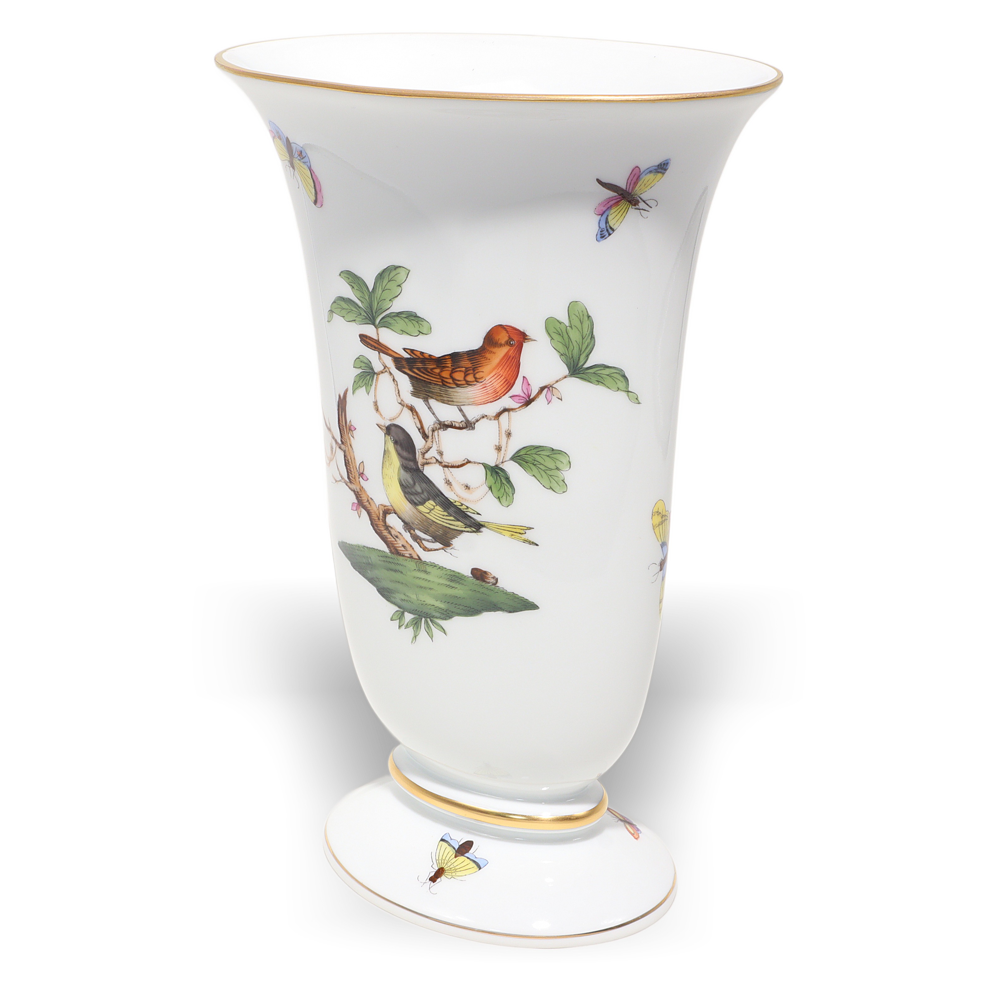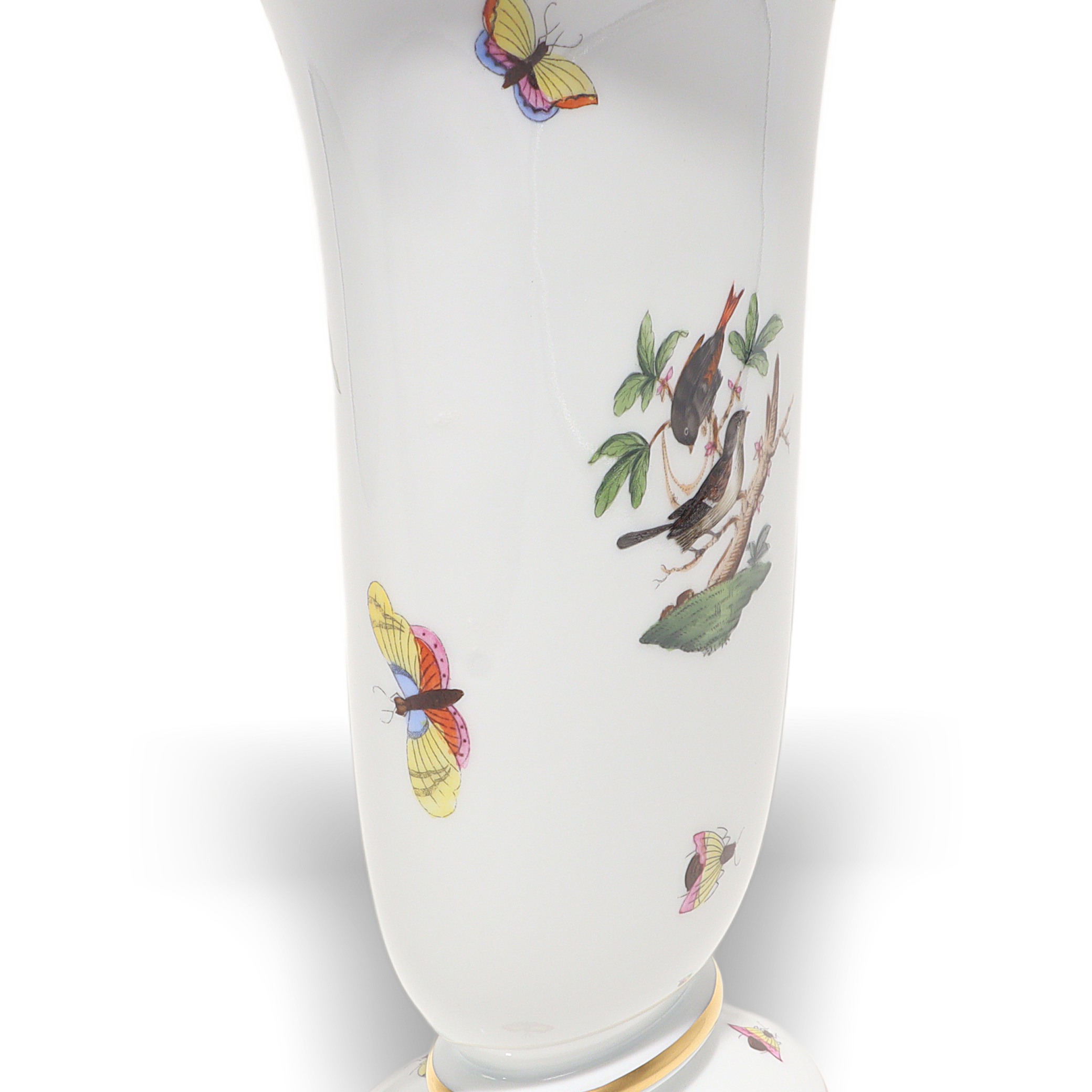 Herend, founded in 1826 in Hungary, is famous for fully hand-painted hard‑paste porcelain. The Rothschild Birds pattern, introduced around 1860 for the Viennese Rothschild family, tells the legend of a misplaced necklace discovered in a tree by birds—hence the perching birds and playful butterflies. Pattern code is RO, and no two scenes are exactly the same because each piece is painted by an individual artist, then accented with real gold and fired multiple times. Vases from the 1960s–70s era are sought after, especially in clean condition with strong color and gilding, and they’re less common than plates or cups.