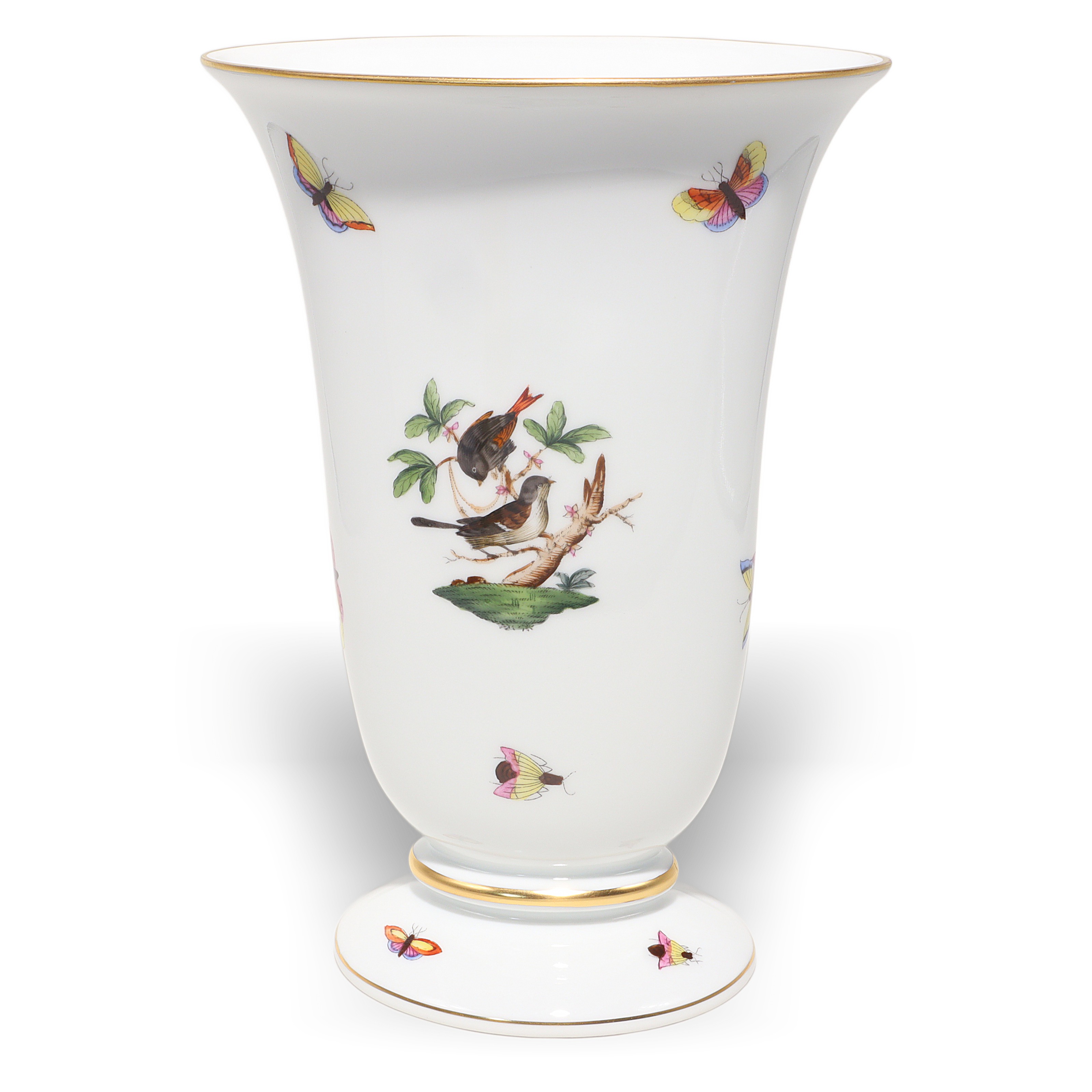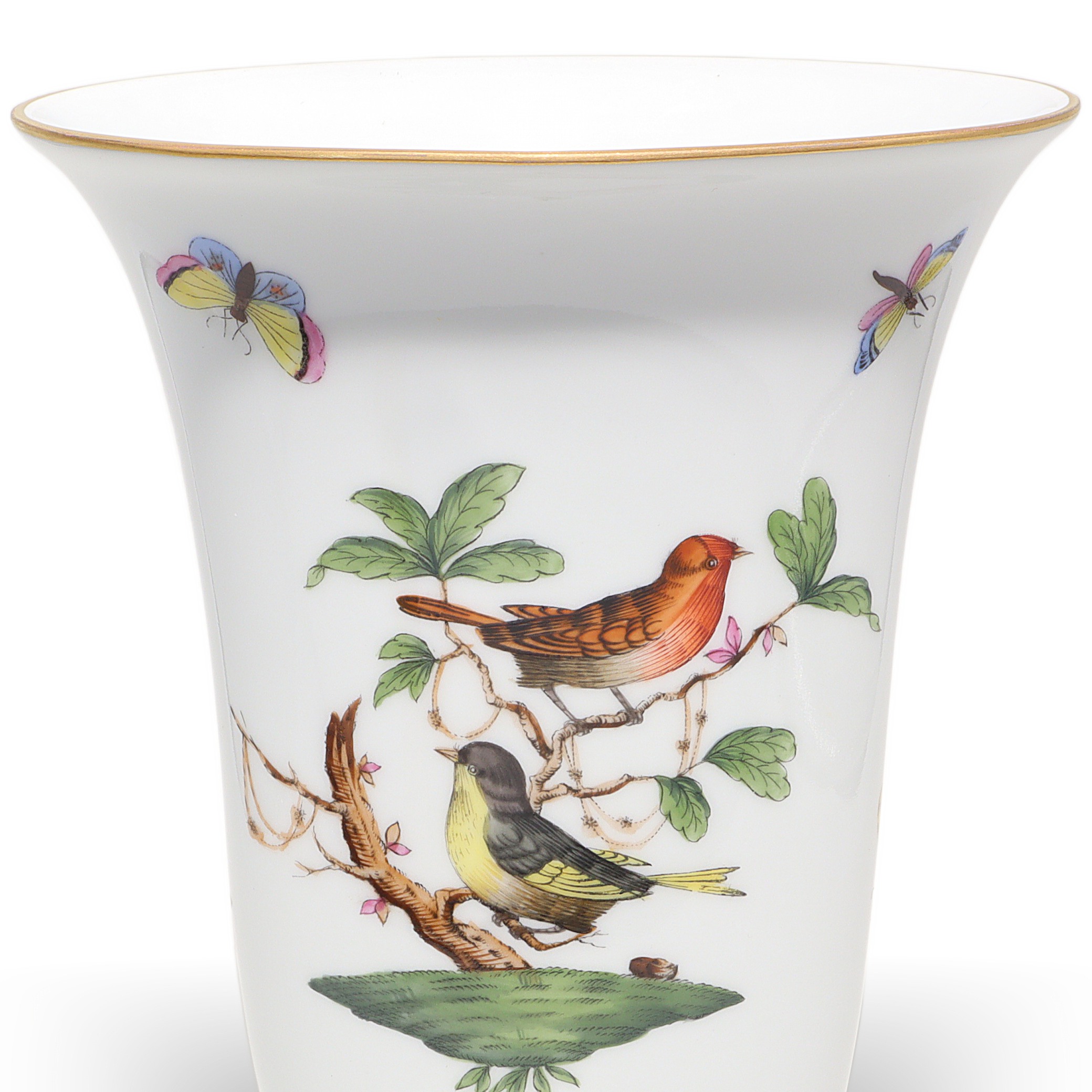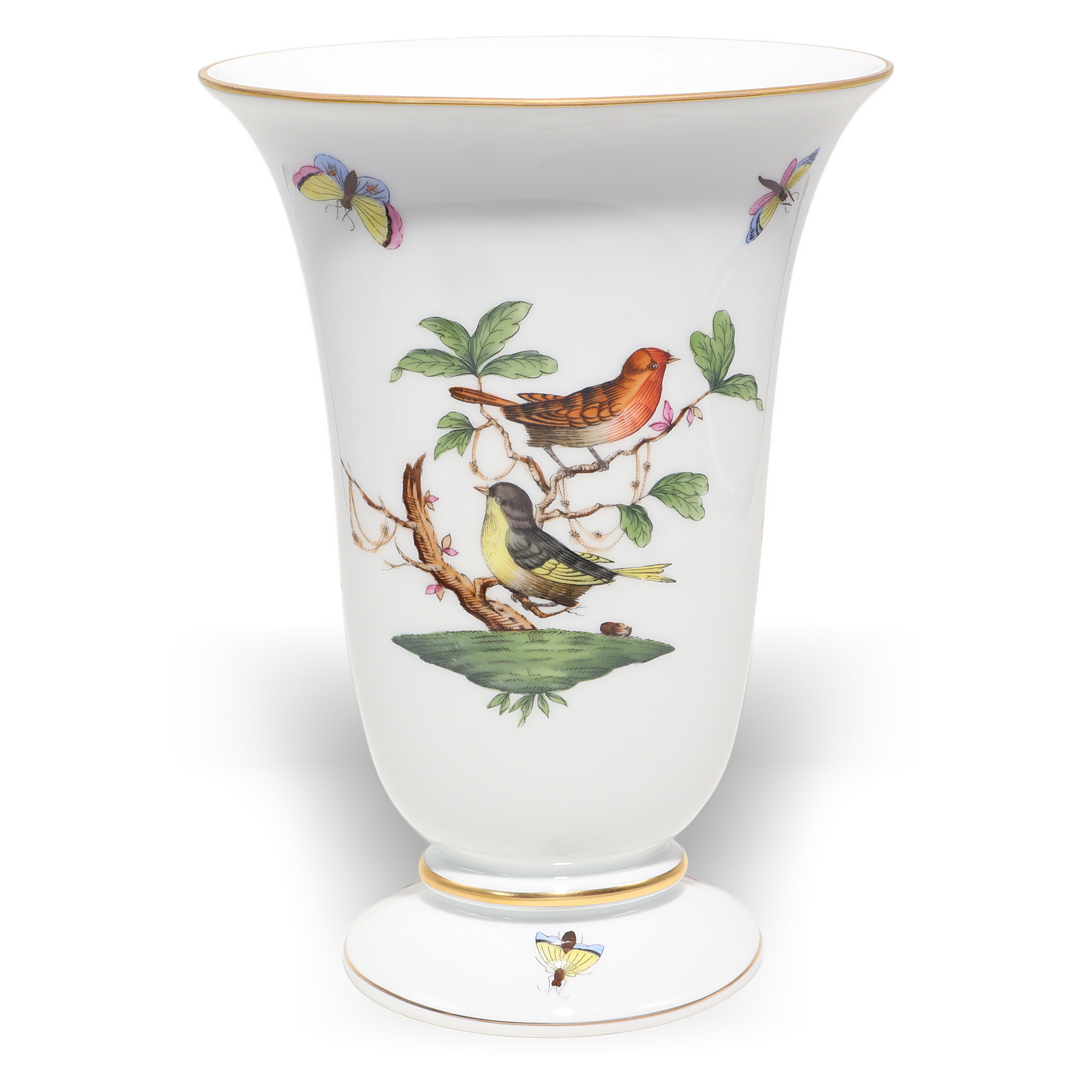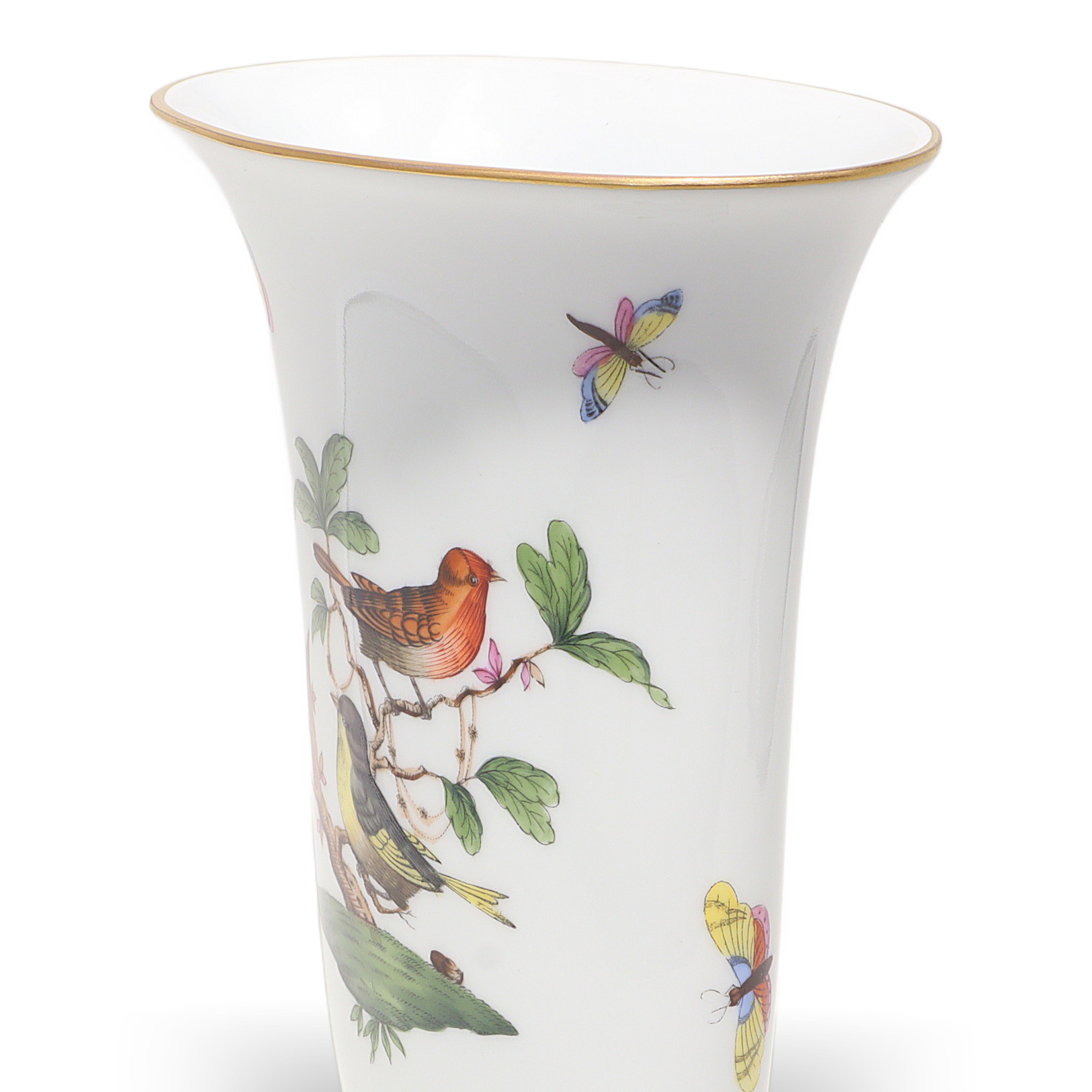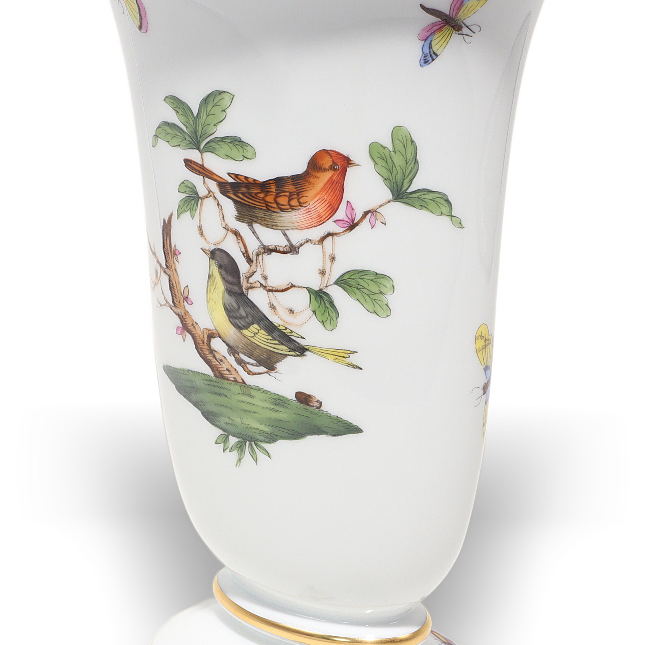 Herend, founded in 1826 in Hungary, is famous for fully hand-painted hard‑paste porcelain. The Rothschild Birds pattern, introduced around 1860 for the Viennese Rothschild family, tells the legend of a misplaced necklace discovered in a tree by birds—hence the perching birds and playful butterflies. Pattern code is RO, and no two scenes are exactly the same because each piece is painted by an individual artist, then accented with real gold and fired multiple times. Vases from the 1960s–70s era are sought after, especially in clean condition with strong color and gilding, and they’re less common than plates or cups.