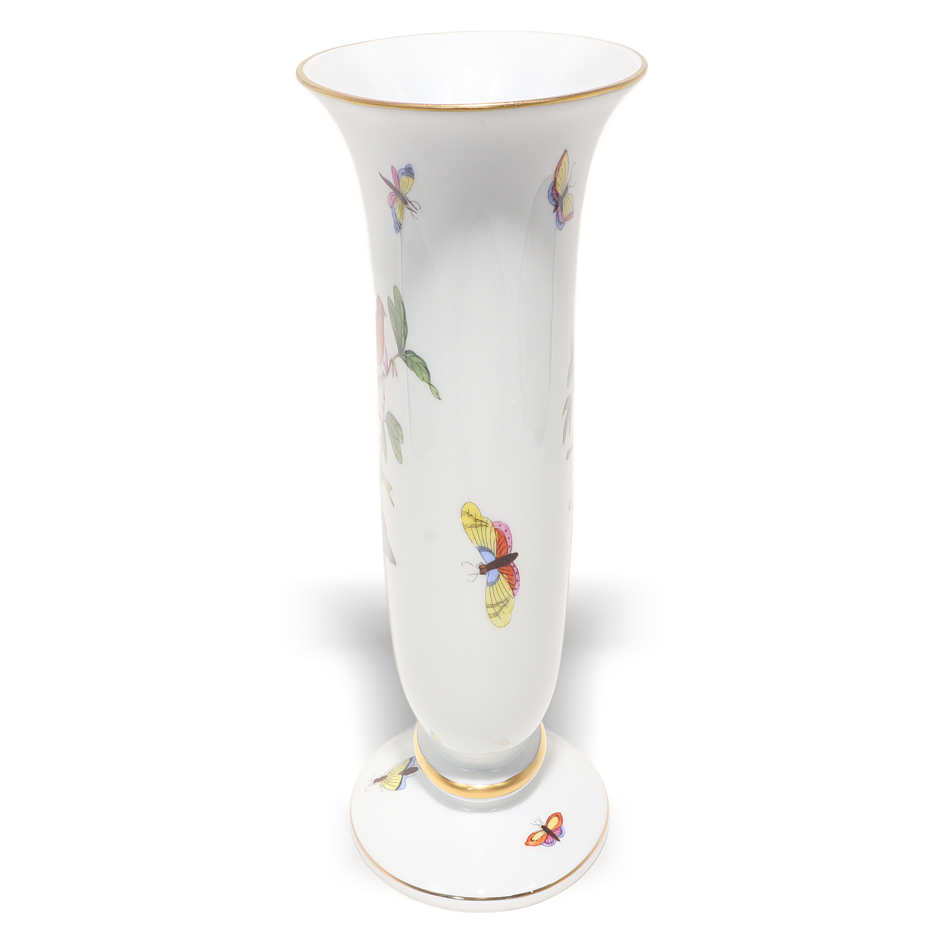 This is a Herend Rothschild Birds porcelain vase from around 1970, a graceful trumpet form on a pedestal foot with a fine hand-painted scene of two songbirds on a branch and fluttering butterflies. The white ground is bright and clean, finished with delicate 24k-style gilt trim at the rim and base. It stands 8 inches tall (20 cm), about 5.5 inches wide (13.75 cm), and 3.5 inches deep (8.75 cm). Condition is near mint, with crisp colors and intact gilding, the kind of piece that looks just as happy on a mantel as it does holding a small bouquet. At roughly 56 years old, it’s firmly vintage, and this size and shape aren’t as common as the dinnerware, making it a nice find for collectors.