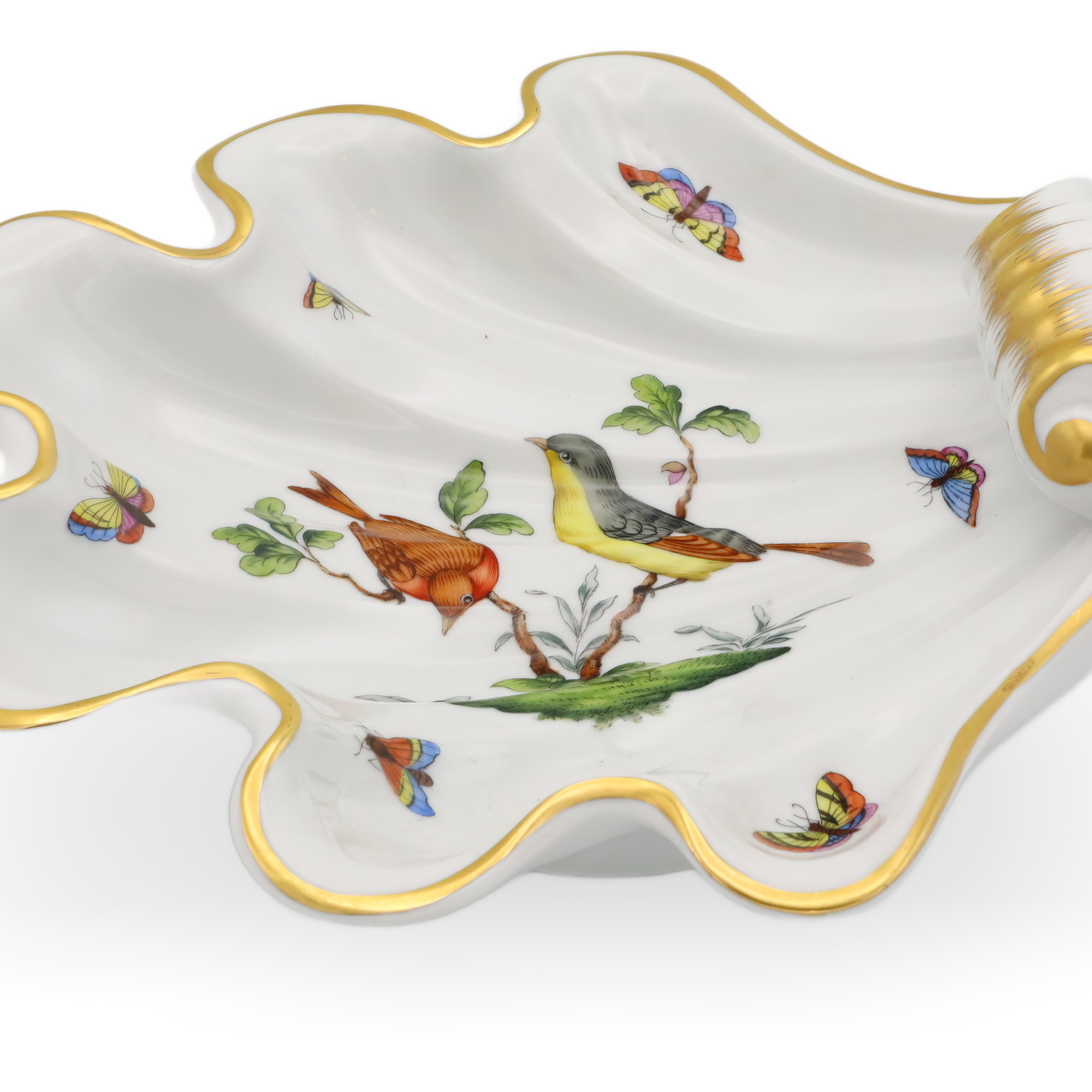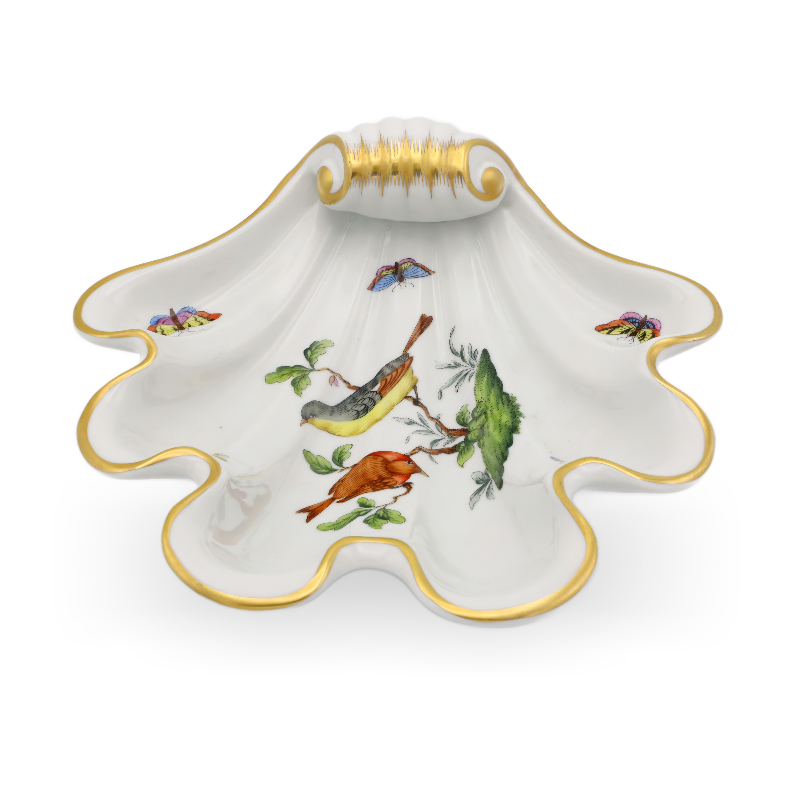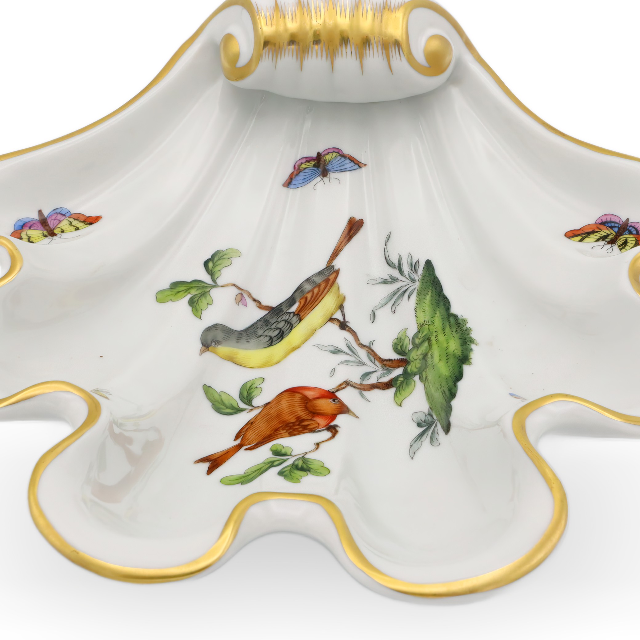 This beautiful piece is a Herend Rothschild Shell Tray dating from around 1980, making it over 40 years old and giving it true vintage status. Its scalloped, shell-like shape is not only elegant but also practical, perfect for holding candies, jewelry, or even just as a centerpiece to admire. The hand-painted porcelain features a scene with two birds perched on a branch, surrounded by delicate butterflies and greenery, all brought to life with vibrant colors and intricate detail. Accented with a soft gold trim, this tray really highlights the refined touch that Herend is famous for. Measuring roughly 4 inches high and 9 inches across, it stands out without overwhelming your table or display. The condition is near mint, so for a piece of this age, it’s a rare find—especially in the sought-after Rothschild 7446 pattern.