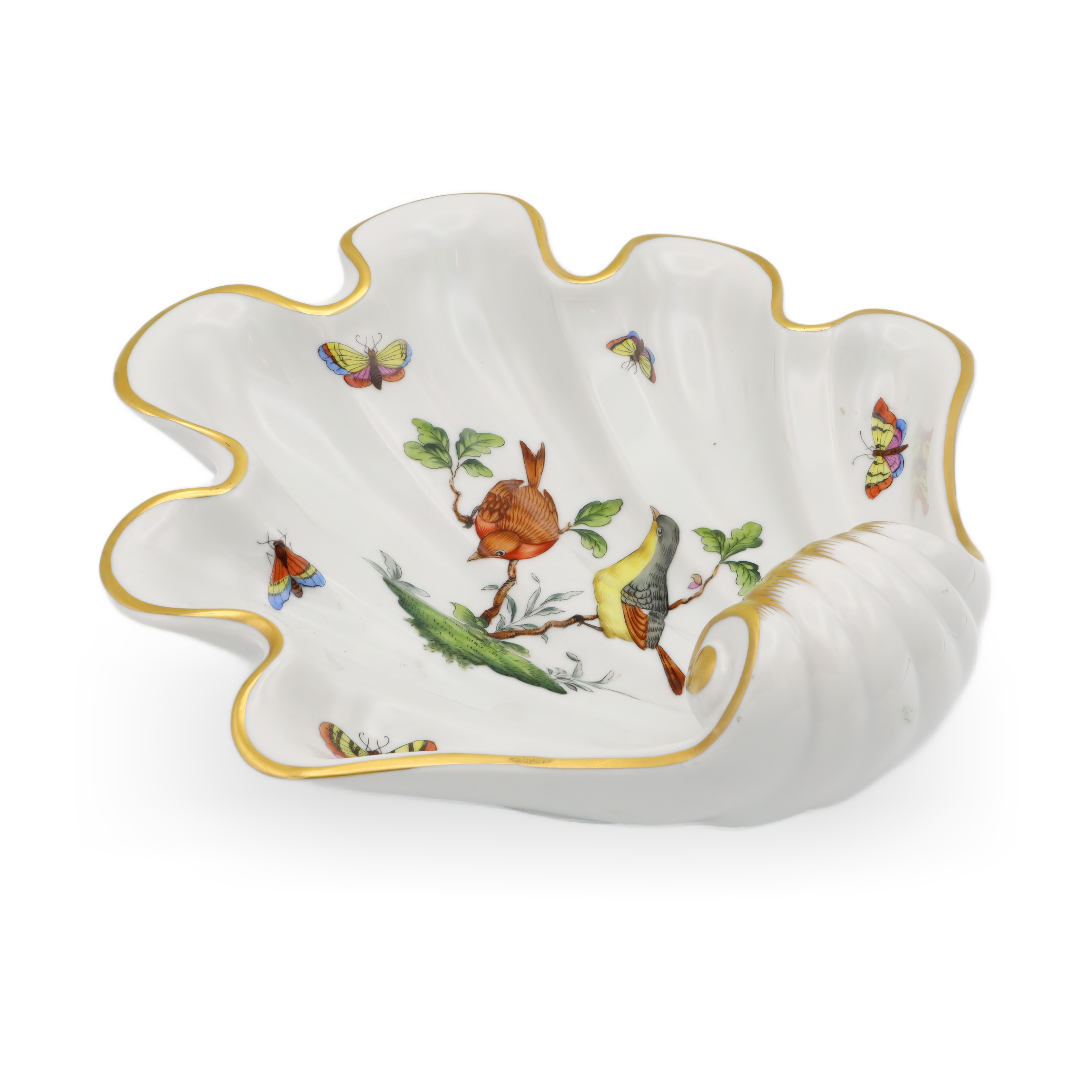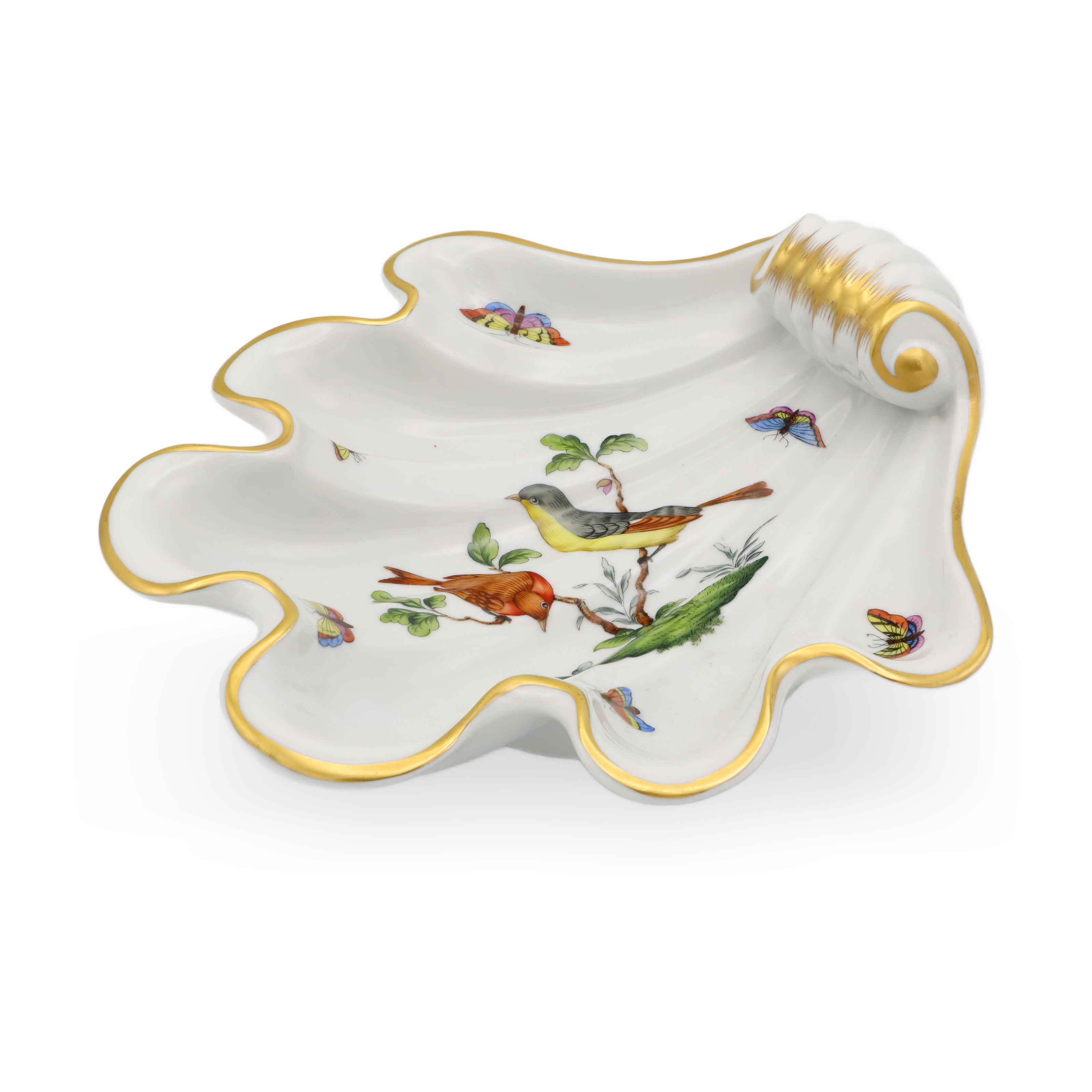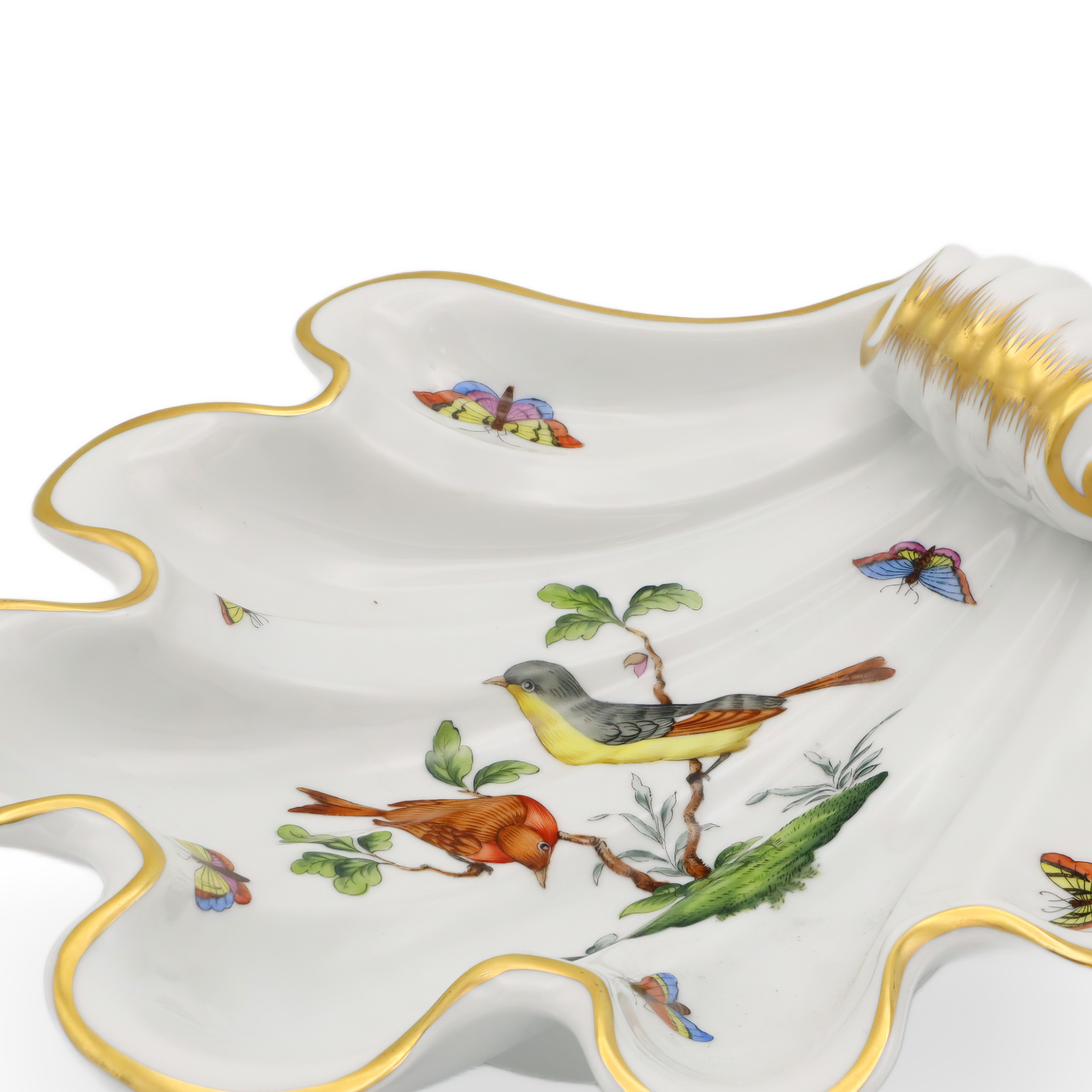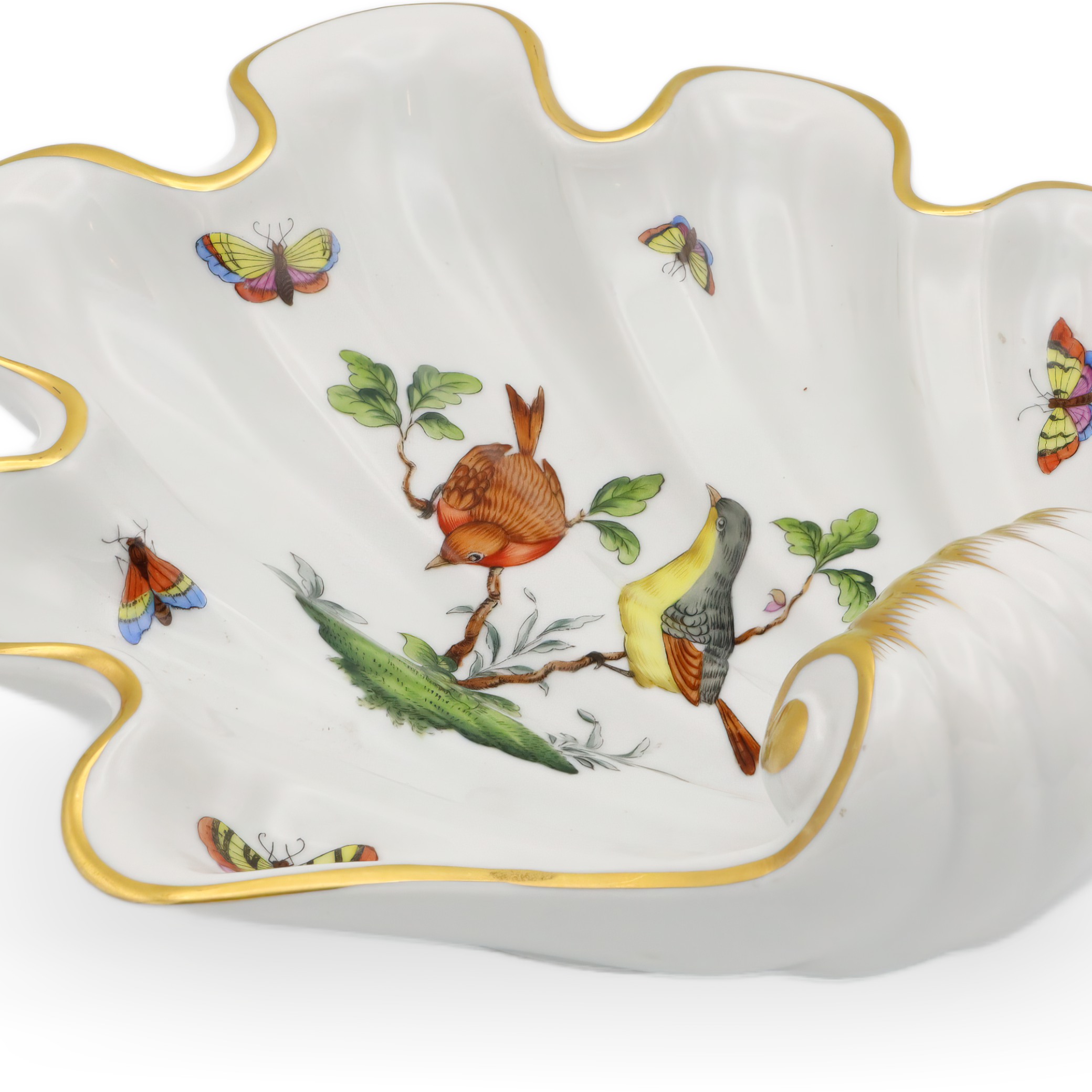 This beautiful piece is a Herend Rothschild Shell Tray dating from around 1980, making it over 40 years old and giving it true vintage status. Its scalloped, shell-like shape is not only elegant but also practical, perfect for holding candies, jewelry, or even just as a centerpiece to admire. The hand-painted porcelain features a scene with two birds perched on a branch, surrounded by delicate butterflies and greenery, all brought to life with vibrant colors and intricate detail. Accented with a soft gold trim, this tray really highlights the refined touch that Herend is famous for. Measuring roughly 4 inches high and 9 inches across, it stands out without overwhelming your table or display. The condition is near mint, so for a piece of this age, it’s a rare find—especially in the sought-after Rothschild 7446 pattern.