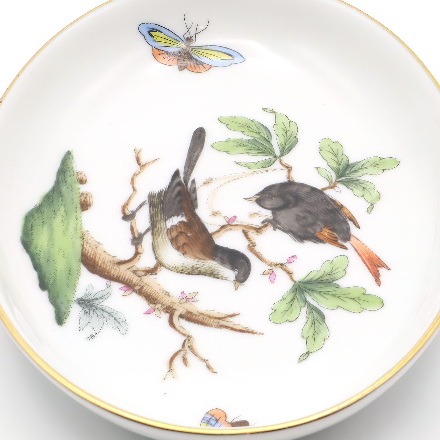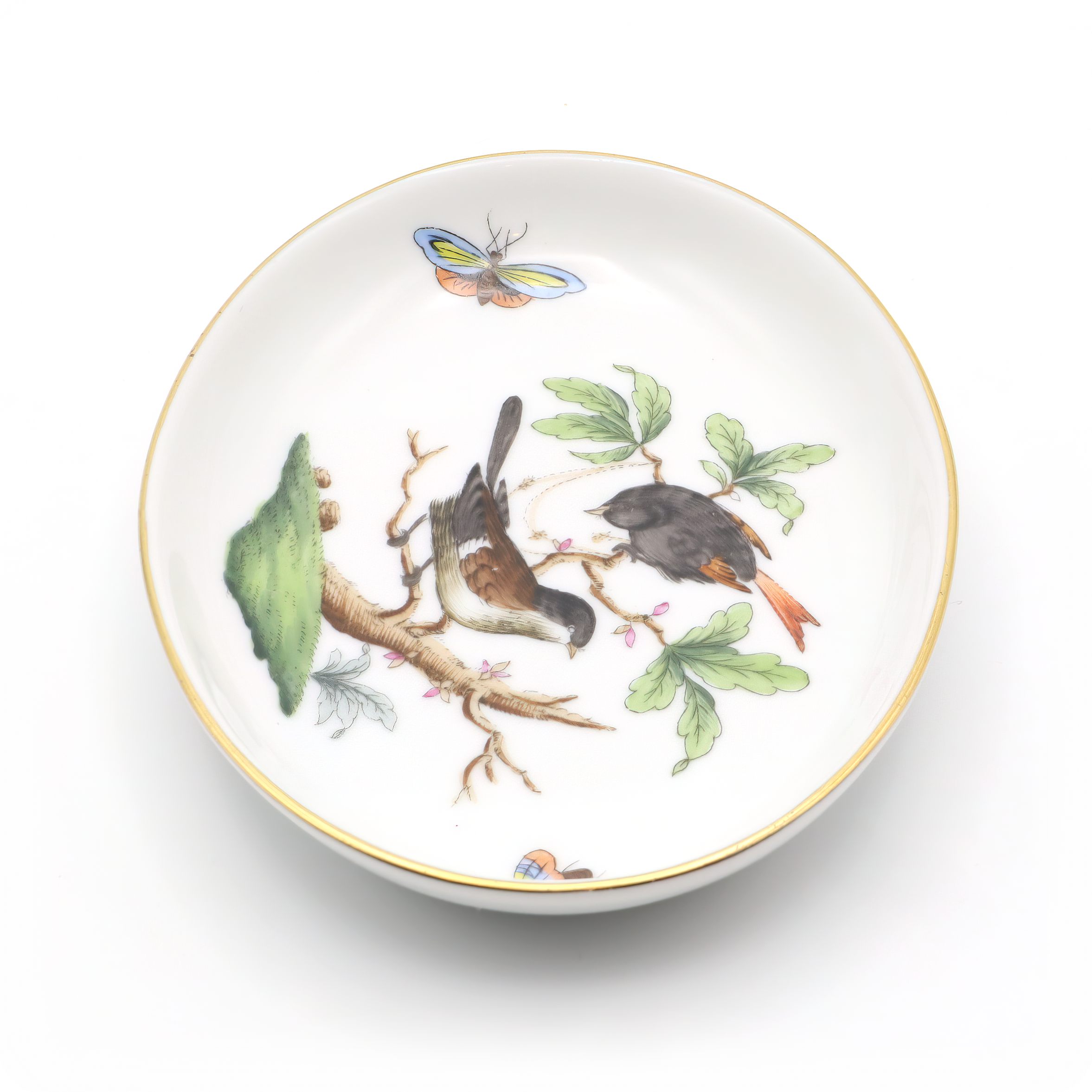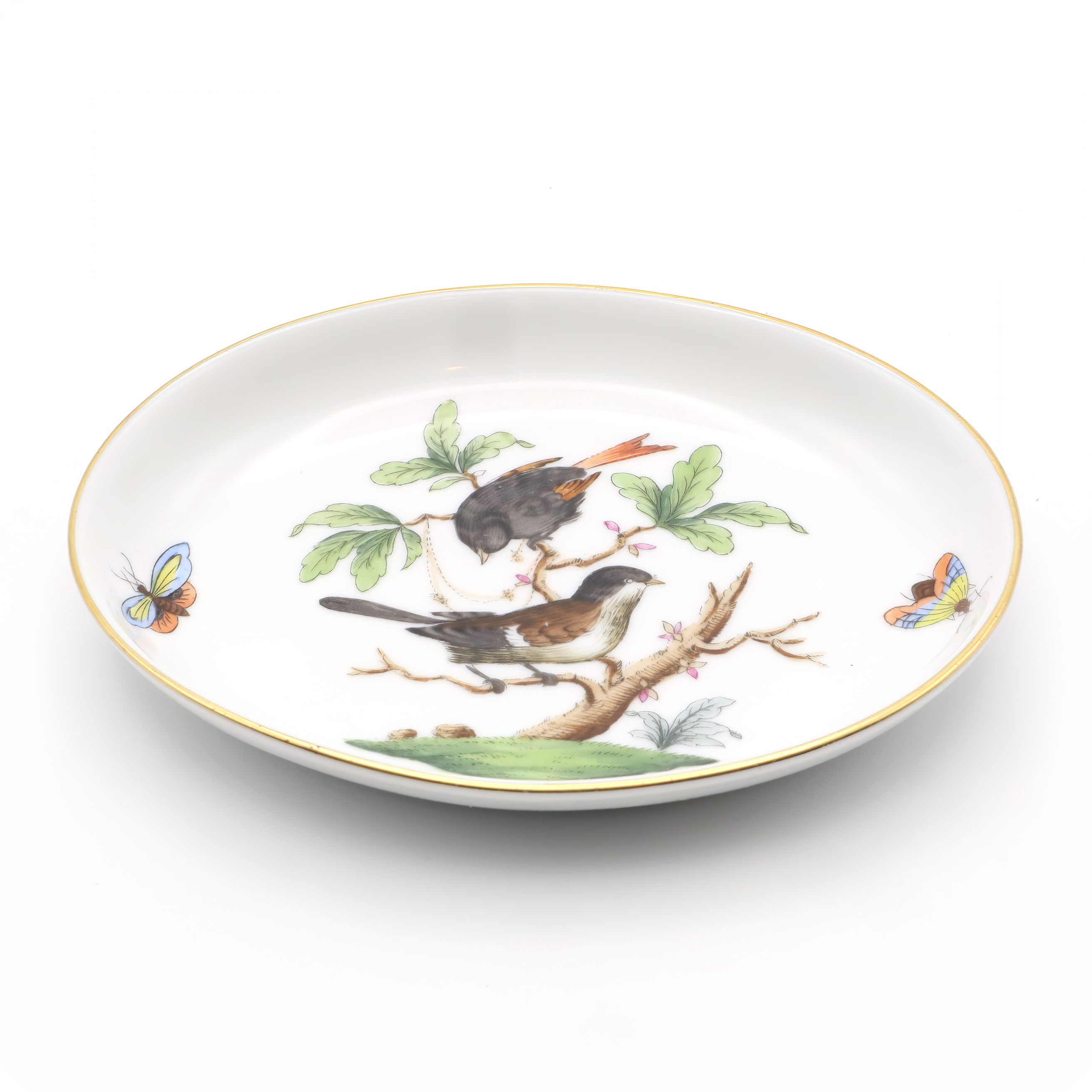 This charming little dish is a vintage Herend Rothschild trinket tray made from fine porcelain and boasting a delightful bird motif. Crafted around 1970, it sits at just one inch high, about three and a half inches wide, and four and a half inches long—perfect for holding jewelry, coins, or odds and ends on a bedroom dresser or entryway table. The vibrant scene of two birds perched among leafy branches and fluttering butterflies is hand-painted, reflecting the high-quality artistry Herend is famous for. Its edges are gently rimmed with a quiet touch of gold, lending it an understated elegance without feeling overly fancy. Still in near mint condition after more than fifty years, this tray is a testament to careful craftsmanship and gentle handling over the decades. It feels rare and special—not just because of its age, but because it has survived this long looking nearly as fresh as the day it was made.
