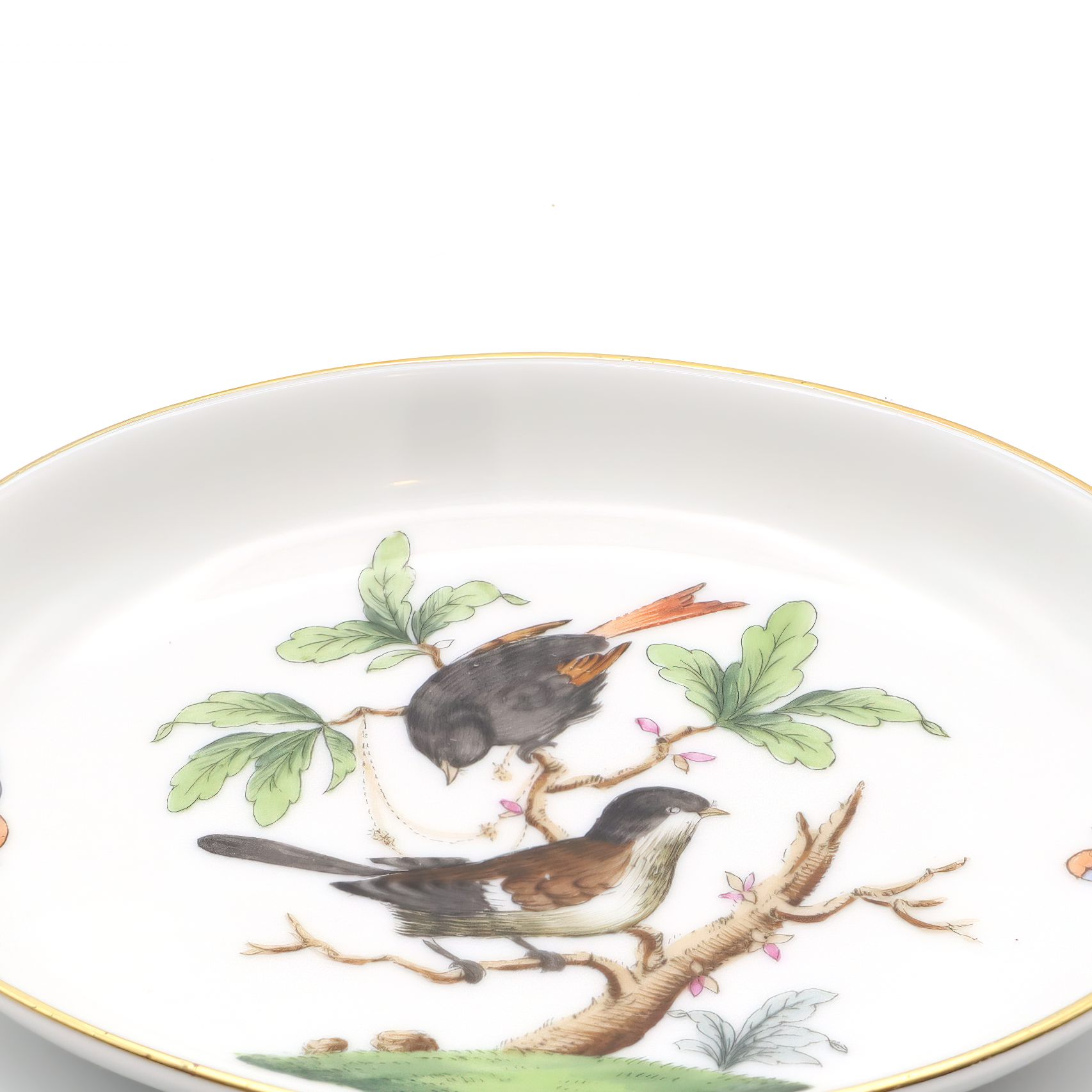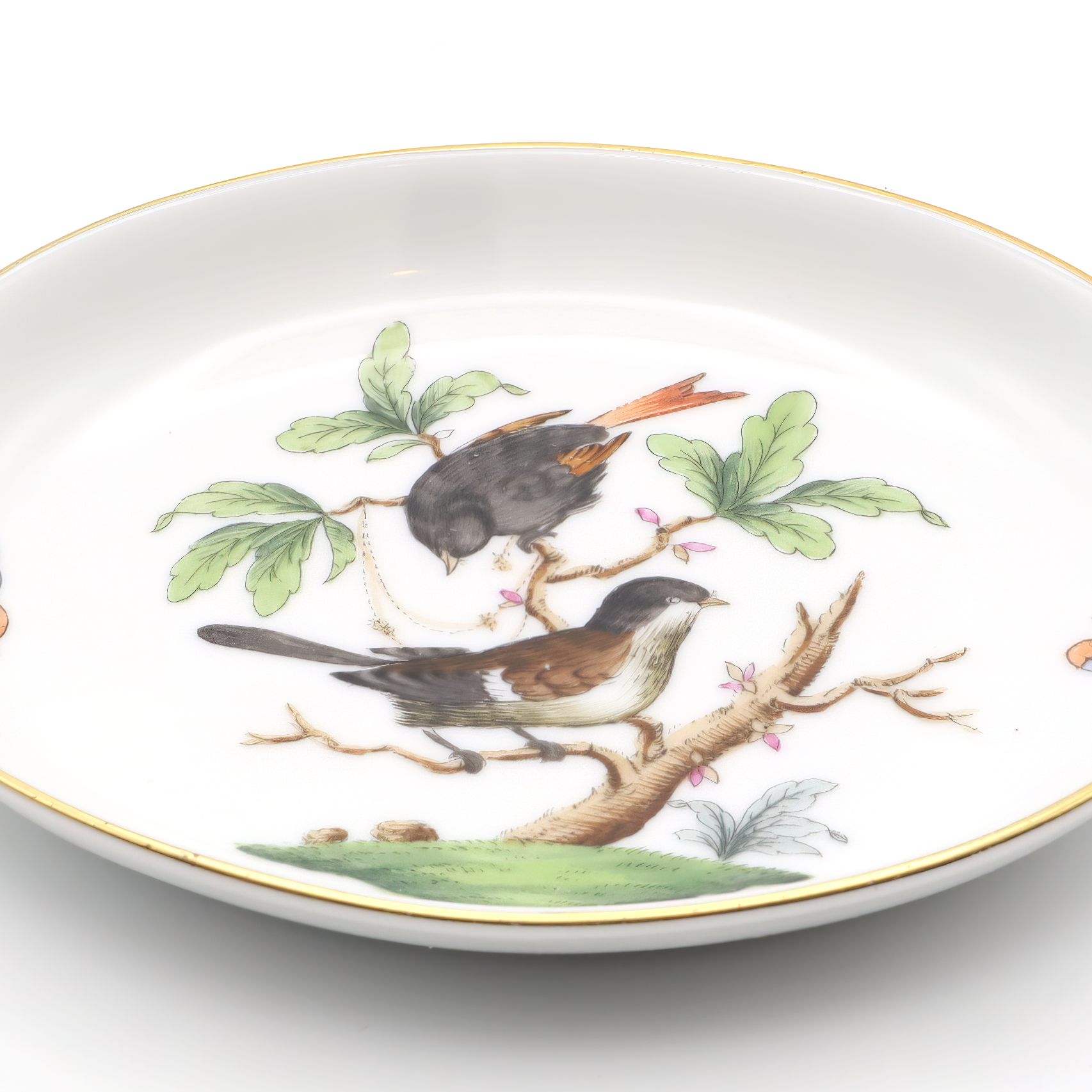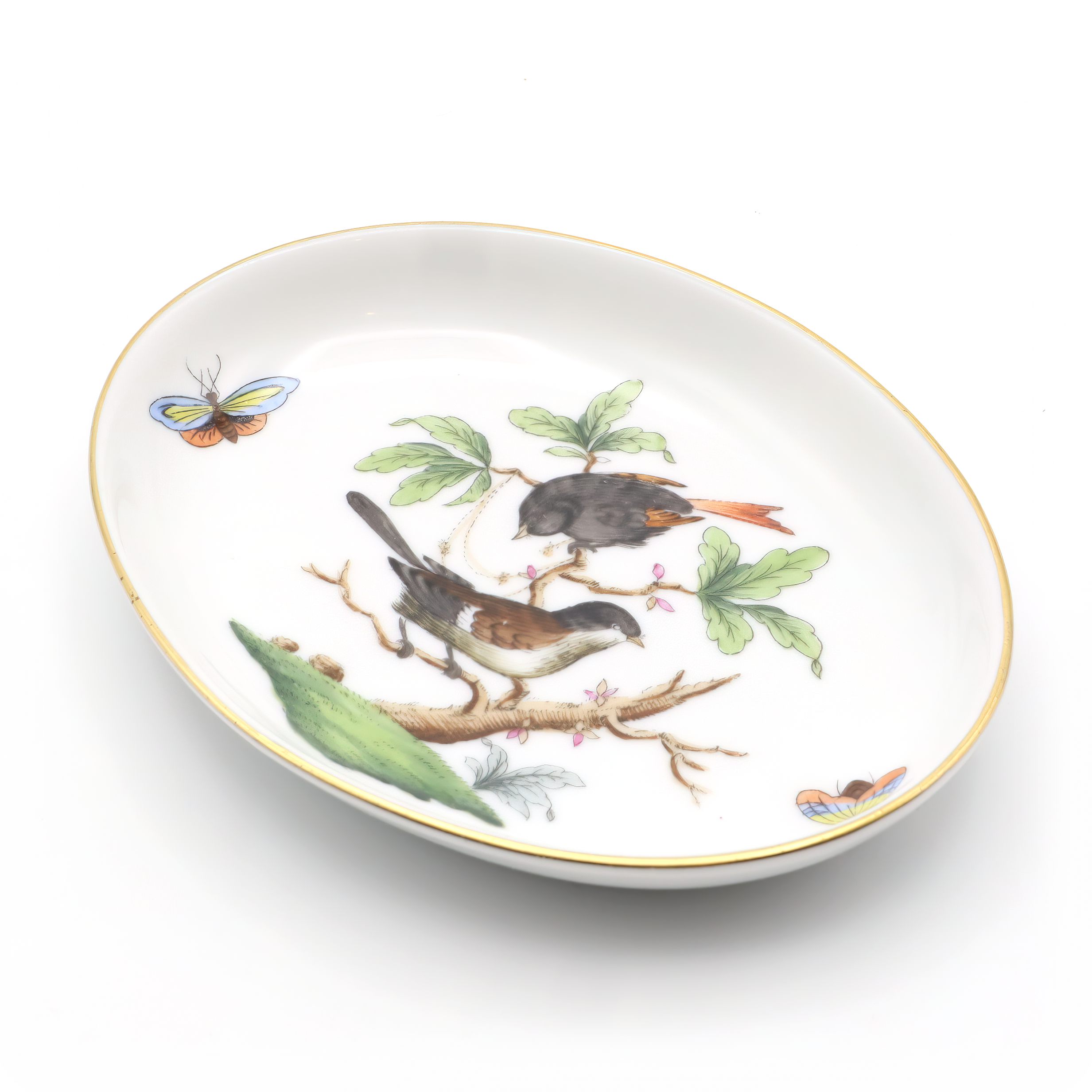 This charming little dish is a vintage Herend Rothschild trinket tray made from fine porcelain and boasting a delightful bird motif. Crafted around 1970, it sits at just one inch high, about three and a half inches wide, and four and a half inches long—perfect for holding jewelry, coins, or odds and ends on a bedroom dresser or entryway table. The vibrant scene of two birds perched among leafy branches and fluttering butterflies is hand-painted, reflecting the high-quality artistry Herend is famous for. Its edges are gently rimmed with a quiet touch of gold, lending it an understated elegance without feeling overly fancy. Still in near mint condition after more than fifty years, this tray is a testament to careful craftsmanship and gentle handling over the decades. It feels rare and special—not just because of its age, but because it has survived this long looking nearly as fresh as the day it was made.