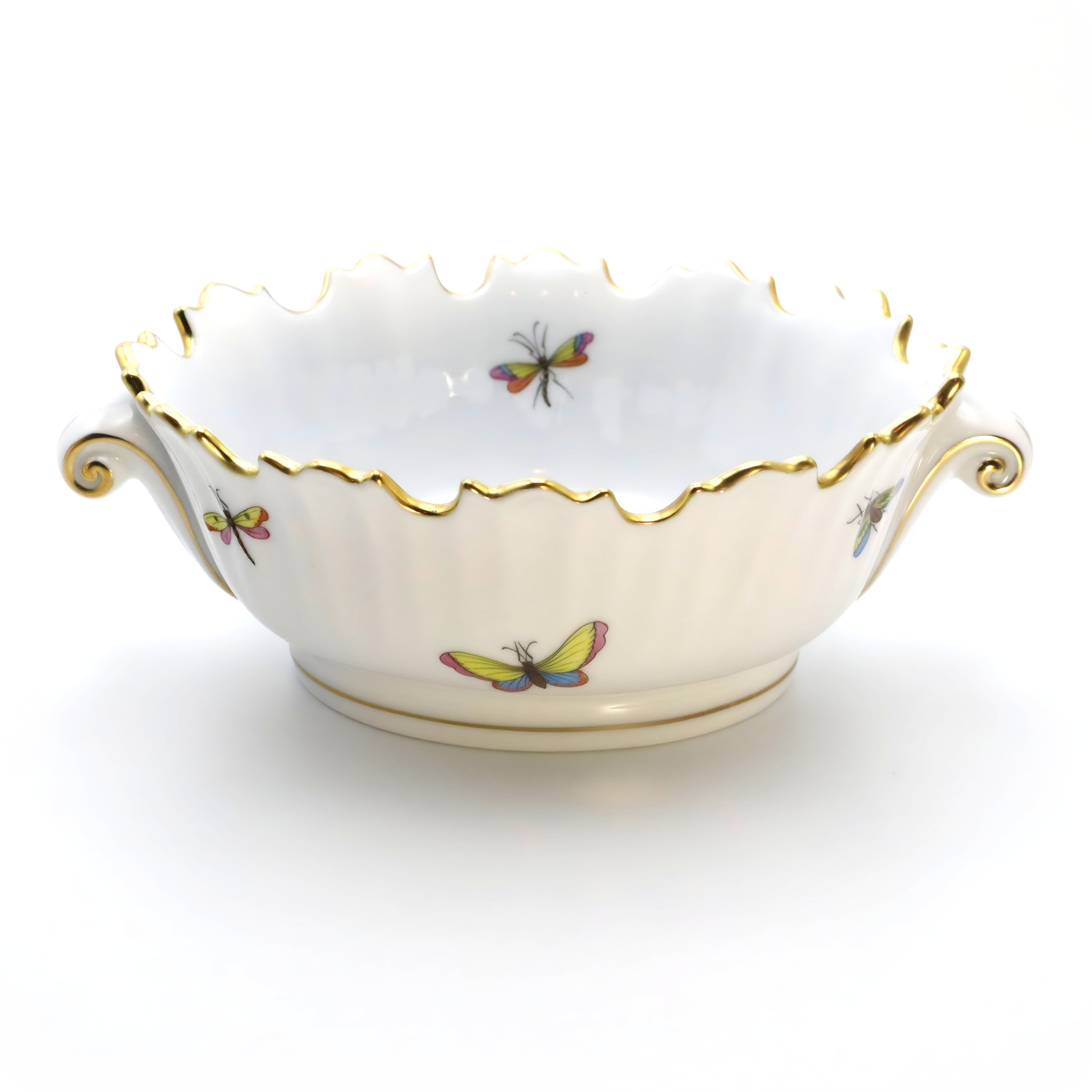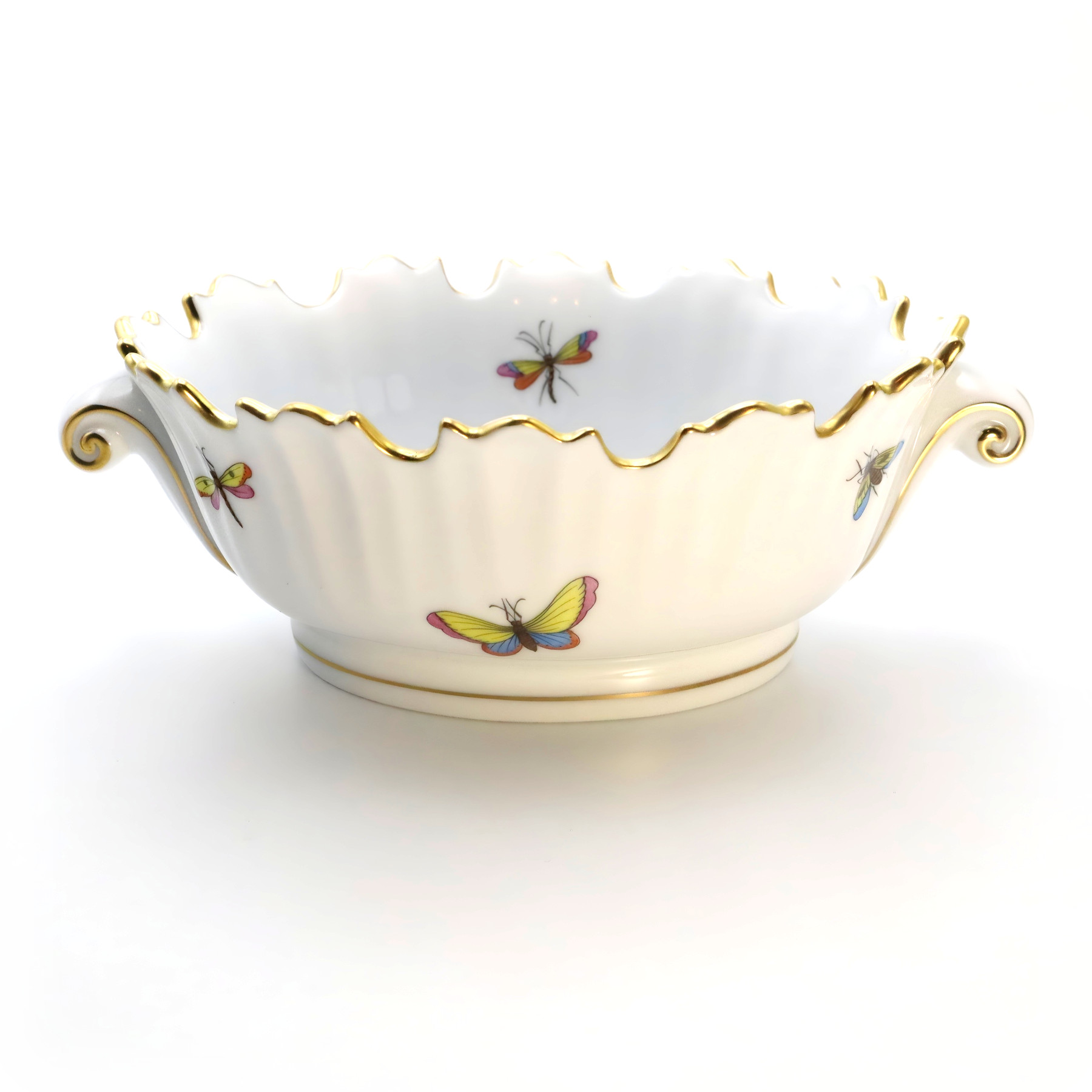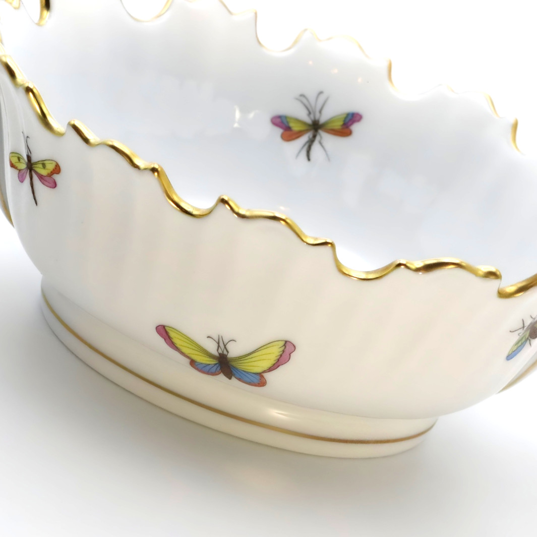 The Herend Rothschild Cachepot features a delicate, scalloped rim adorned with gold-gilding that exudes a luxurious touch, harmonizing with the intricately painted scenes of butterflies and insects, emblematic of the Rothschild pattern. Each detail is meticulously executed by master painters, ensuring a unique and timeless piece of art. The handles on either side are gracefully curvilinear, adding to the overall allure and usability of the planter.