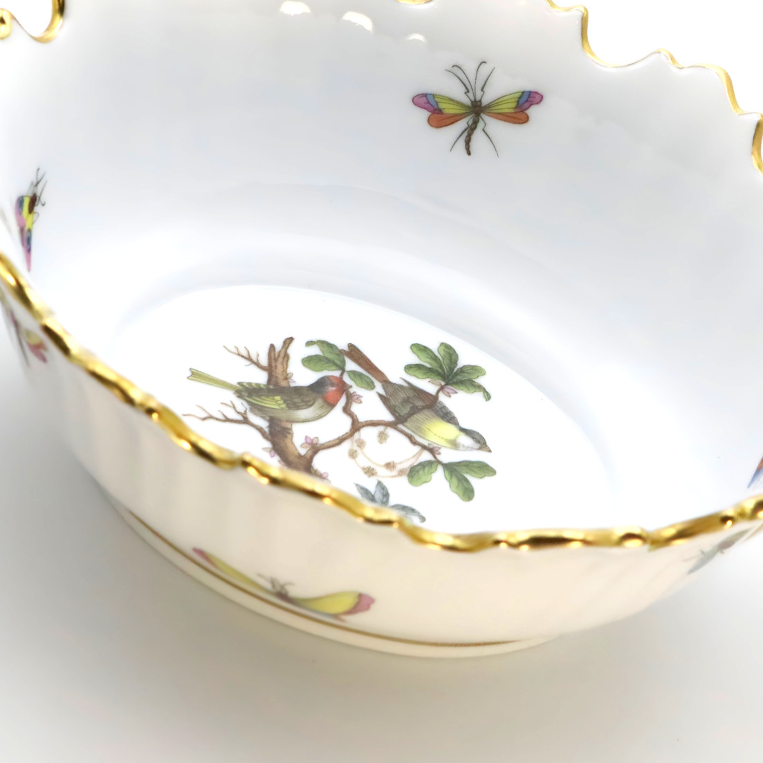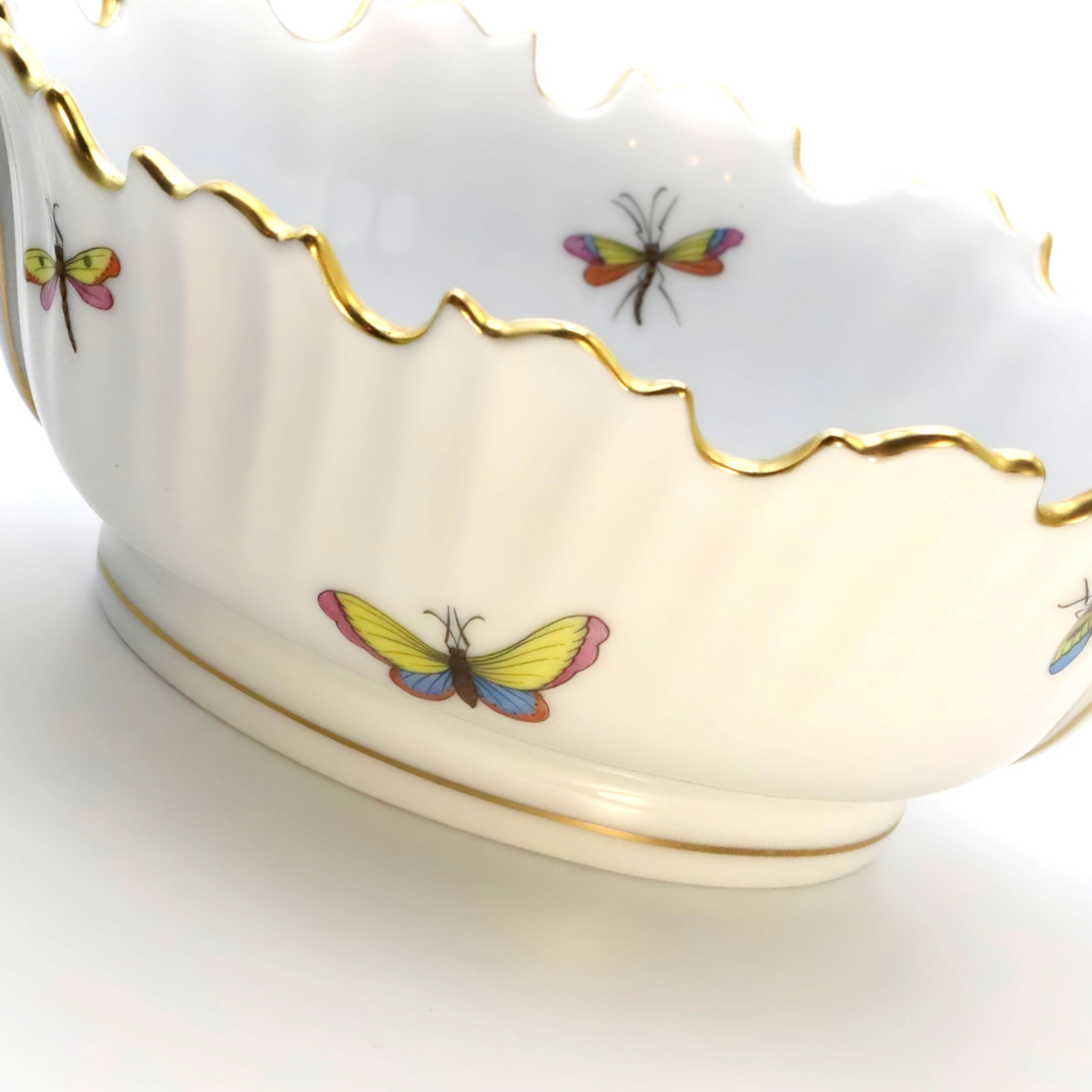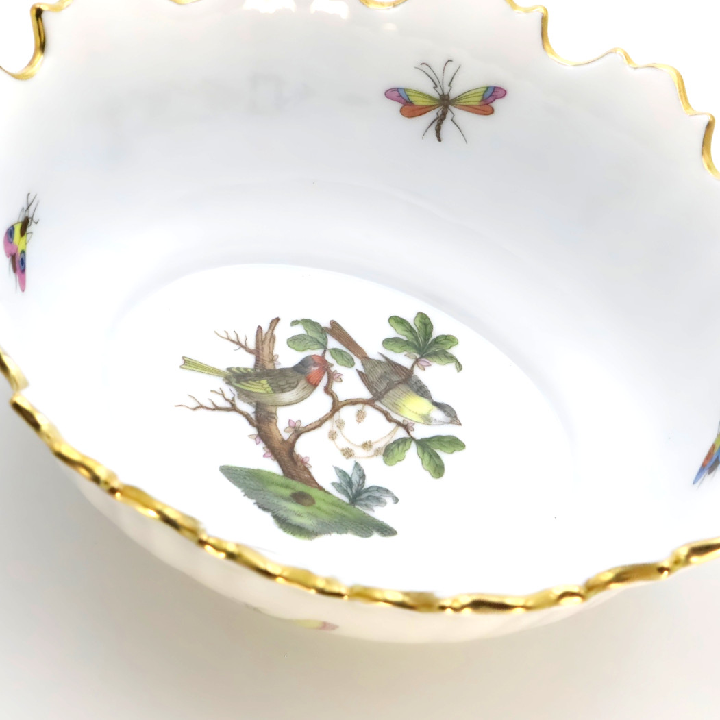 Herend Porcelain Manufactory, founded in 1826 in Herend, Hungary, is renowned for producing some of the world’s finest hand-painted porcelain. Internationally recognized for its superior craftsmanship and intricate designs, Herend has long been synonymous with sophistication and luxury. The Rothschild pattern, introduced in 1860, is one of Herend’s most prized and celebrated designs. It is inspired by a tale from the Rothschild family, where Baroness Rothschild’s missing pearl necklace was found in the bushes by the family gardeners, perceived to have been carried there by birds.
