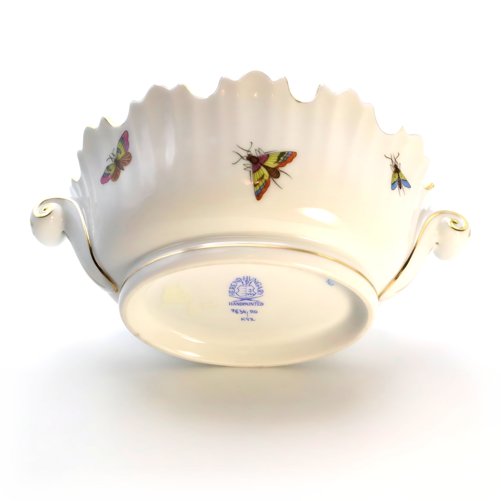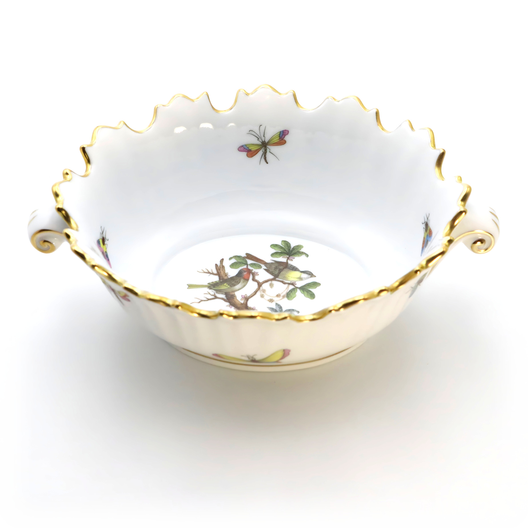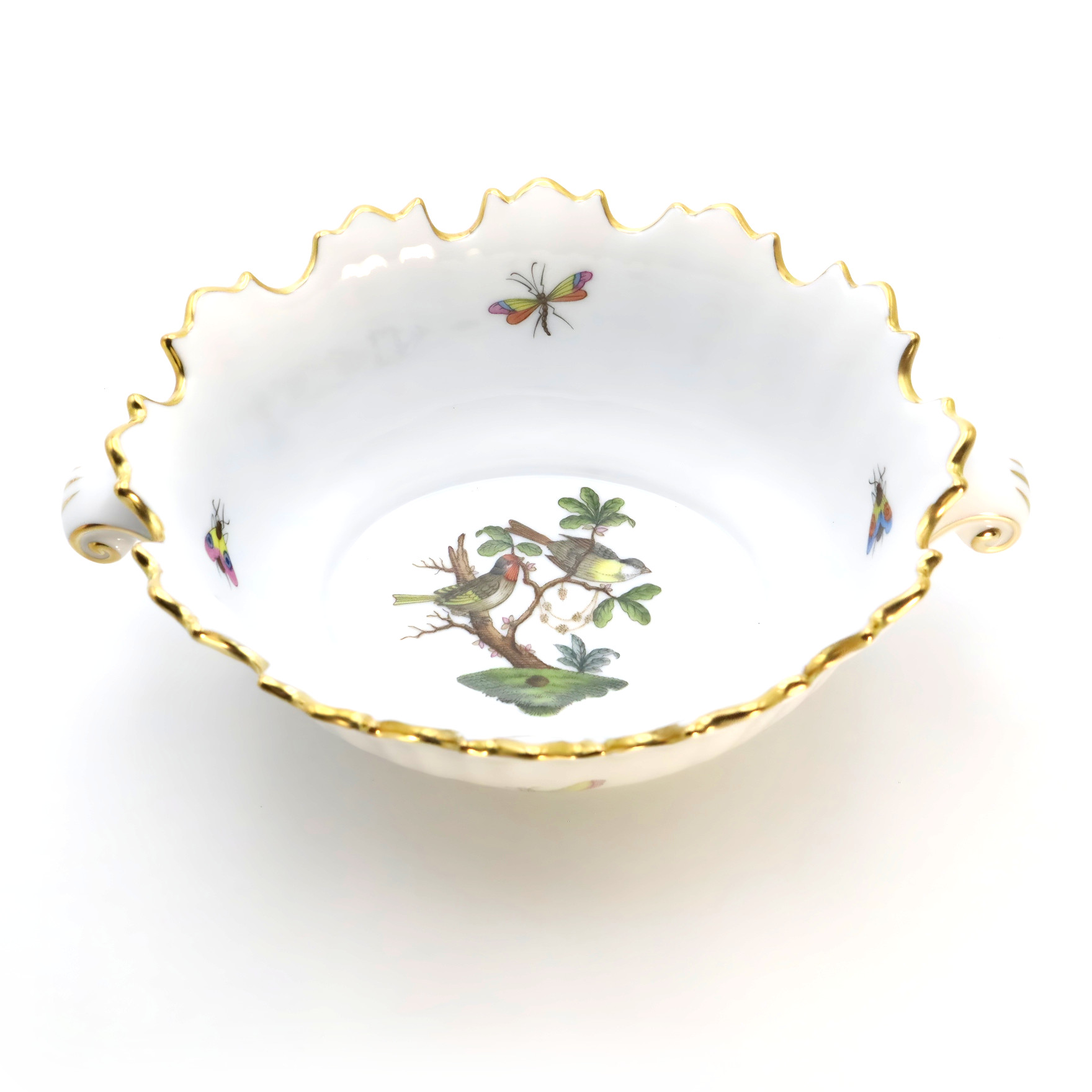 Herend Porcelain Manufactory, founded in 1826 in Herend, Hungary, is renowned for producing some of the world’s finest hand-painted porcelain. Internationally recognized for its superior craftsmanship and intricate designs, Herend has long been synonymous with sophistication and luxury. The Rothschild pattern, introduced in 1860, is one of Herend’s most prized and celebrated designs. It is inspired by a tale from the Rothschild family, where Baroness Rothschild’s missing pearl necklace was found in the bushes by the family gardeners, perceived to have been carried there by birds.