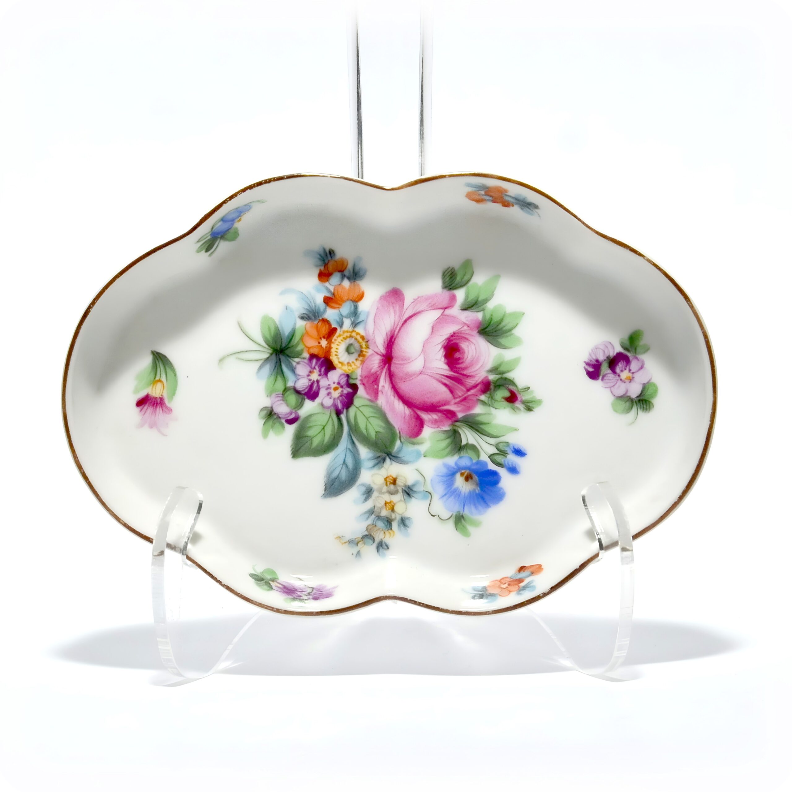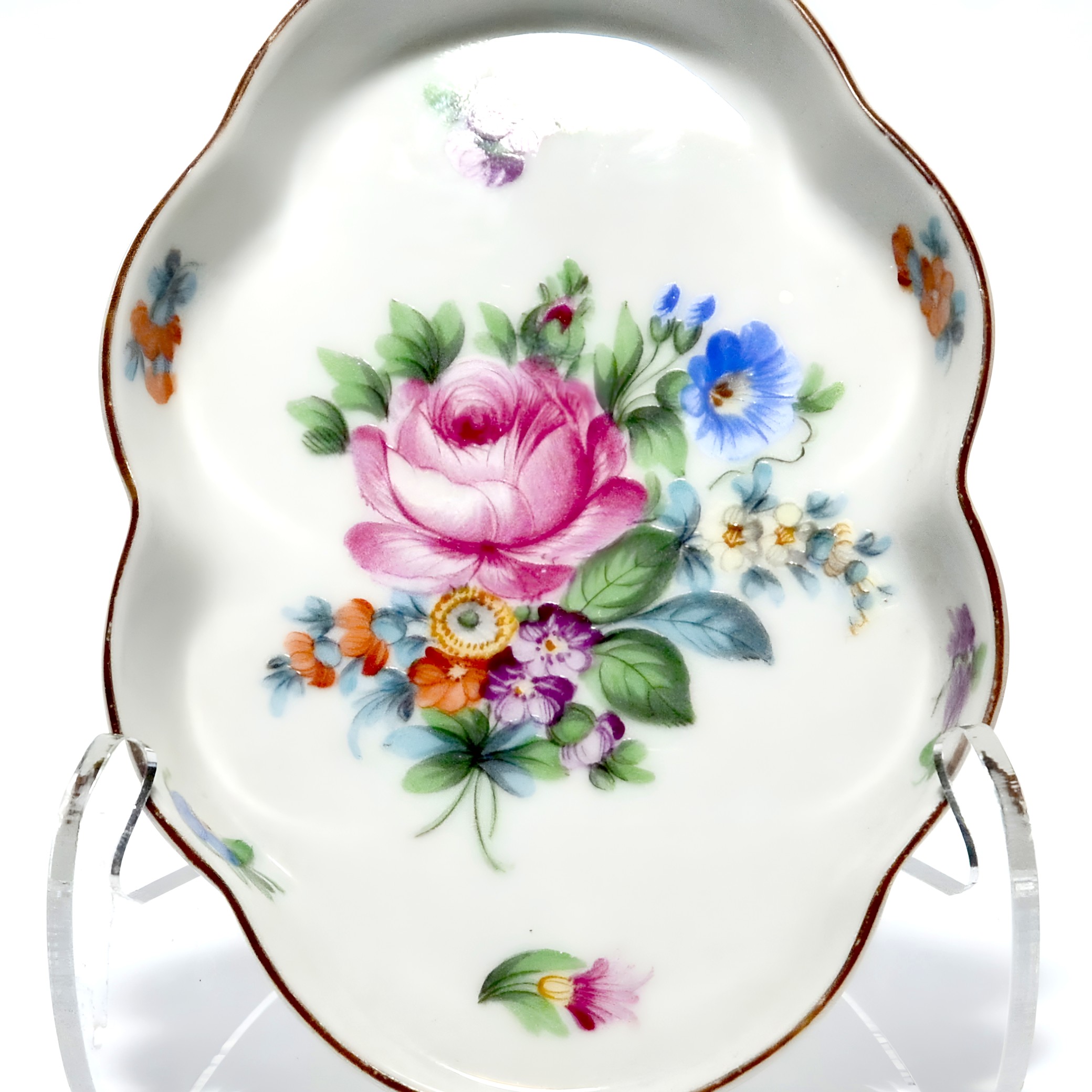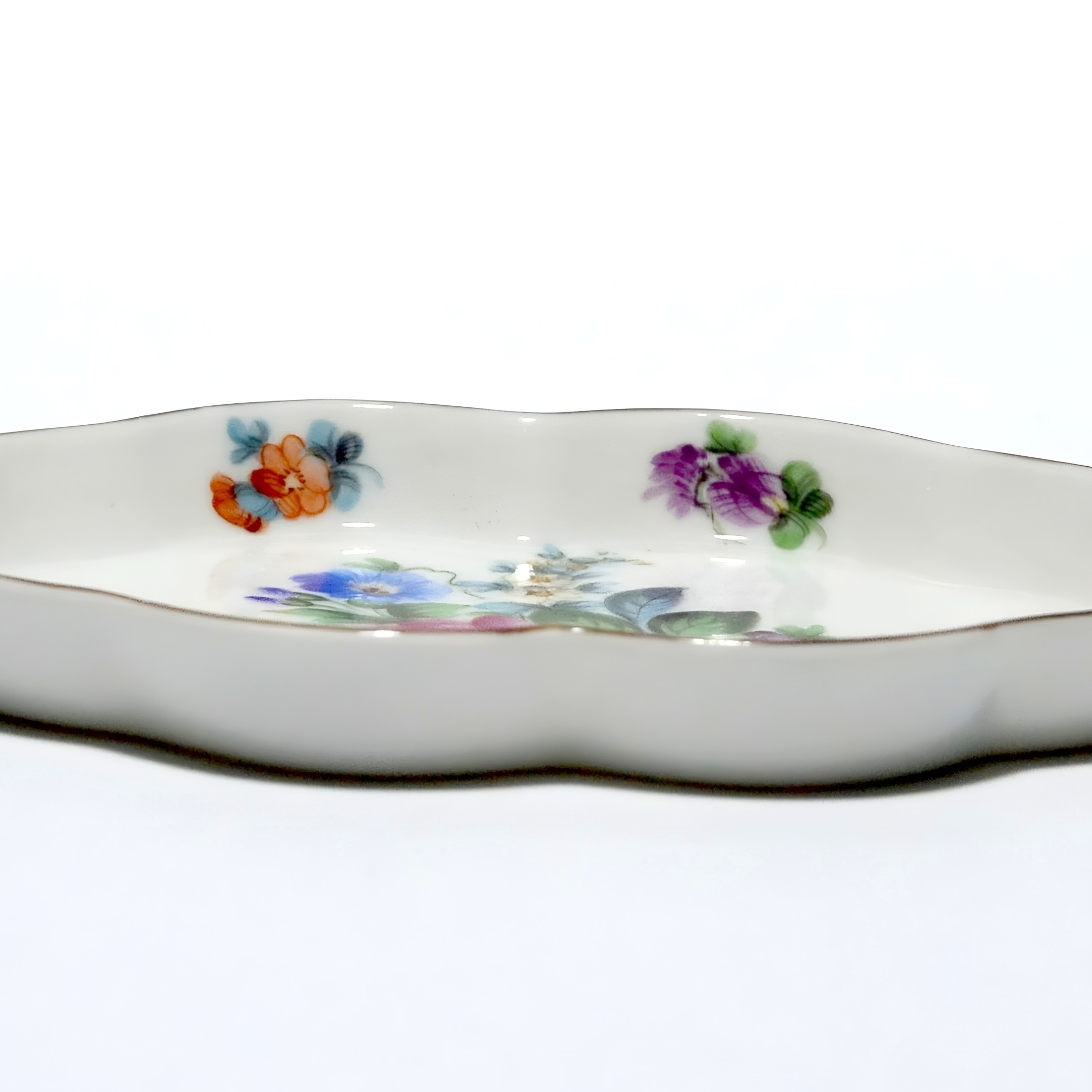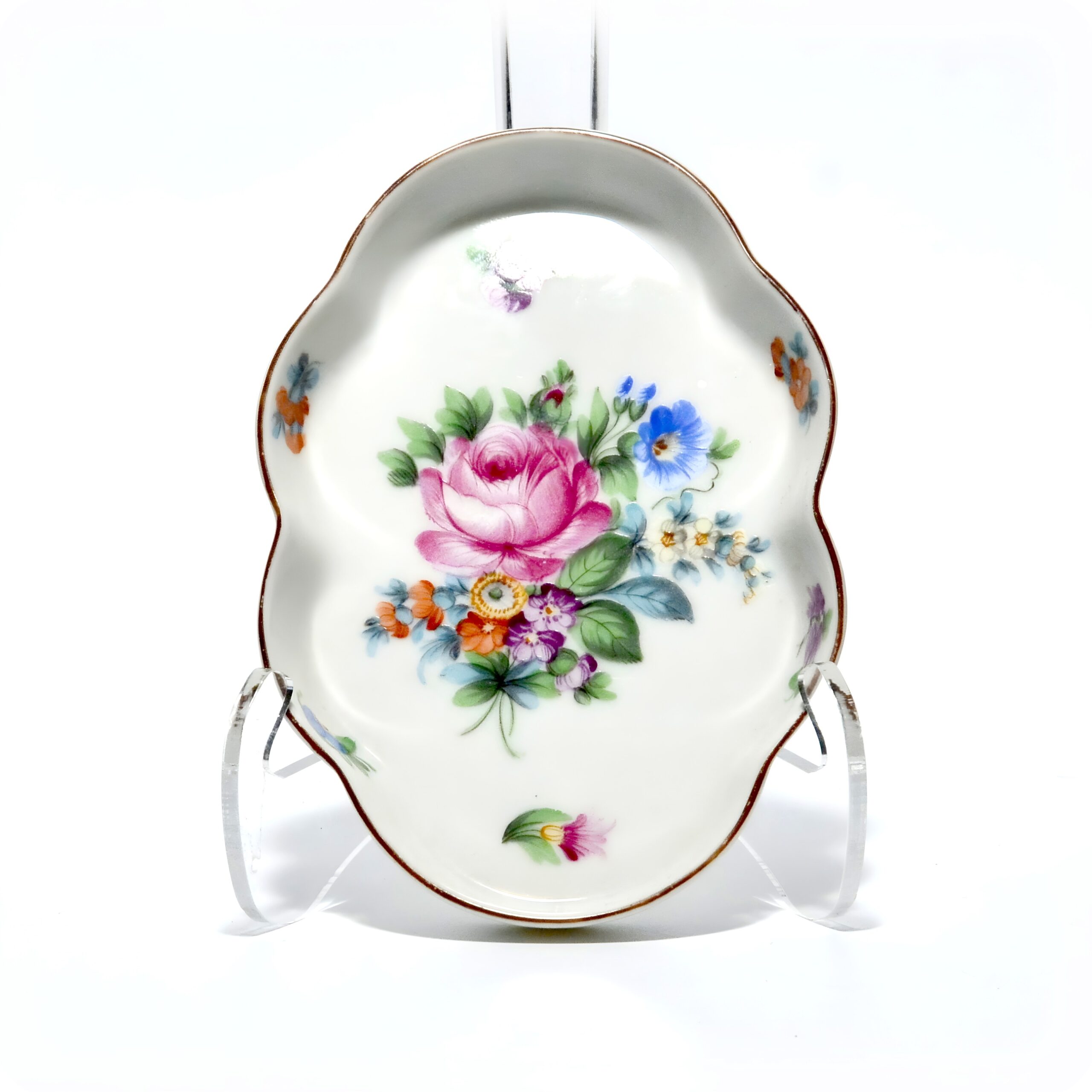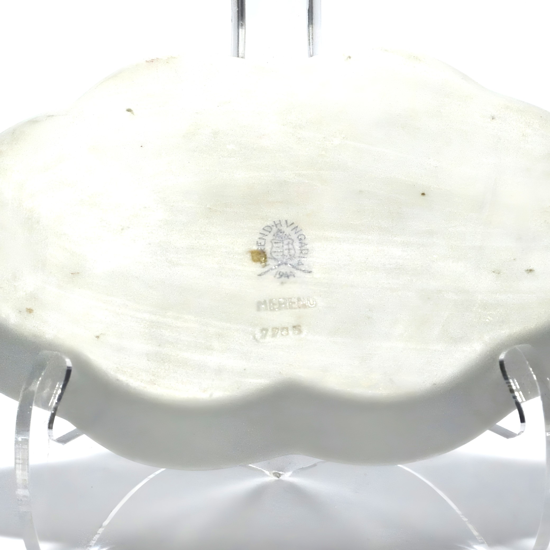 Herend is a renowned Hungarian porcelain brand that has been crafting exquisite porcelain pieces since 1826. The factory, located in the village of Herend, became famous for its intricate designs and hand-painted details, often inspired by nature and historical motifs. Herend porcelain gained popularity among European aristocracy, even being favored by Queen Victoria, which helped boost the brand’s prestige and recognition. Each piece from Herend is a work of art, carrying a legacy of tradition and meticulous craftsmanship. Collectors value these items not just for their beauty but also for the rich history and dedication behind every piece. This trinket tray is a fine example of Herend’s commitment to quality, combining practical utility with artistic elegance, and serves as a testament to a long-standing heritage of decorative excellence.