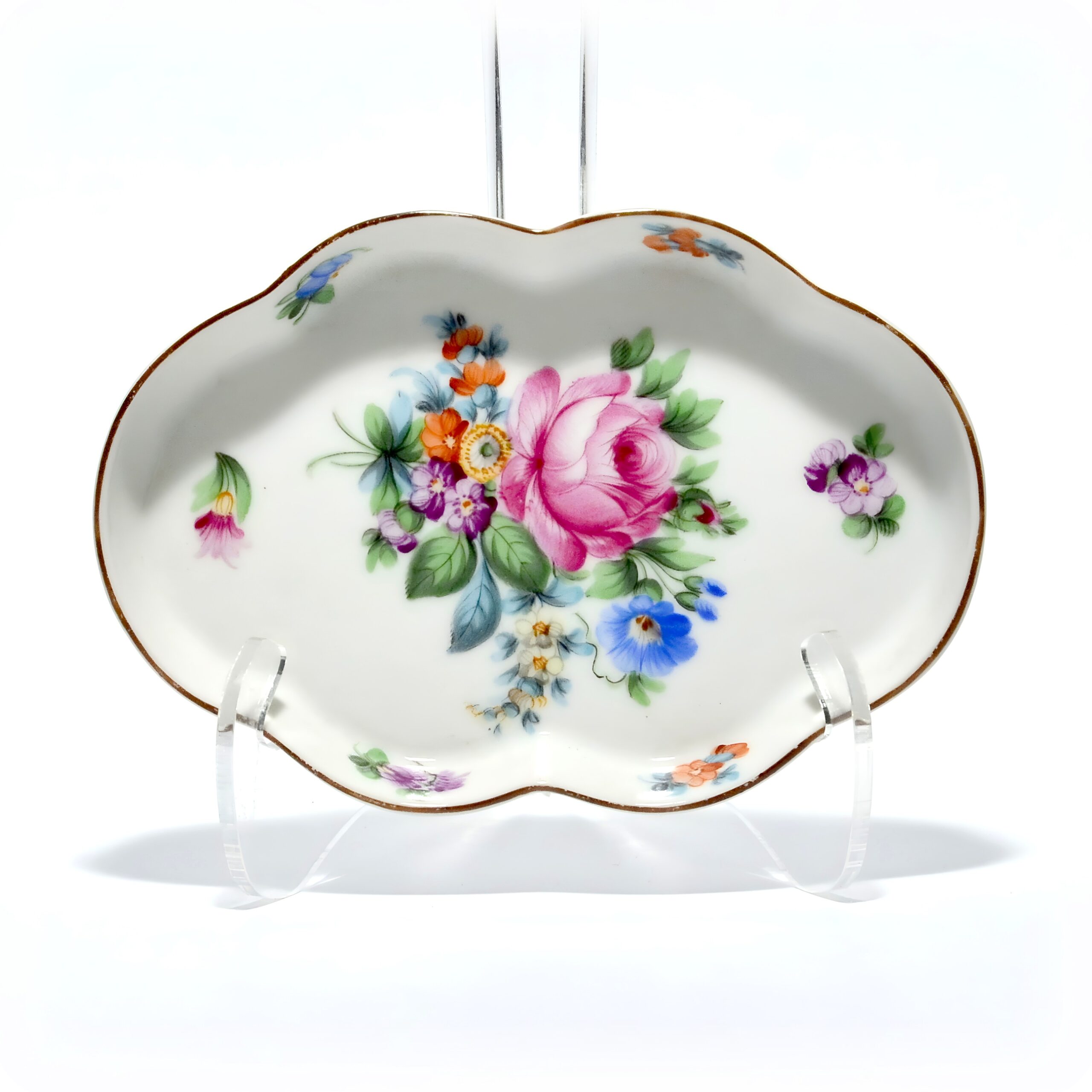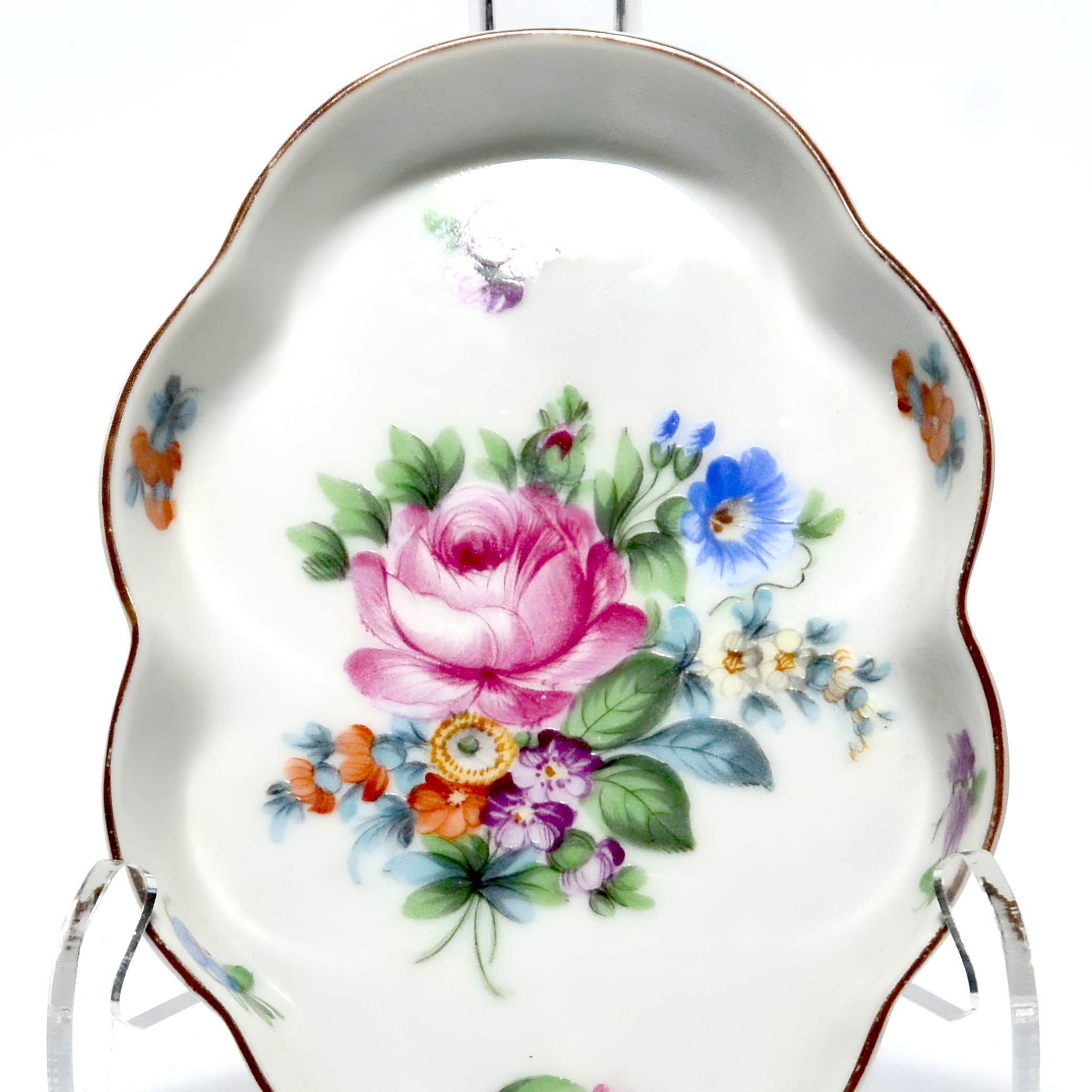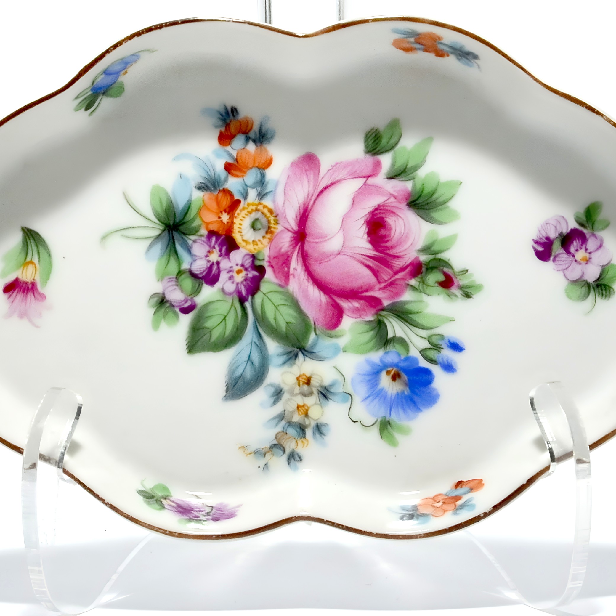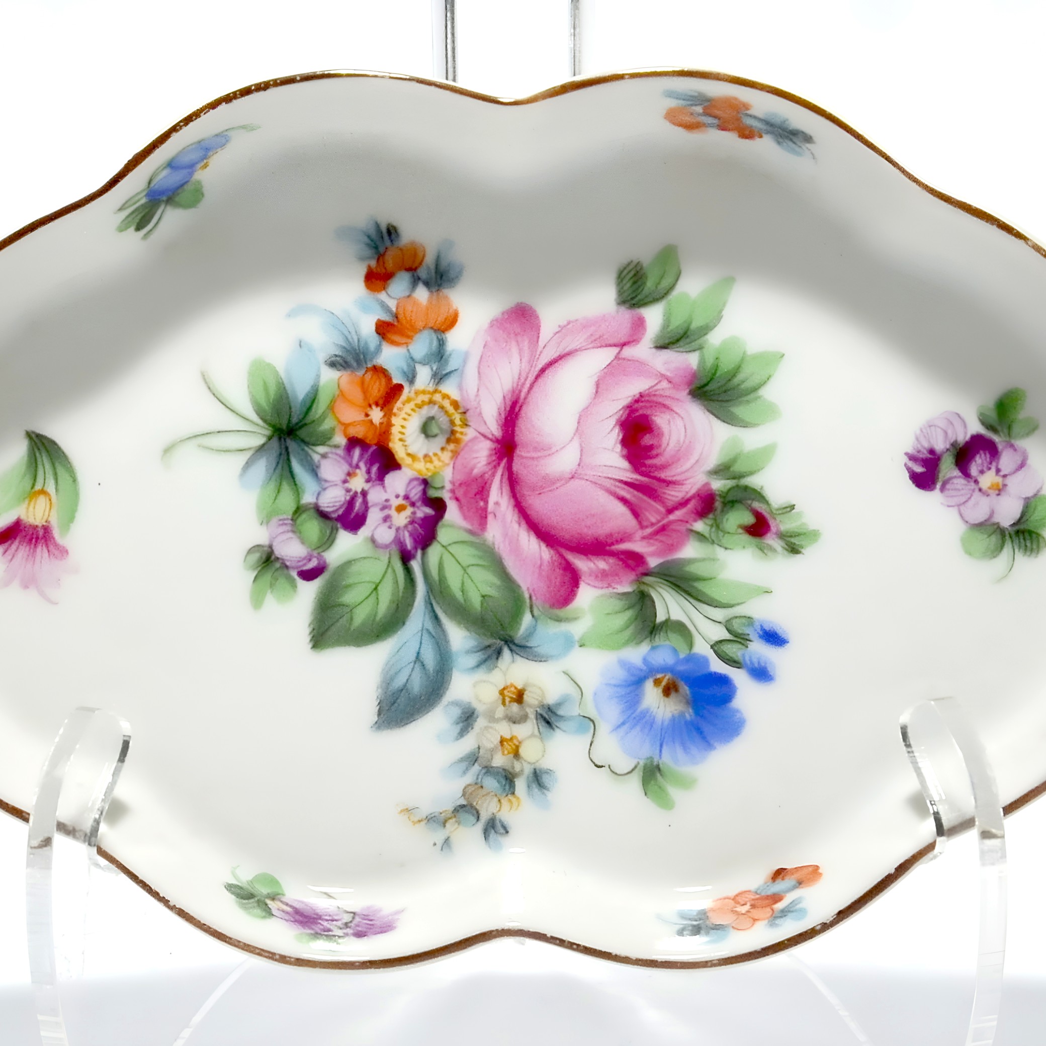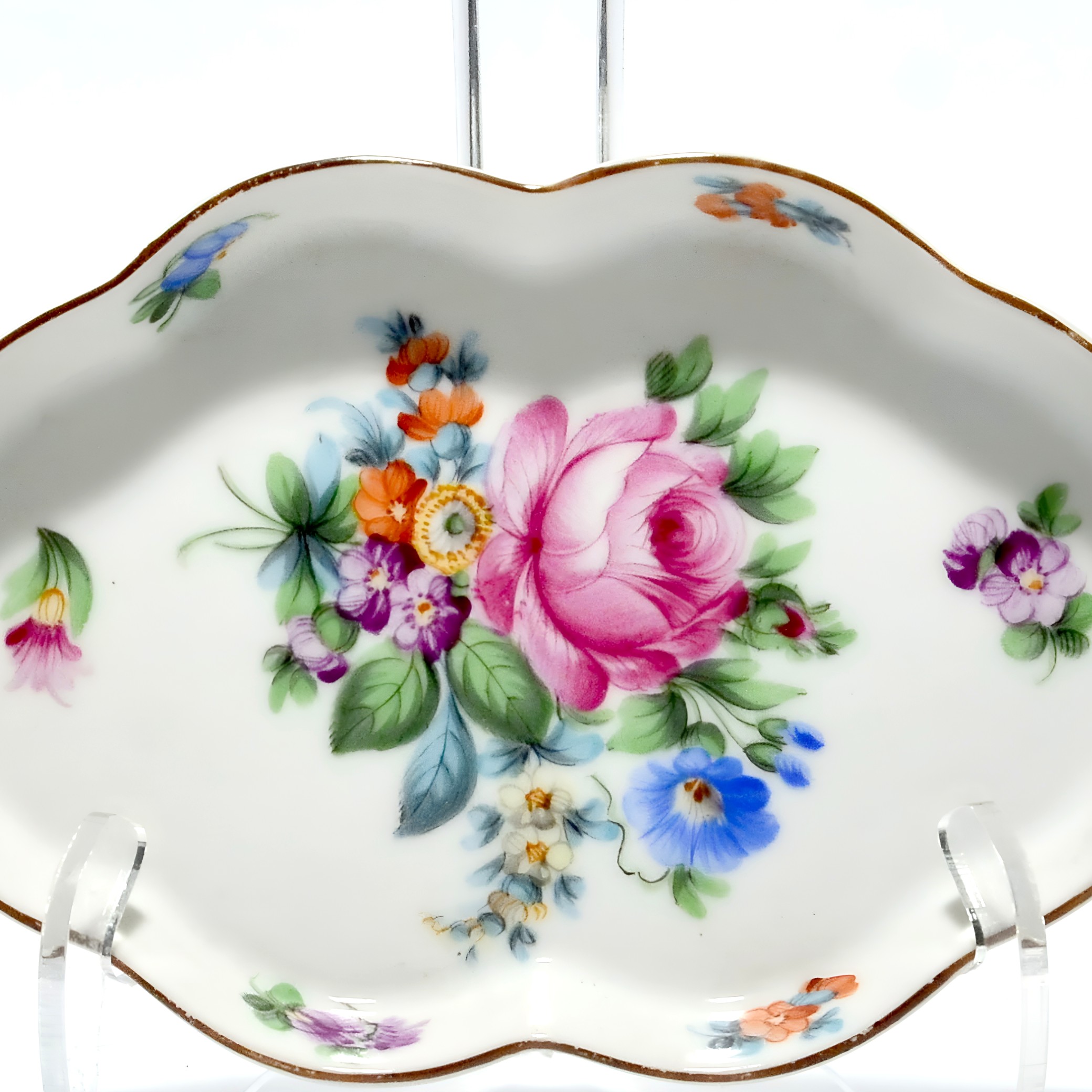 This beautiful Herend trinket tray is a delightful piece that captures the essence of vintage elegance. The tray is meticulously hand-painted with a floral design that bursts with vibrant colors, featuring roses, violets, and other charming blossoms. The gently scalloped edges are trimmed with a delicate gold rim, adding a touch of luxury to its refined appearance. It’s in excellent condition, showcasing the artistry and skill of its makers, and would make a lovely addition to any collection or a practical piece for holding jewelry or small keepsakes. This piece exudes a sense of timeless beauty and would be a perfect gift for someone who appreciates fine craftsmanship and history.