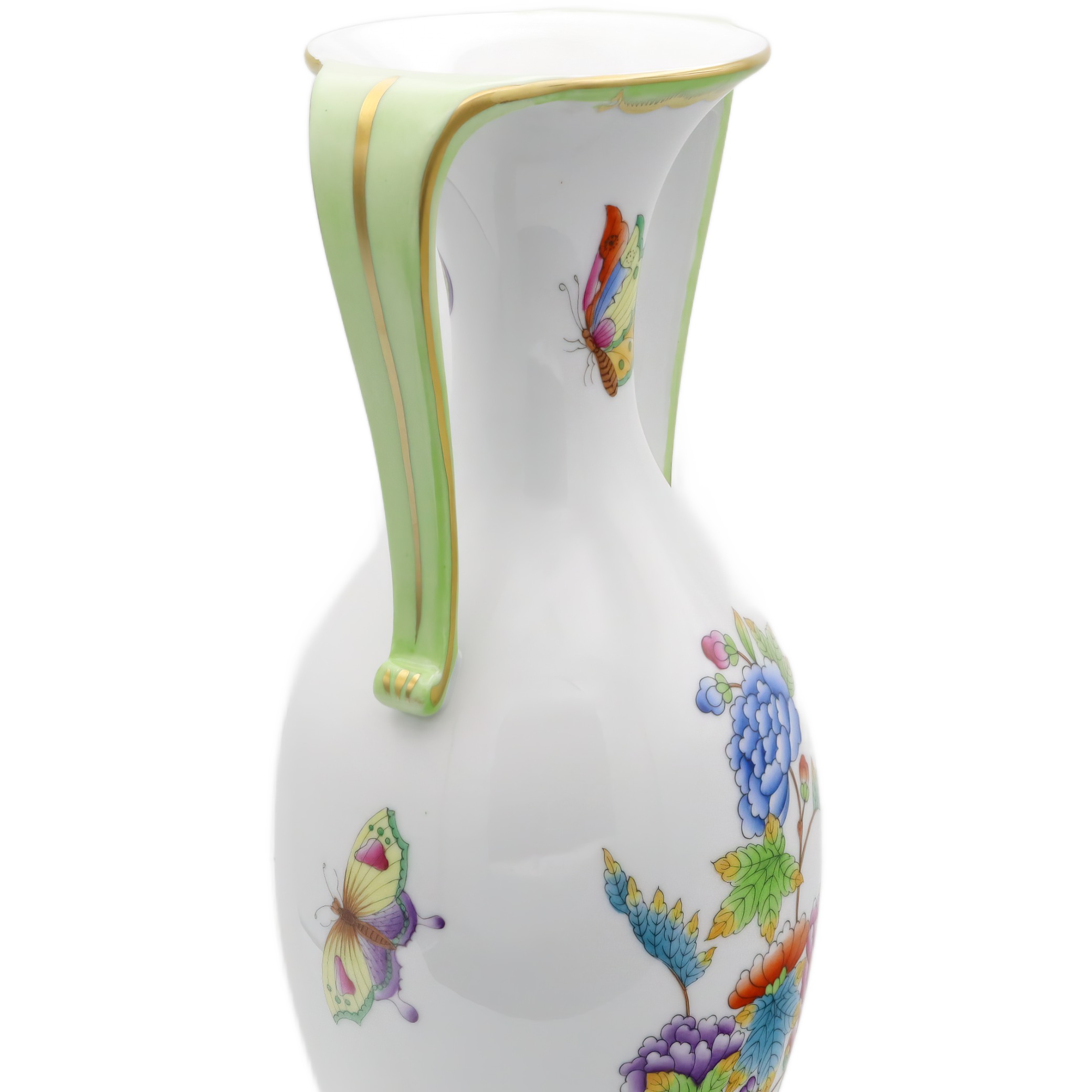 The vase is made of hand-painted porcelain, showing off vibrant butterflies and blooming flowers on a pristine white background. Two elegant handles sweep up each side, with delicate gold accents providing an extra touch of luxury. The iconic butterfly motif and crisp lines make it instantly recognizable as Herend’s work. Given its age—almost 60 years old—its near-mint condition makes it not only a beautiful decorative object but also a highly desirable collectible for those who appreciate fine European porcelain.