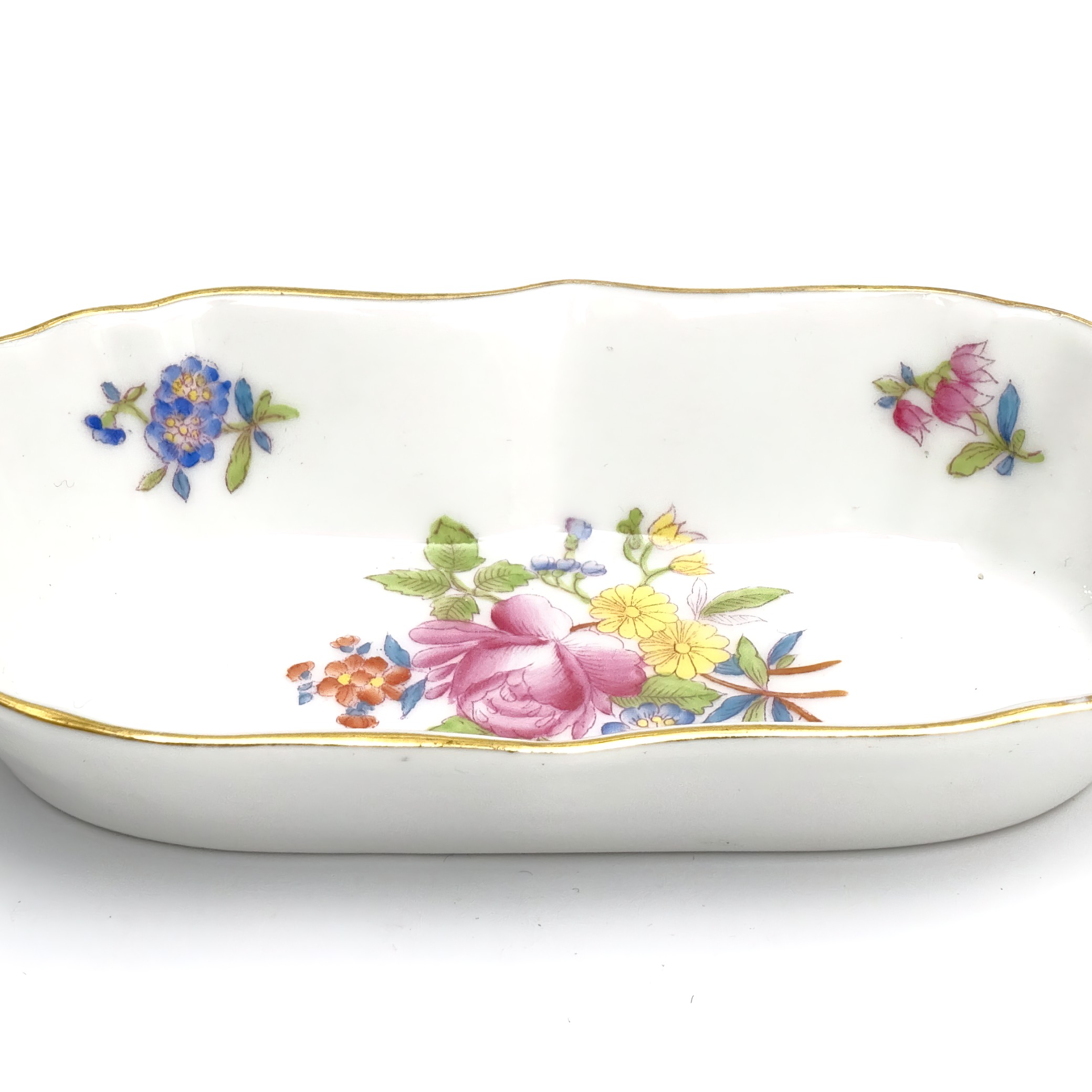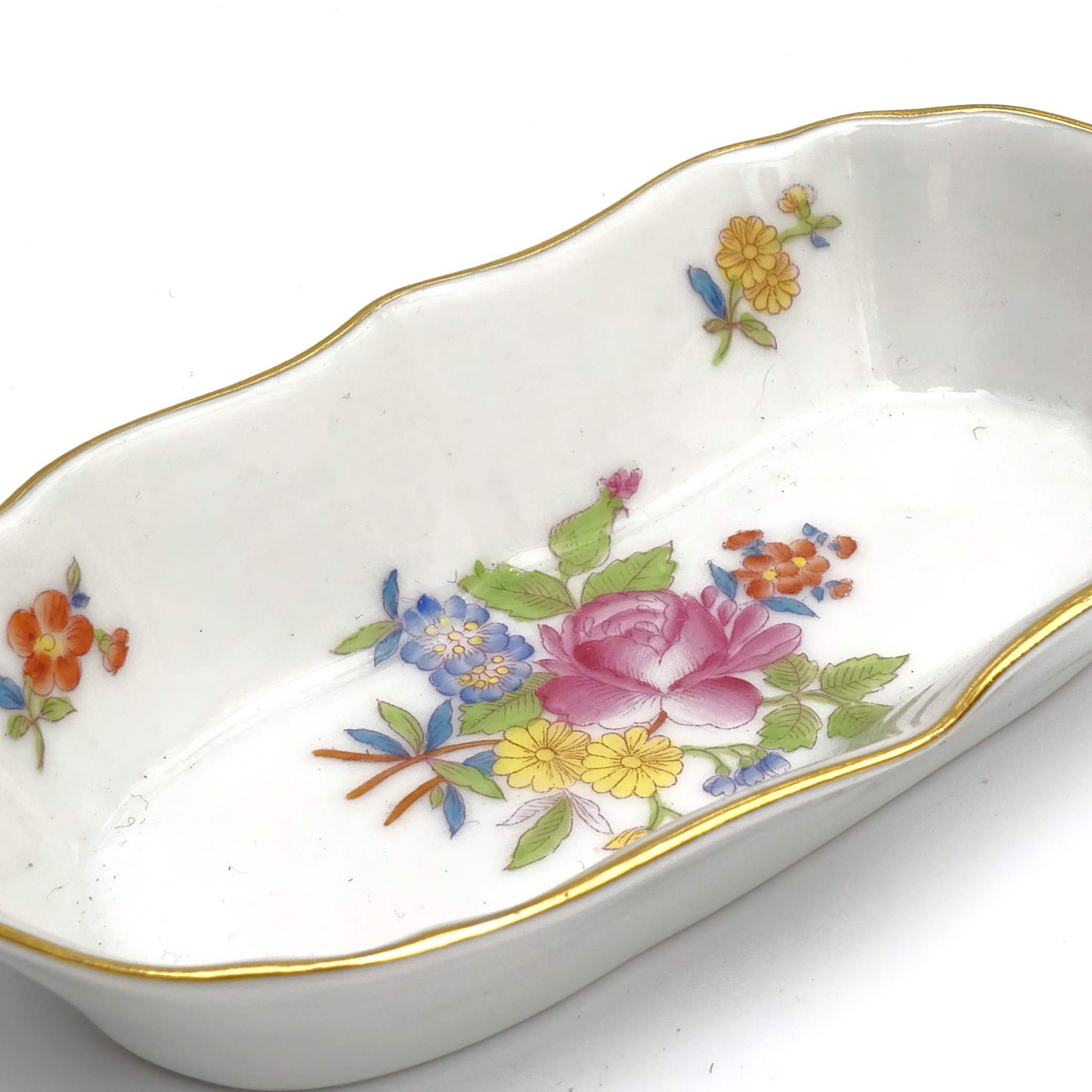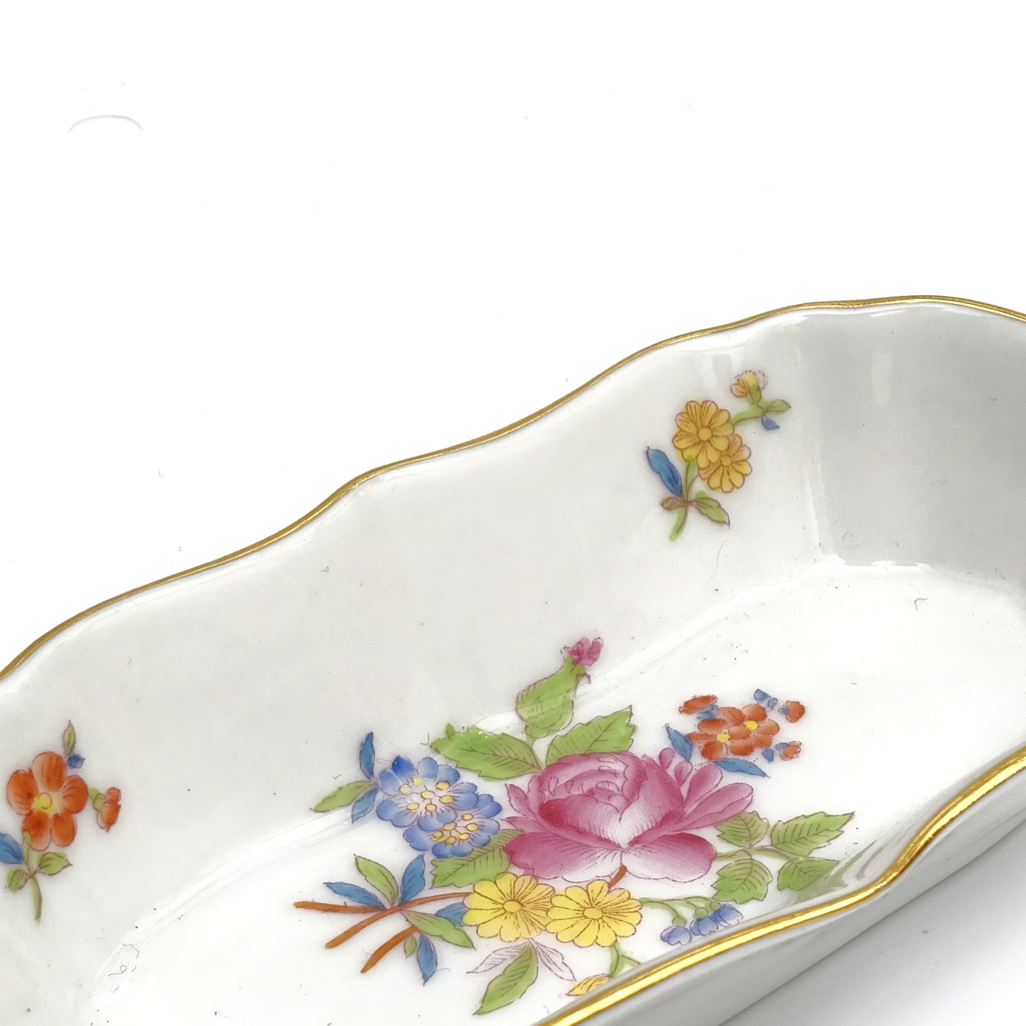 The trinket tray is part of a long tradition of Herend’s dedication to artistry, combining centuries-old techniques with stunning designs. The intricate hand-painting on this piece highlights the skill of the artisans who make these porcelain items. Owning a Herend piece is like owning a small part of art history, reflecting both the brand’s storied past and the timeless elegance it continues to impart. The rarity of such well-preserved items from this era adds to their allure, making them valued collectibles that stand the test of time.
