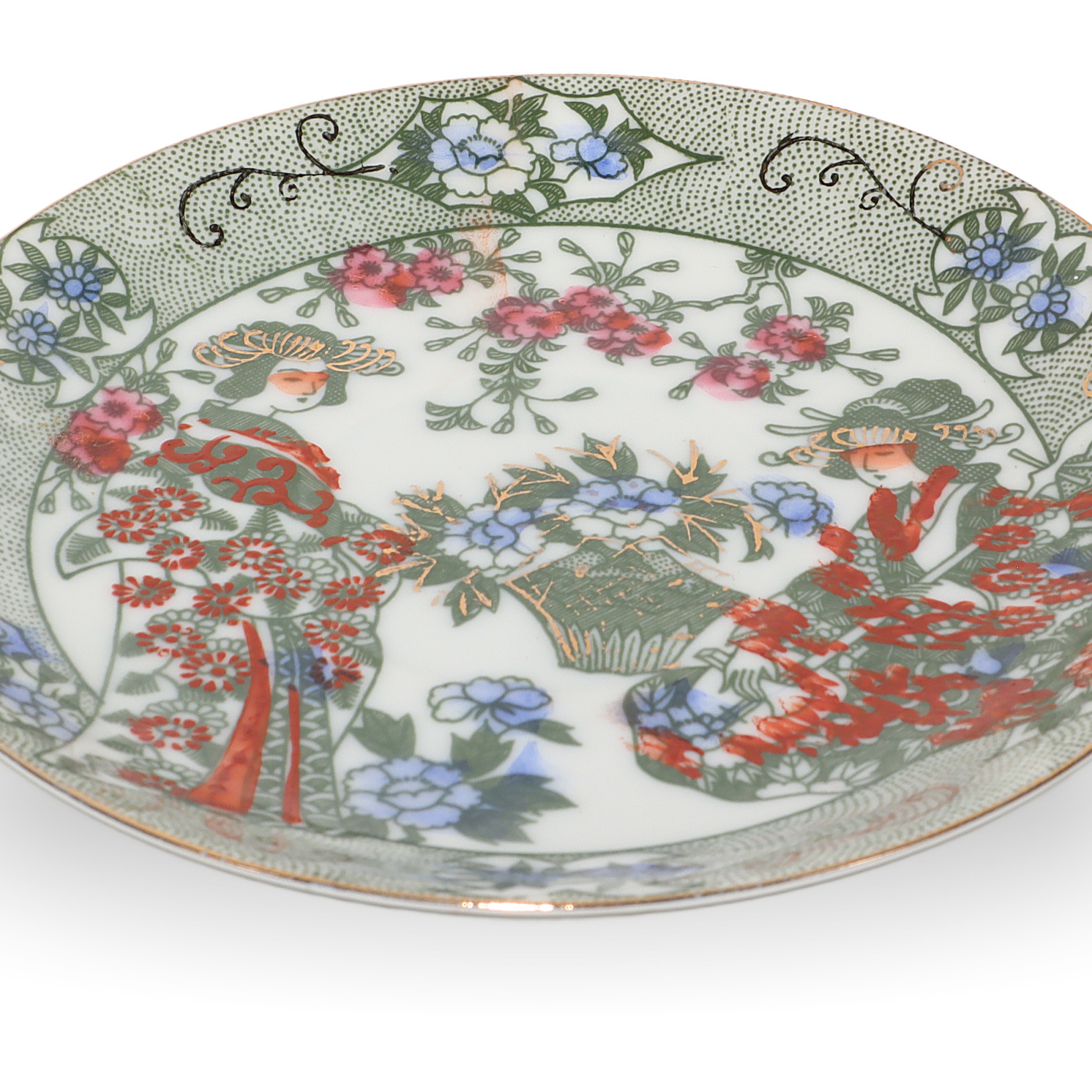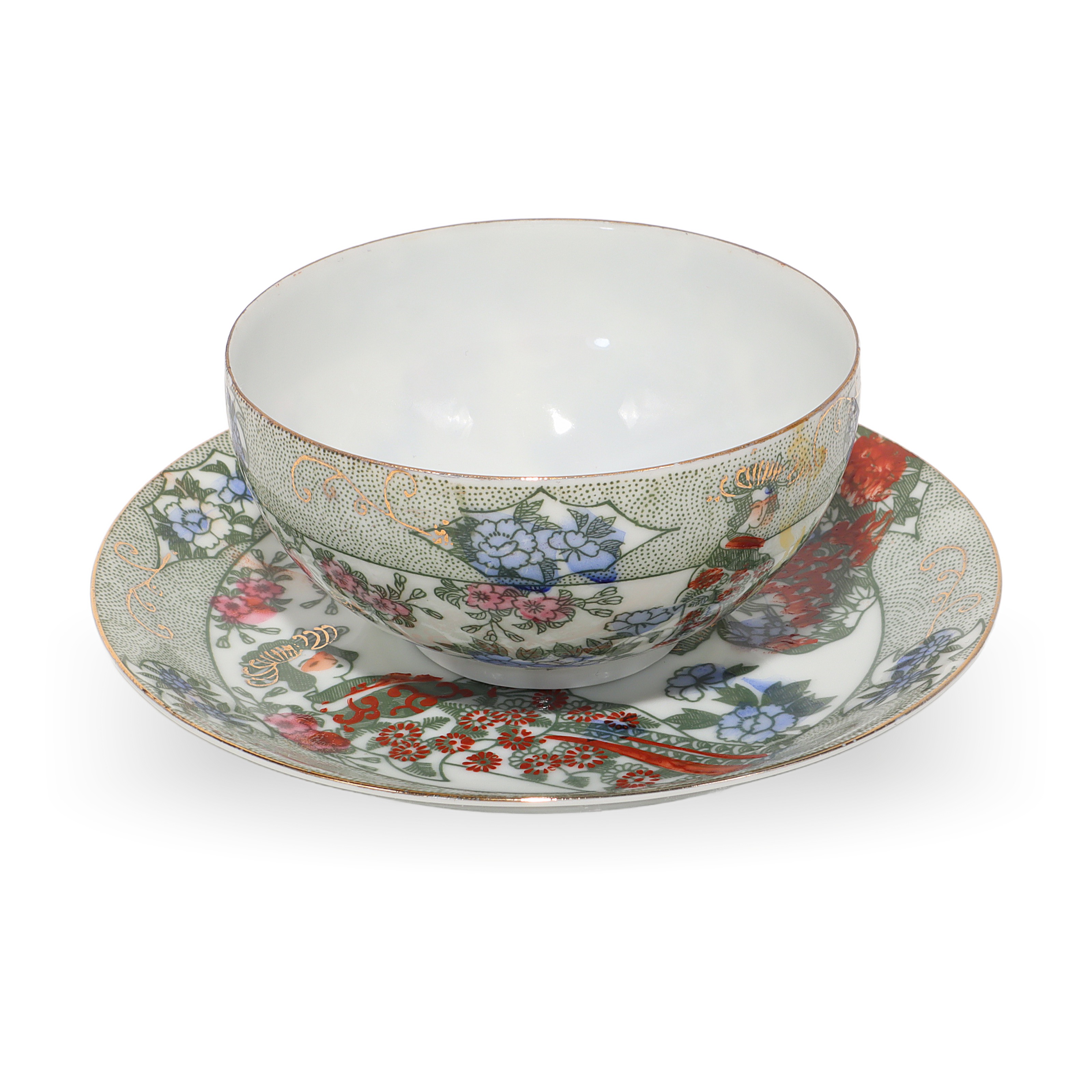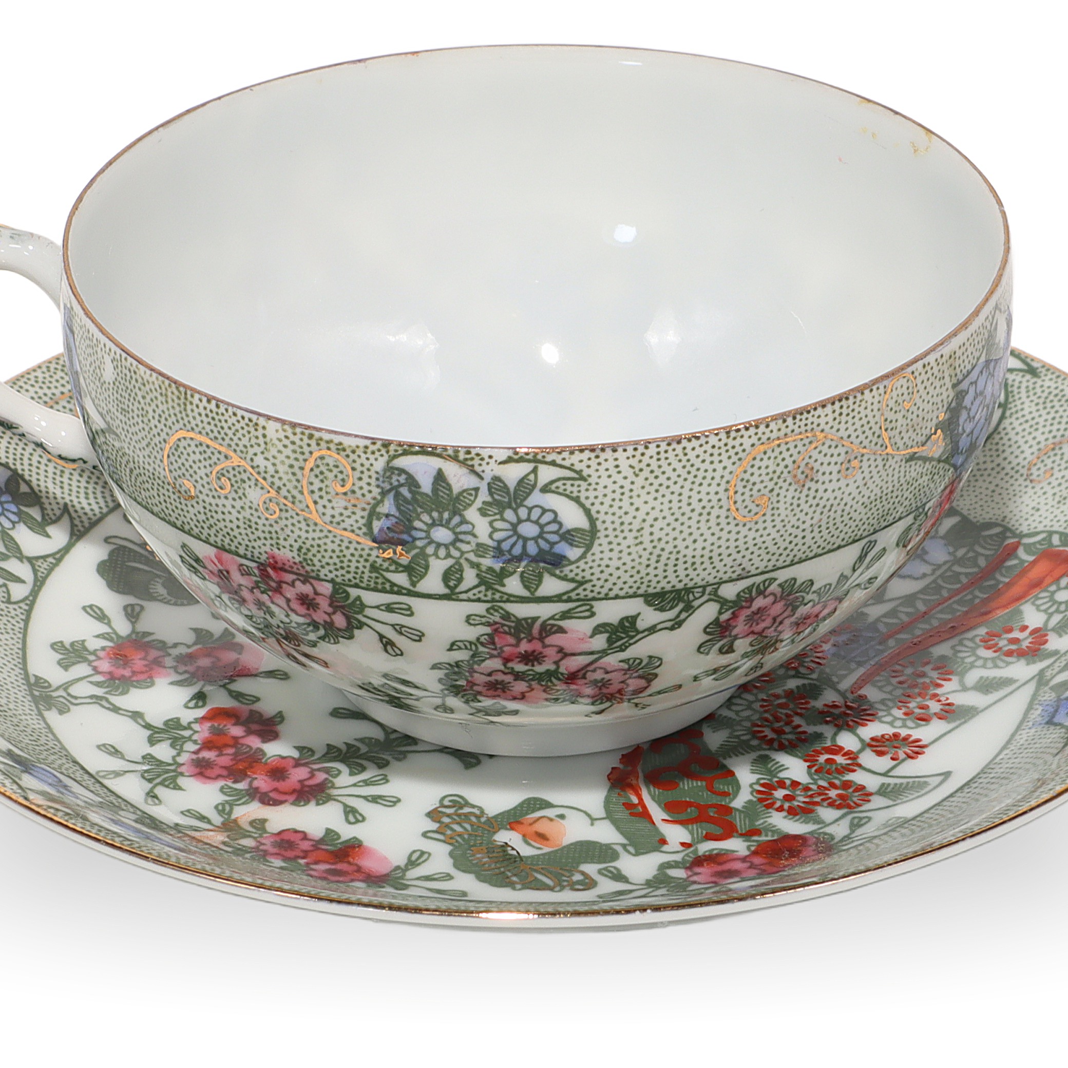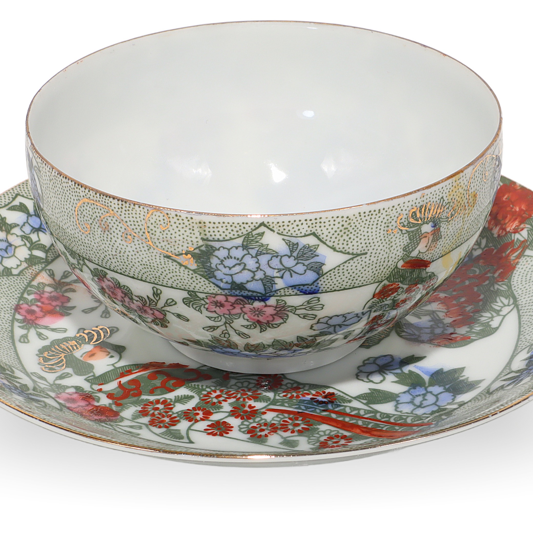 Kutani Ware itself is a celebrated name in Japanese ceramics. Originating in the 17th century, Kutani pieces are celebrated for their bold use of color—especially greens, reds, yellows, and blues—and exquisite detail. Items like this teacup and saucer, though made in the mid-20th century, still showcase traditional Kutani artistry, which often features elaborate natural scenes or stunning floral designs. Even though it was made post-Meiji era, by 1960 Kutani Ware was already famous worldwide. Genuine vintage sets like this, especially in such pristine shape, are getting harder to find, making them sought after by both collectors and those who just love the beauty and story behind everyday objects.
