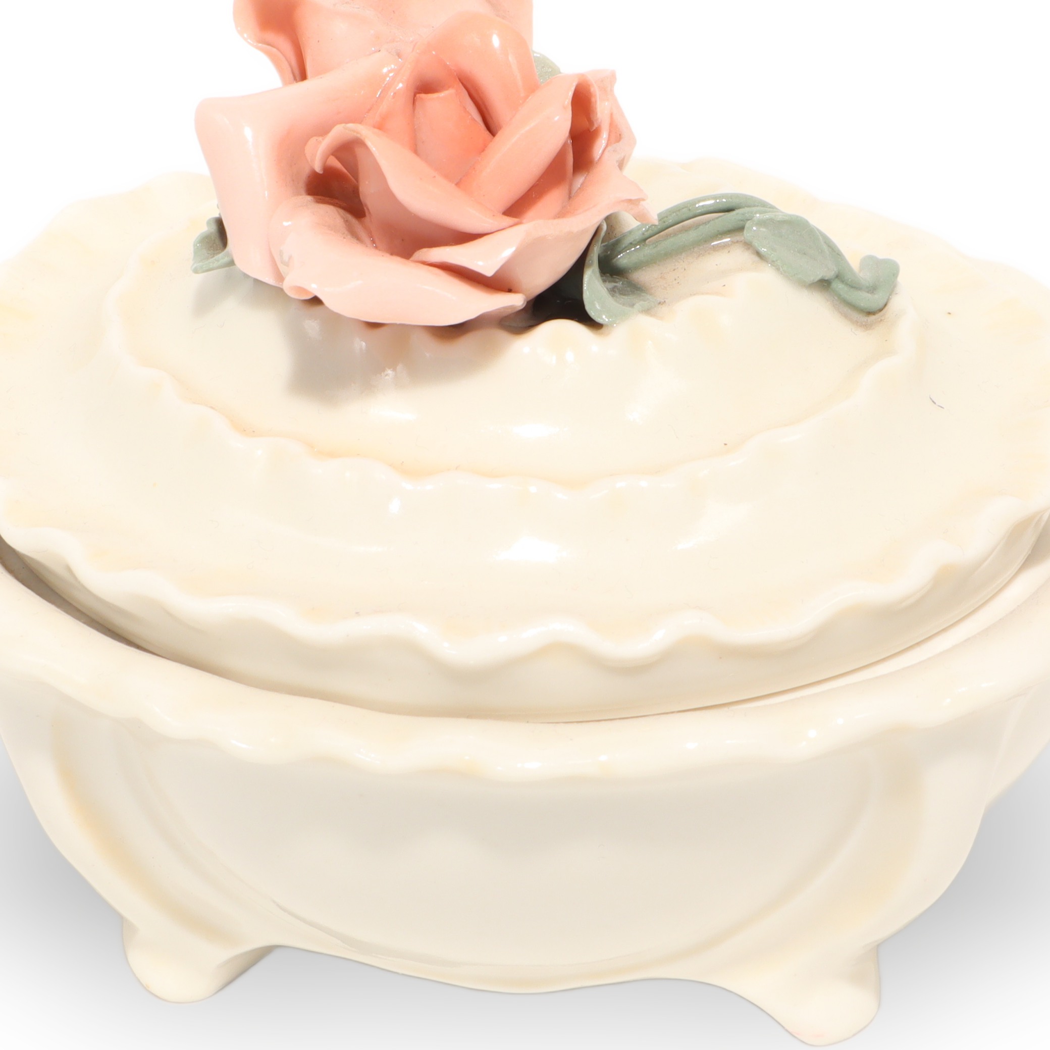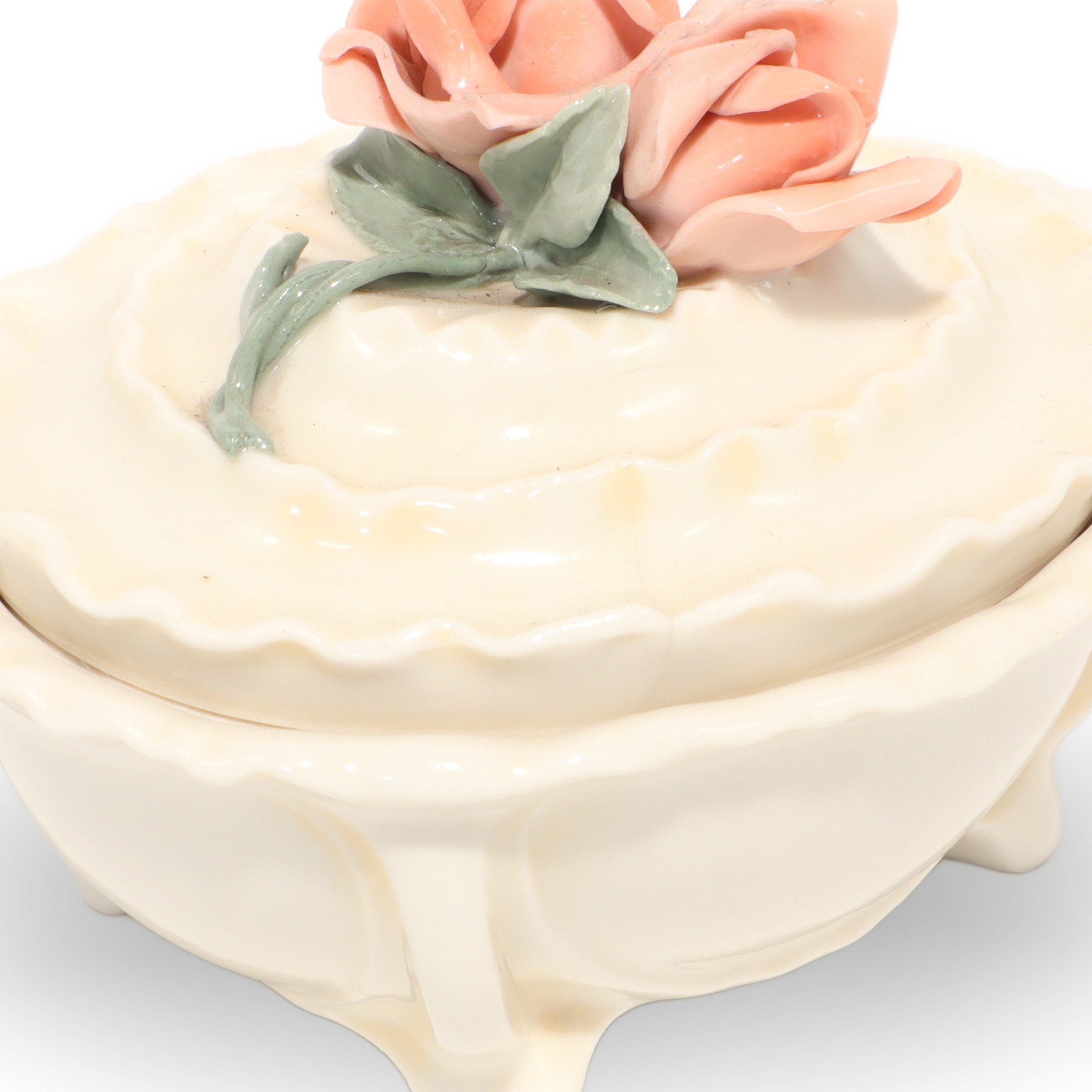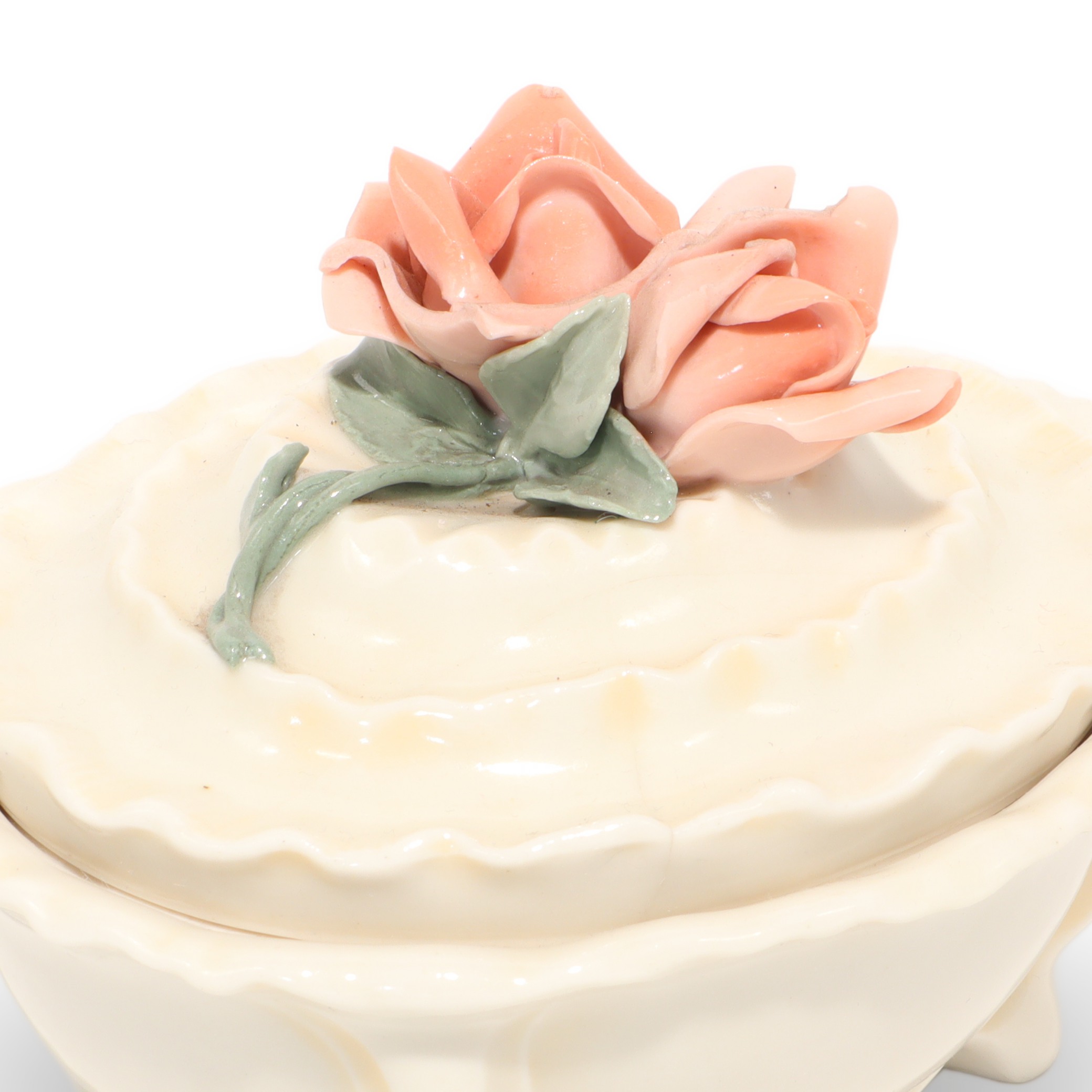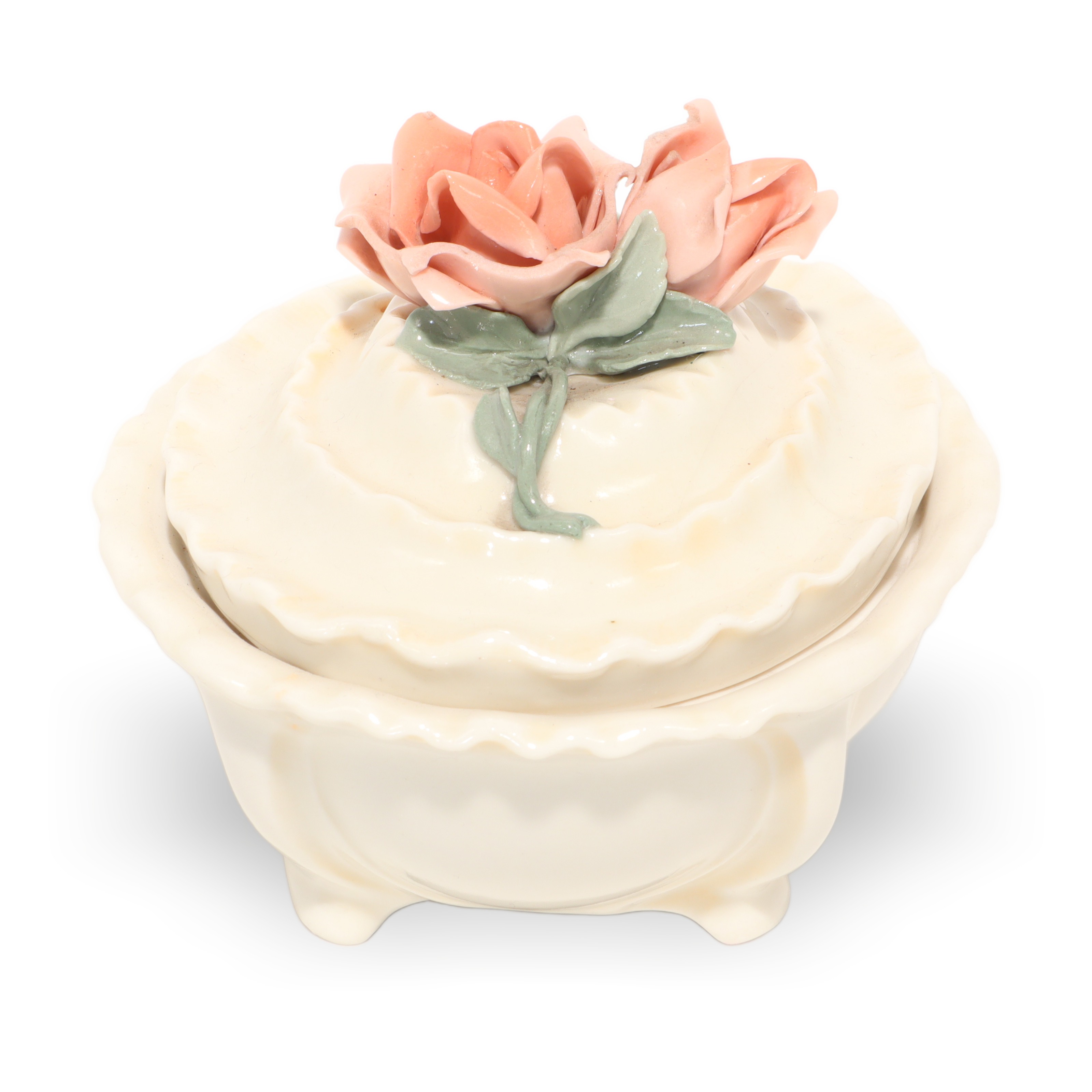 This charming little porcelain trinket box is a sweet throwback from around 1970, and it really shows off the beauty of vintage craftsmanship. Measuring about 4 inches tall, 4 inches wide, and 5 inches long, it’s just big enough to tuck away your rings, earrings, or other tiny treasures. What makes this piece stand out is its lovely rose handle, delicately sculpted and painted in soft pastel colors. Every inch feels carefully finished, from the wavy edge of the lid to the gentle, creamy glaze on the porcelain body. Despite being more than 50 years old, it’s managed to stay in near mint condition, which is honestly pretty rare for porcelain items. You can just imagine it sitting prettily on someone’s dresser decades ago, holding keepsakes and memories.