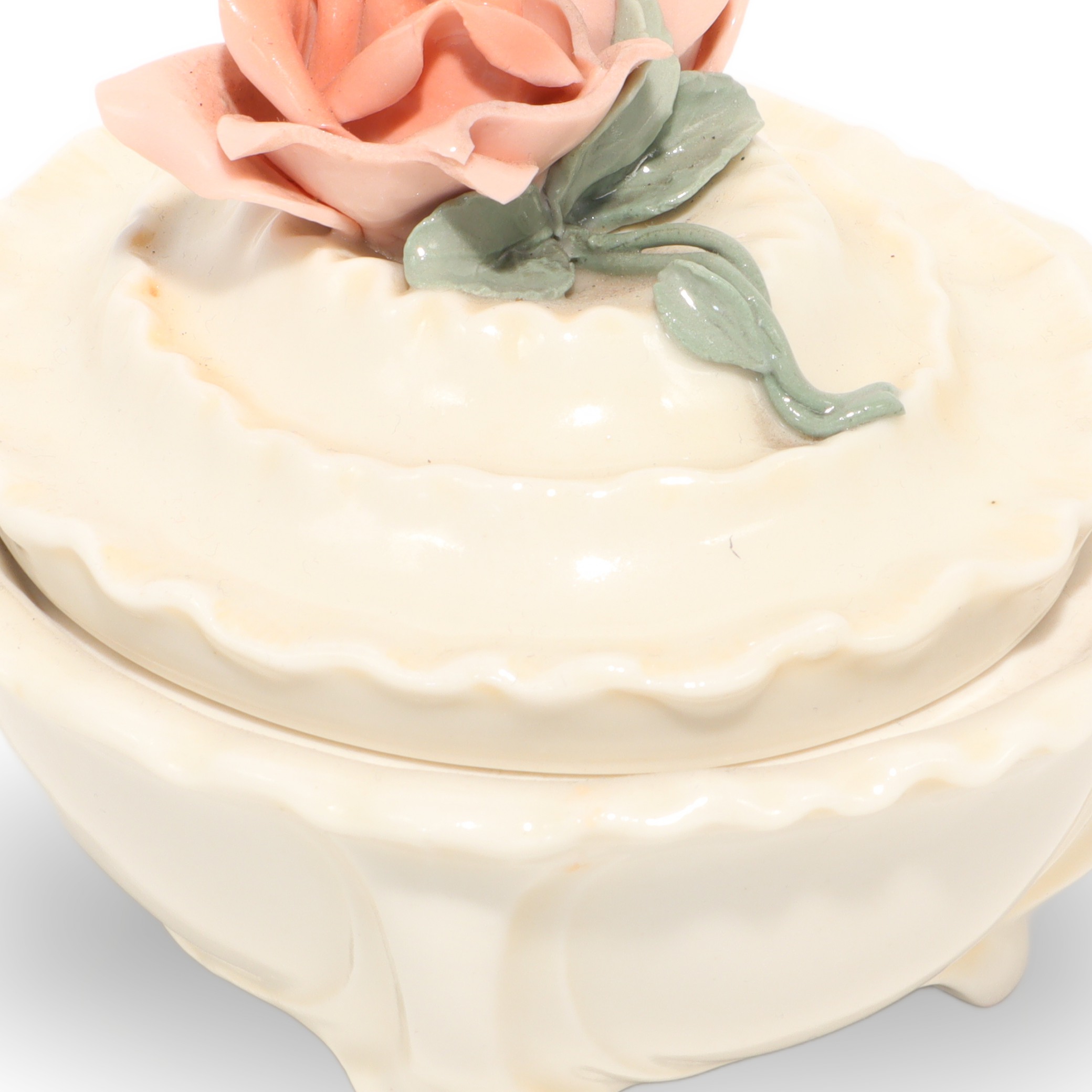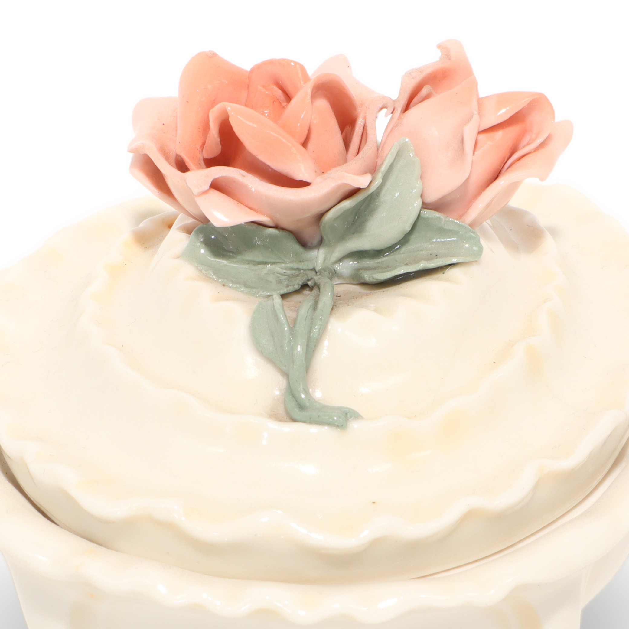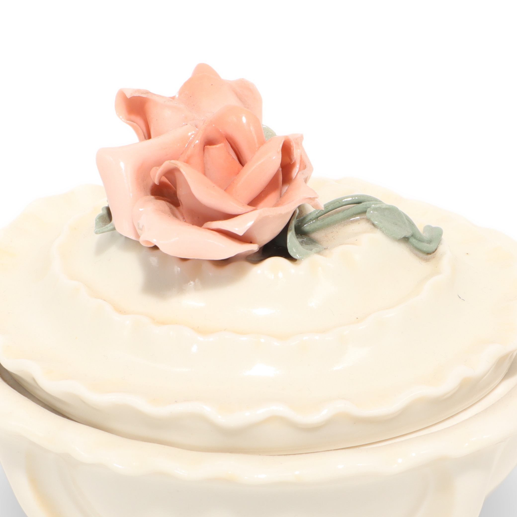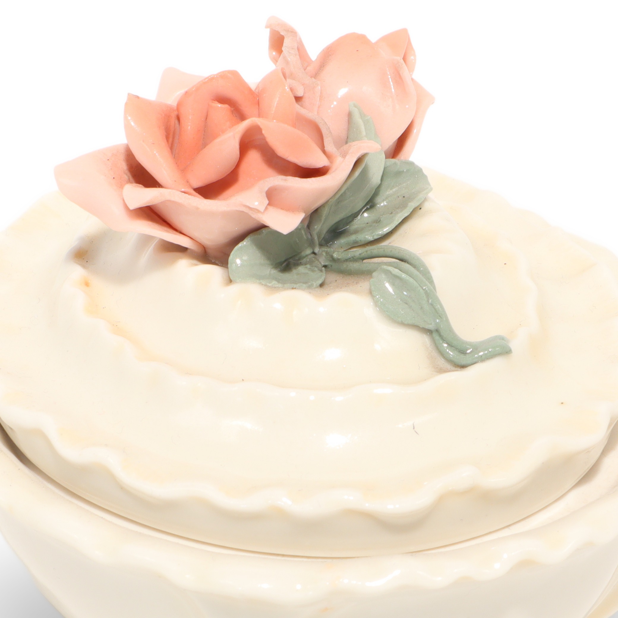 This charming little porcelain trinket box is a sweet throwback from around 1970, and it really shows off the beauty of vintage craftsmanship. Measuring about 4 inches tall, 4 inches wide, and 5 inches long, it’s just big enough to tuck away your rings, earrings, or other tiny treasures. What makes this piece stand out is its lovely rose handle, delicately sculpted and painted in soft pastel colors. Every inch feels carefully finished, from the wavy edge of the lid to the gentle, creamy glaze on the porcelain body. Despite being more than 50 years old, it’s managed to stay in near mint condition, which is honestly pretty rare for porcelain items. You can just imagine it sitting prettily on someone’s dresser decades ago, holding keepsakes and memories.