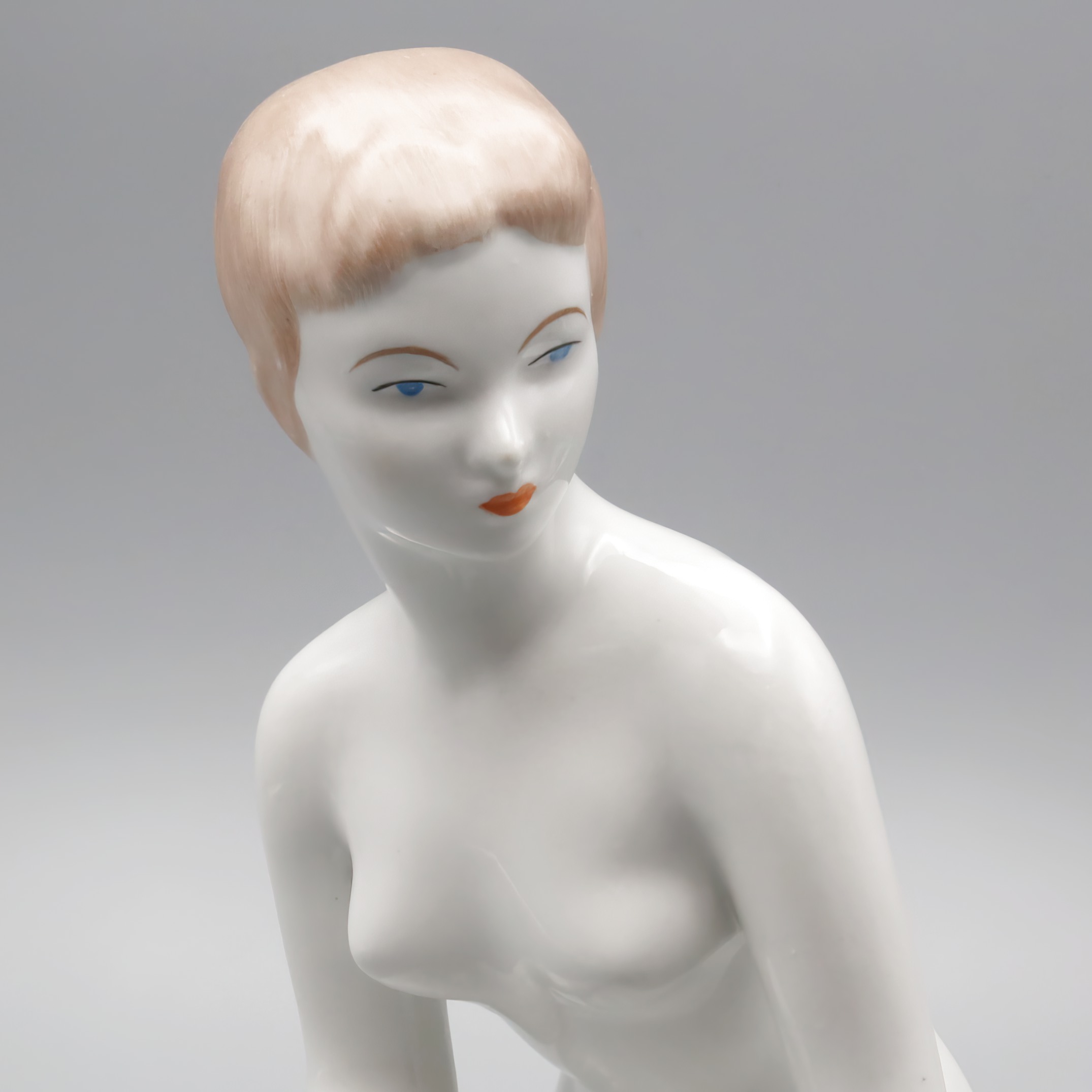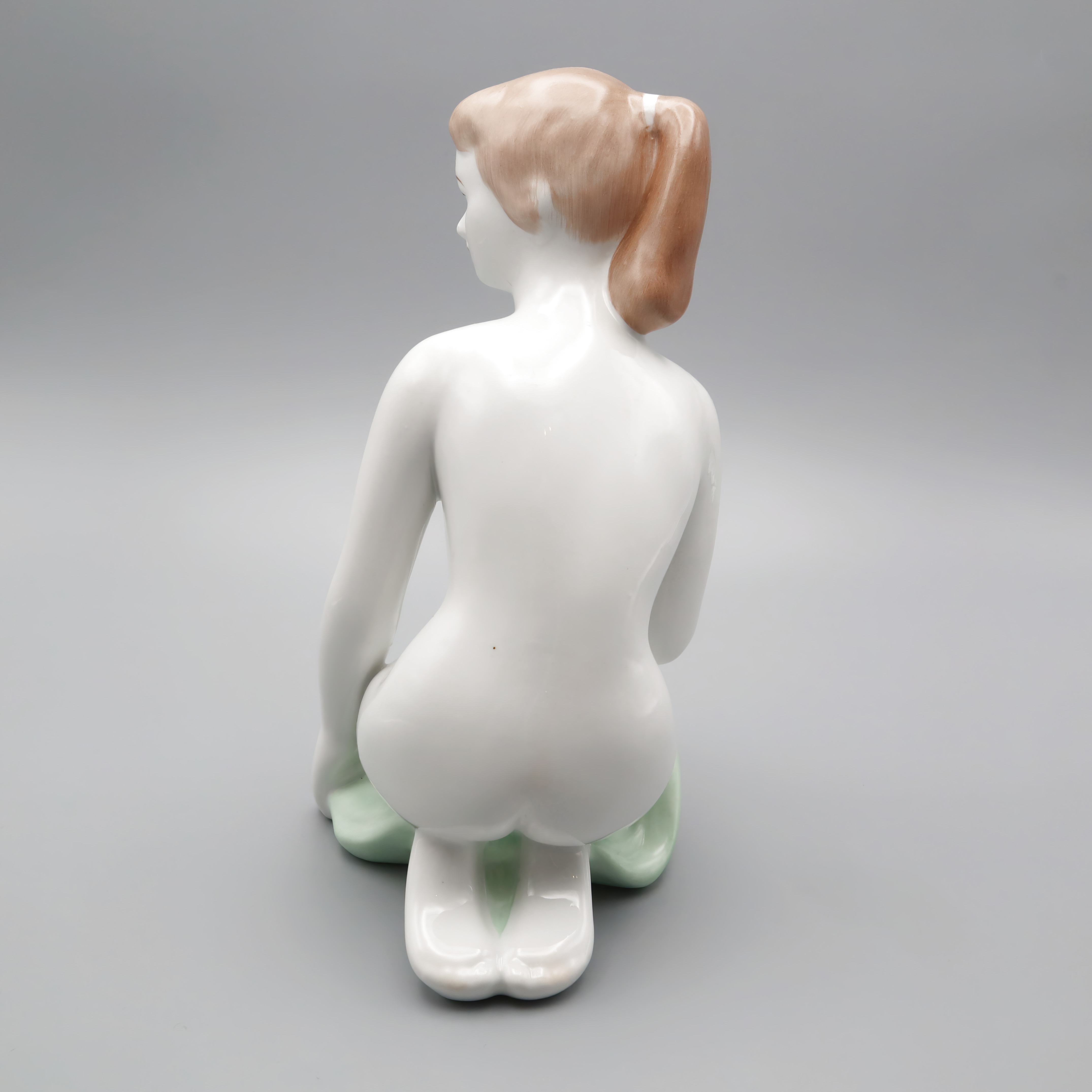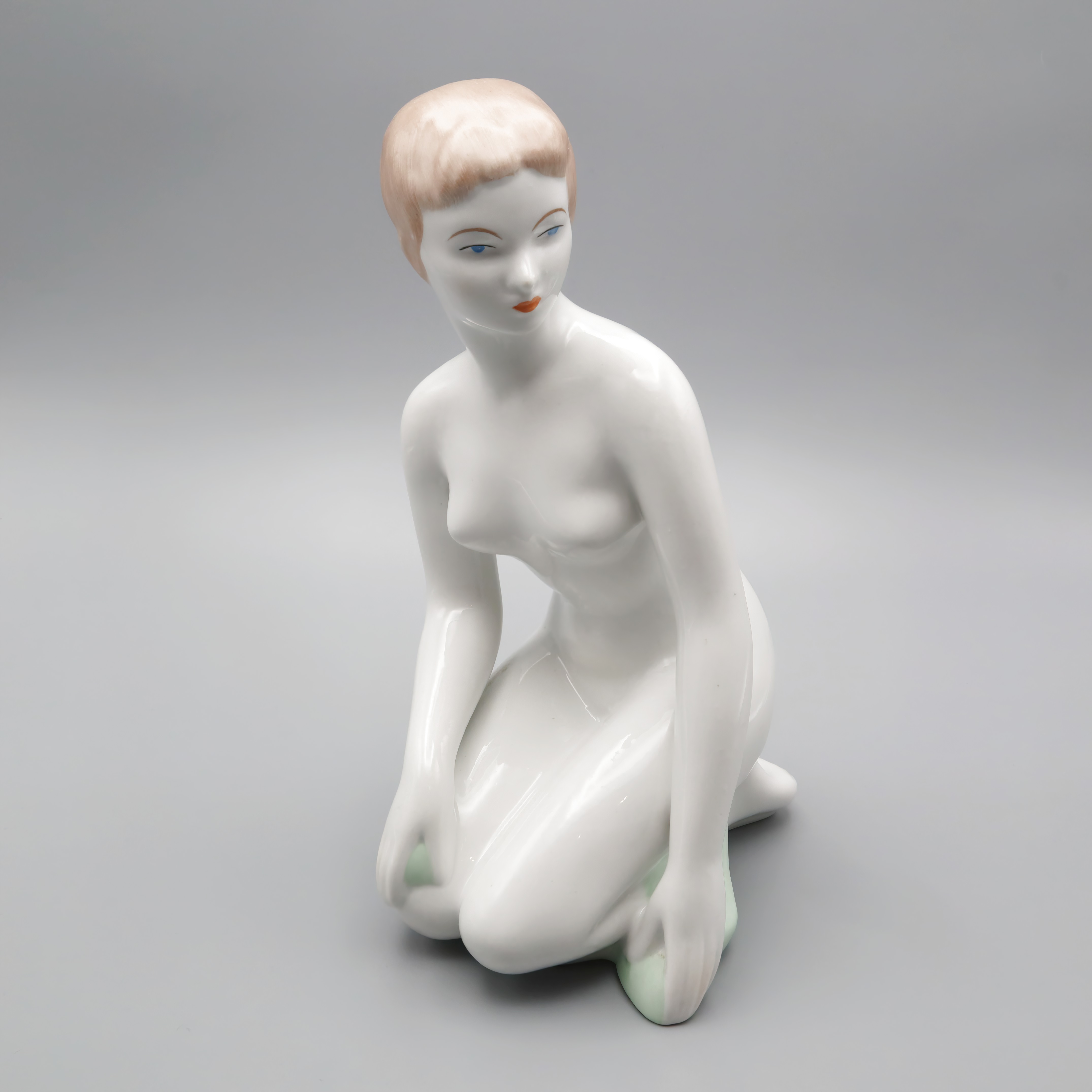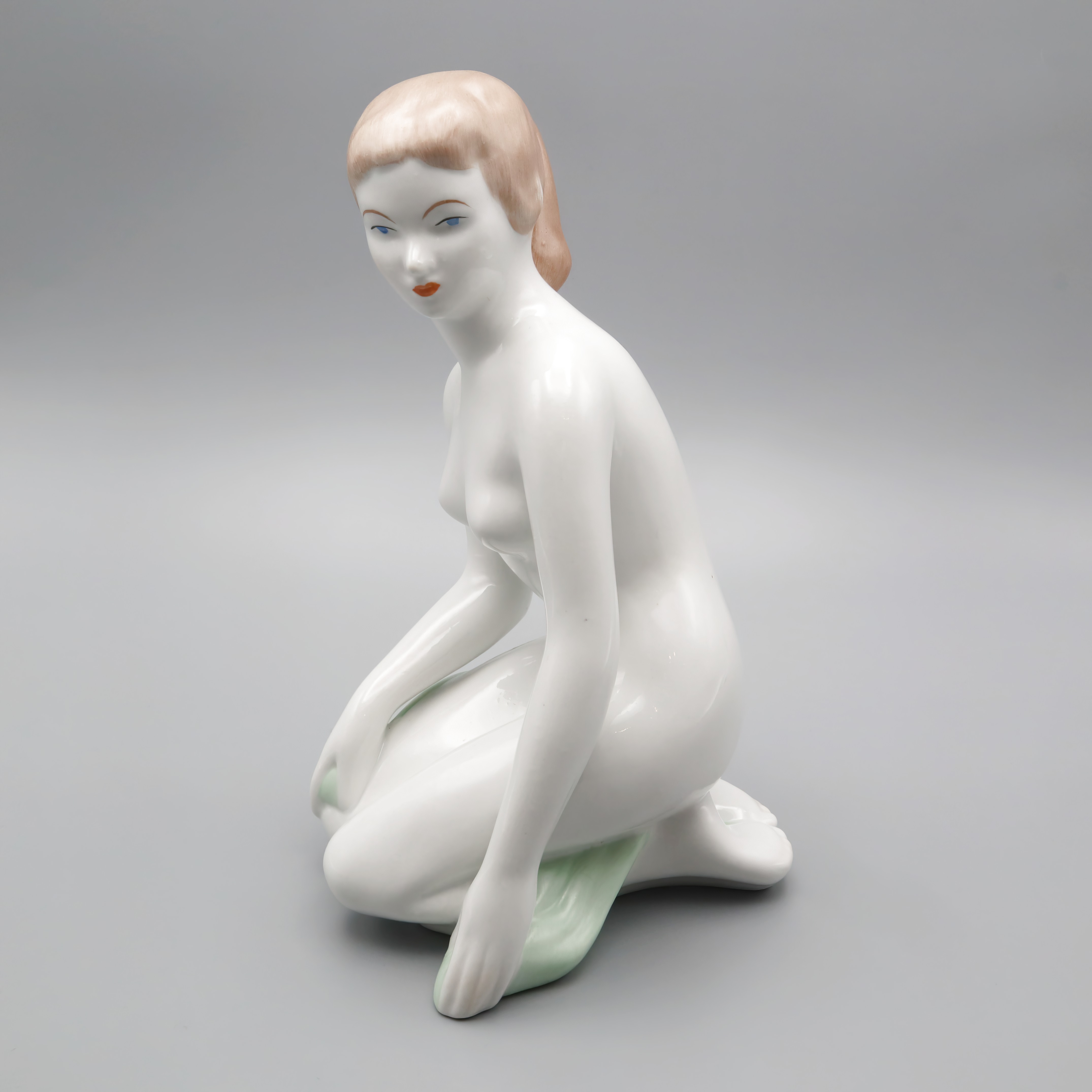 This stunning Kneeling Woman Statue is a beautiful piece of art from Aquincum, Hungary, crafted in 1970. With a height of 9 inches, this near mint condition porcelain figurine captures the elegance and grace of the female form in a mid-century modern style. Its sleek lines and smooth finish give it a timeless quality, making it a fantastic addition to any collection or a standout piece in home decor. As a handmade sculpture, it showcases the artistry and craftsmanship synonymous with European ceramic art. The subtle coloration adds depth to the figure, making it both a conversation starter and a serene decorative element.