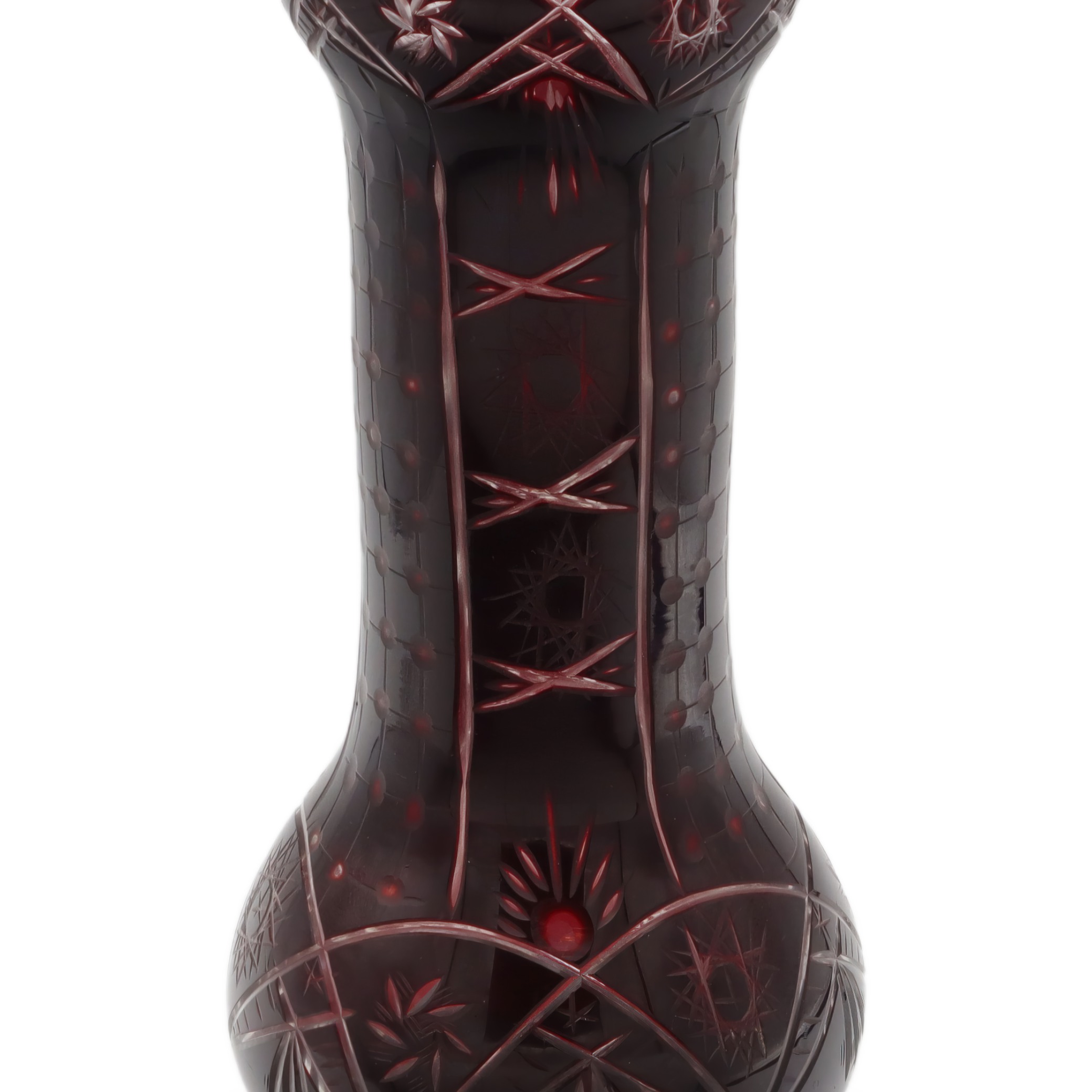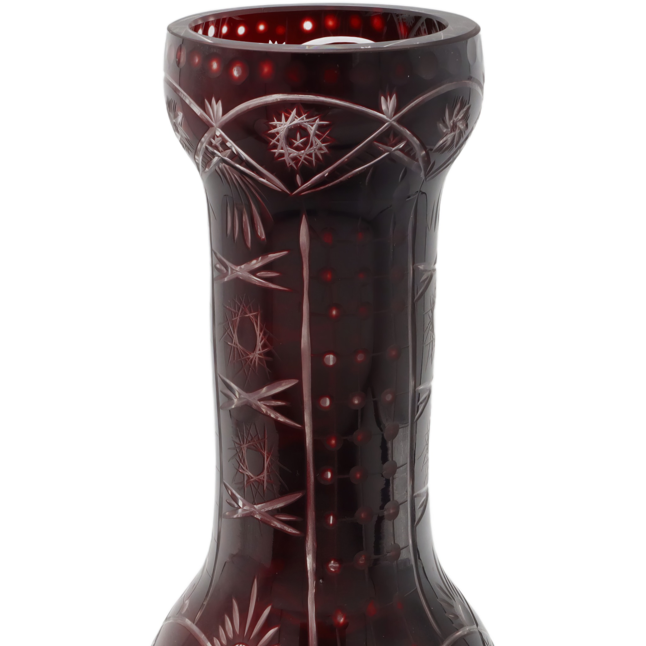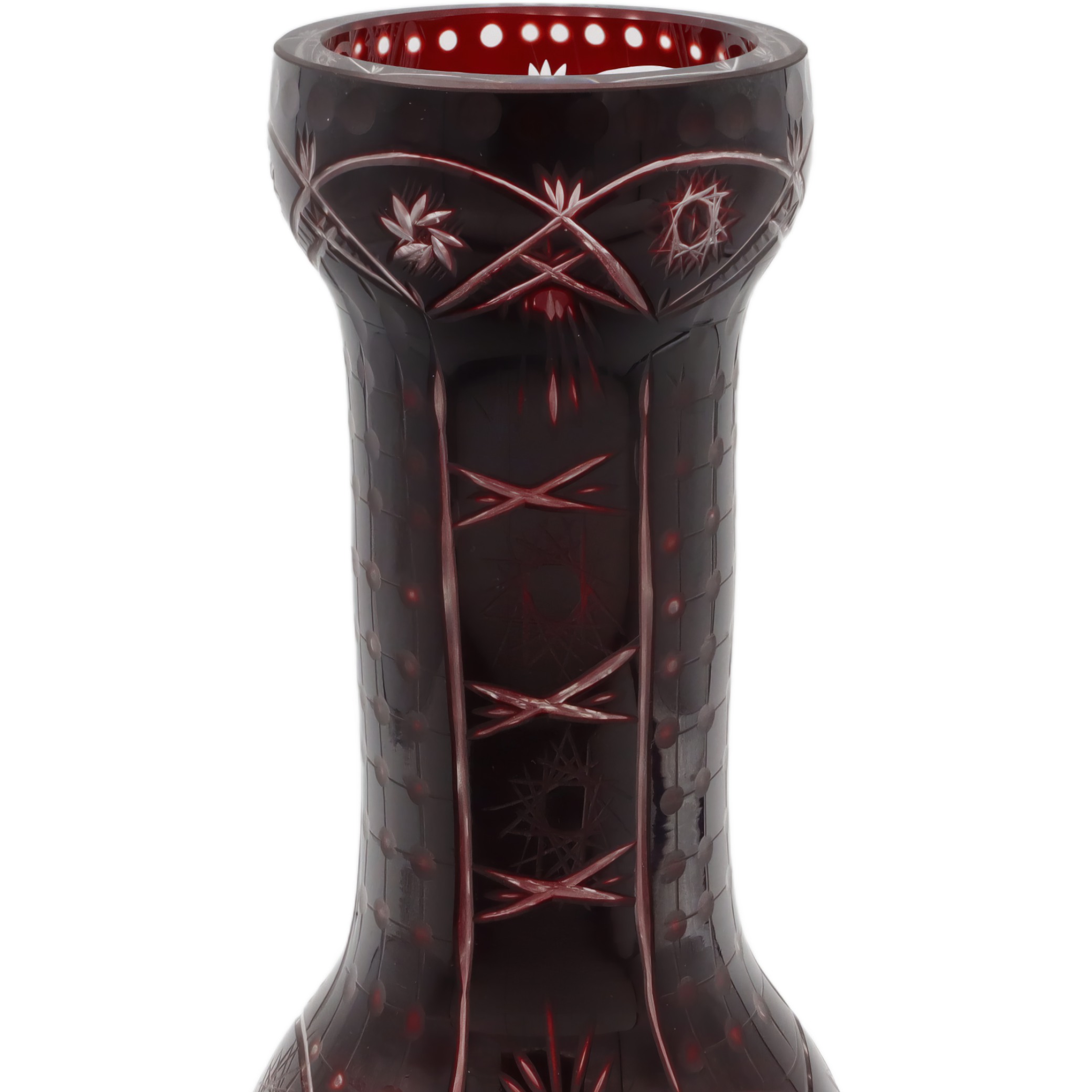 What you’re looking at here is a striking, large Bohemia crystal vase from around 1965. This vase stands out with its rich, ruby-red color and beautiful hand-cut details that glimmer when the light hits them just right. It’s a centerpiece-worthy piece, standing about 10.5 inches tall with just the right amount of width to make a statement without taking over your whole table or mantle. The condition is described as near mint, which means it’s been taken care of and lovingly preserved over the years. There’s a weight to it, too, both physically and in the way it draws your attention. The hand-cut designs aren’t just patterns—they’ve got an almost starburst and crosshatch feel, showing the skill that went into making this vase.