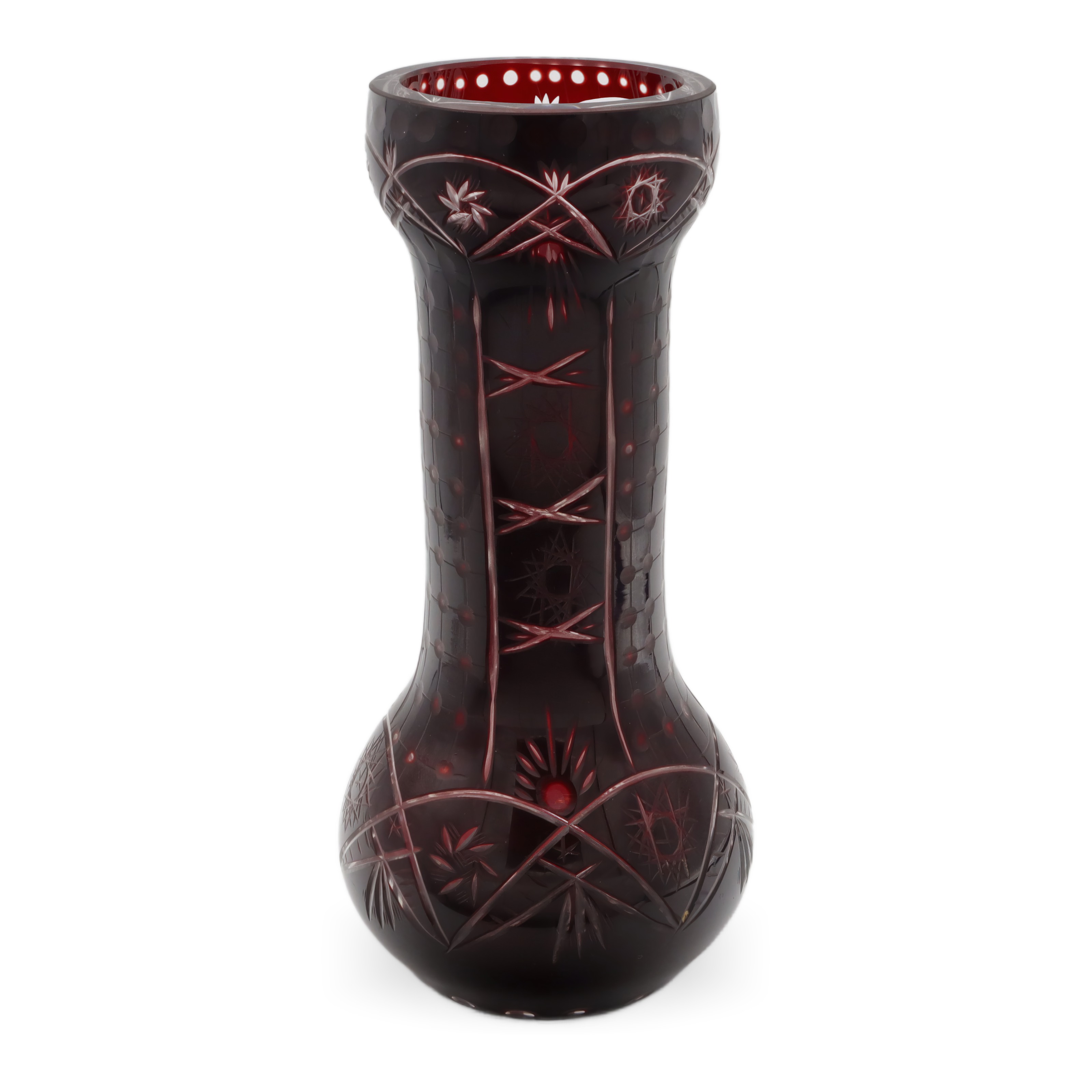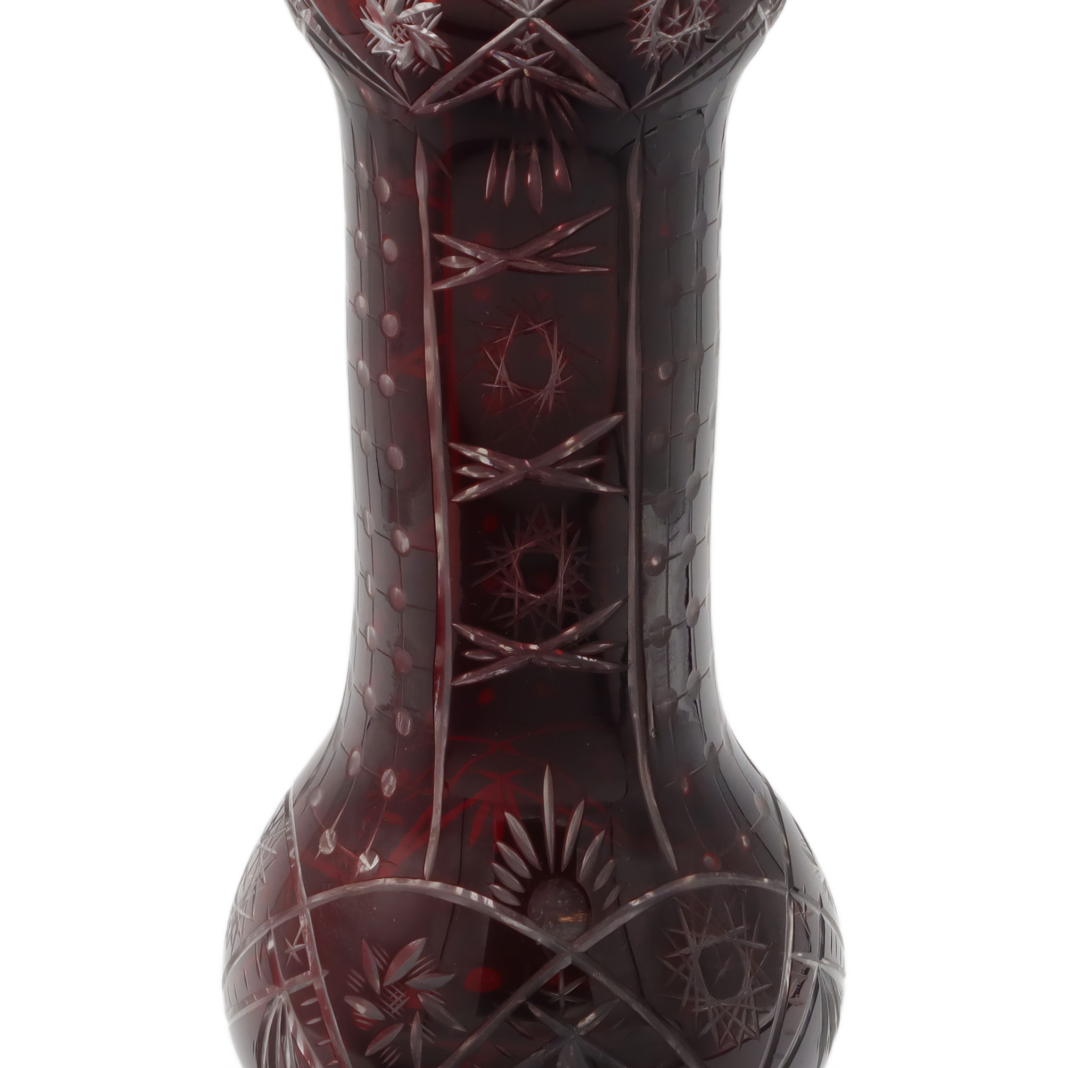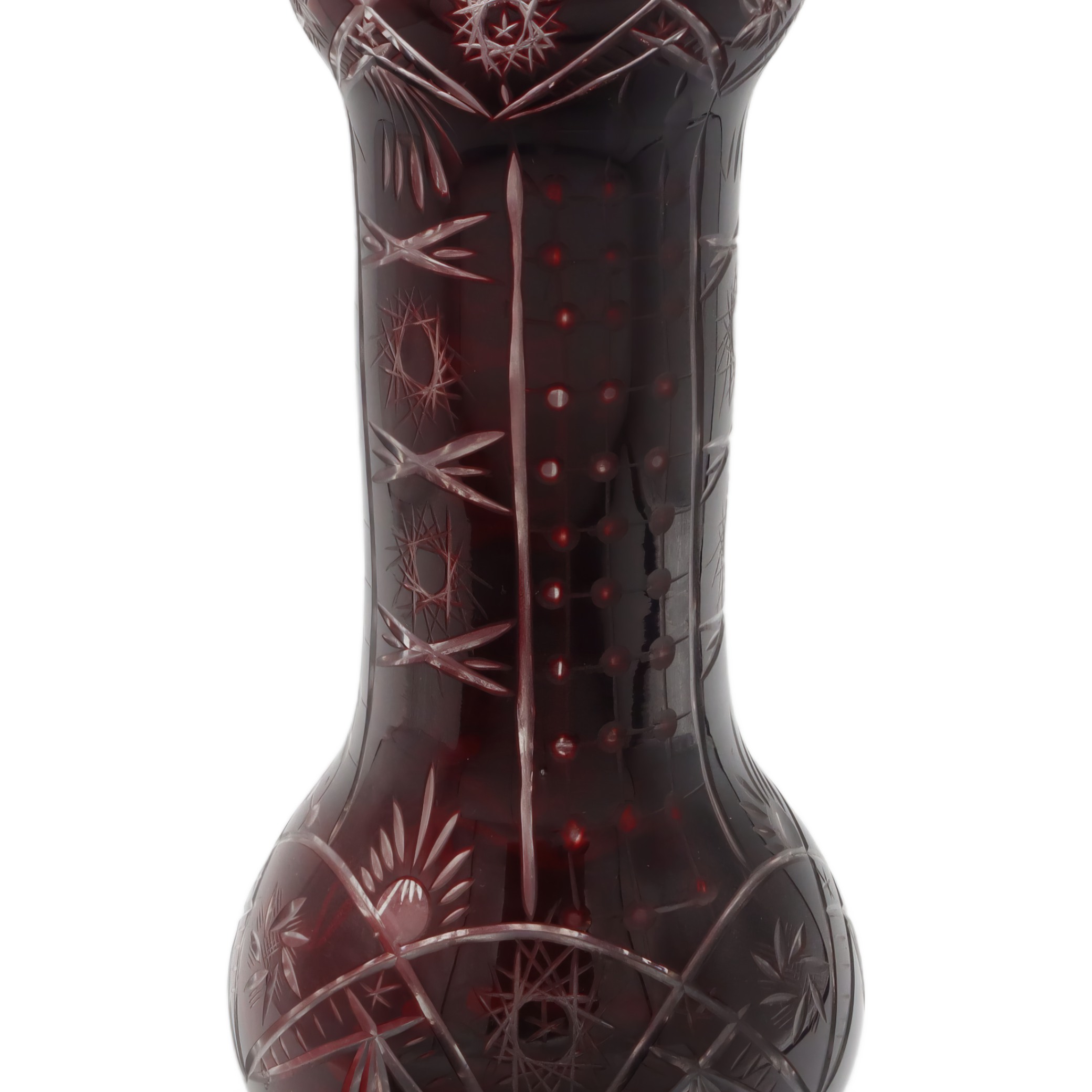 What you’re looking at here is a striking, large Bohemia crystal vase from around 1965. This vase stands out with its rich, ruby-red color and beautiful hand-cut details that glimmer when the light hits them just right. It’s a centerpiece-worthy piece, standing about 10.5 inches tall with just the right amount of width to make a statement without taking over your whole table or mantle. The condition is described as near mint, which means it’s been taken care of and lovingly preserved over the years. There’s a weight to it, too, both physically and in the way it draws your attention. The hand-cut designs aren’t just patterns—they’ve got an almost starburst and crosshatch feel, showing the skill that went into making this vase.