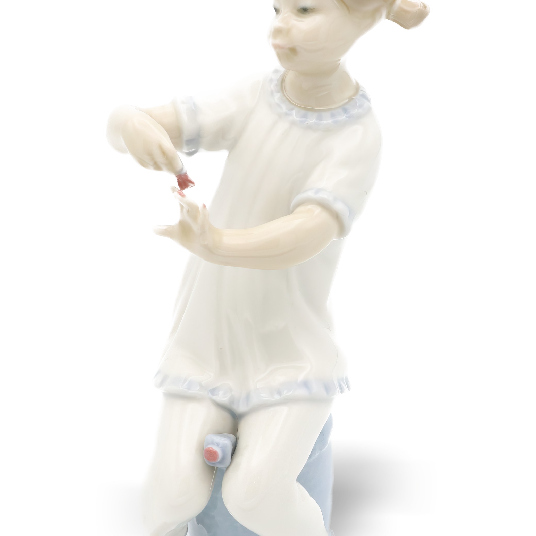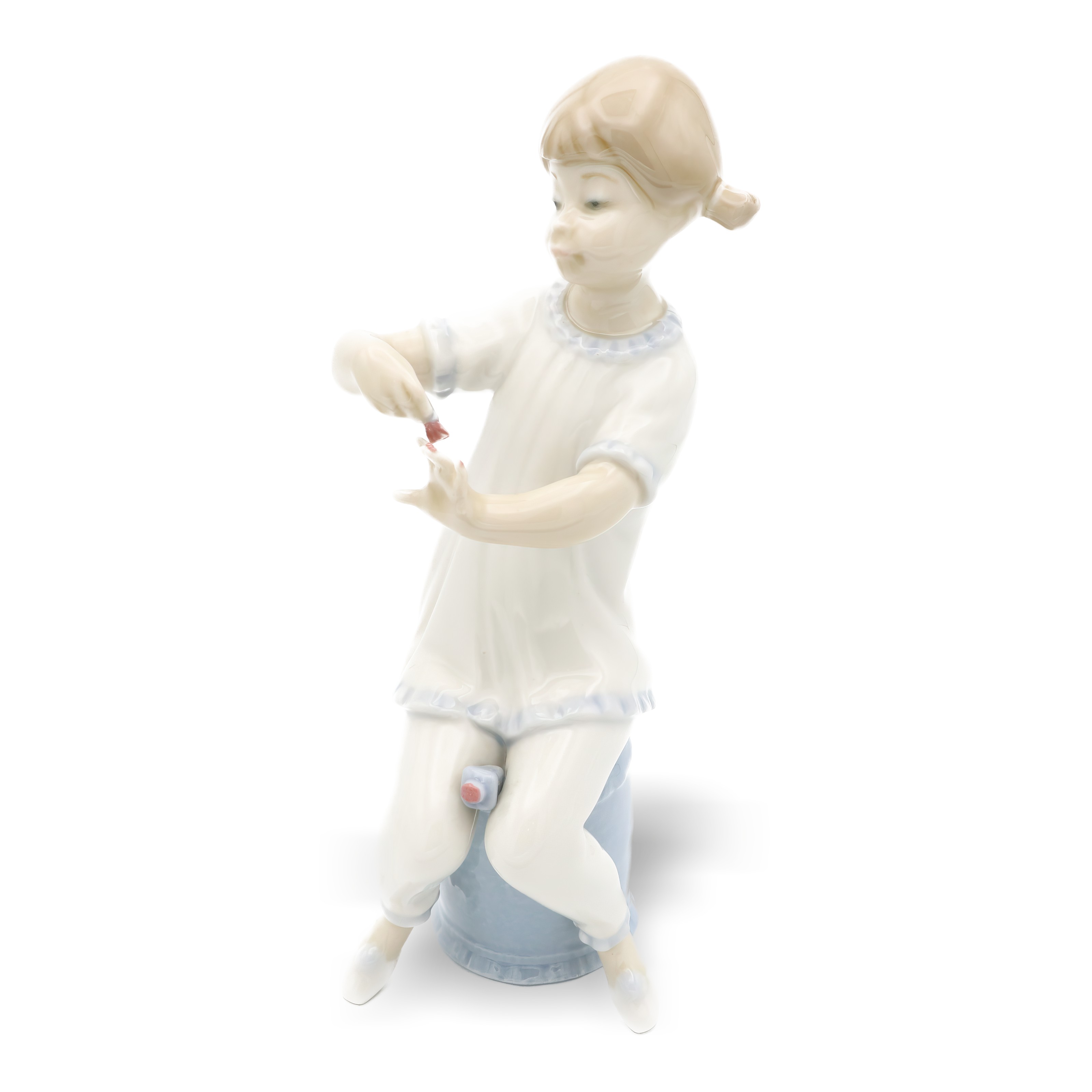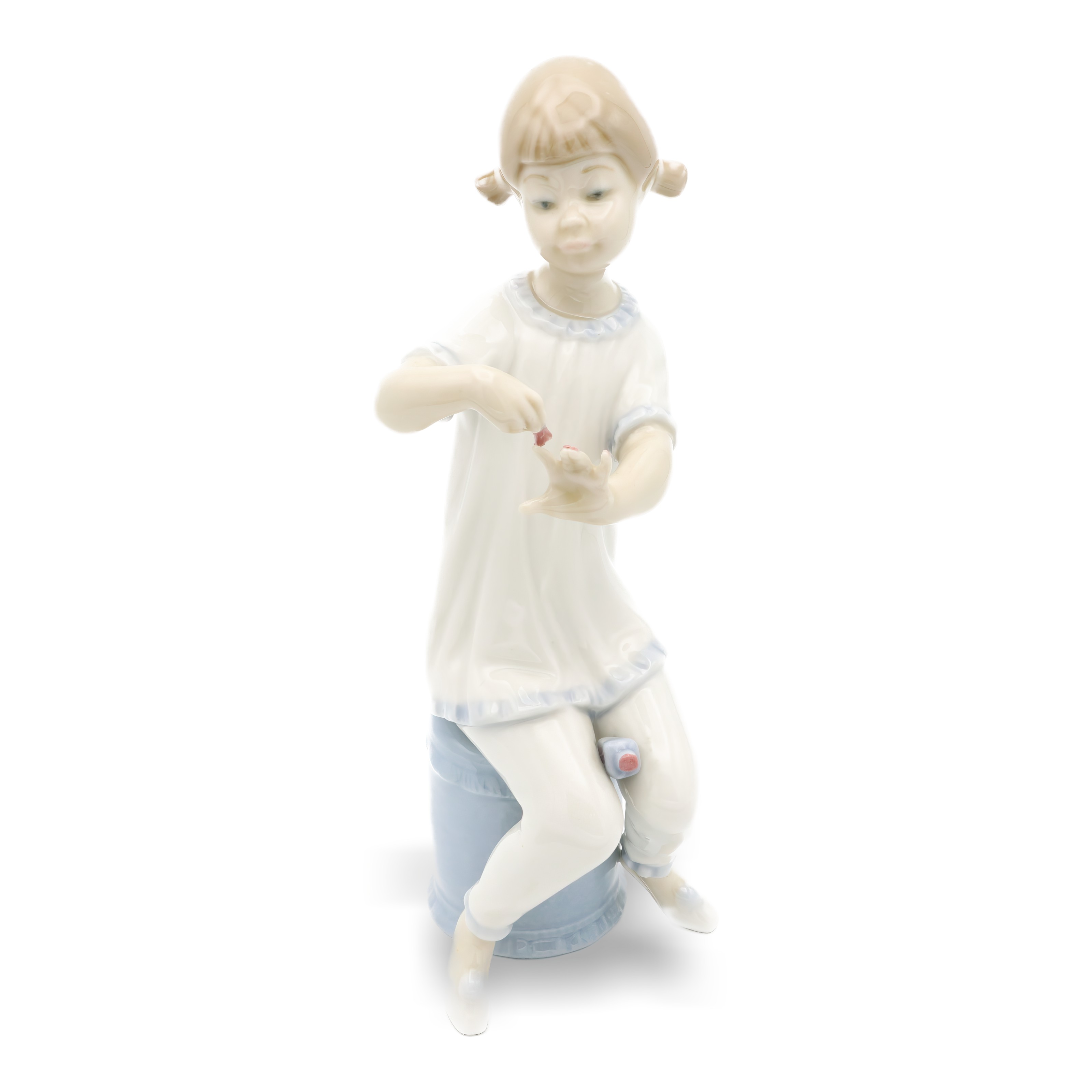 Lladro, the brand behind this exquisite piece, hails from Spain and is renowned for its finely crafted porcelain art. The company was established in 1953 by three brothers, Juan, José and Vicente Lladro, and quickly became a symbol of luxurious and artistic home decor. Lladro figurines often depict scenes from everyday life, romantic themes, and pastoral comforts, reflecting a deep appreciation for detail and artistic expression. The “Girl Painting Nails” is a prime example of these themes, capturing a simple yet relatable moment that echoes across generations.