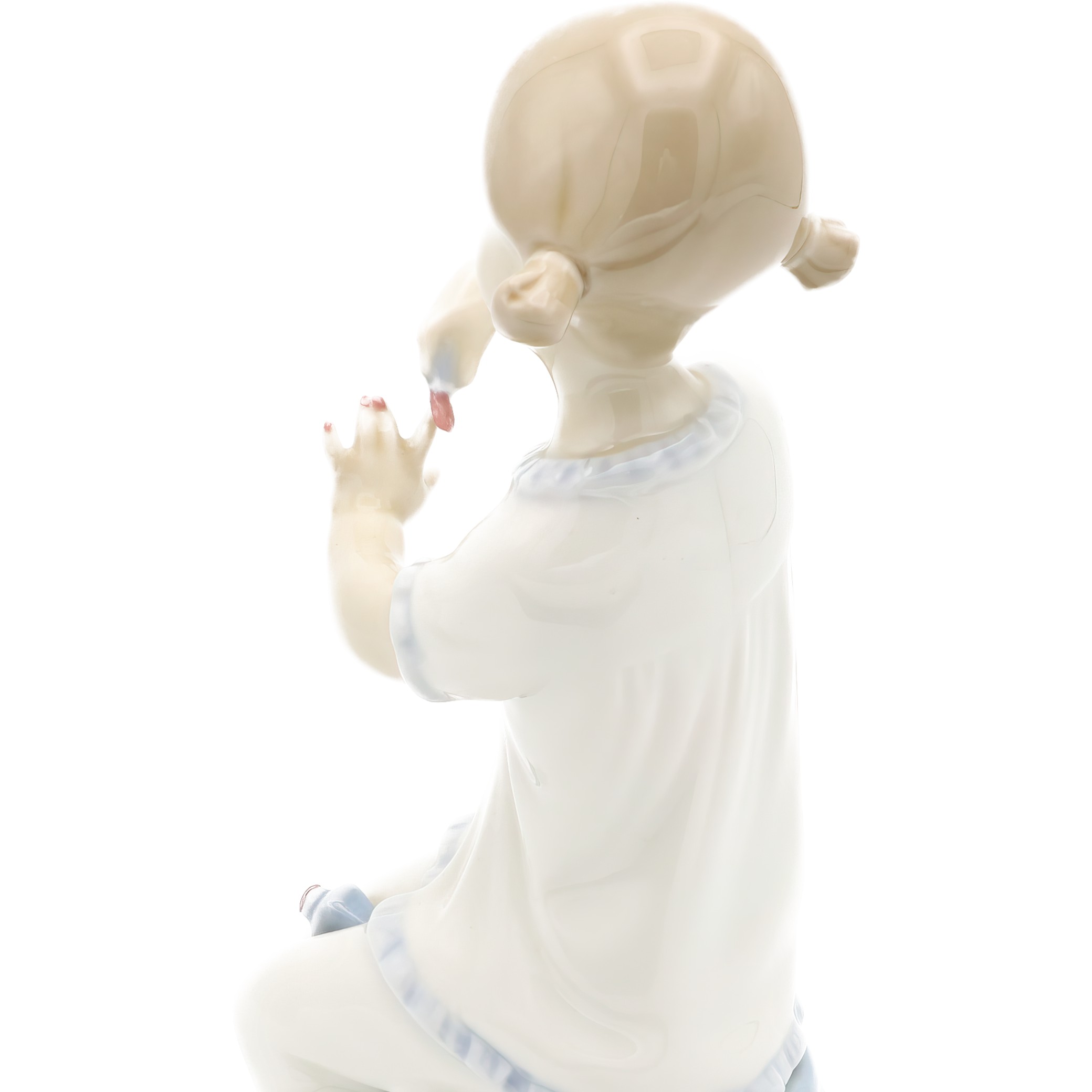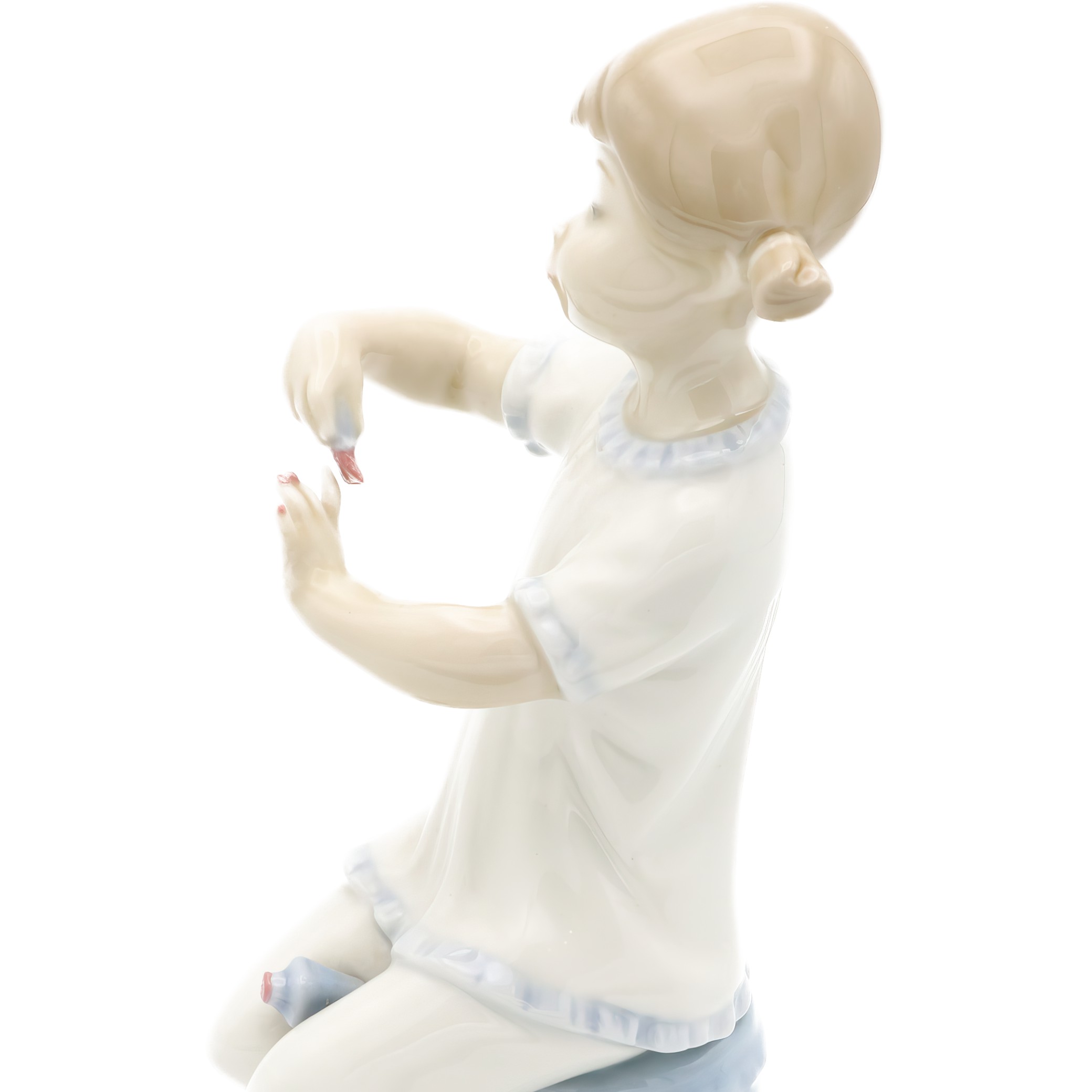 The Lladro figurine you’re looking at here is a charming piece known as the “Girl Painting Nails.” Created in 1978, this collectible porcelain sculpture captures a sweet, everyday moment in time, featuring a young girl carefully painting her nails. Standing at 8 inches tall and measuring 3 inches wide, the figure exudes a sense of innocence and attention to detail. In near mint condition, this figurine shines as a relic of the past, offering both nostalgic value and aesthetic appeal. The subtle pastel colors and smooth, glossy finish elevate its elegance, suggesting a meticulous crafting process typical of high-quality porcelain art from this era. Its vintage status, having been retired from production, increases its rarity, making it a sought-after item for collectors and fans of Lladro figurines.