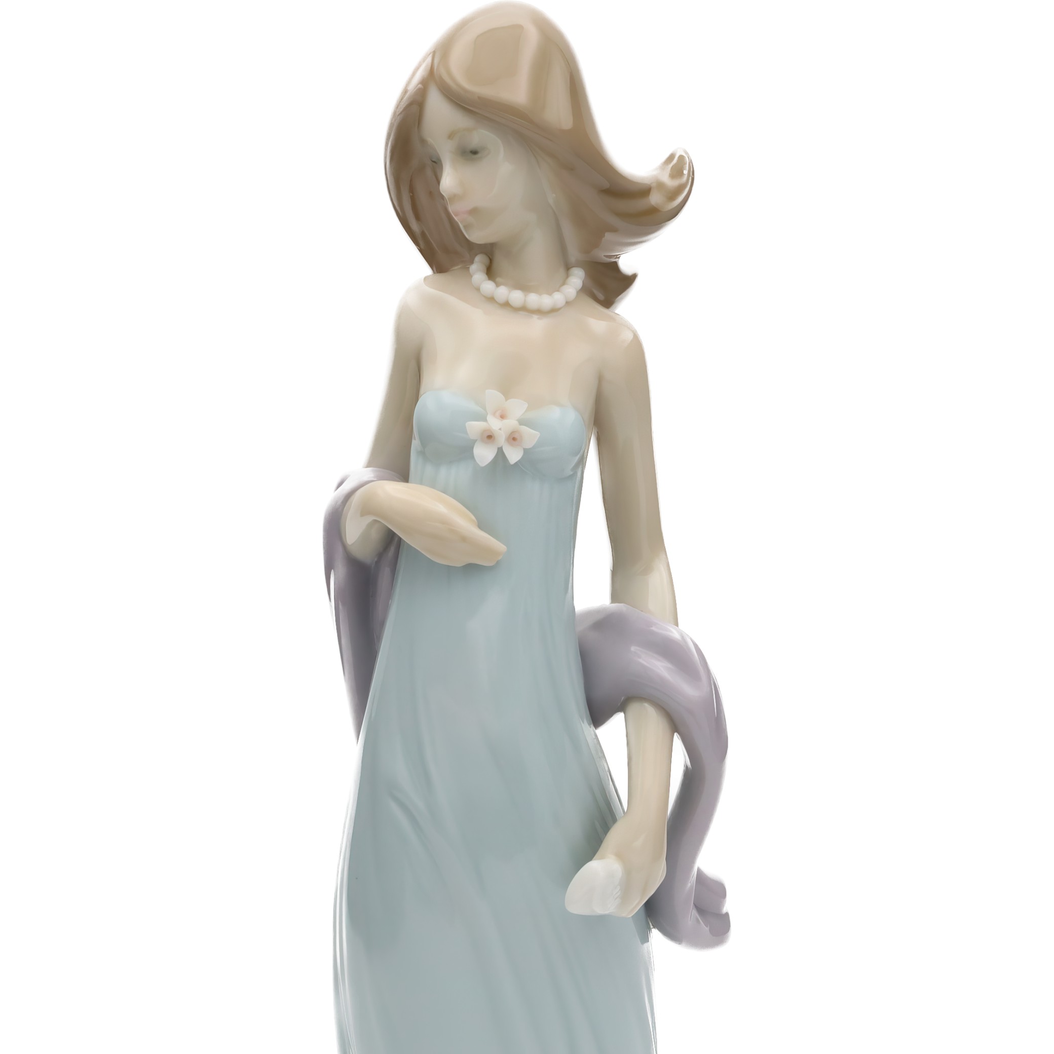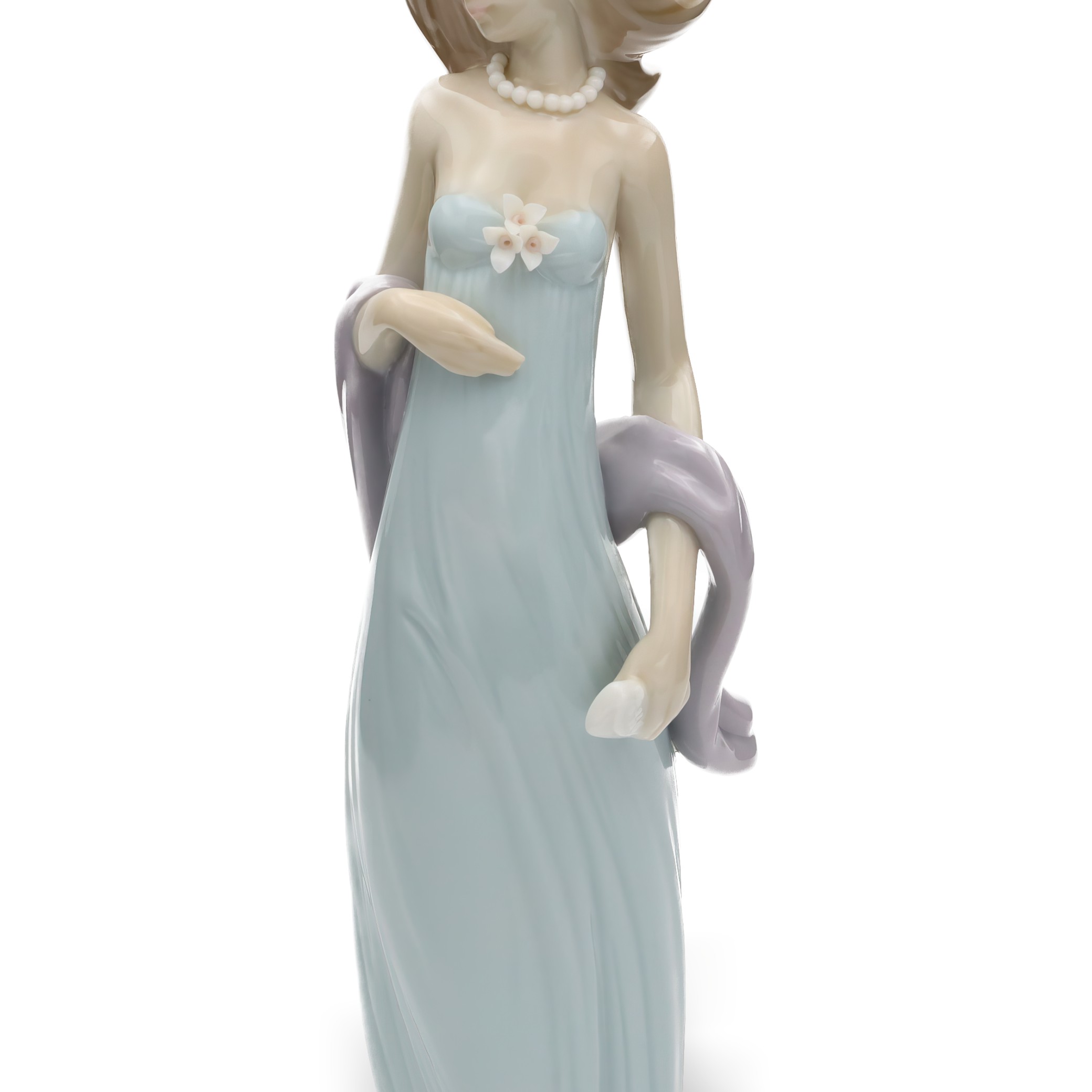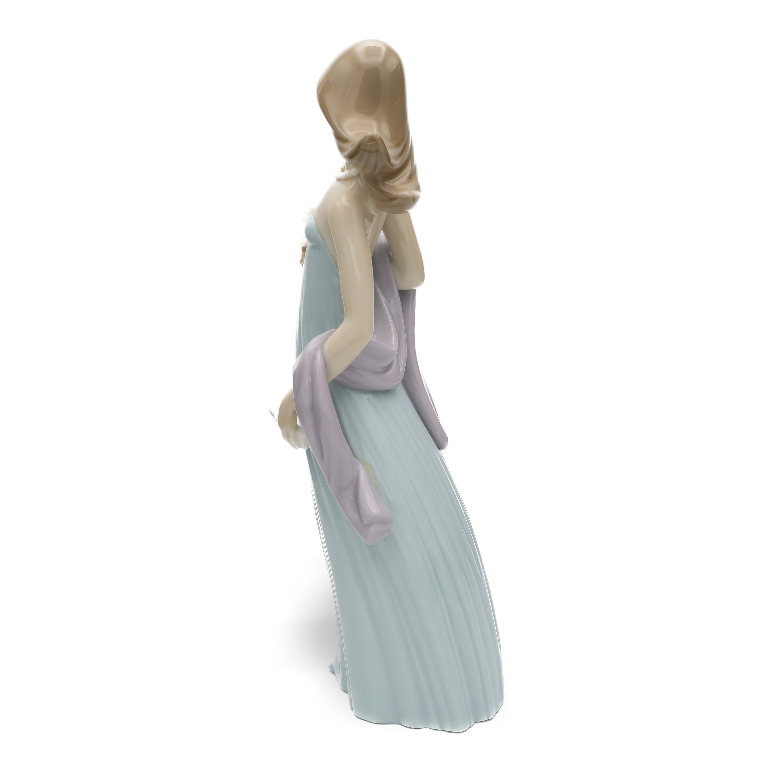 This elegant porcelain figurine from 1987 is a beautiful example of Lladro’s craftsmanship, depicting an ingenue woman in a graceful Art Deco style. Standing at 8.5 inches tall, it showcases the delicate…