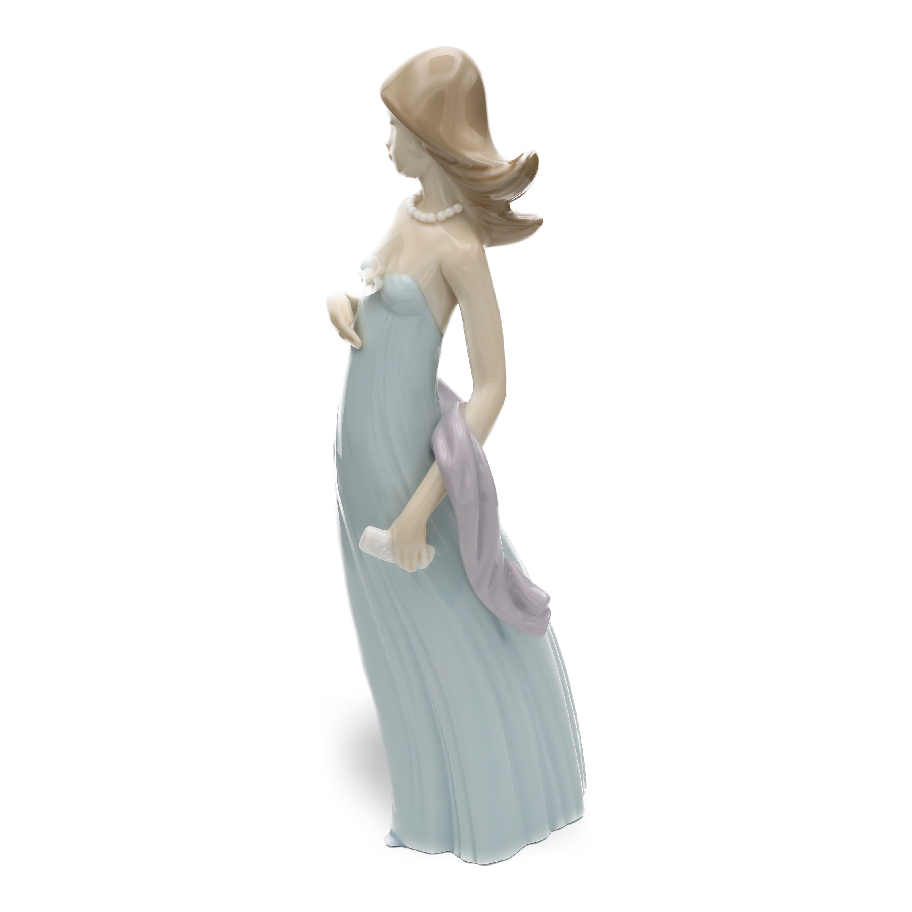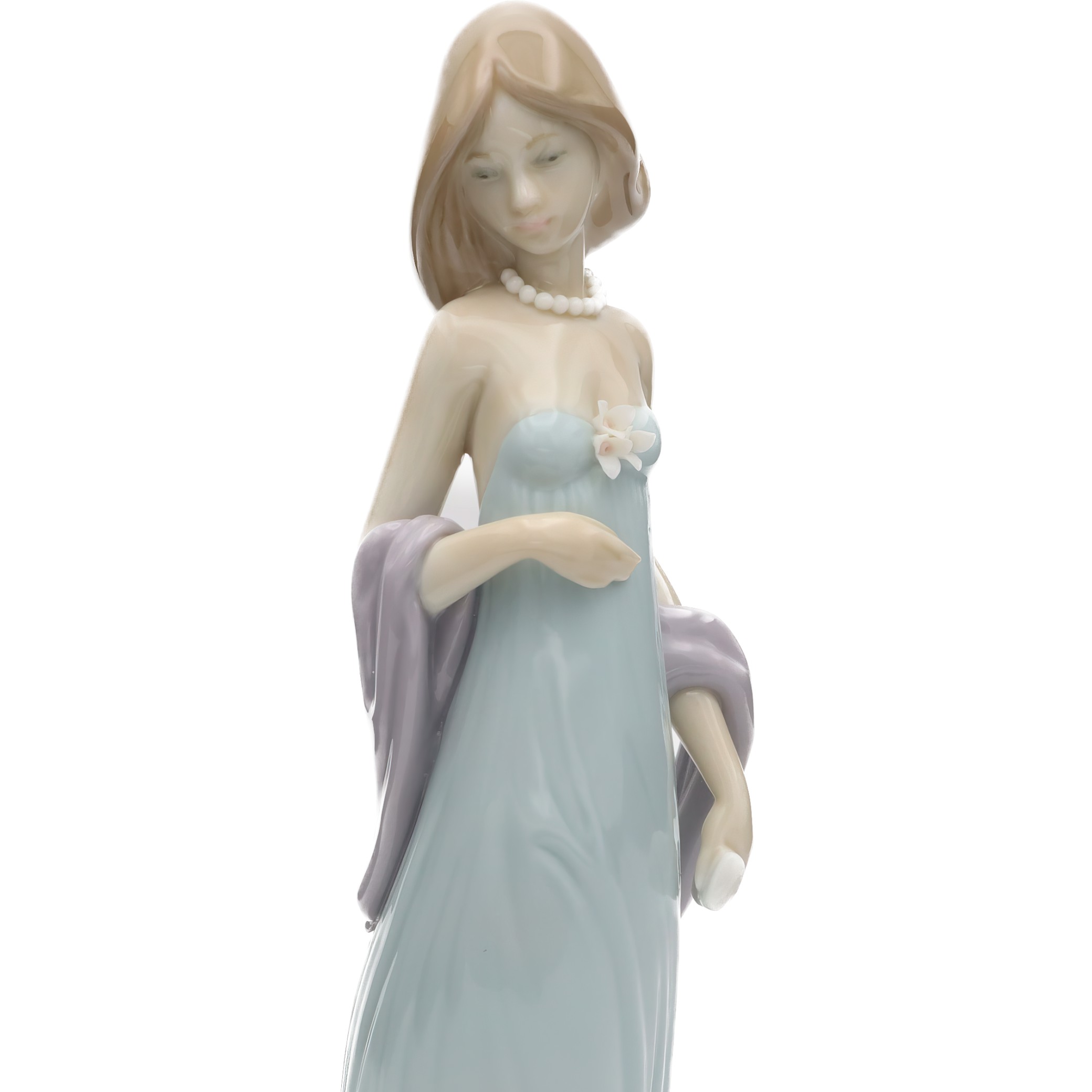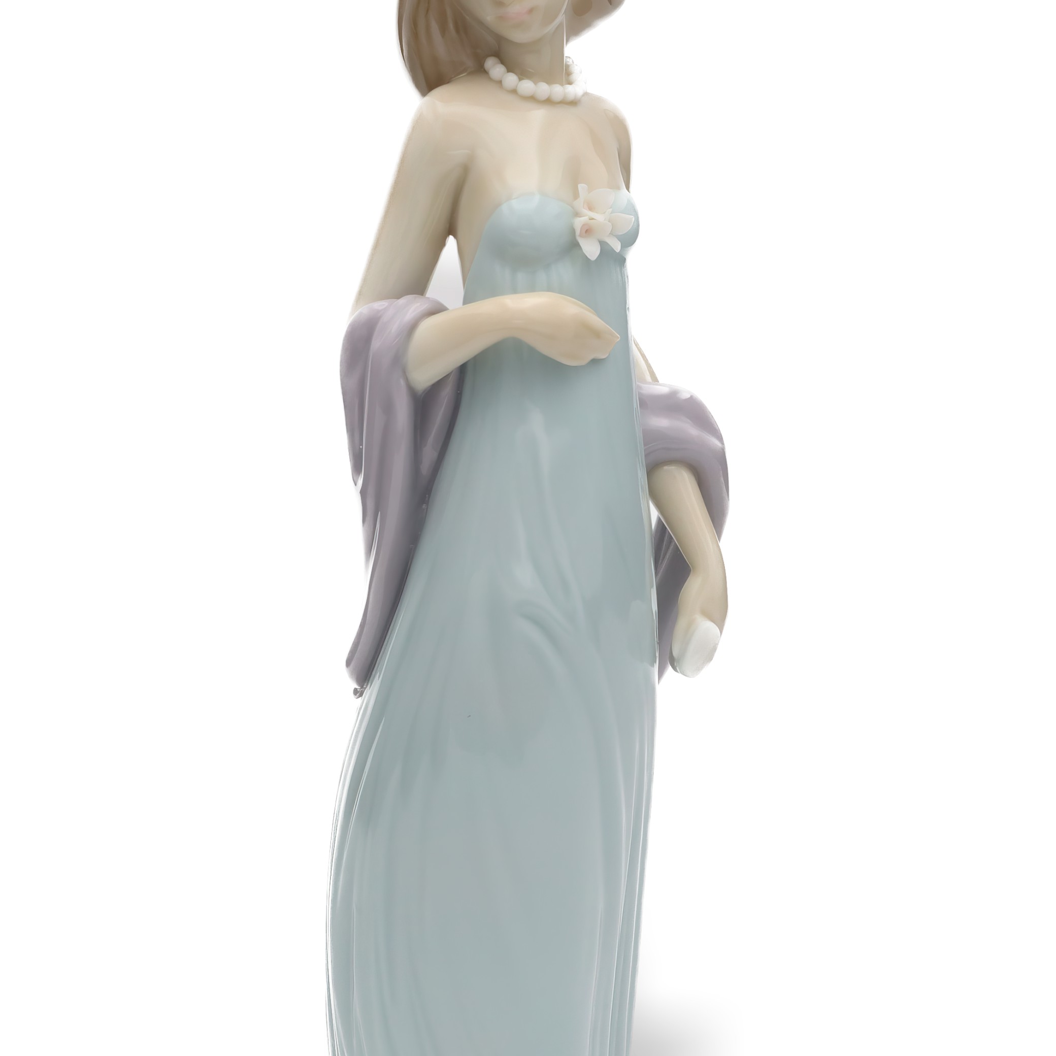 This elegant porcelain figurine from 1987 is a beautiful example of Lladro’s craftsmanship, depicting an ingenue woman in a graceful Art Deco style. Standing at 8.5 inches tall, it showcases the delicate…