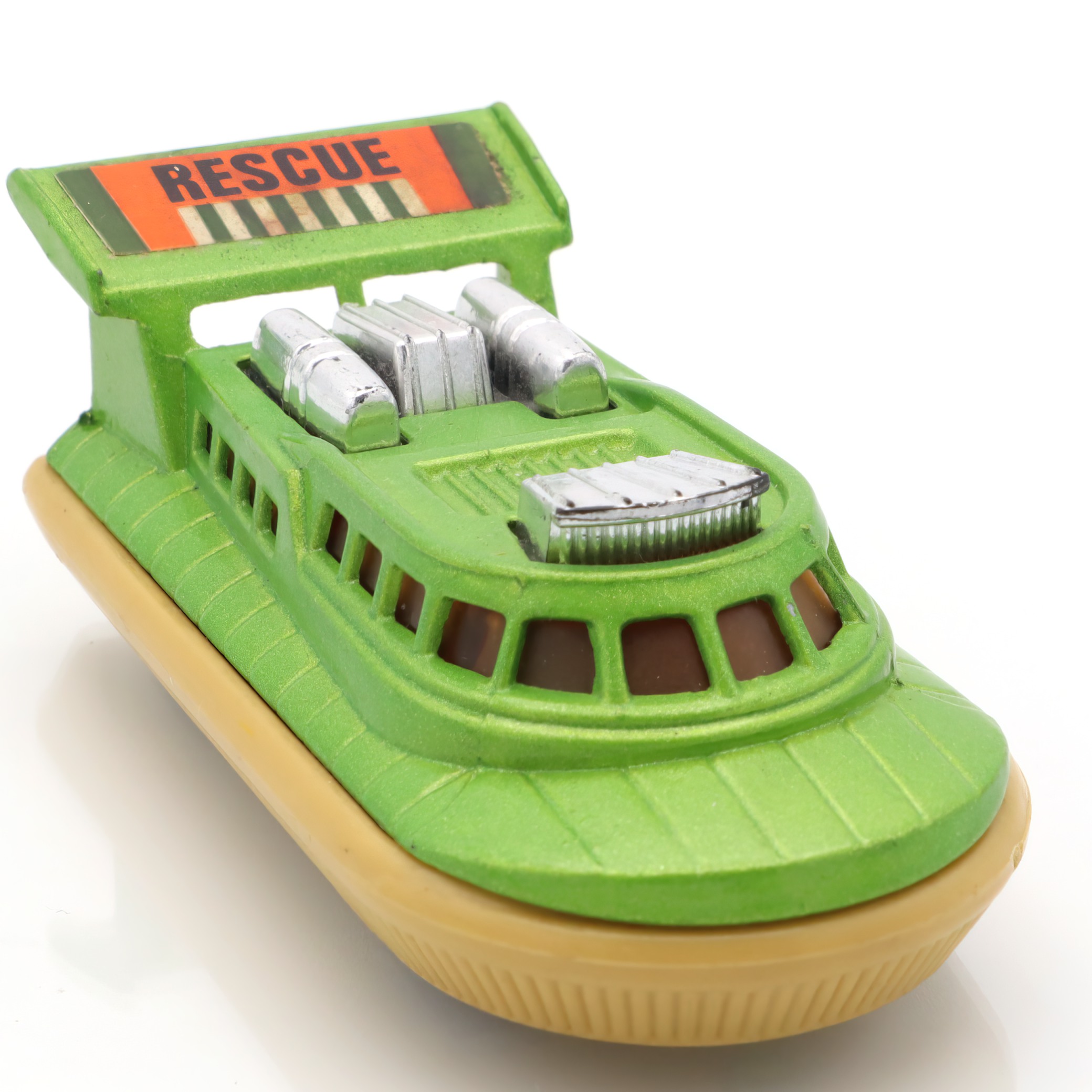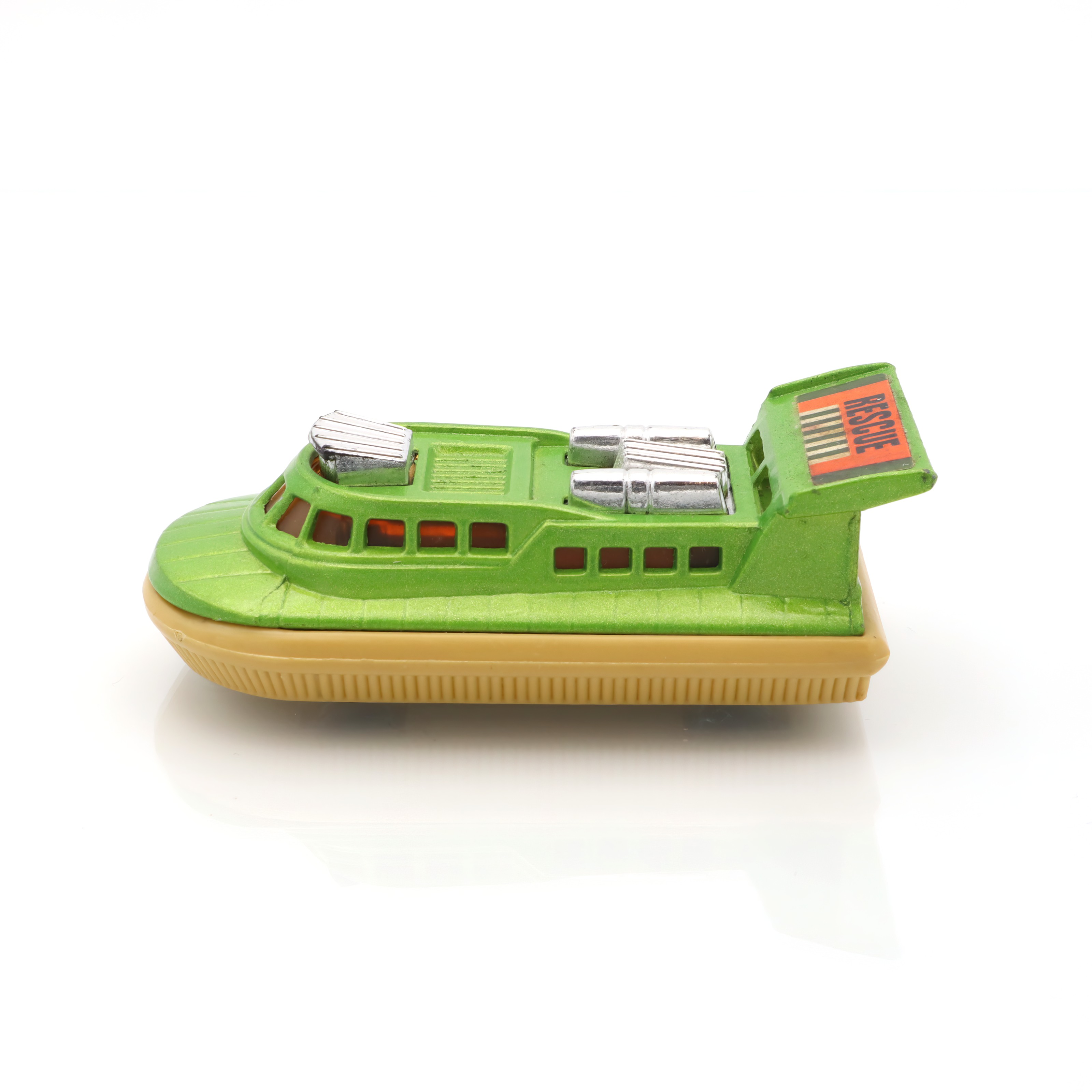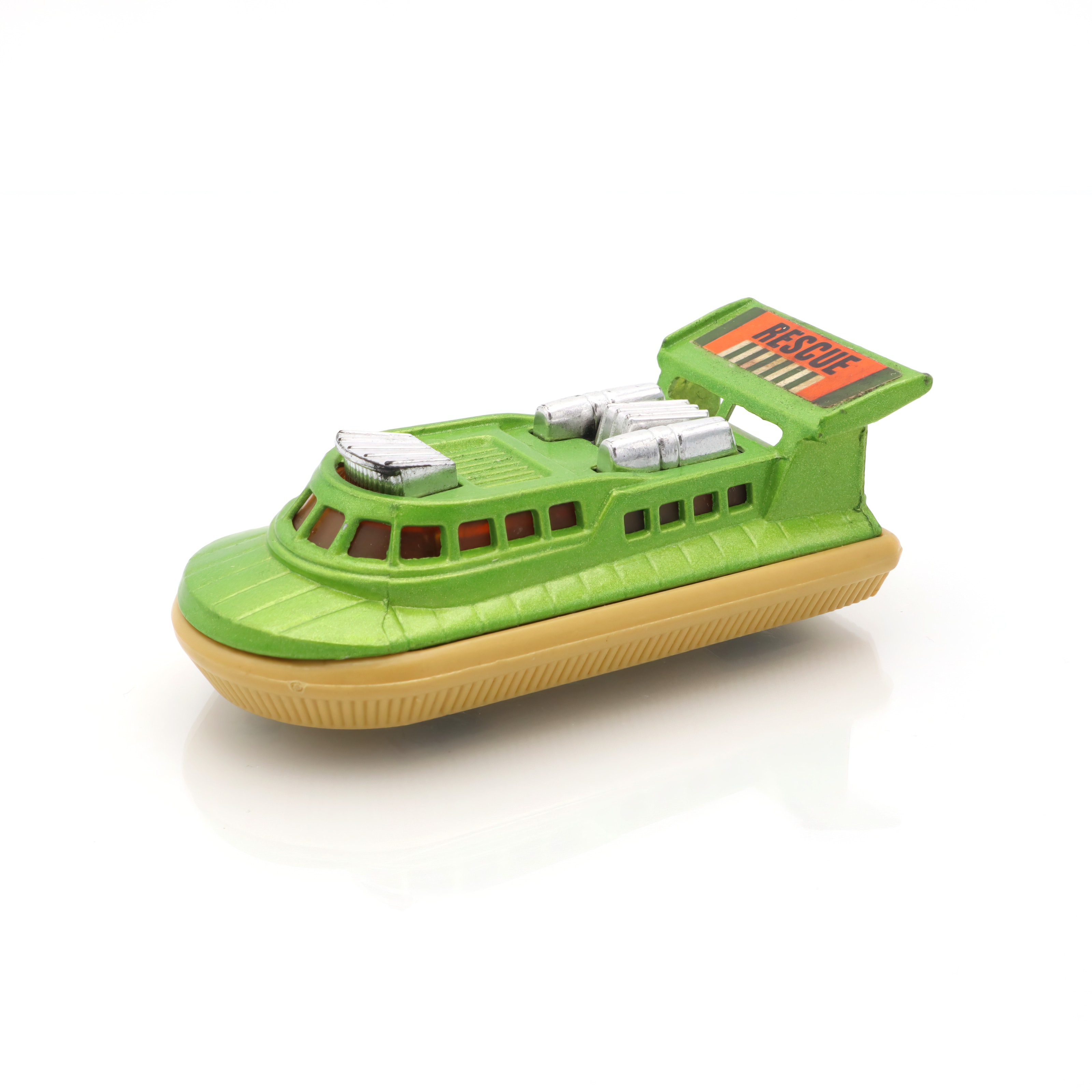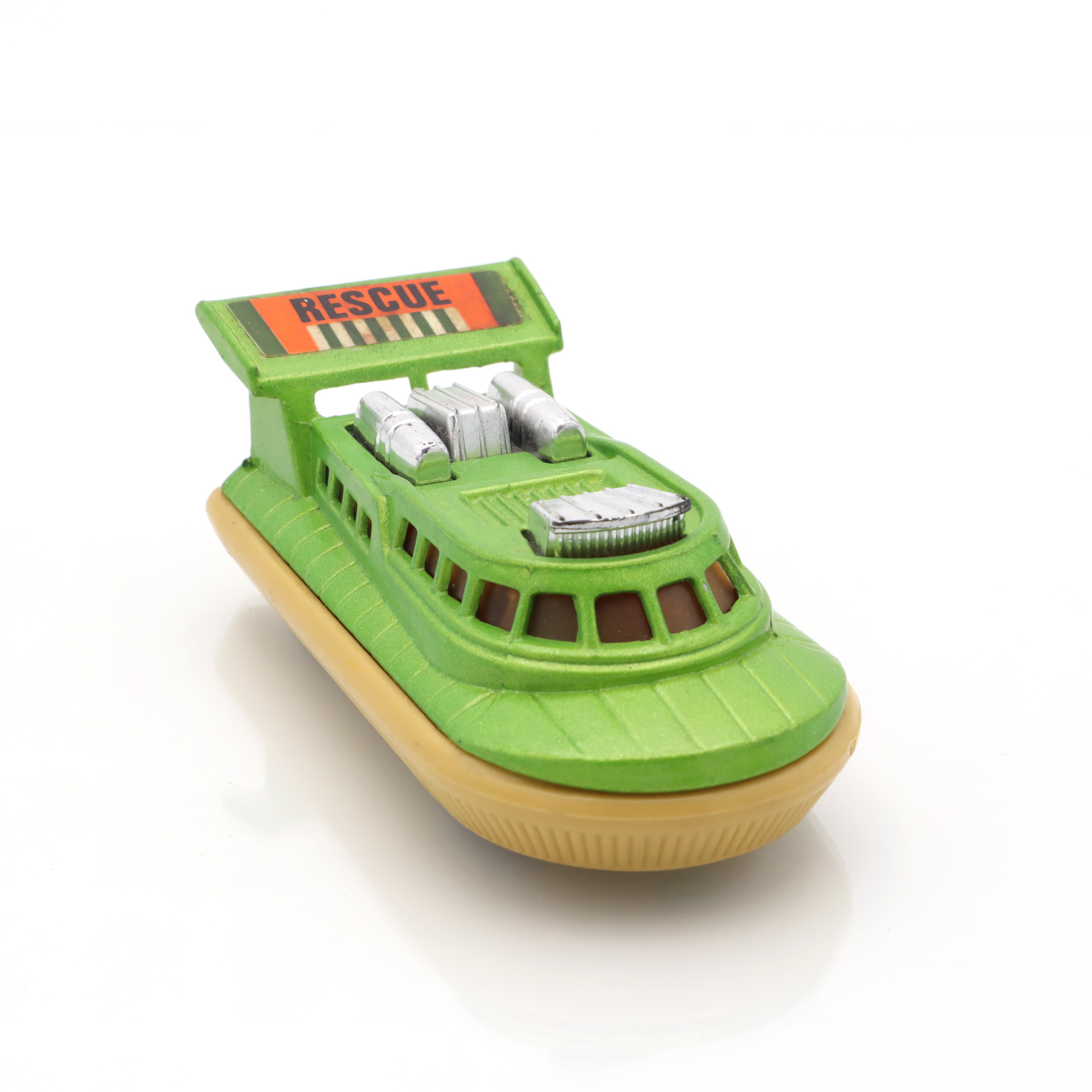 Matchbox is a brand that holds a special place in the world of toy vehicles. It was established in 1953 and quickly became a favorite among kids and collectors thanks to its affordable and intricately detailed diecast models. The Superfast series, introduced in the late 1960s, marked a significant evolution for the brand. These toys were equipped with low-friction wheels for quicker movement, catering to the growing demand for fast-paced play. The Rescue Hovercraft, part of this series, is a reflection of that innovative spirit and creativity. Range of interesting themes in the Matchbox line, from rescue operations to construction sites, provided countless hours of imaginative fun. Today, these toys are treasured for their nostalgic value, capturing a charming slice of mid-century play culture. Their rarity increases with age, and excellent-condition pieces like this hovercraft are particularly prized by collectors.
