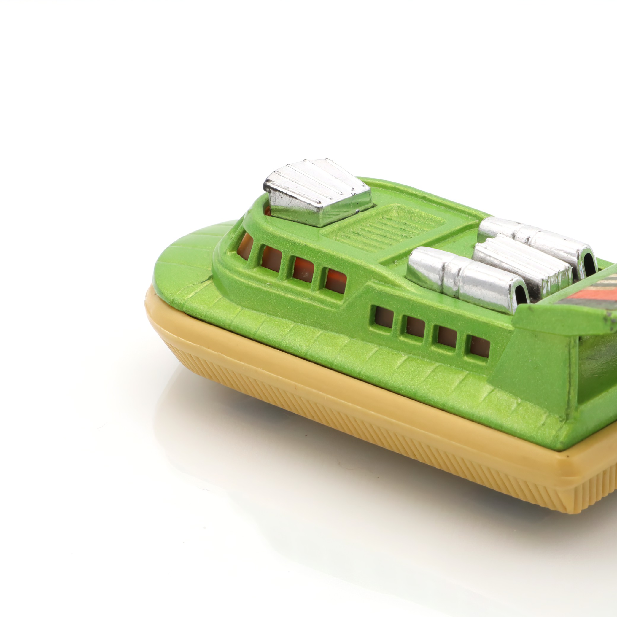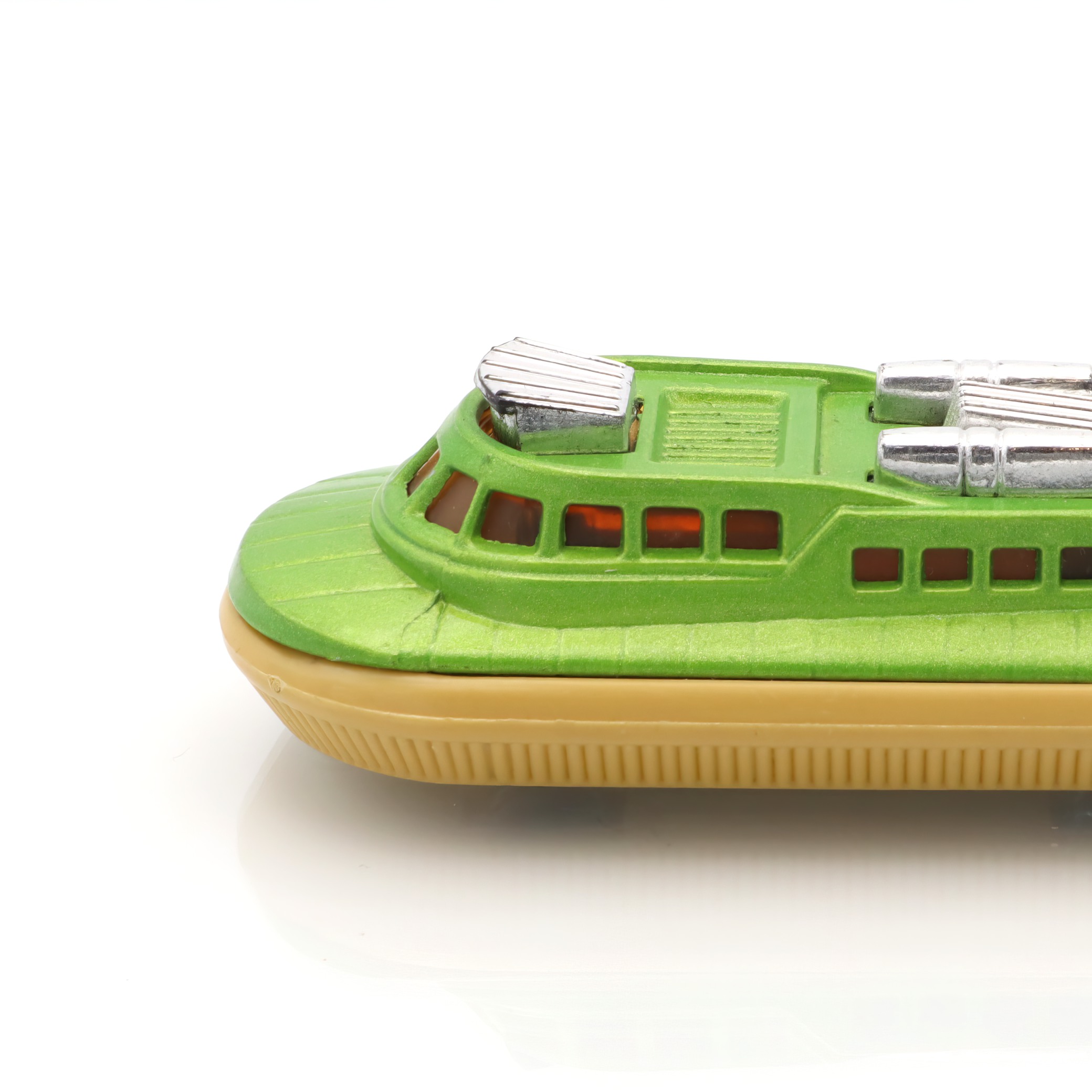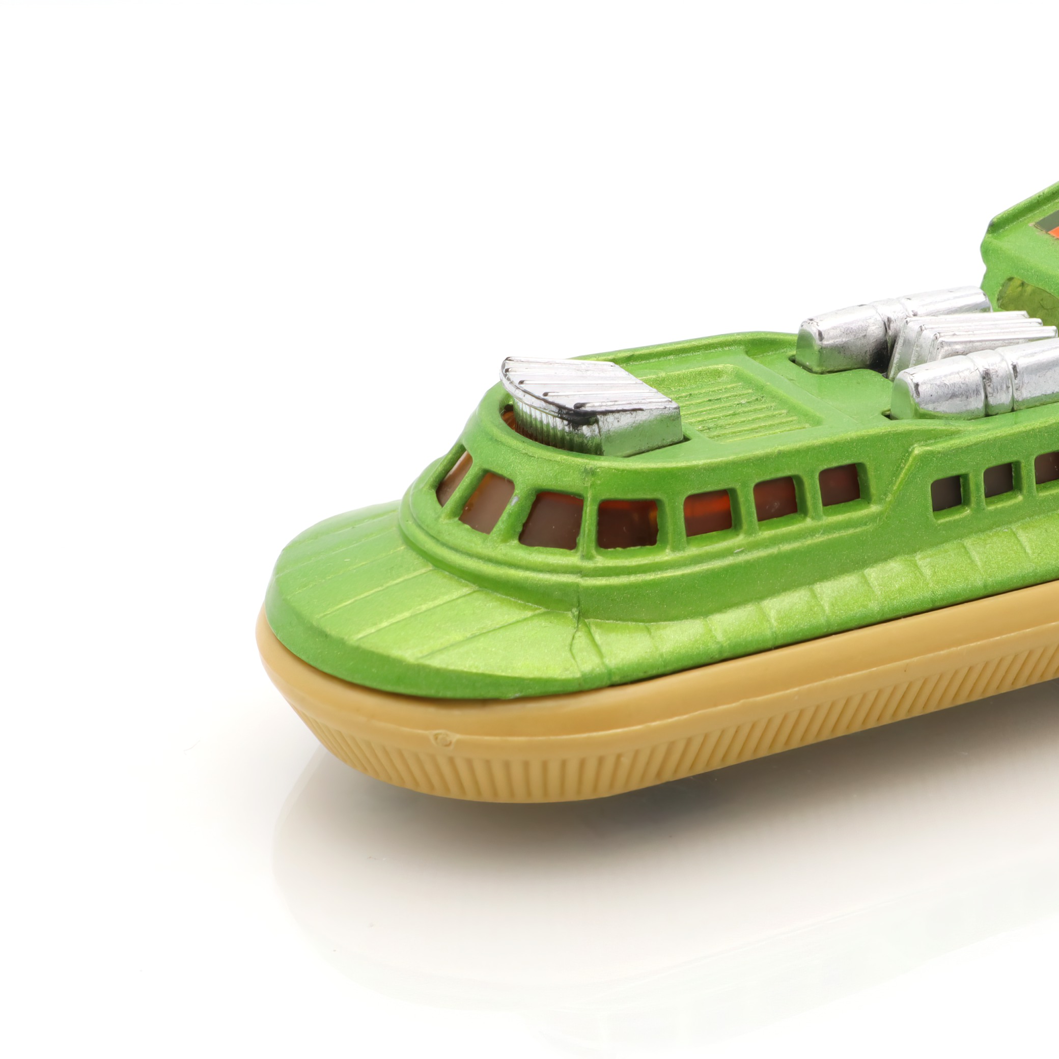This is a Matchbox Superfast 2 Rescue Hovercraft, a delightful piece of nostalgia for toy enthusiasts and collectors alike. This diecast hovercraft toy hails from the 1970s, making it over 50 years old. Despite its age, it’s in near mint condition, showcasing the durability and quality of toys from that era. Its vibrant green color and distinct design features like the “RESCUE” label on the rear spoiler make it a standout. Perfect for those who appreciate vintage collectibles, this hovercraft embodies the playful charm and imaginative spirit that Matchbox toys are known for.