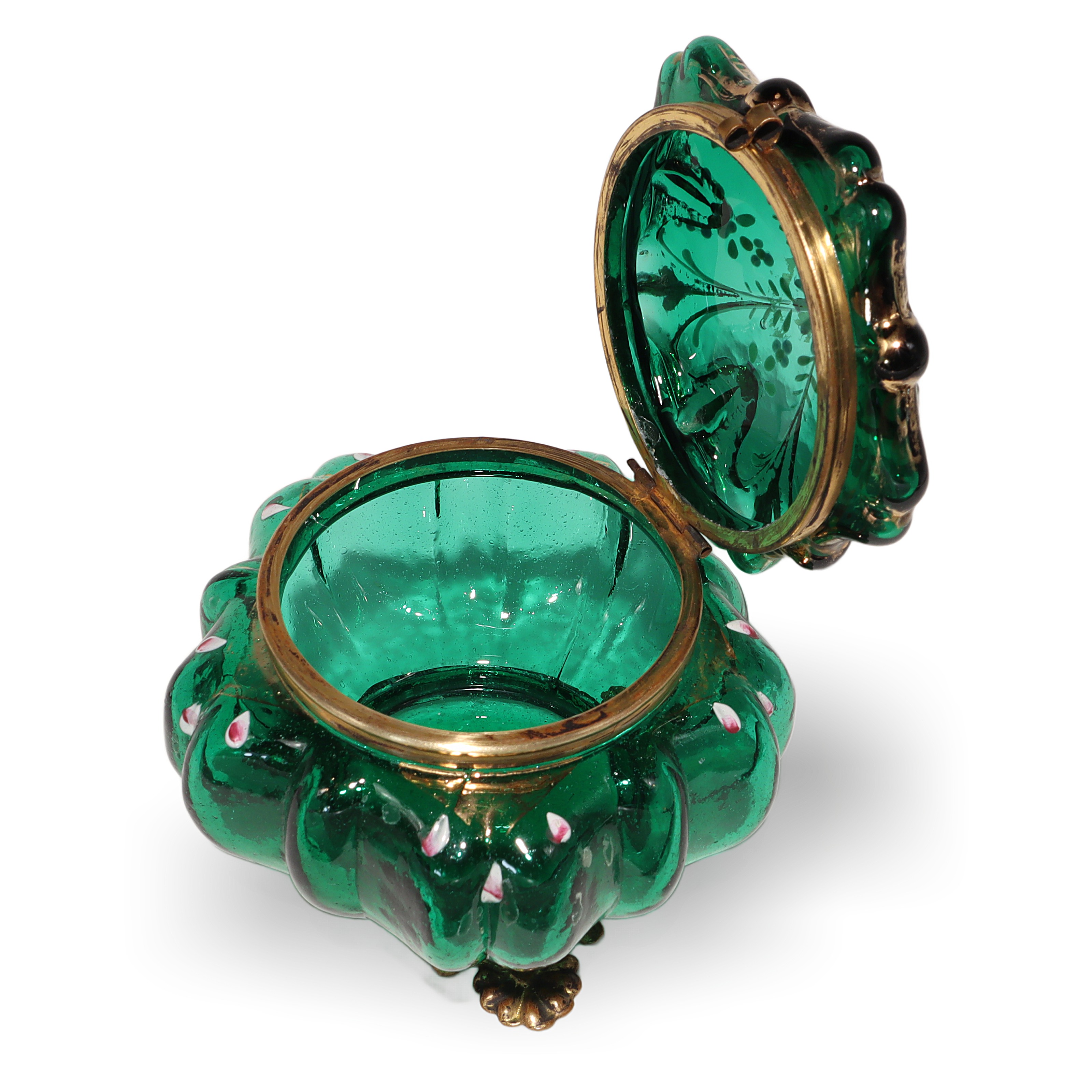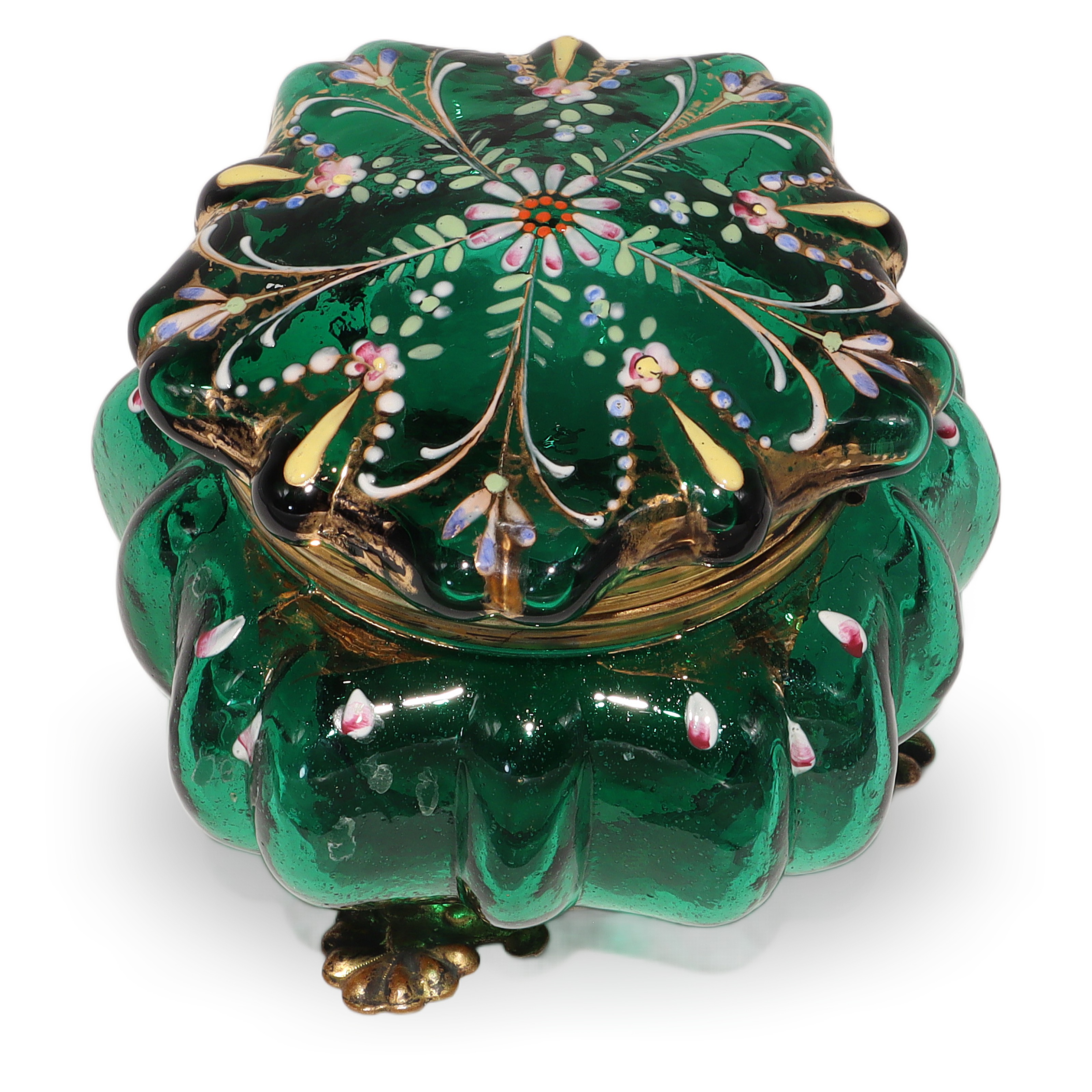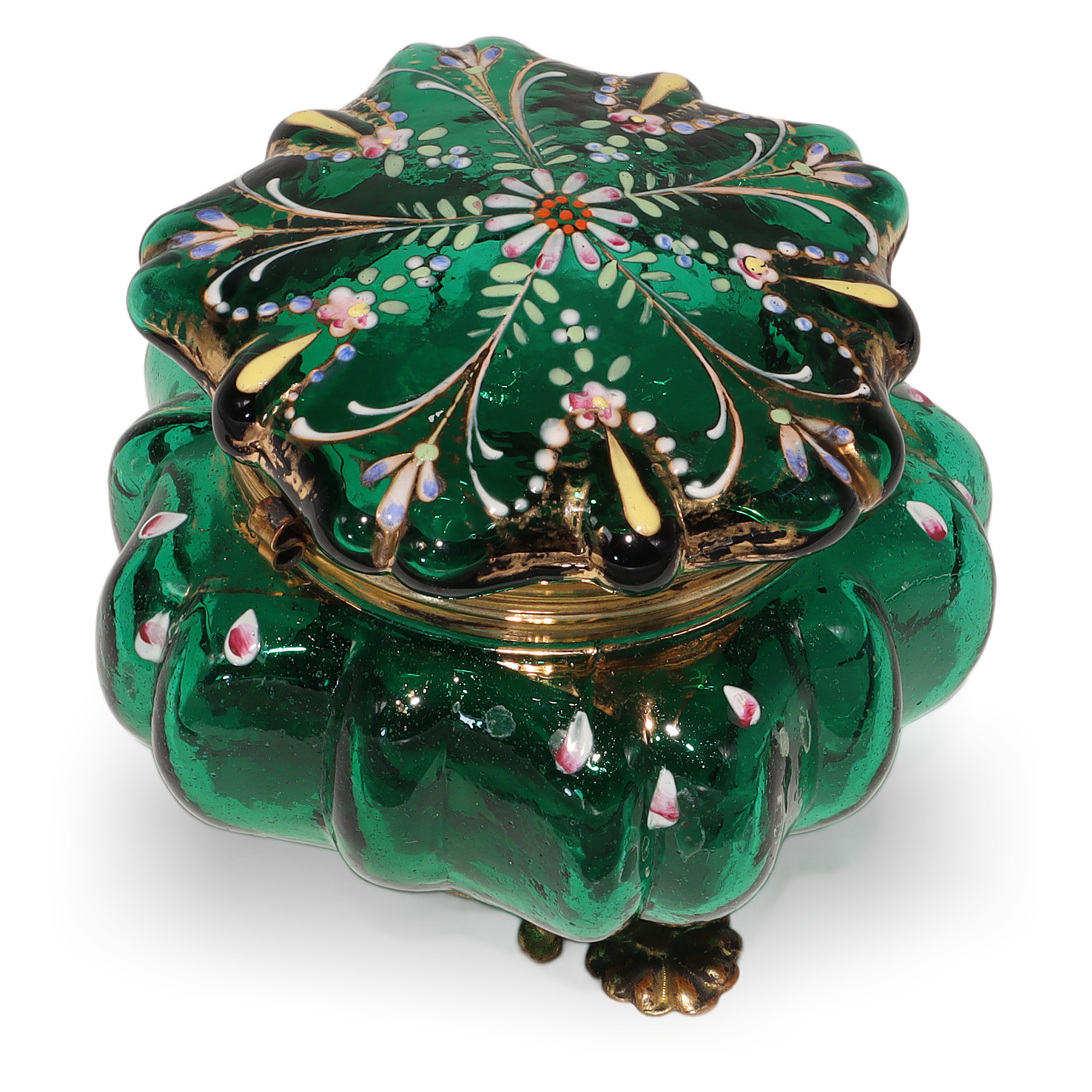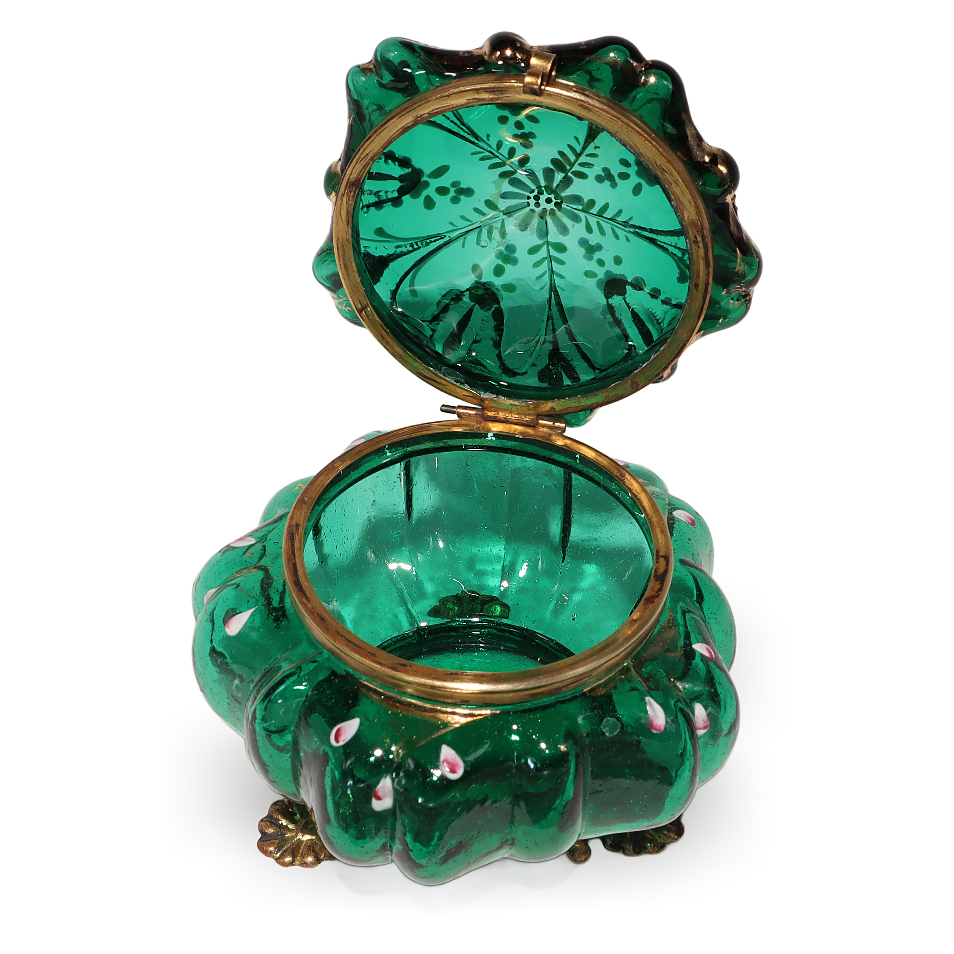 This beautiful little item is a Moser Glass Victorian enamel box, dating all the way back to the 1840s. The trinket casket is handcrafted from deep emerald green glass, brought to life with delicate hand-painted enamel flowers and gold accents. Standing at about three and a half inches tall and four inches wide, it’s a charming size for treasures like jewelry or tiny keepsakes. The brass fittings and ornate little feet give it a touch of elegance, but it’s also sturdy and practical. Holding this in your hand, you can feel the weight of history—it’s nearly 200 years old! There aren’t many pieces like this left in such near mint condition, making it genuinely rare and a standout for anyone who enjoys antiques.