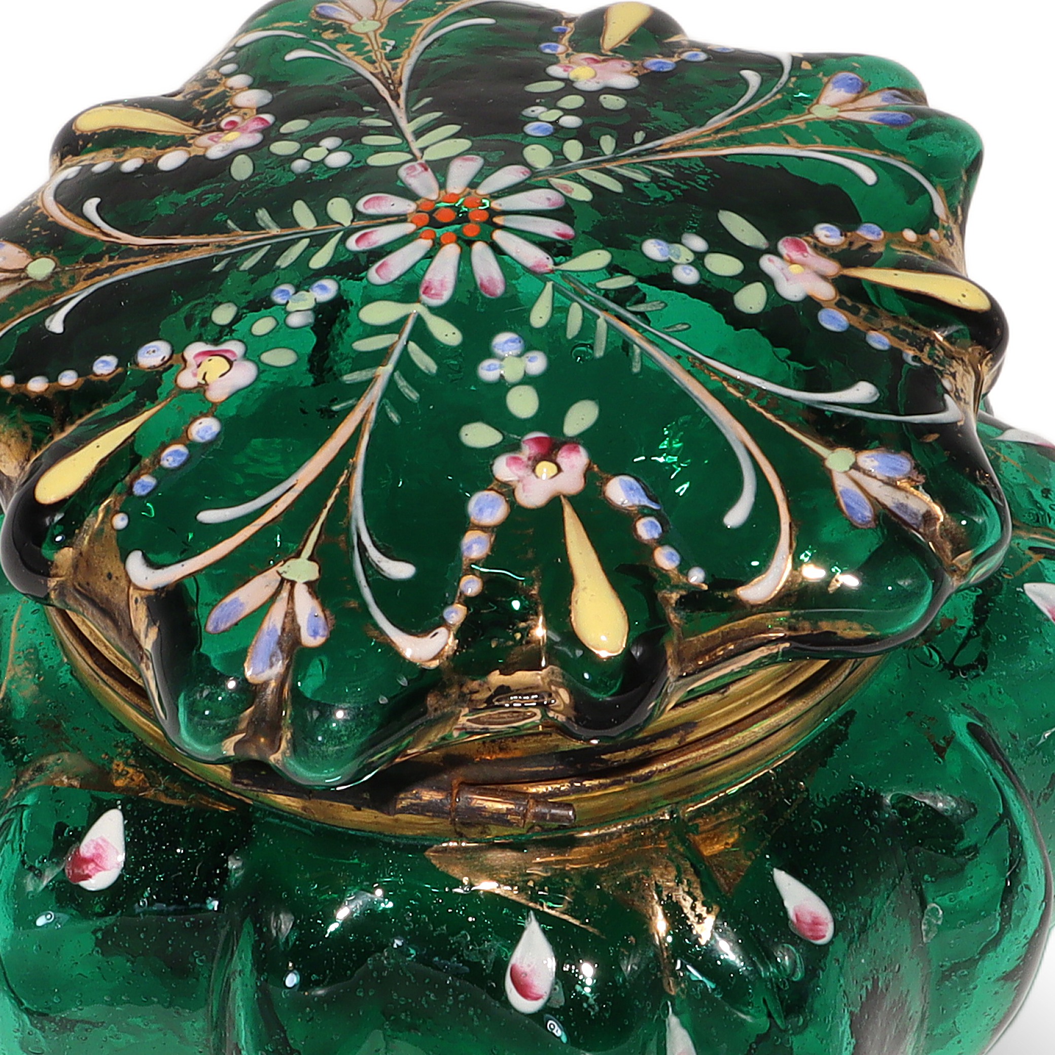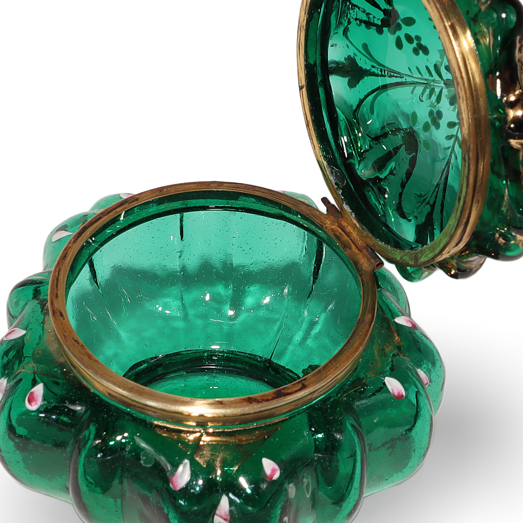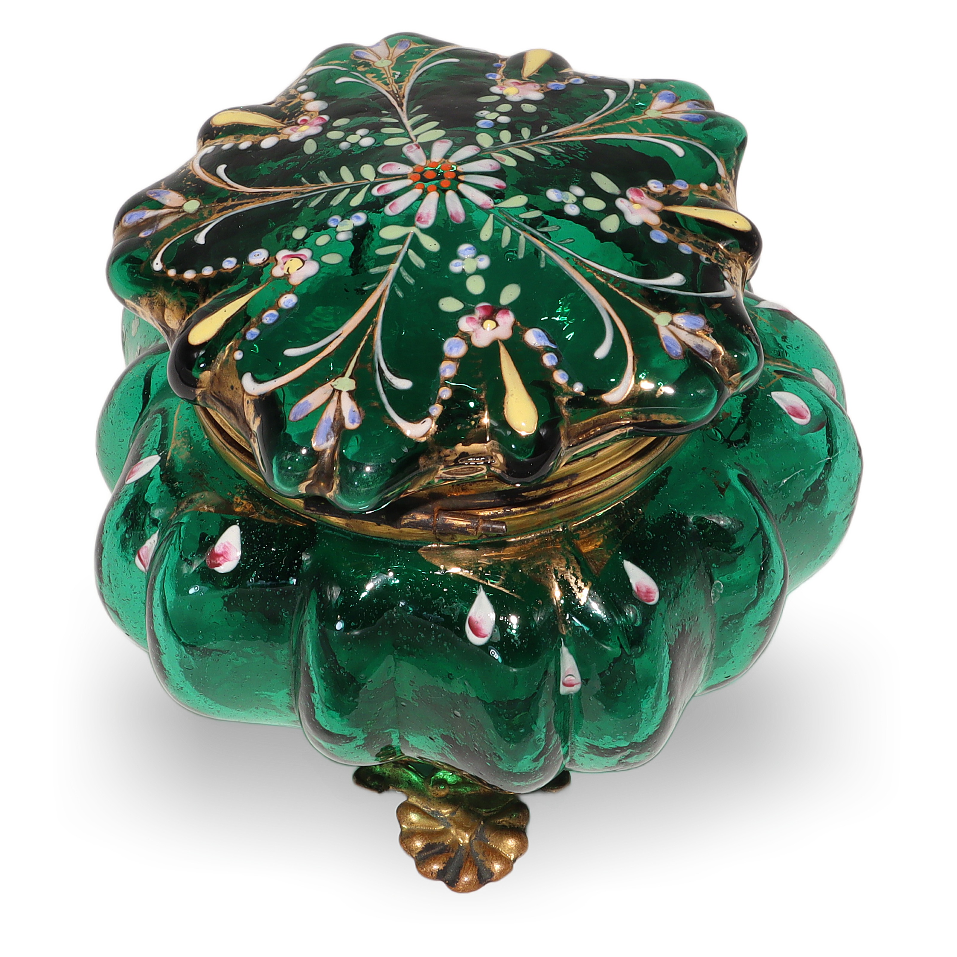 This beautiful little item is a Moser Glass Victorian enamel box, dating all the way back to the 1840s. The trinket casket is handcrafted from deep emerald green glass, brought to life with delicate hand-painted enamel flowers and gold accents. Standing at about three and a half inches tall and four inches wide, it’s a charming size for treasures like jewelry or tiny keepsakes. The brass fittings and ornate little feet give it a touch of elegance, but it’s also sturdy and practical. Holding this in your hand, you can feel the weight of history—it’s nearly 200 years old! There aren’t many pieces like this left in such near mint condition, making it genuinely rare and a standout for anyone who enjoys antiques.