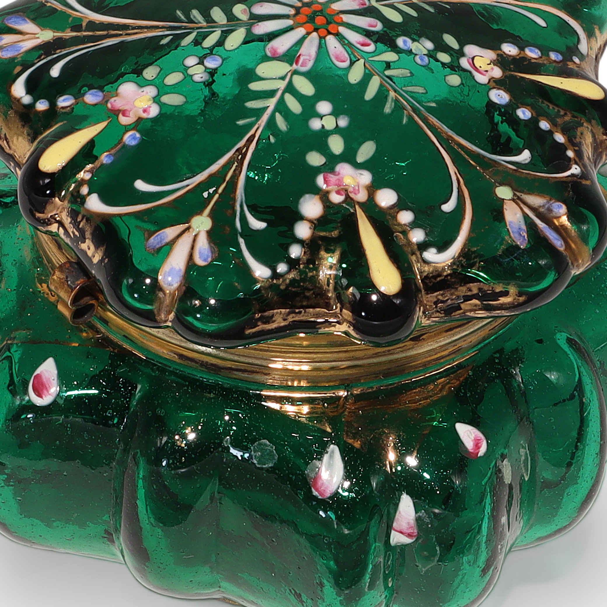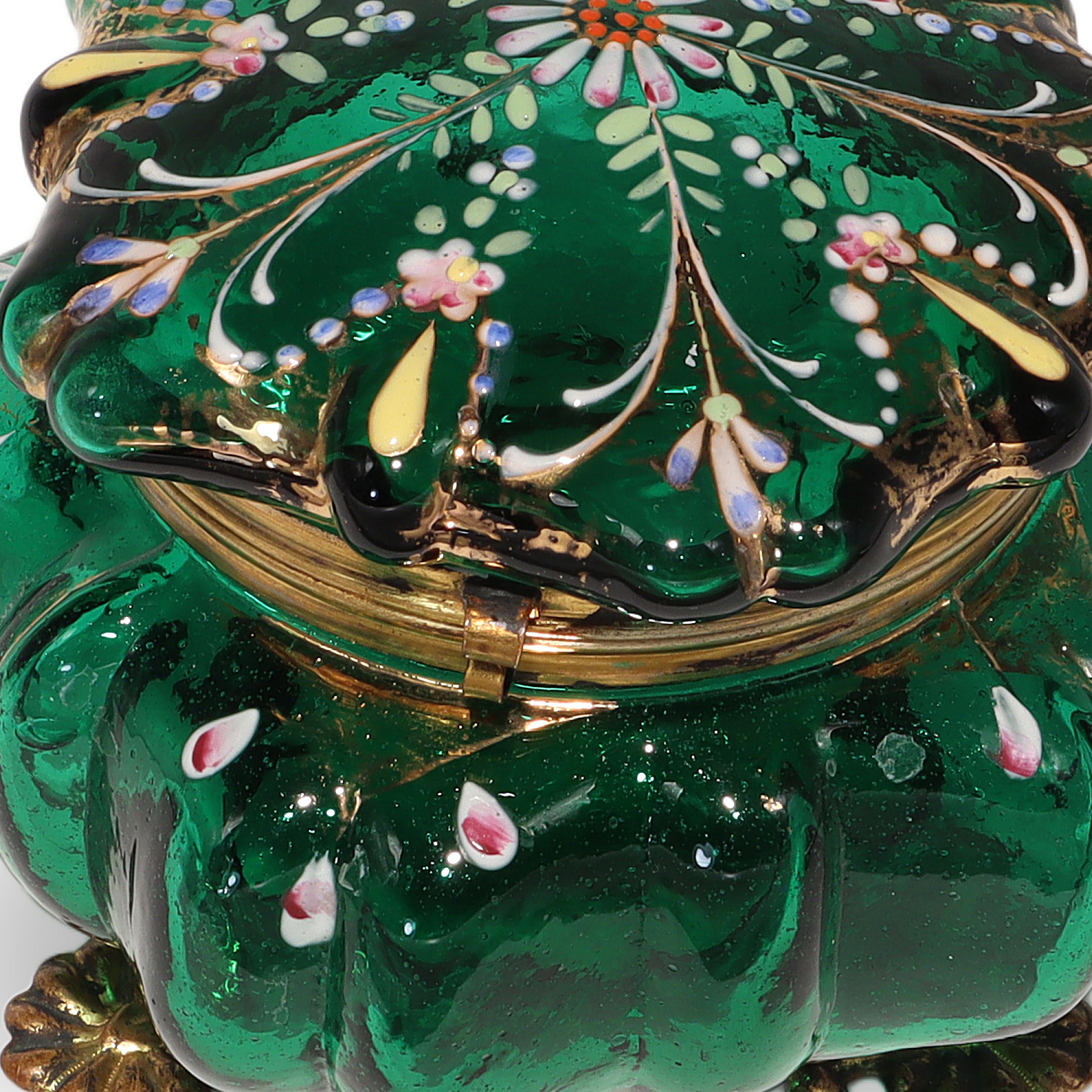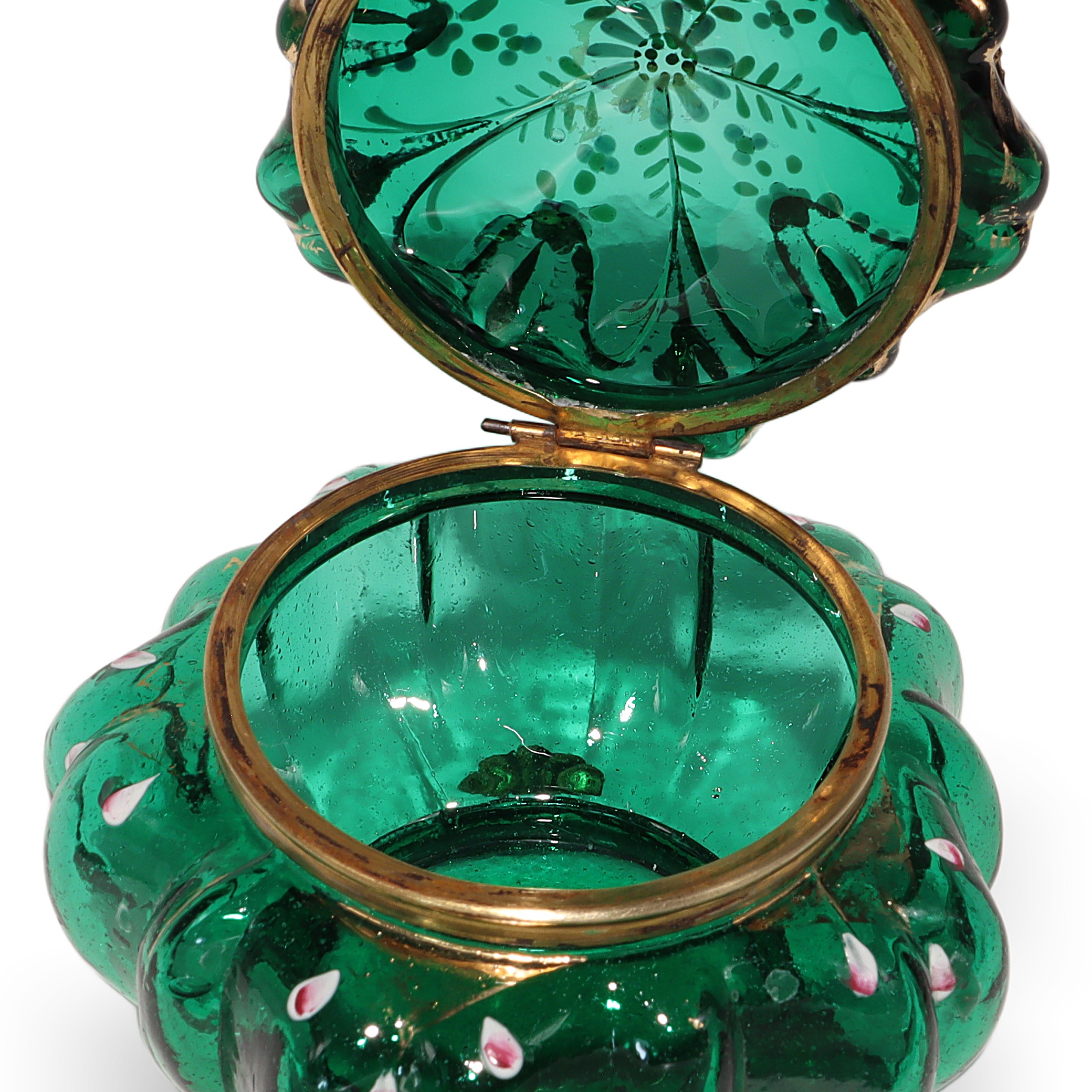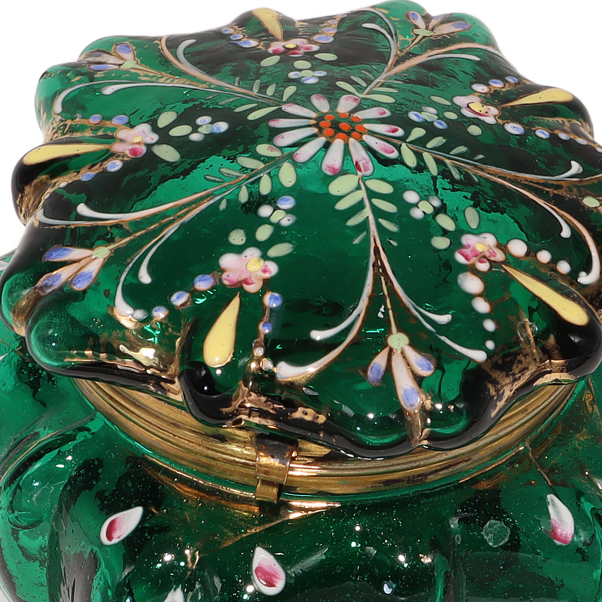 This beautiful little item is a Moser Glass Victorian enamel box, dating all the way back to the 1840s. The trinket casket is handcrafted from deep emerald green glass, brought to life with delicate hand-painted enamel flowers and gold accents. Standing at about three and a half inches tall and four inches wide, it’s a charming size for treasures like jewelry or tiny keepsakes. The brass fittings and ornate little feet give it a touch of elegance, but it’s also sturdy and practical. Holding this in your hand, you can feel the weight of history—it’s nearly 200 years old! There aren’t many pieces like this left in such near mint condition, making it genuinely rare and a standout for anyone who enjoys antiques.