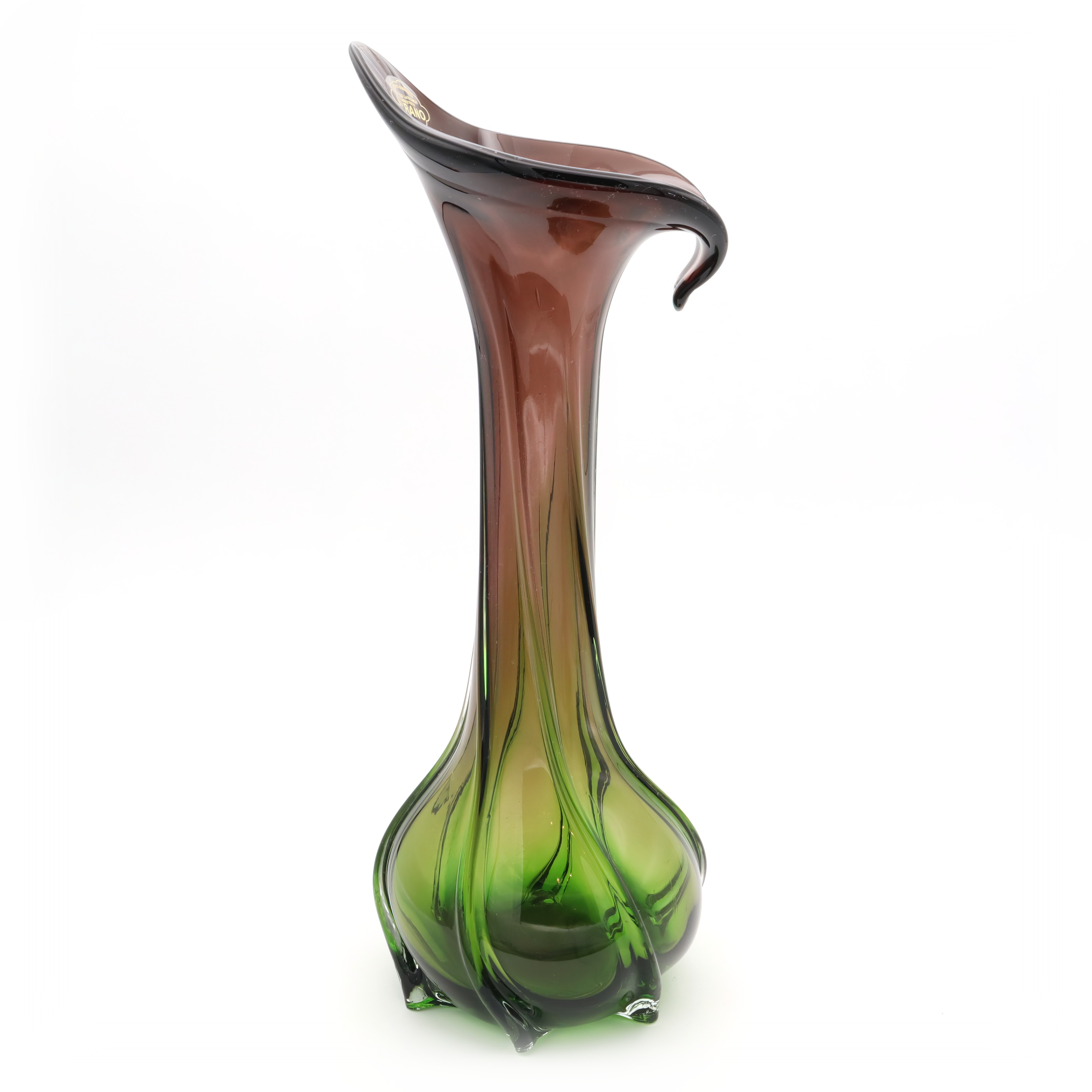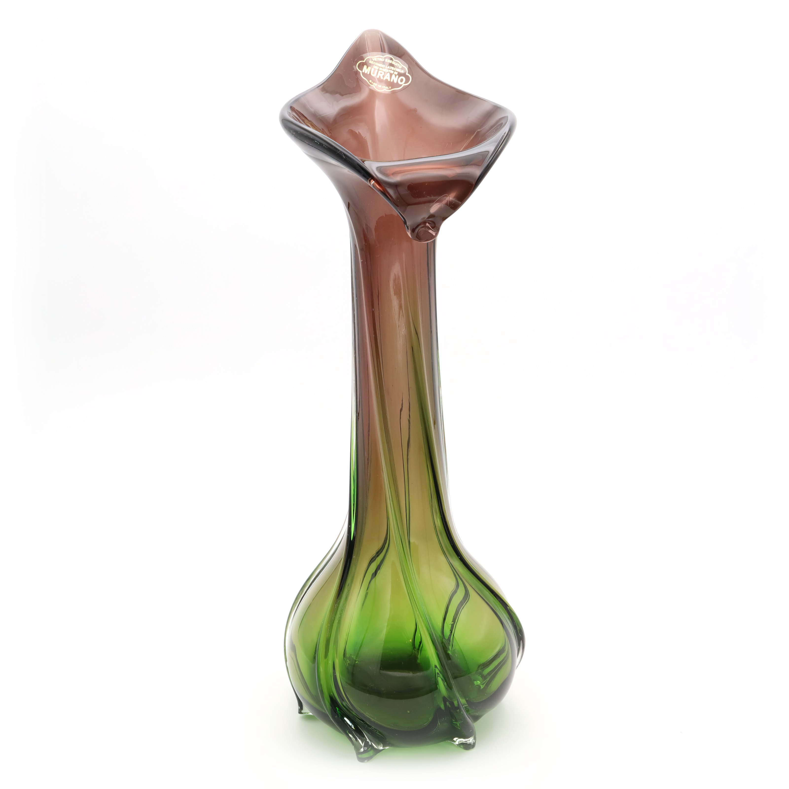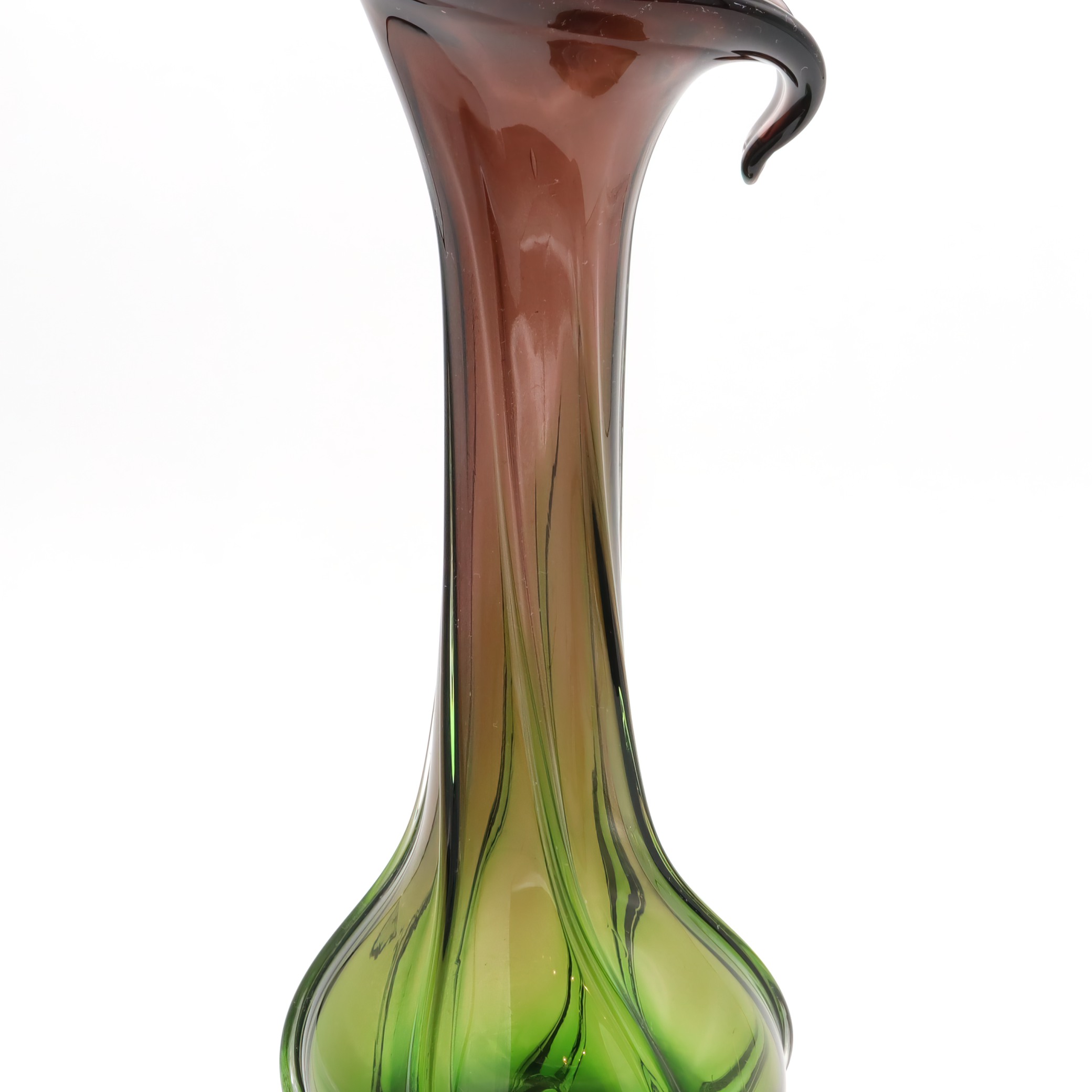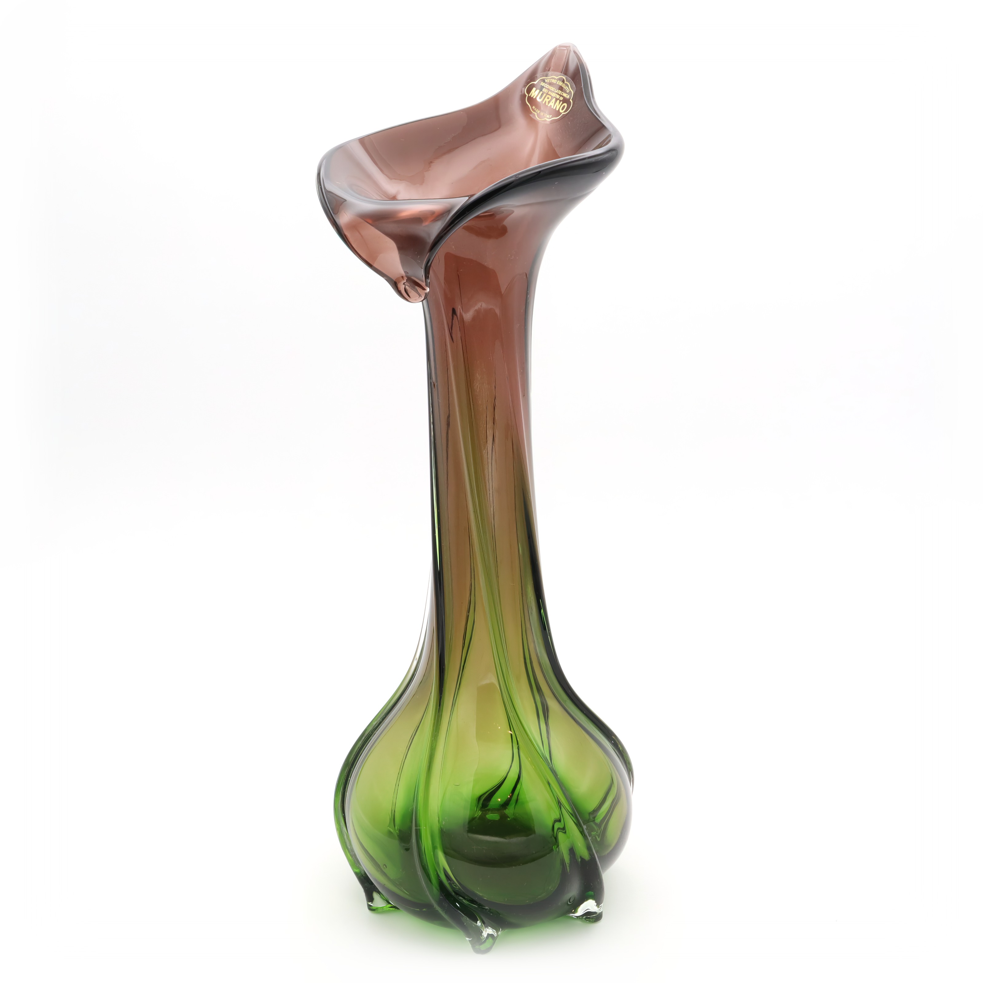Murano glass has a rich history that dates back centuries, known globally for its quality and craftsmanship. Originating from the Venetian island of Murano, each piece is carefully hand-blown by skilled artisans, making every vase unique. This particular vase embodies the vibrant colors and intricate designs typical of Murano artistry. Collectors and decorators alike prize these vases for their beauty and the story they tell about Italian craftsmanship. The piece from 1970 is a great example of the era’s aesthetic, blending functionality with artistic flair. Its rarity and vintage status contribute to its value, ensuring it remains a cherished item for years to come. Whether displayed solo or as part of a collection, the Murano Green Purple Flower Vase stands as a vivid piece of art history.