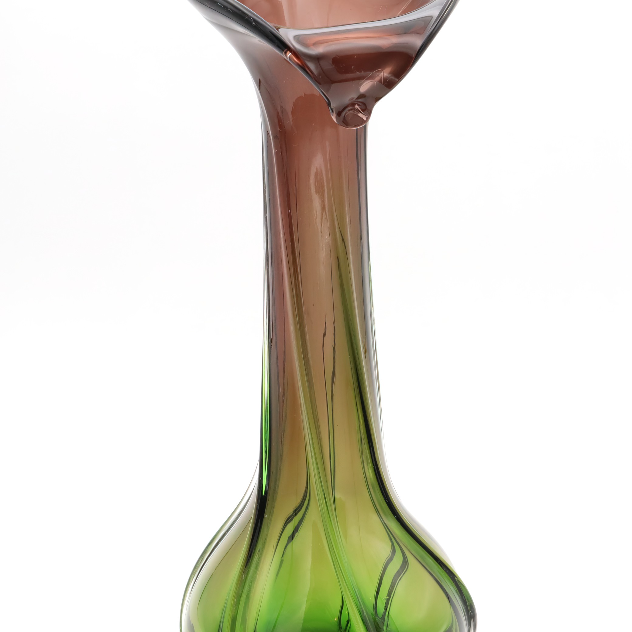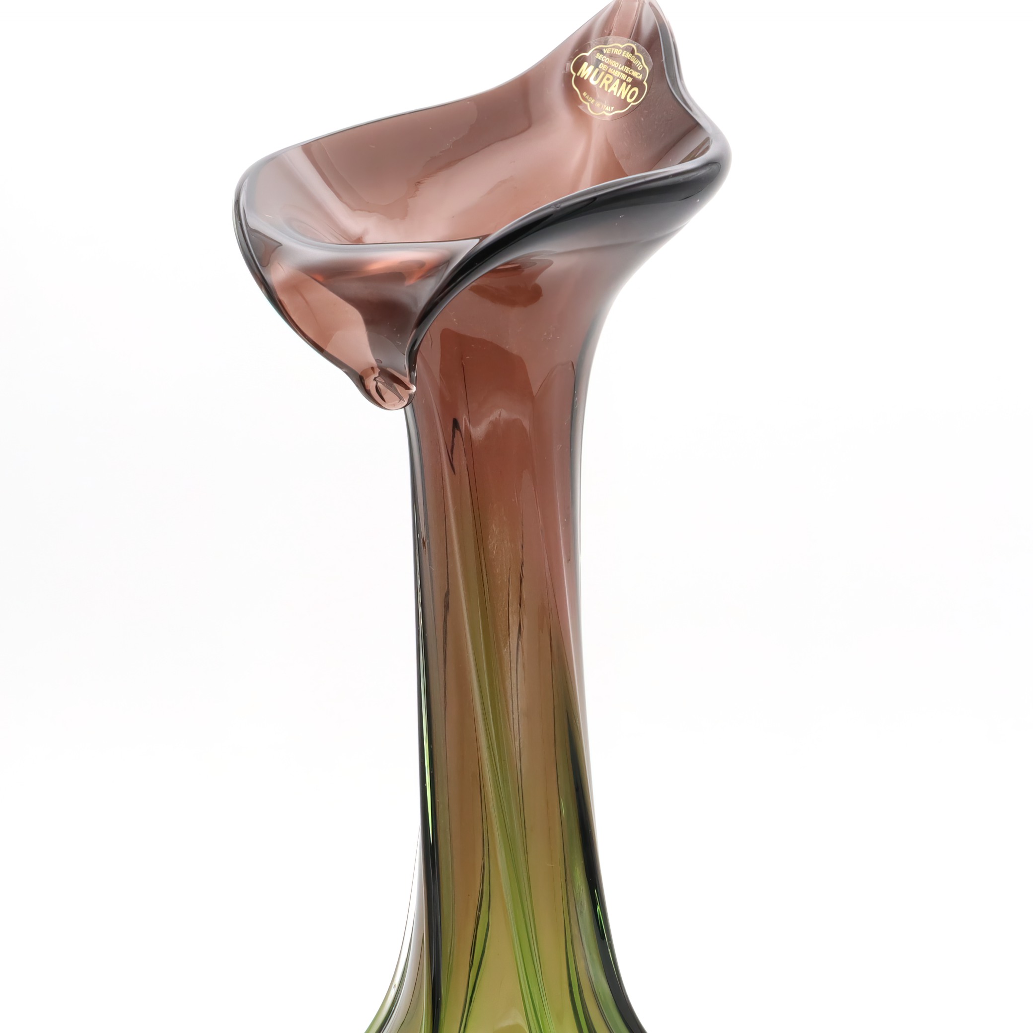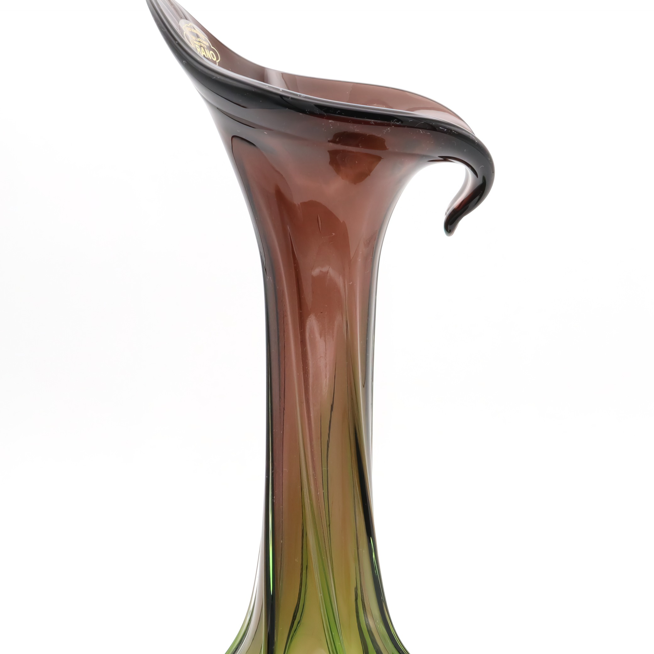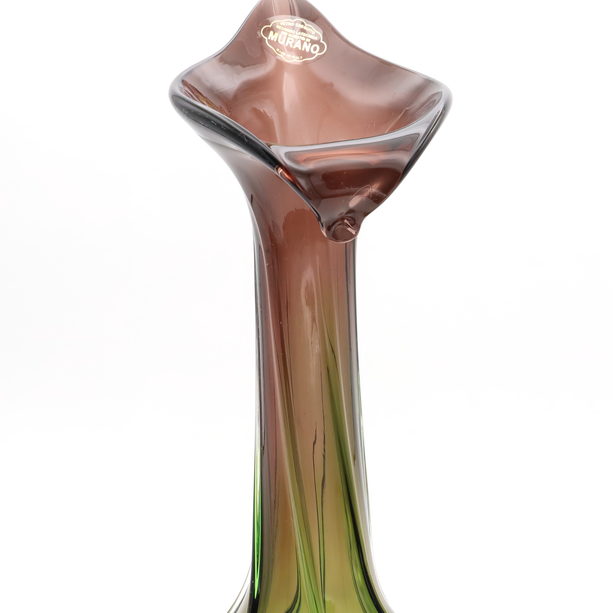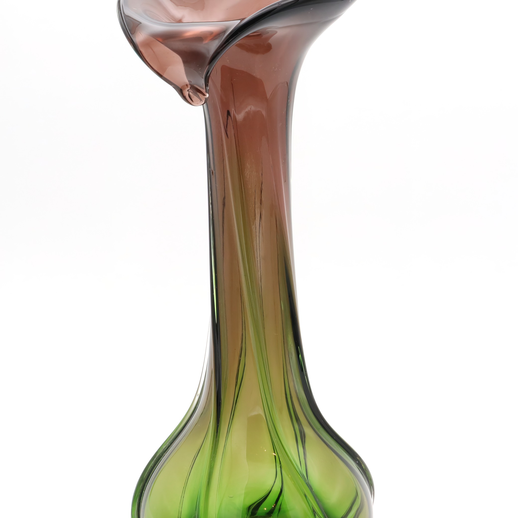 Murano glass has a rich history that dates back centuries, known globally for its quality and craftsmanship. Originating from the Venetian island of Murano, each piece is carefully hand-blown by skilled artisans, making every vase unique. This particular vase embodies the vibrant colors and intricate designs typical of Murano artistry. Collectors and decorators alike prize these vases for their beauty and the story they tell about Italian craftsmanship. The piece from 1970 is a great example of the era’s aesthetic, blending functionality with artistic flair. Its rarity and vintage status contribute to its value, ensuring it remains a cherished item for years to come. Whether displayed solo or as part of a collection, the Murano Green Purple Flower Vase stands as a vivid piece of art history.