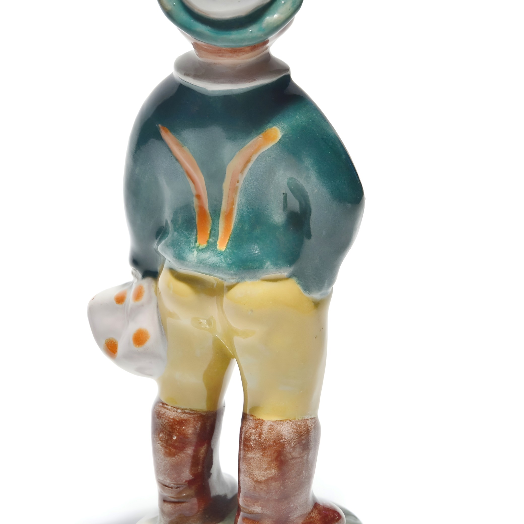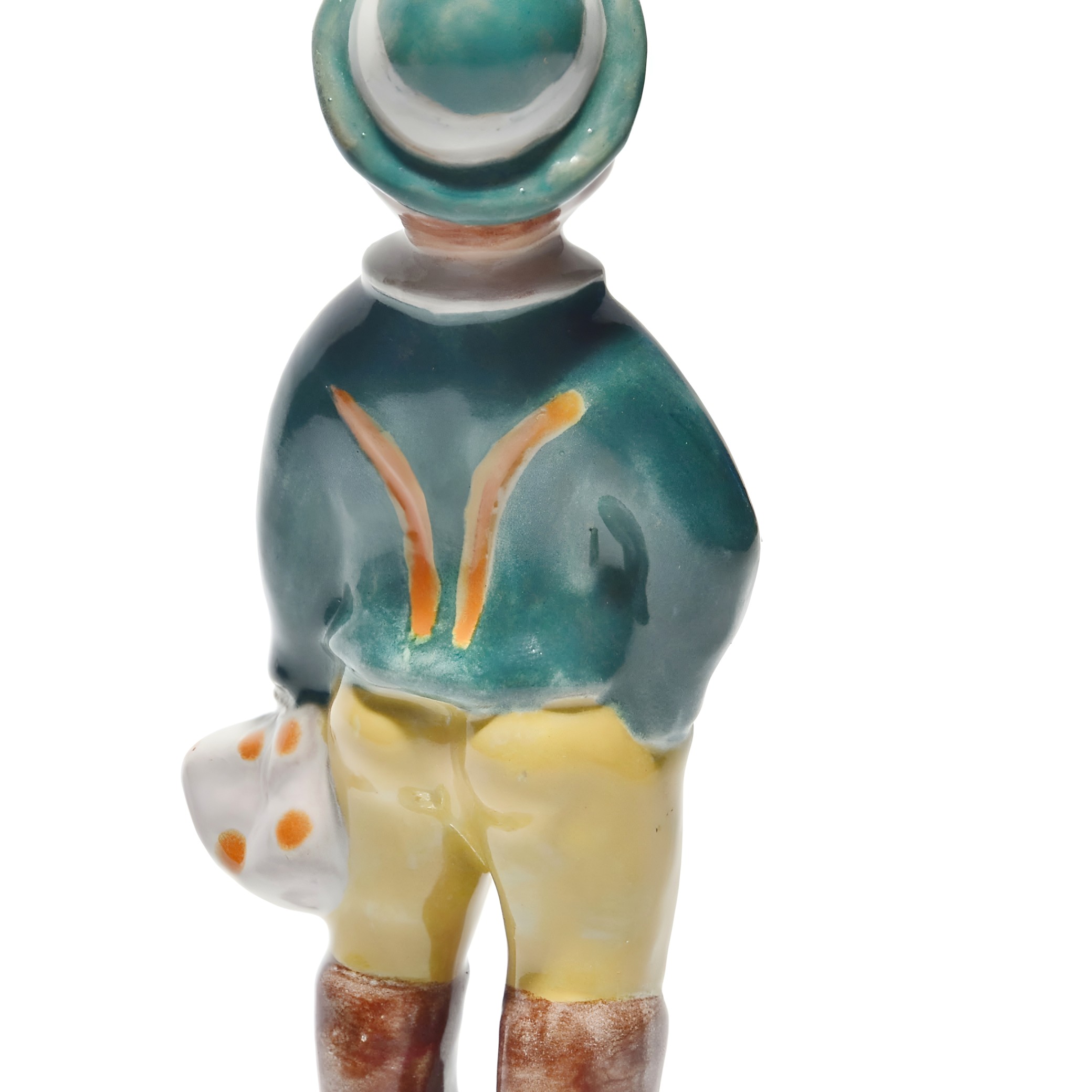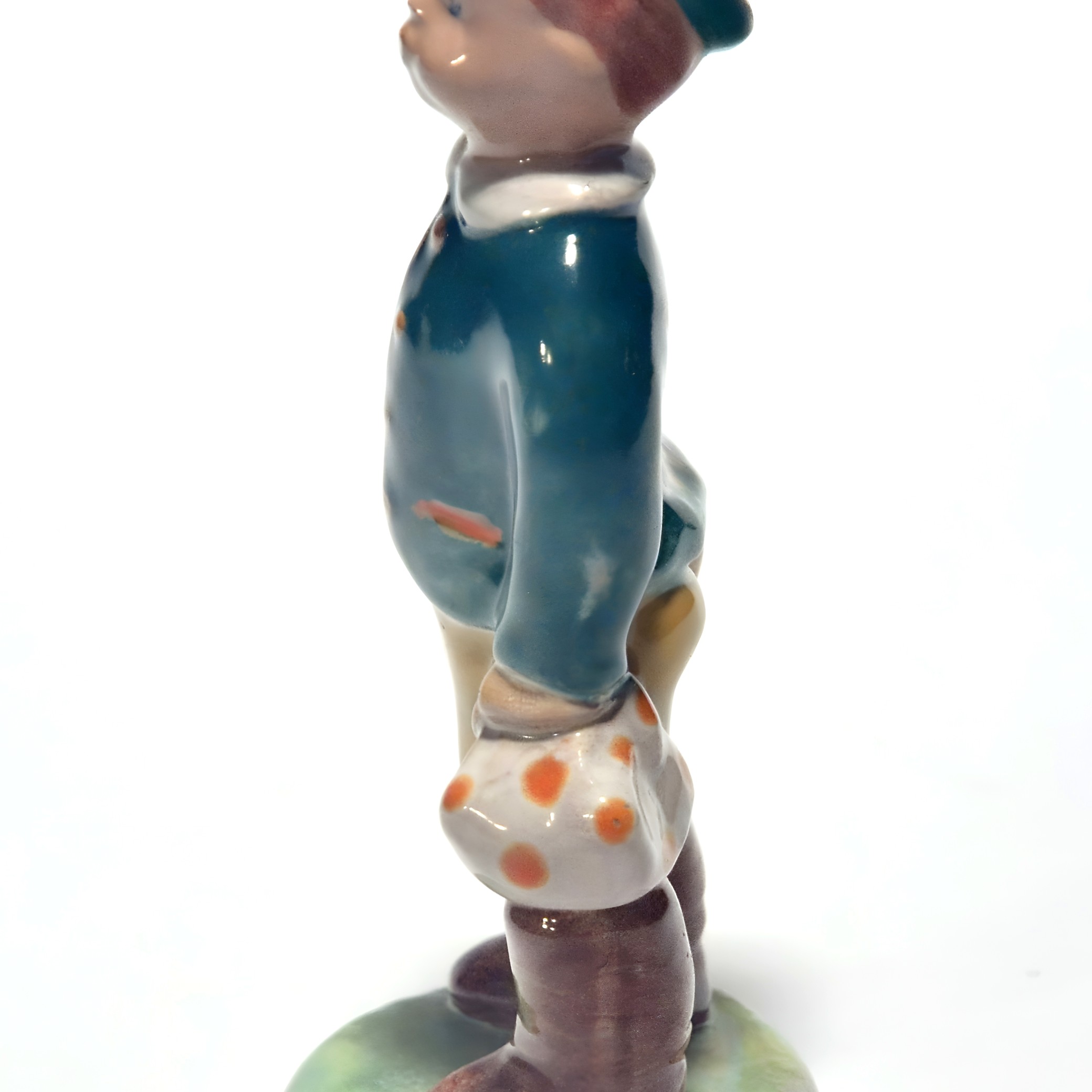 This porcelain figurine of a boy, made around 1980, is a charming decorative piece that captures the playful innocence of childhood. Dressed in a green hat and jacket with boots, this hand-painted…