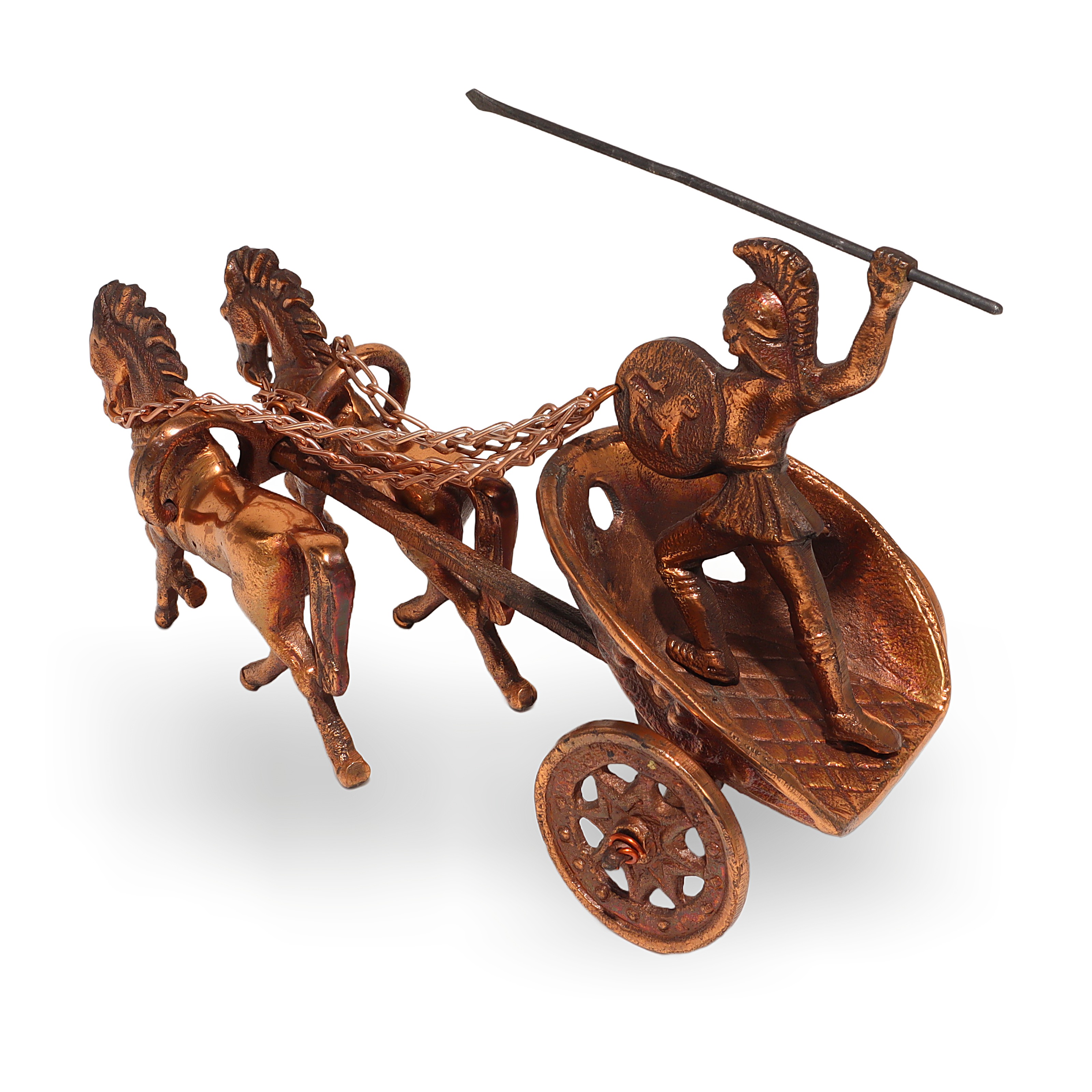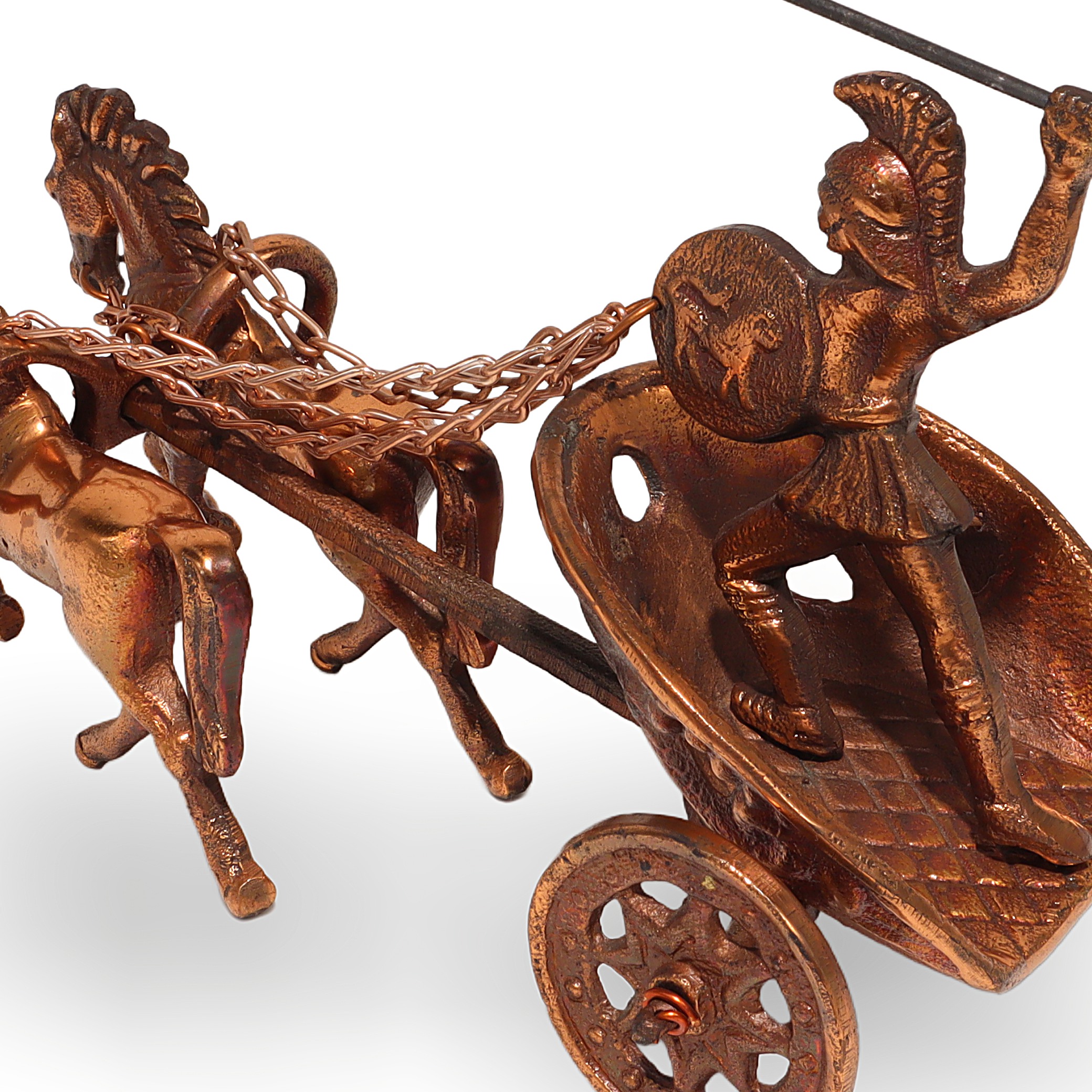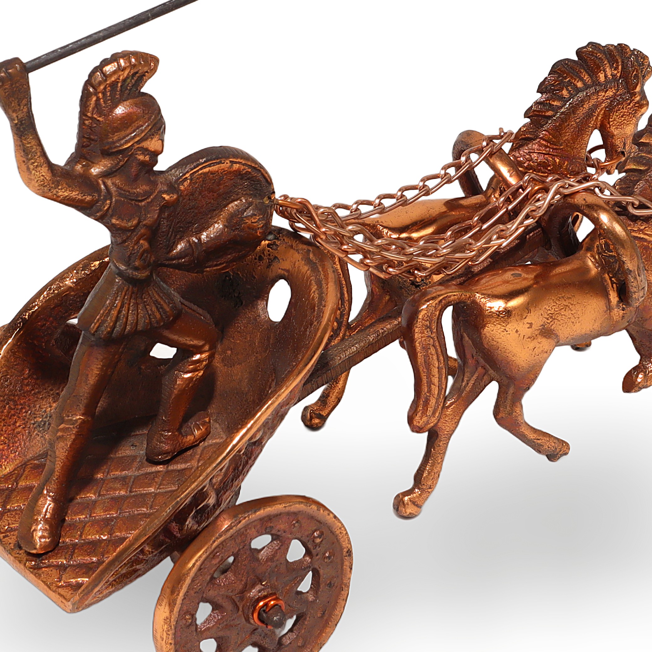 This is a striking Roman War Chariot copper figurine, crafted around 1970, standing at about 6 inches tall, 4 inches wide,…