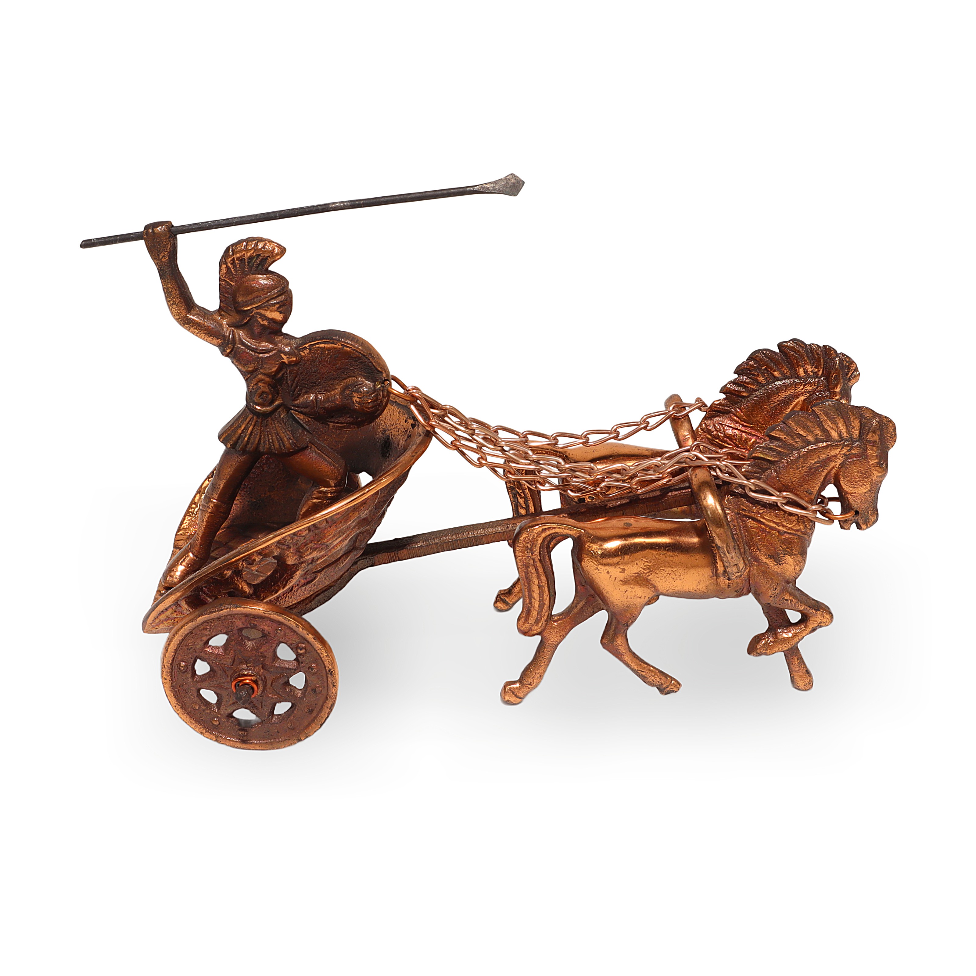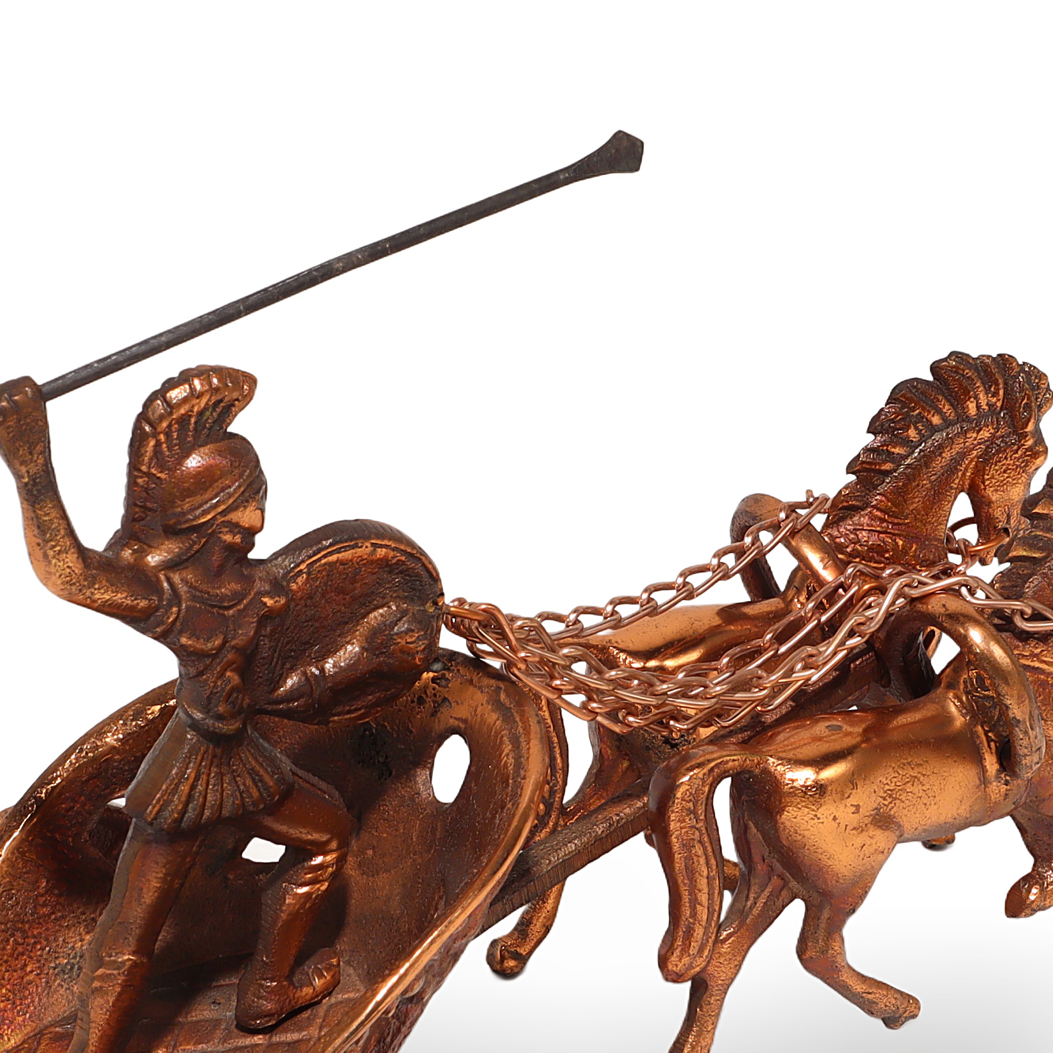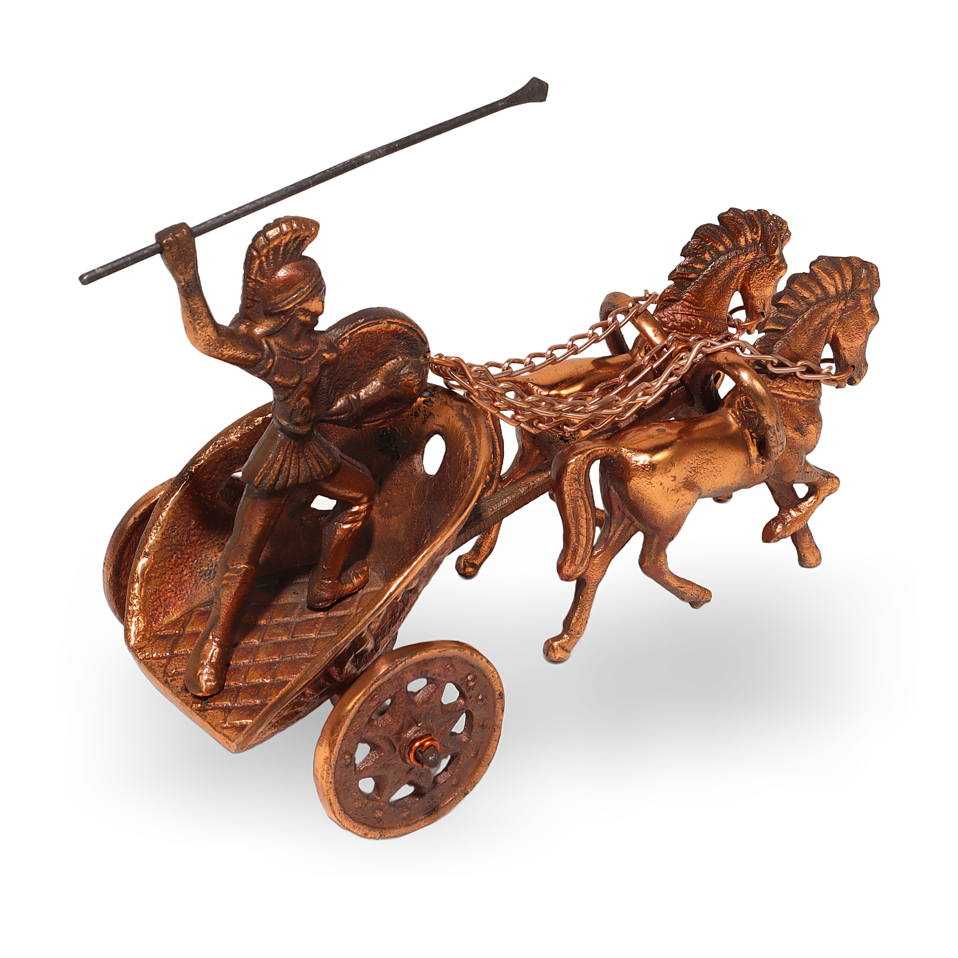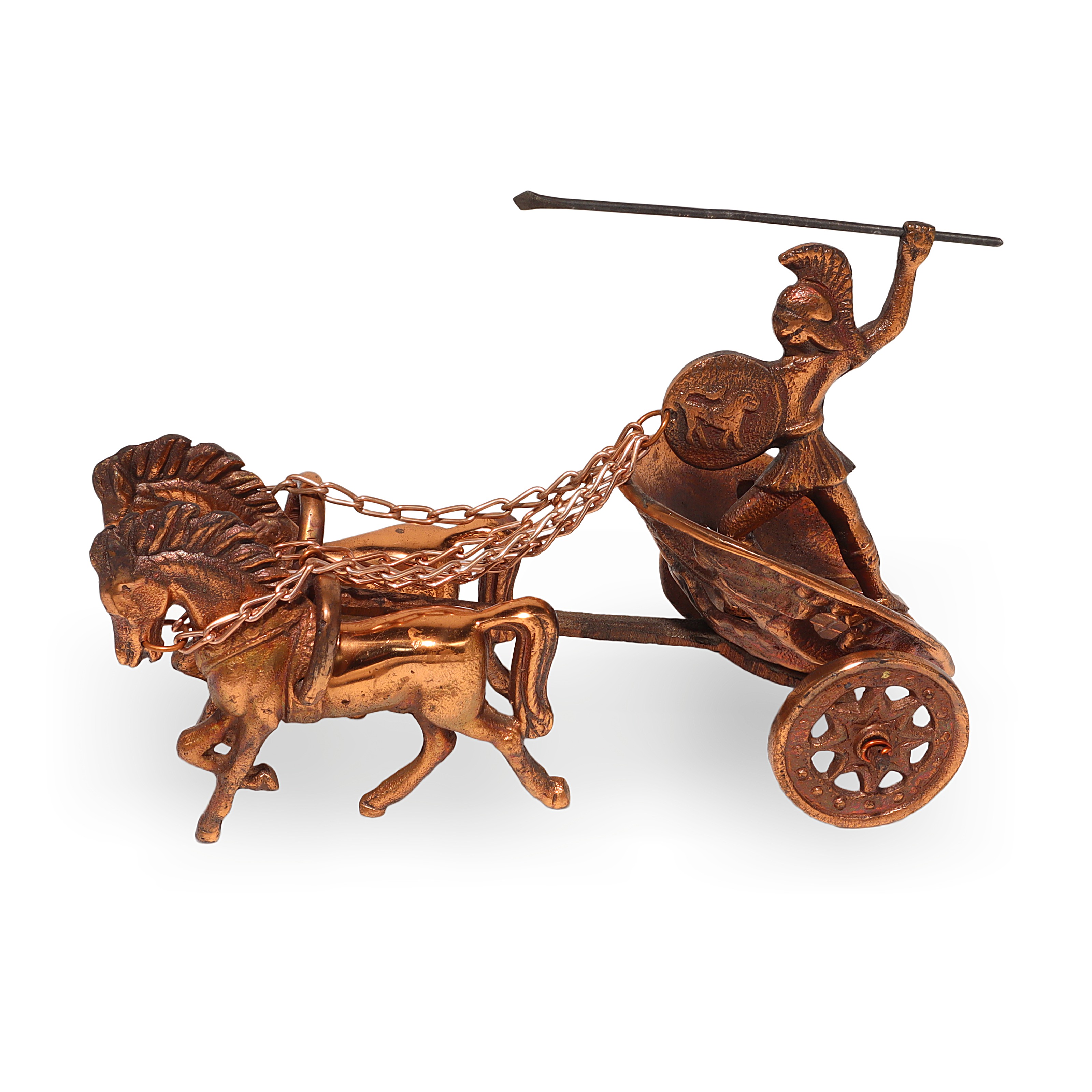 This is a striking Roman War Chariot copper figurine, crafted around 1970, standing at about 6 inches tall, 4 inches wide,…