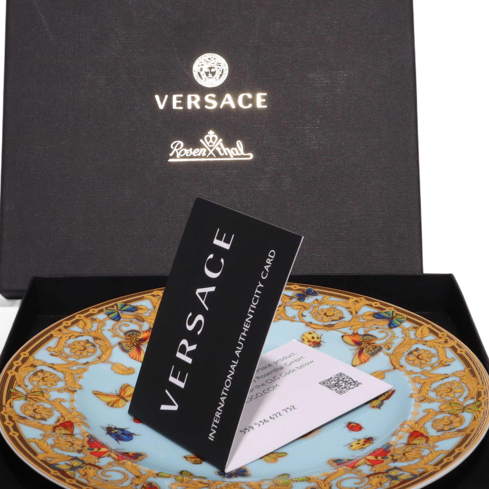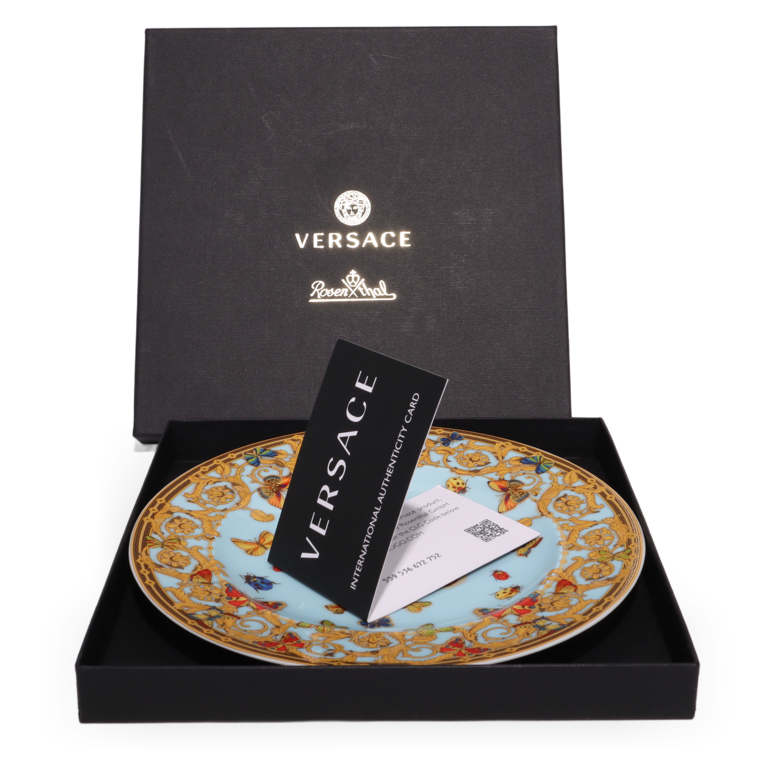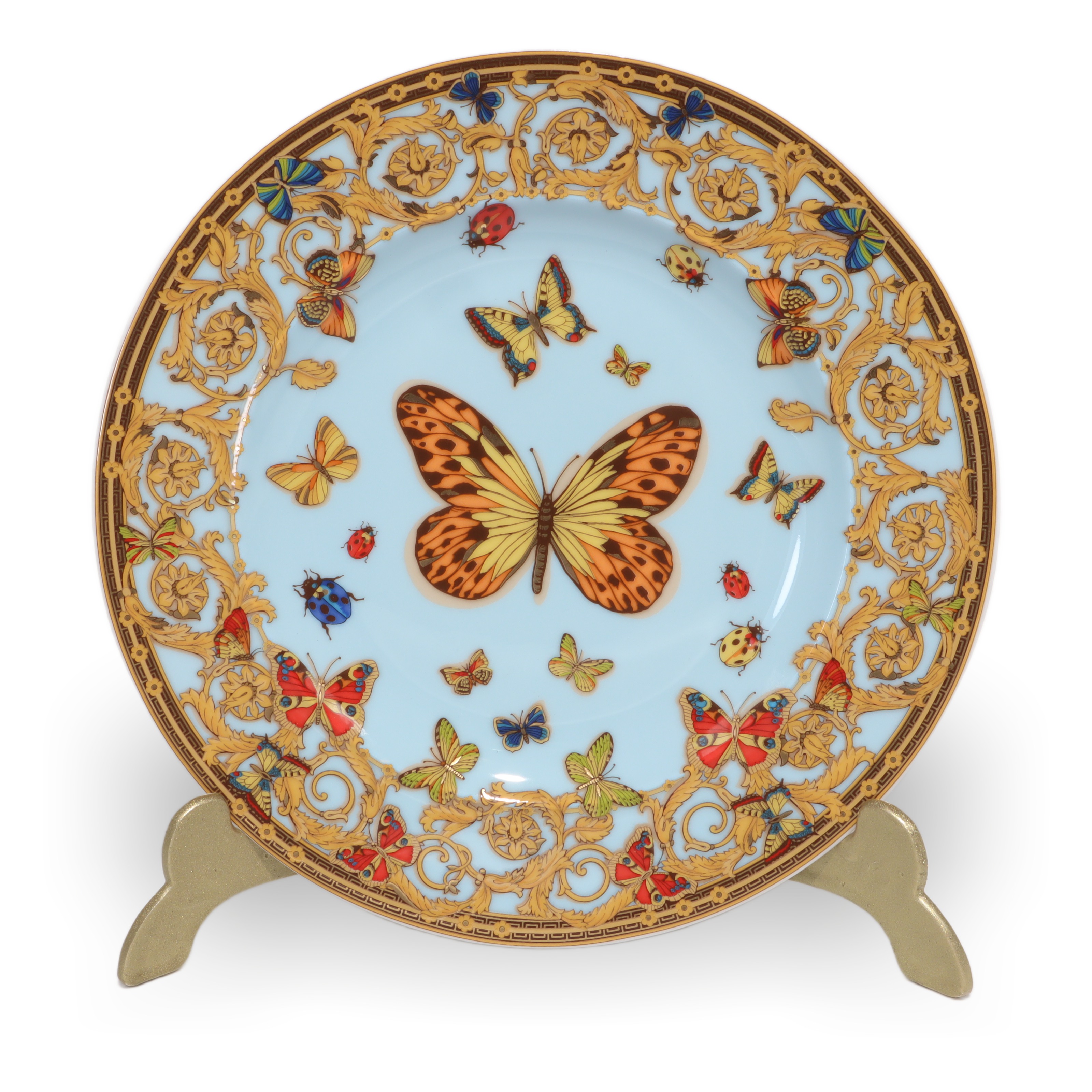 The Versace Butterfly Garden collection was created in partnership with the esteemed porcelain manufacturer Rosenthal, well-known for its high-quality, timeless pieces. The collection is famous for its vibrant, nature-inspired designs—specifically its butterflies and baroque golden curls—making every item in this line not just a piece of dinnerware, but a real statement piece for display. Items from the late 1970s and early 1980s have become increasingly rare and are sought after by collectors and lovers of vintage design. Pieces like this almost forty-year-old tea cup and saucer are especially prized for their craftsmanship, bright colors, and unmistakable Versace flair. If you find one in this kind of condition, it’s a little treasure—perfect for fancy afternoon tea or just to keep on display as a conversation starter.