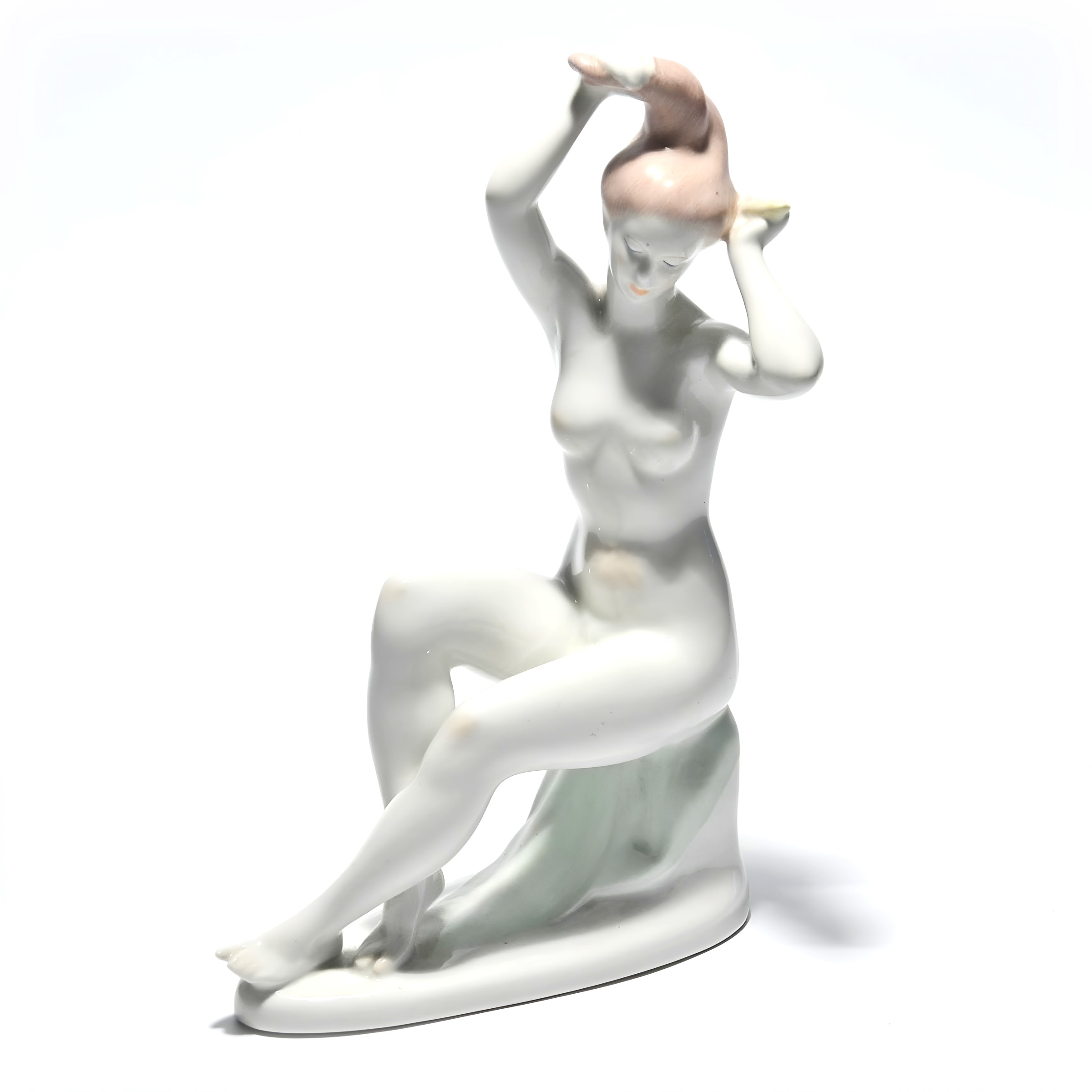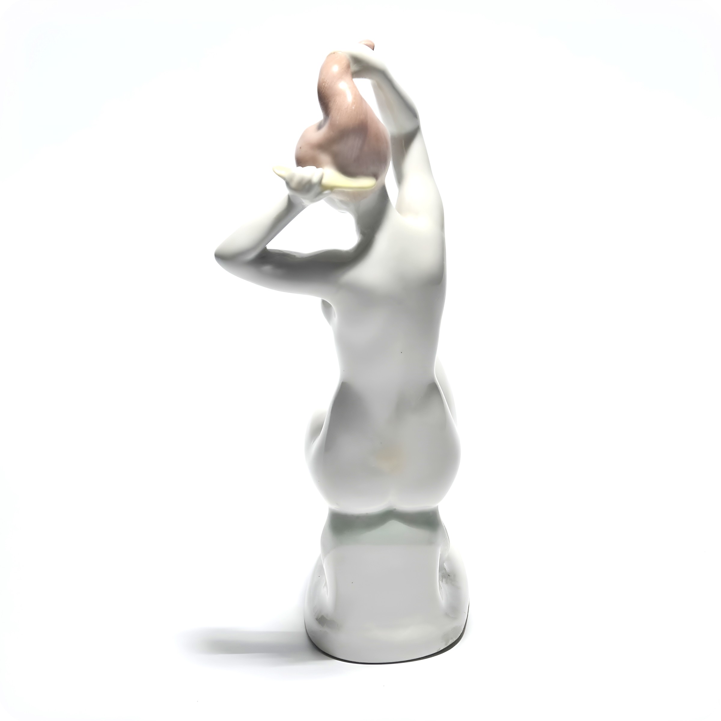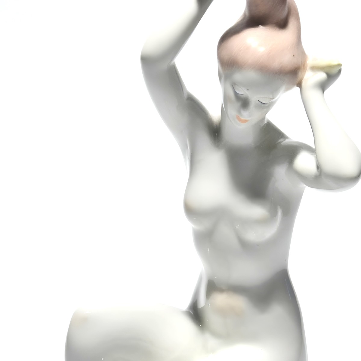 This stunning Vintage Aquincum Porcelain Figurine captures a timeless moment with exquisite detail. Featuring a graceful nude woman in a moment of serene self-care, this sculpture of a woman grooming herself is a beautiful addition to any collection. The soft colors and delicate posture evoke a sense of calm and elegance, highlighting the expert craftsmanship characteristic of Aquincum porcelain. Standing at a charming size, this figurine is well-preserved, showing no major signs of wear, making it a true collector’s piece. Whether displayed on a mantle, shelf, or in a cabinet, it’s sure to invite admiration and curiosity from your guests.
