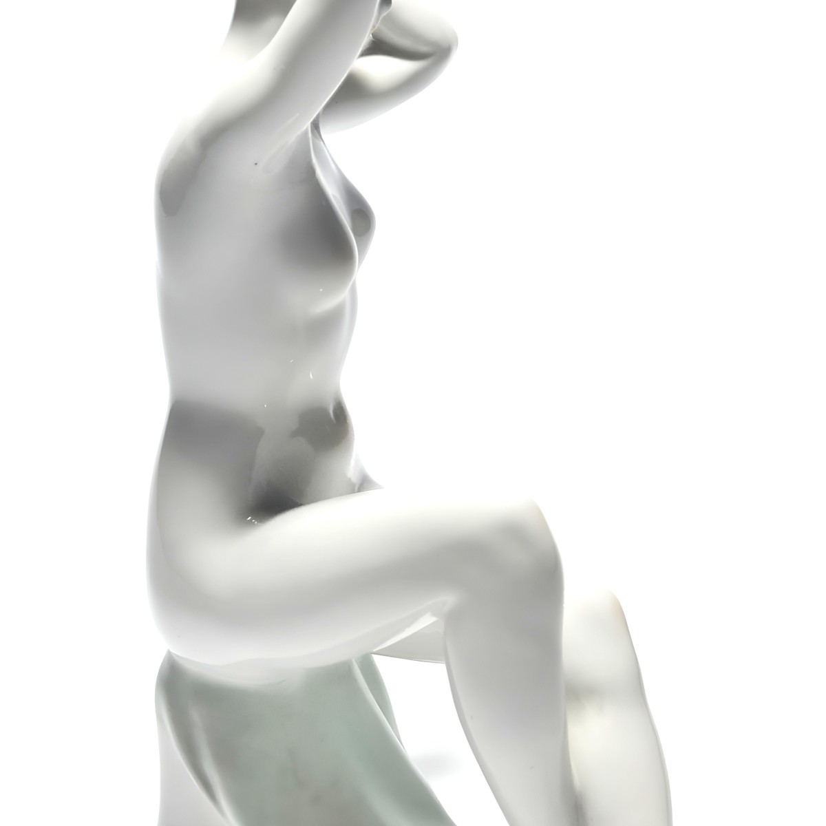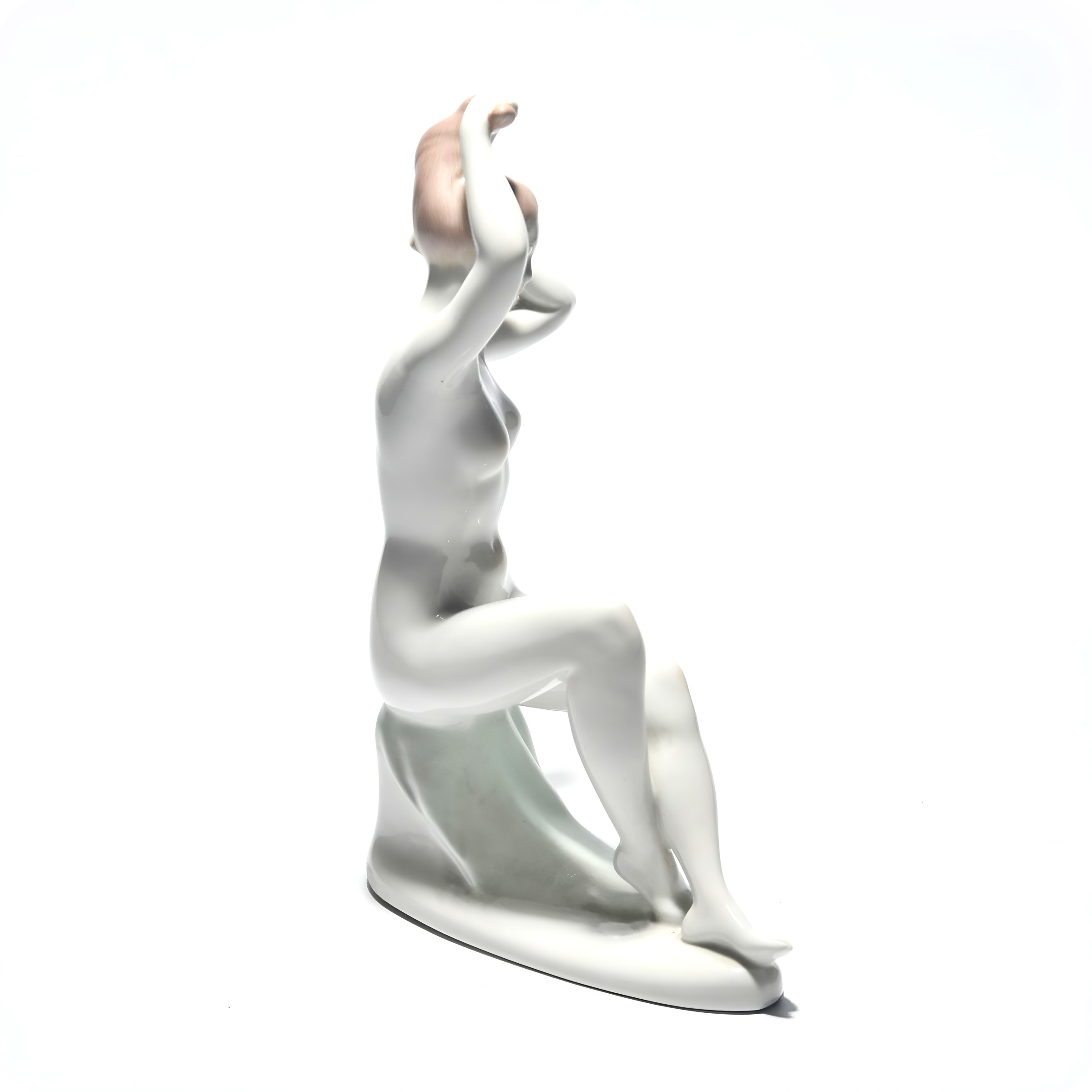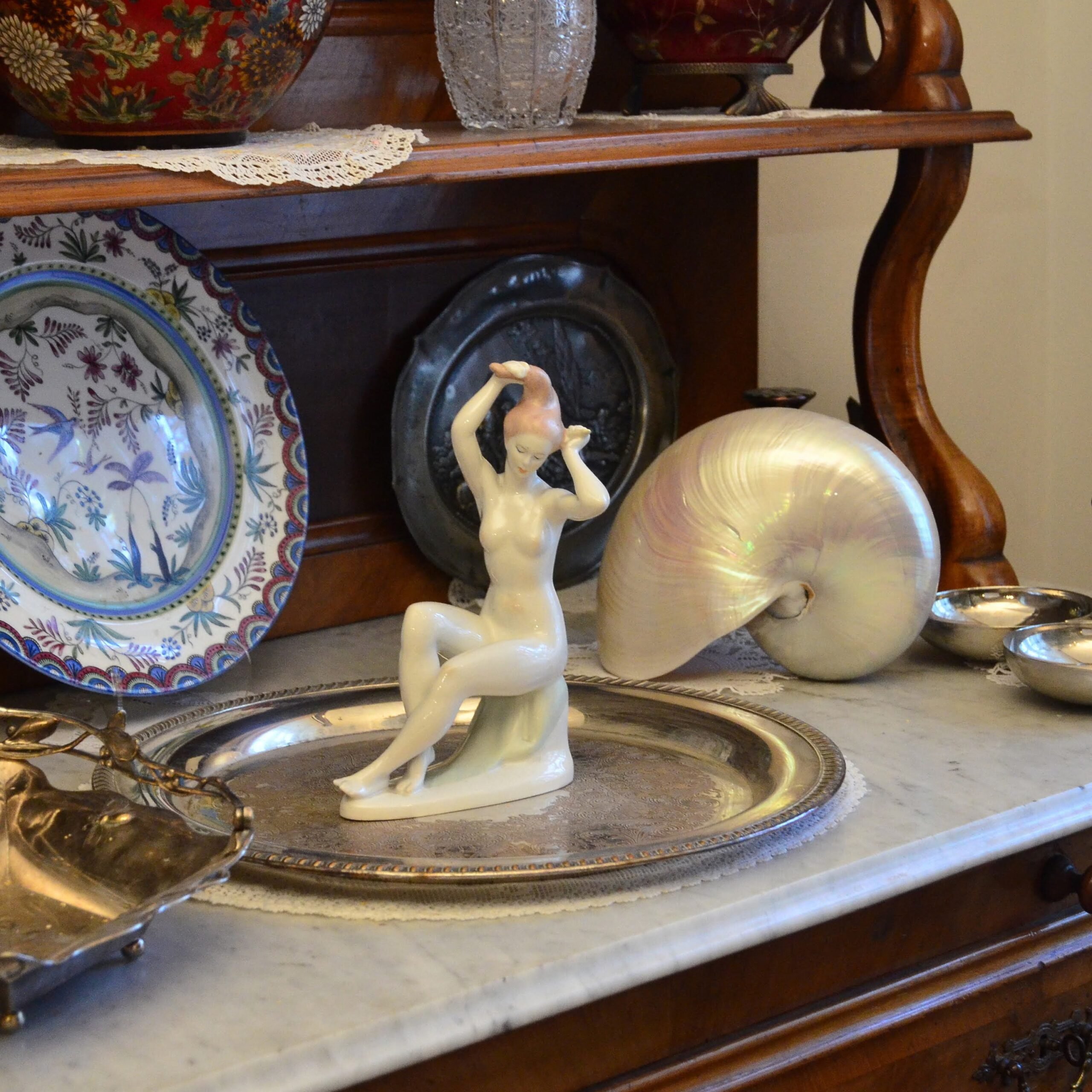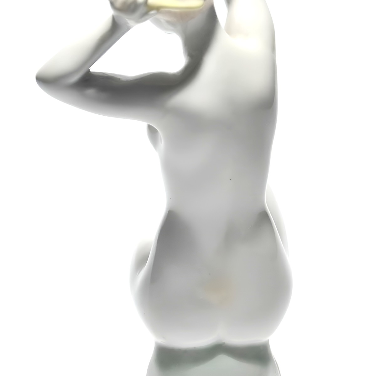 This stunning Vintage Aquincum Porcelain Figurine captures a timeless moment with exquisite detail. Featuring a graceful nude woman in a moment of serene self-care, this sculpture of a woman grooming herself is a beautiful addition to any collection. The soft colors and delicate posture evoke a sense of calm and elegance, highlighting the expert craftsmanship characteristic of Aquincum porcelain. Standing at a charming size, this figurine is well-preserved, showing no major signs of wear, making it a true collector’s piece. Whether displayed on a mantle, shelf, or in a cabinet, it’s sure to invite admiration and curiosity from your guests.