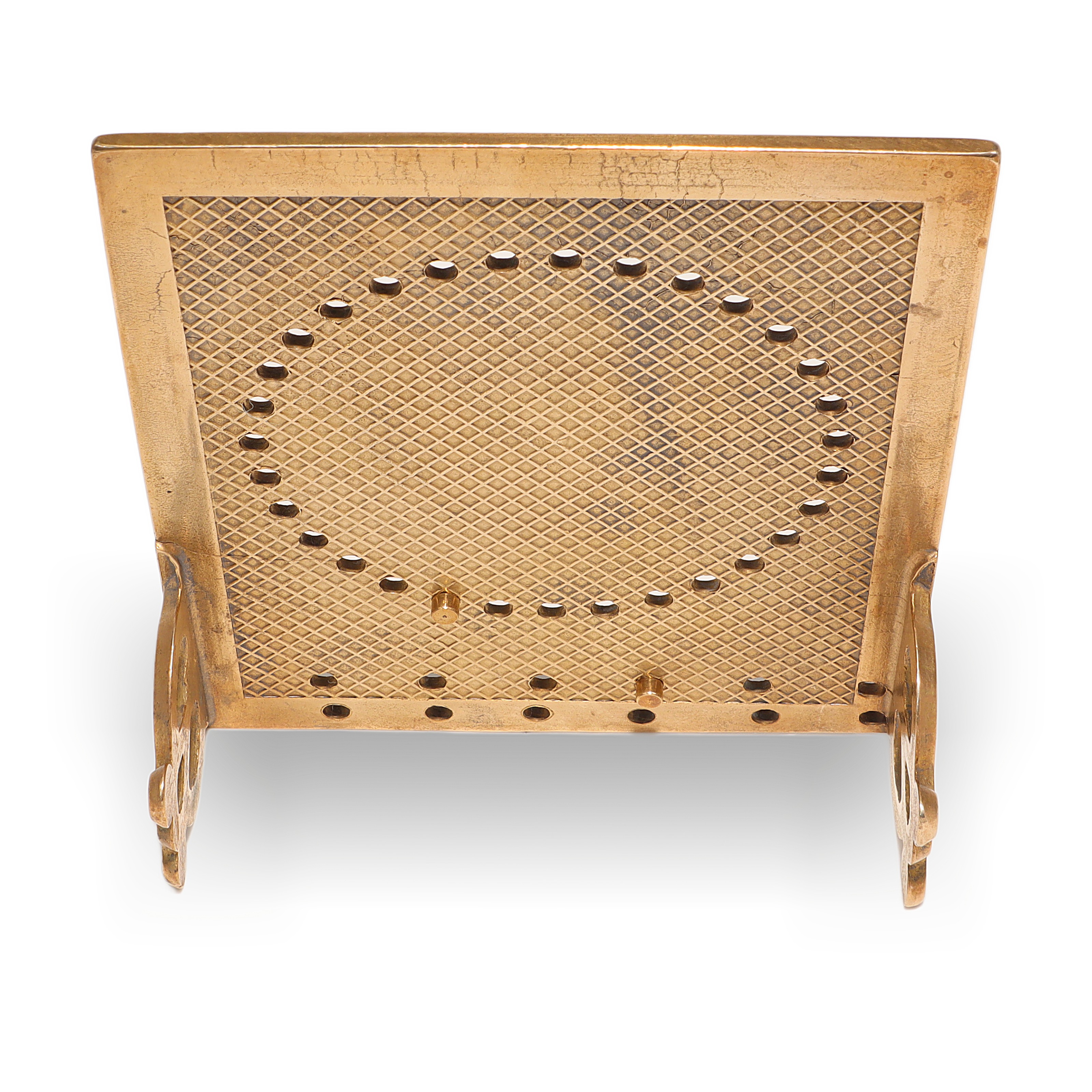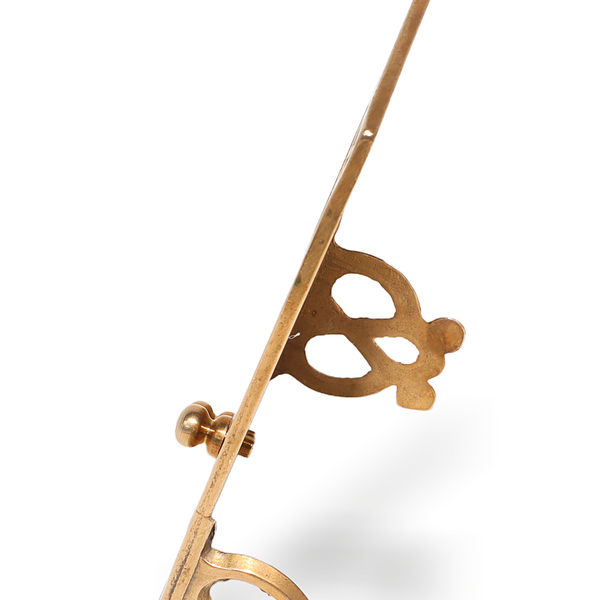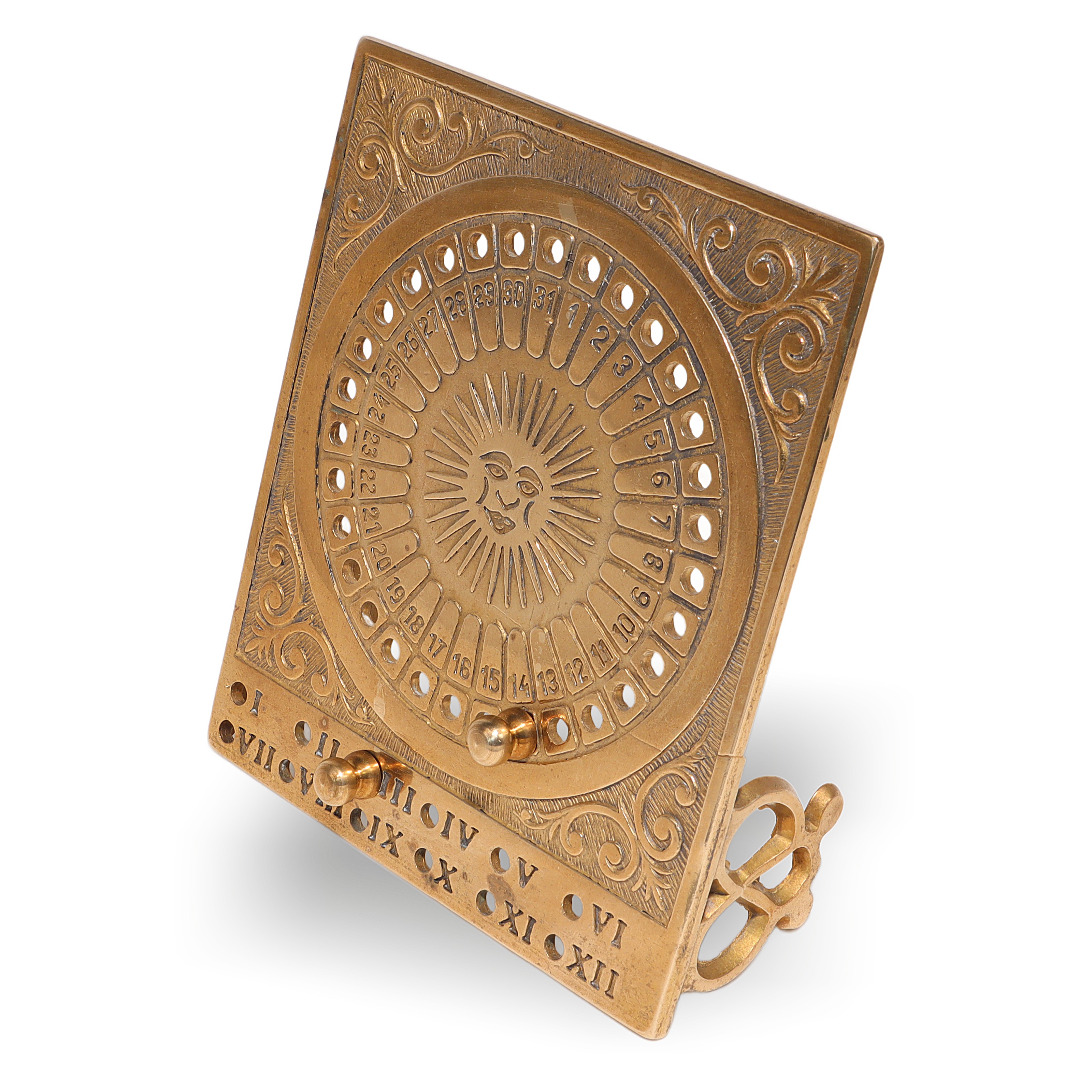 This artifact is a vintage brass sun perpetual calendar featuring an engraved sundial design, typical of unique desk decor pieces from…